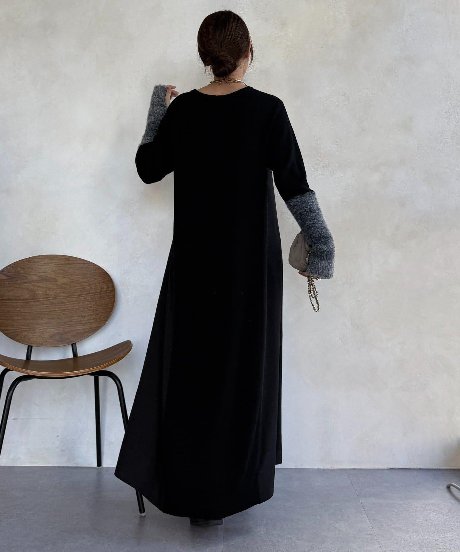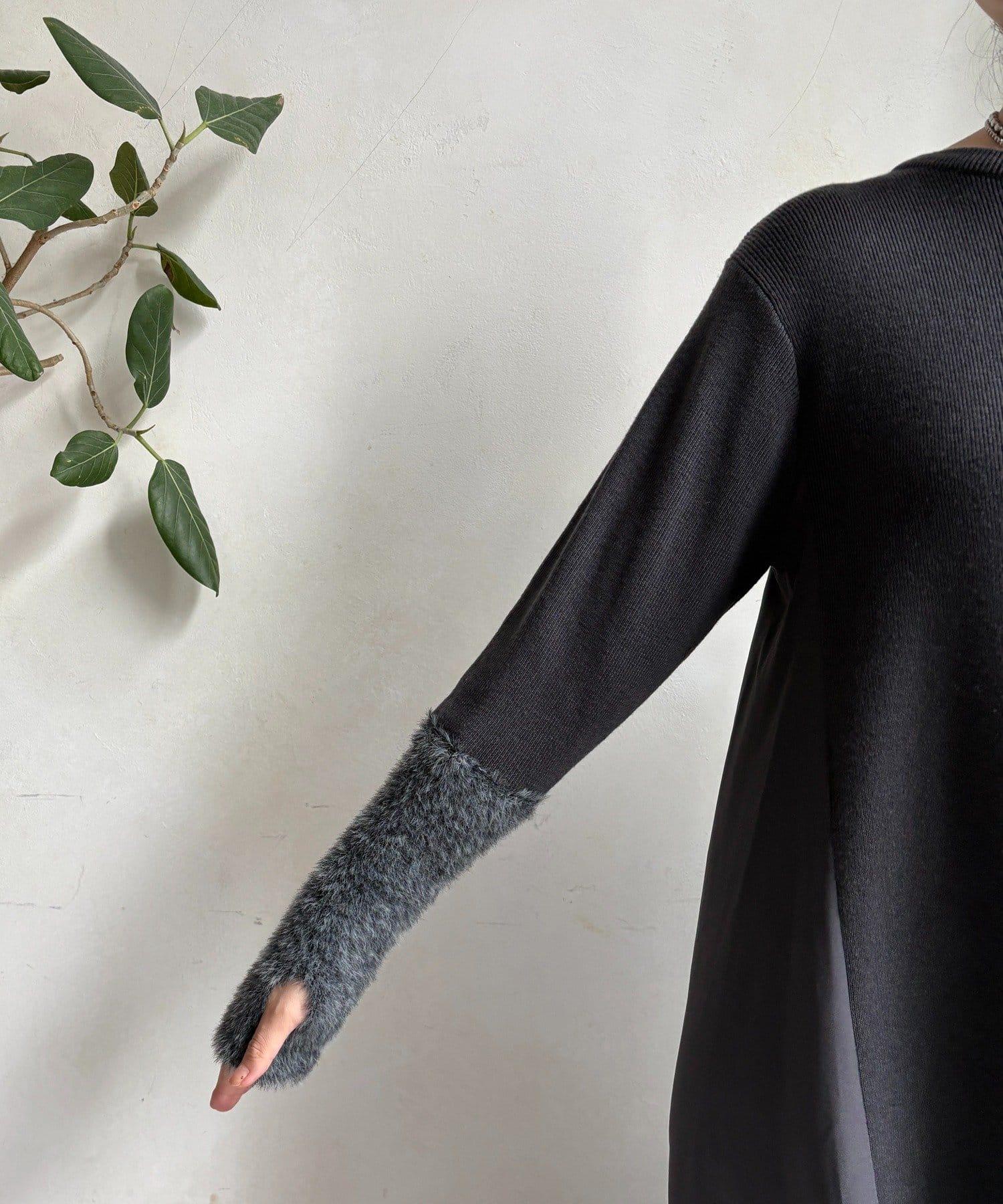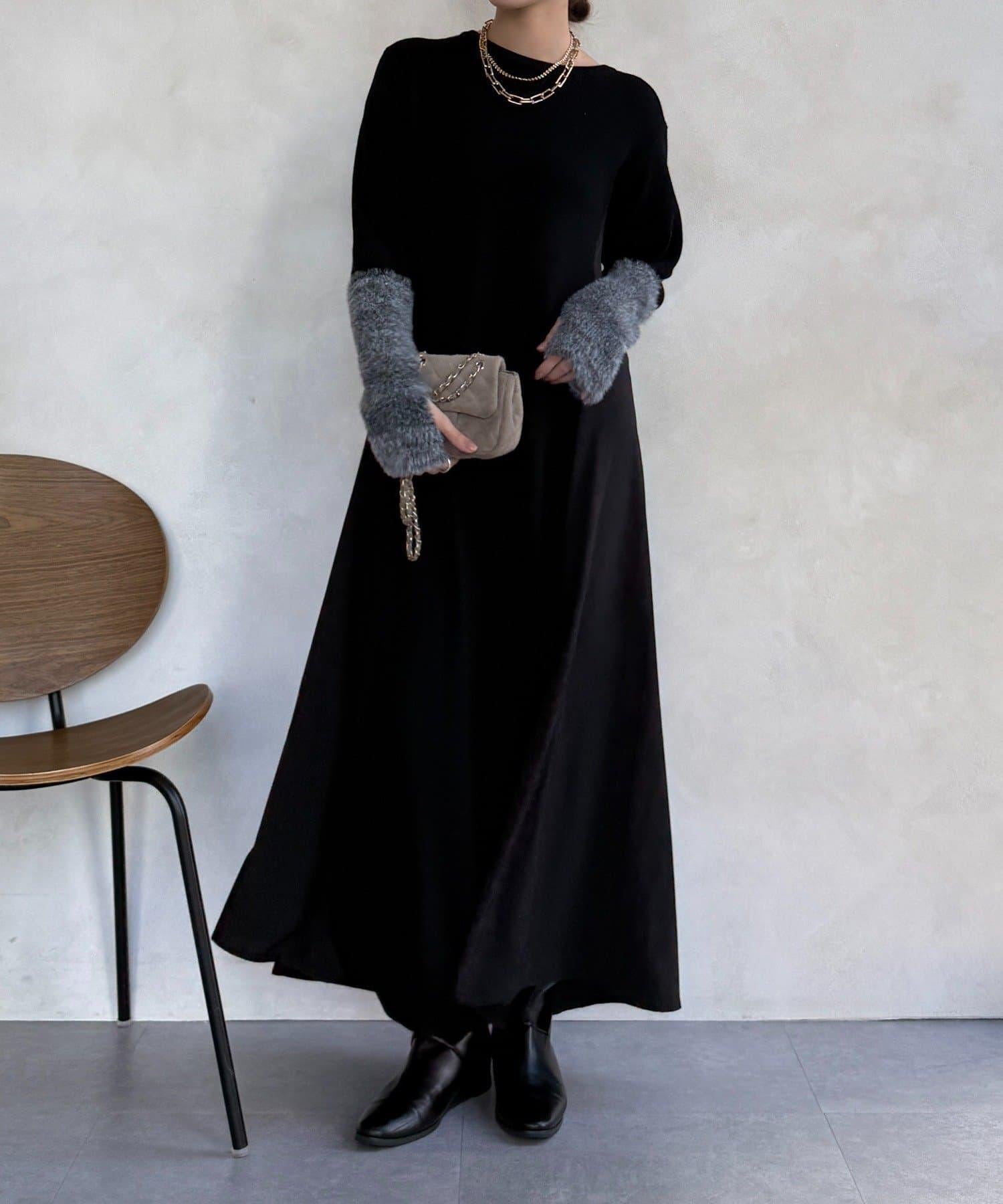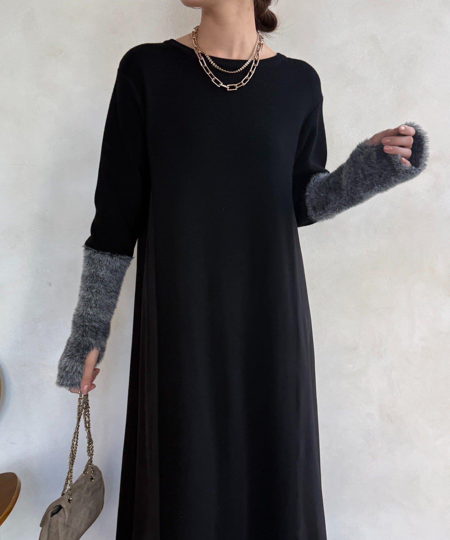 蓬鬆的絨毛材質與優雅的編織面料相結合的連身裙。