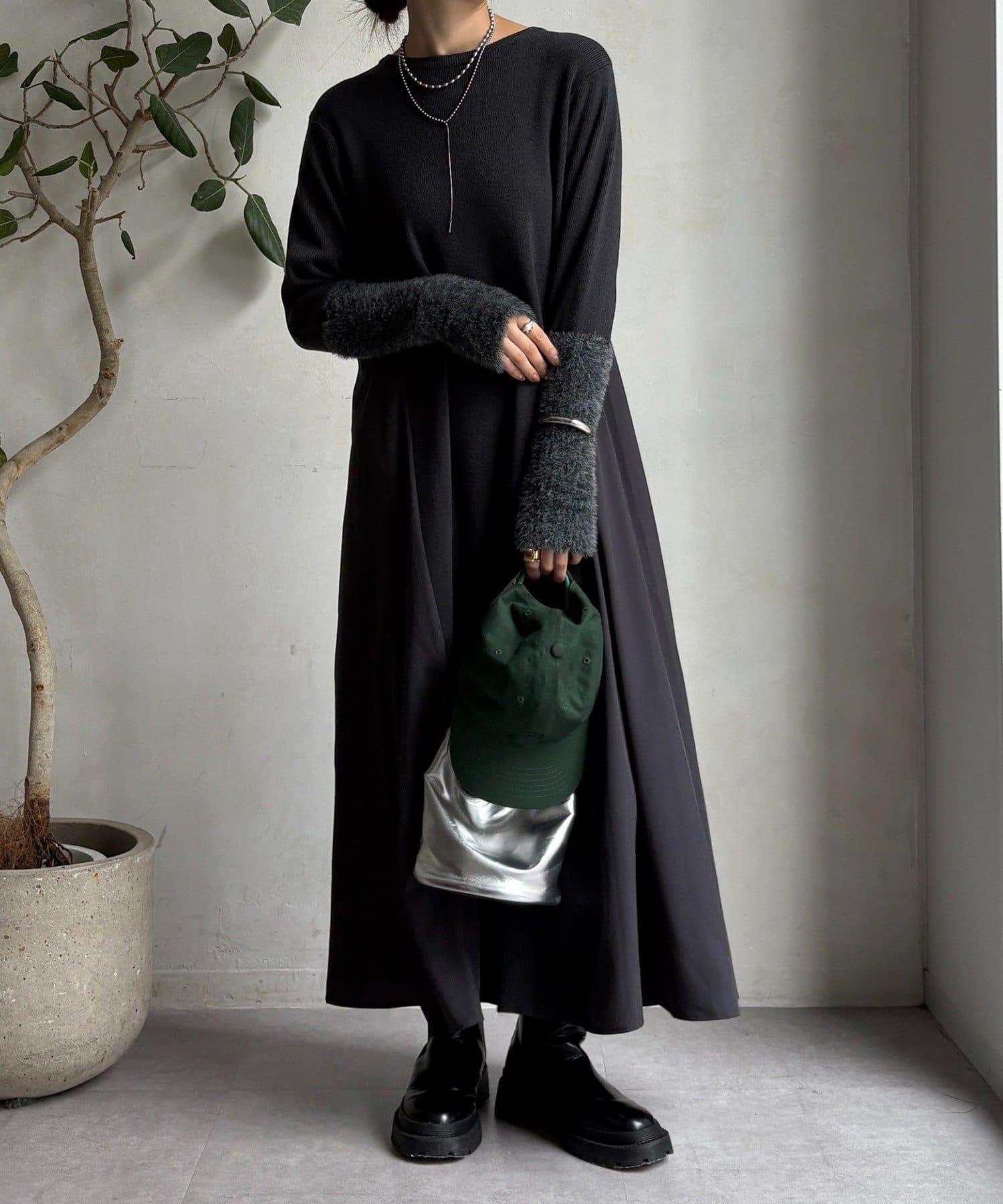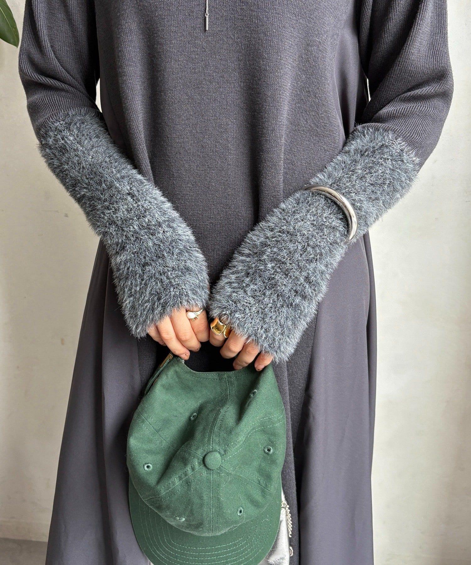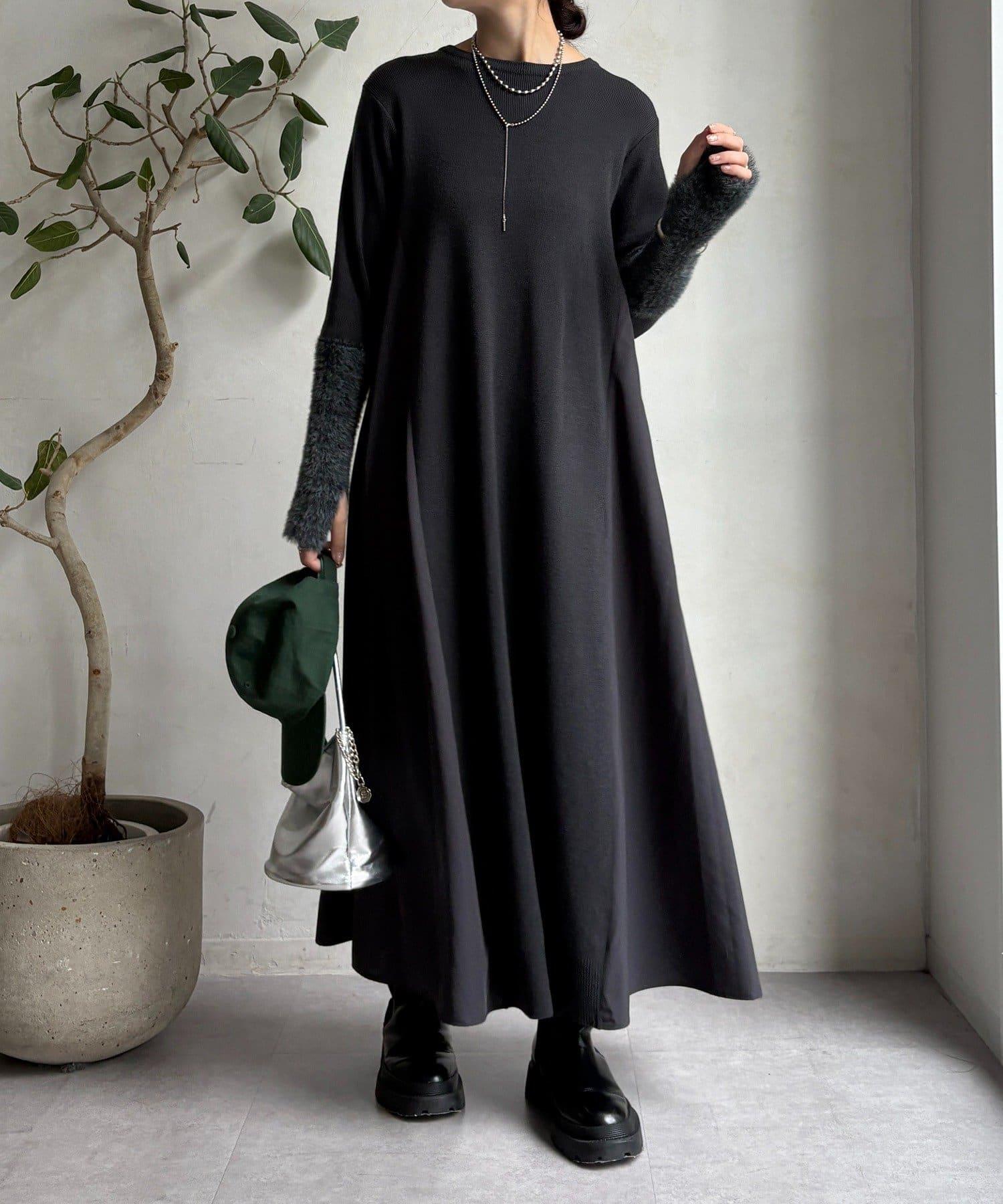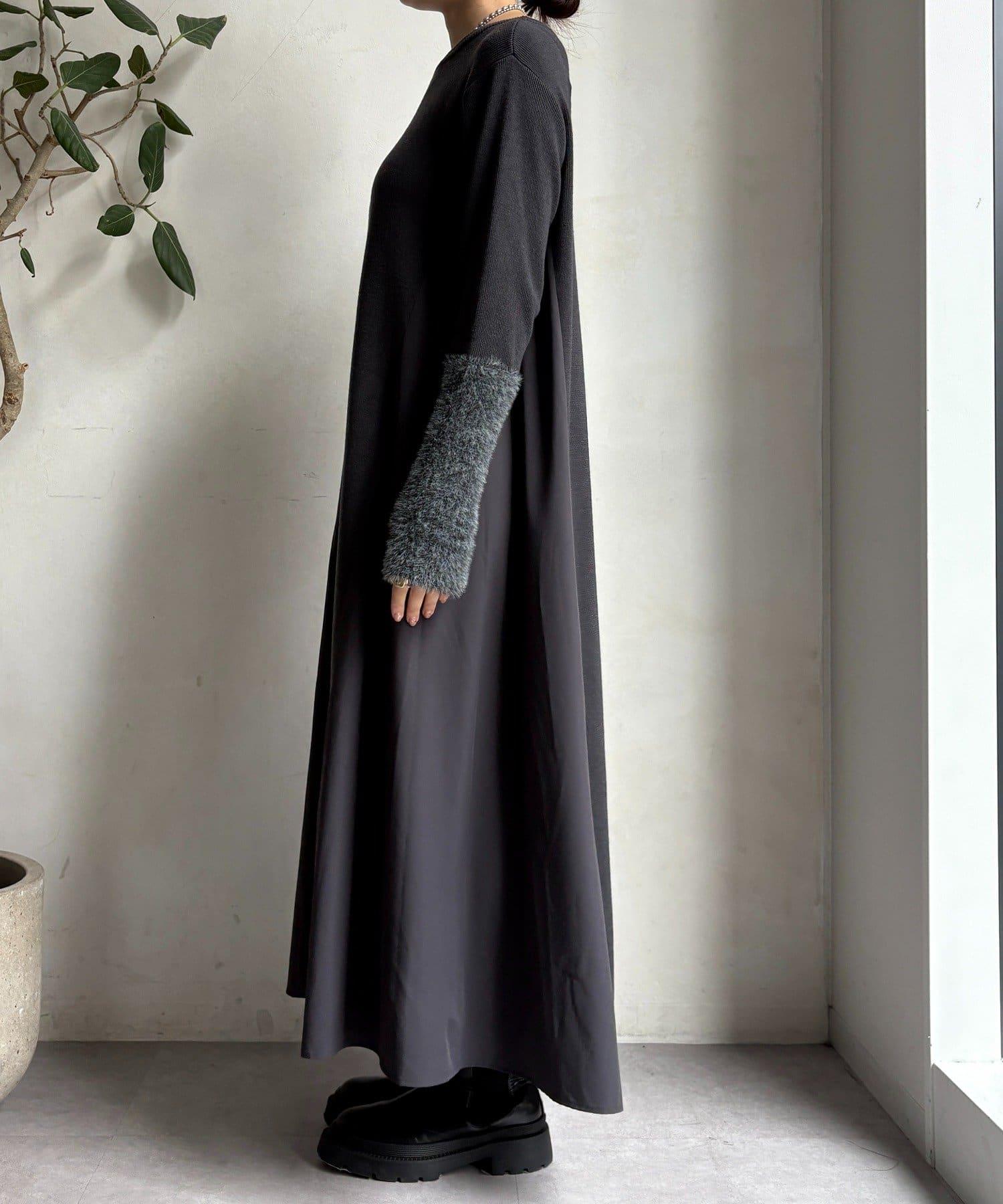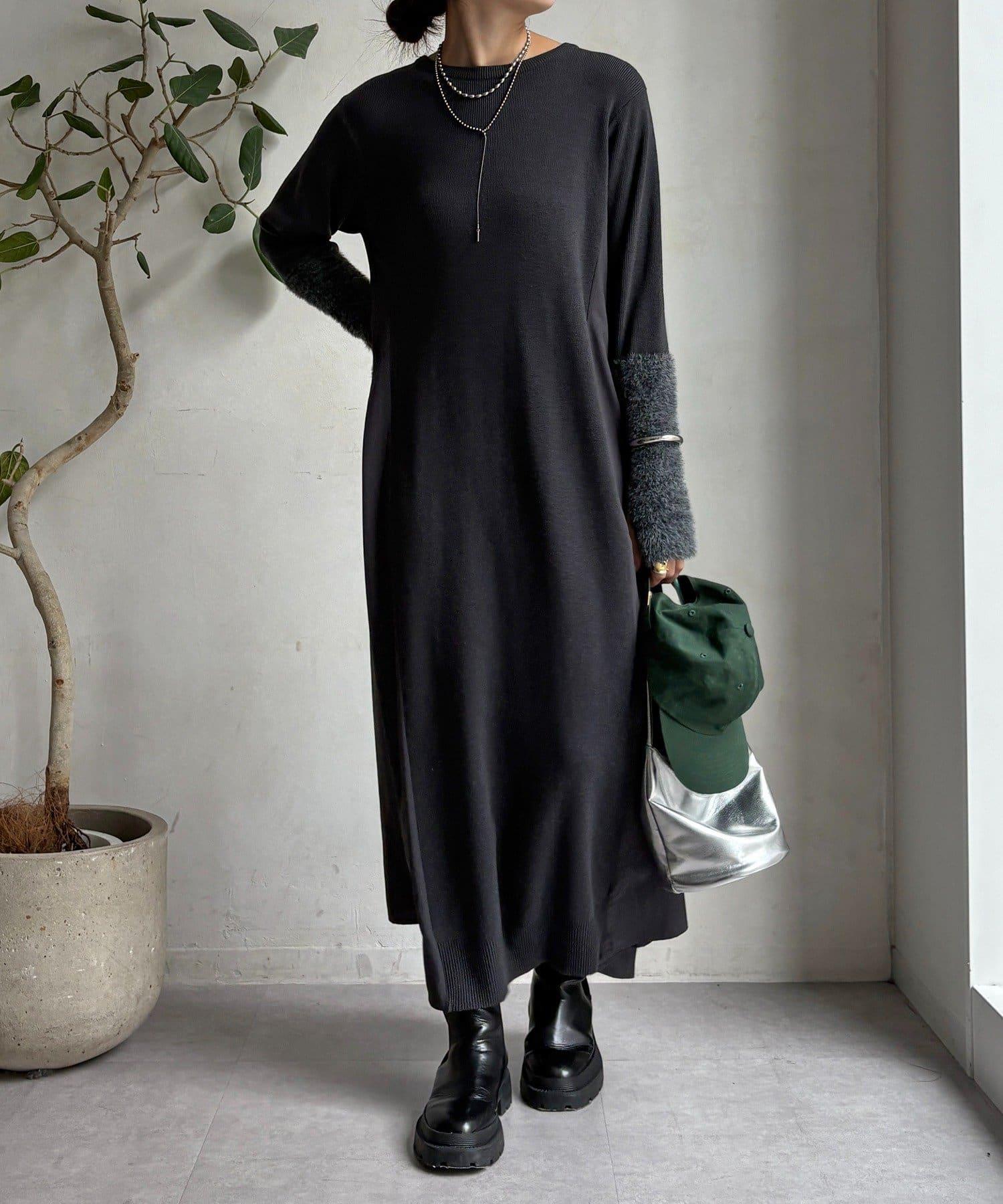 蓬鬆的絨毛材質與優雅的編織面料相結合的連身裙。