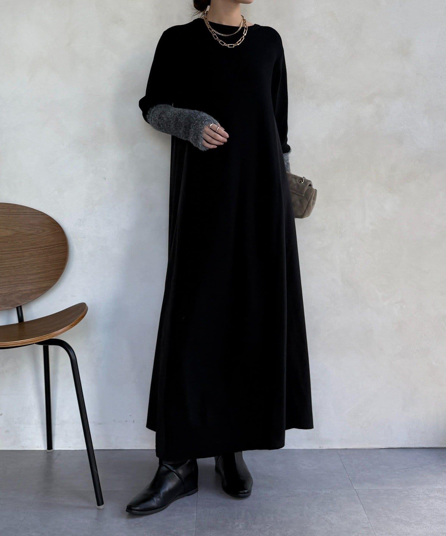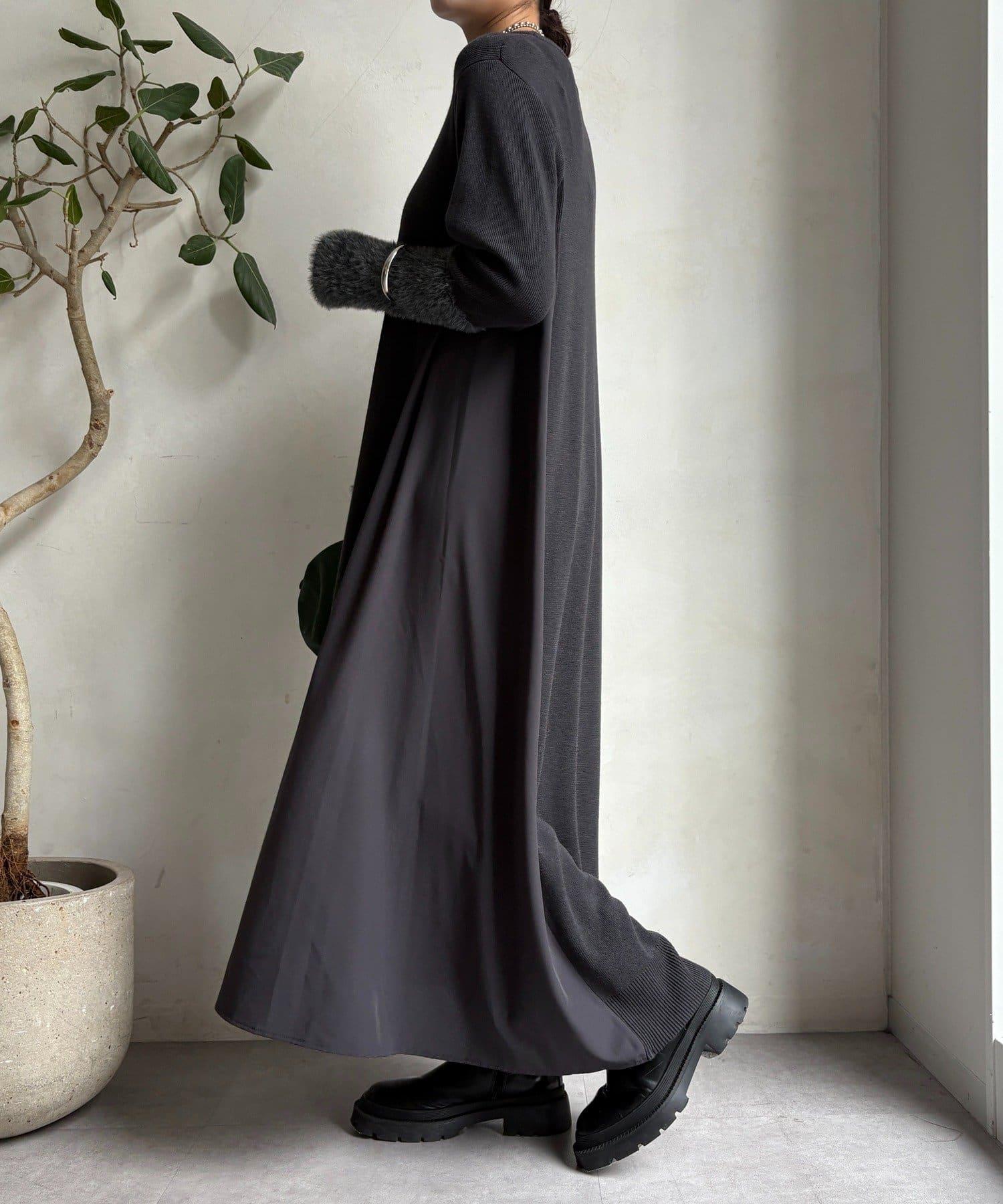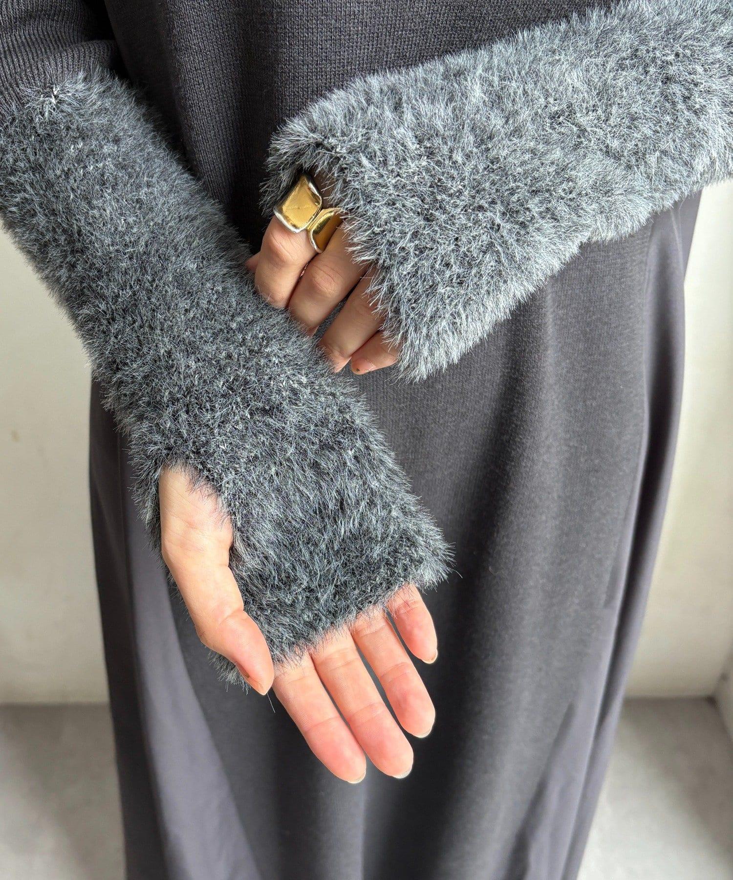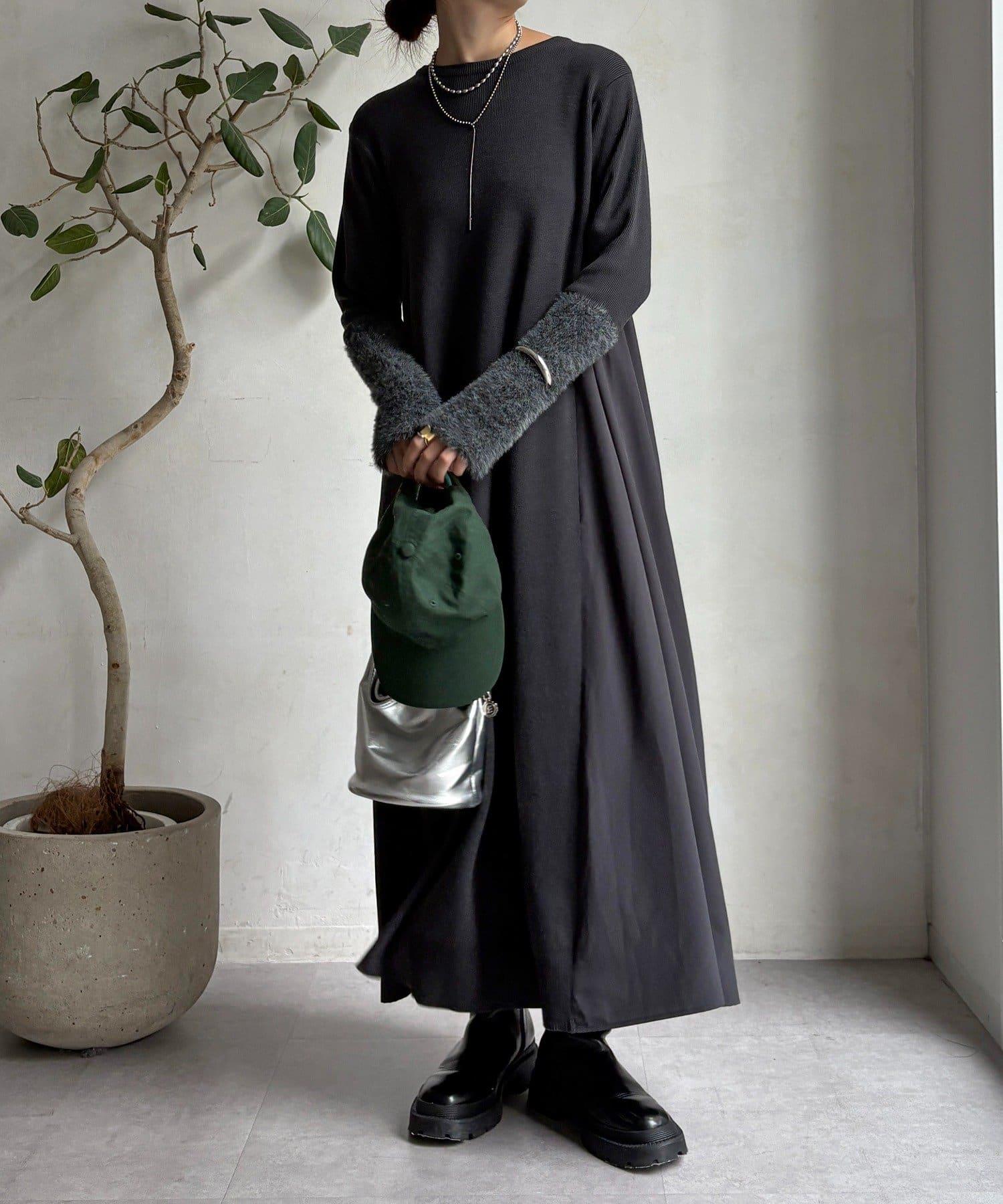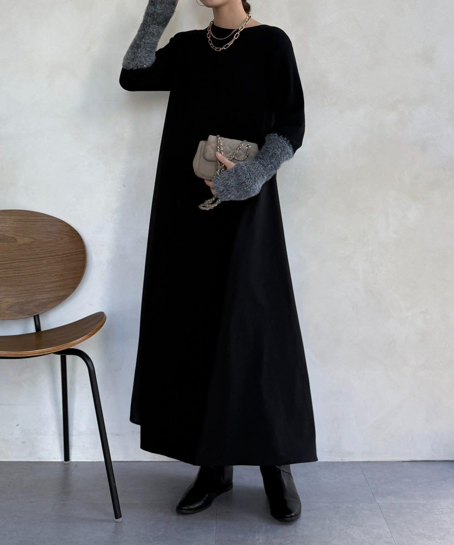 蓬鬆的絨毛材質與優雅的編織面料相結合的連身裙。