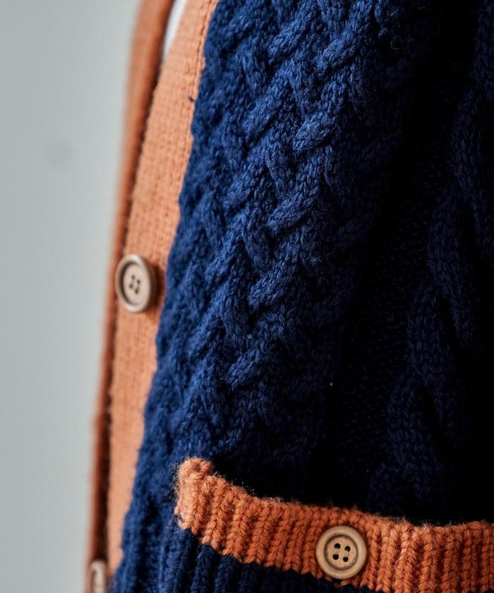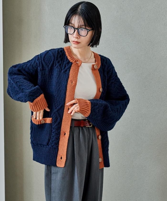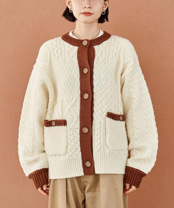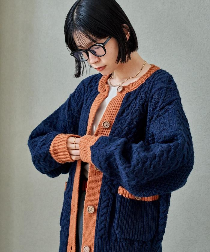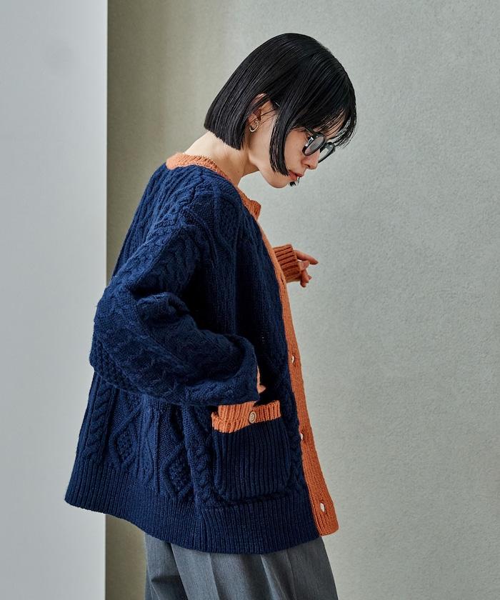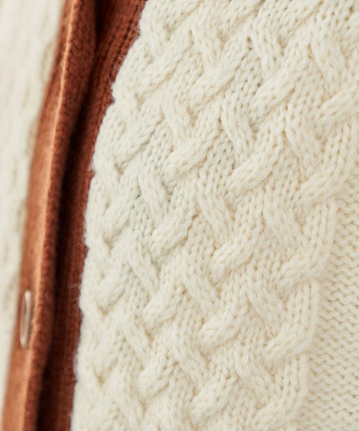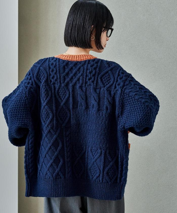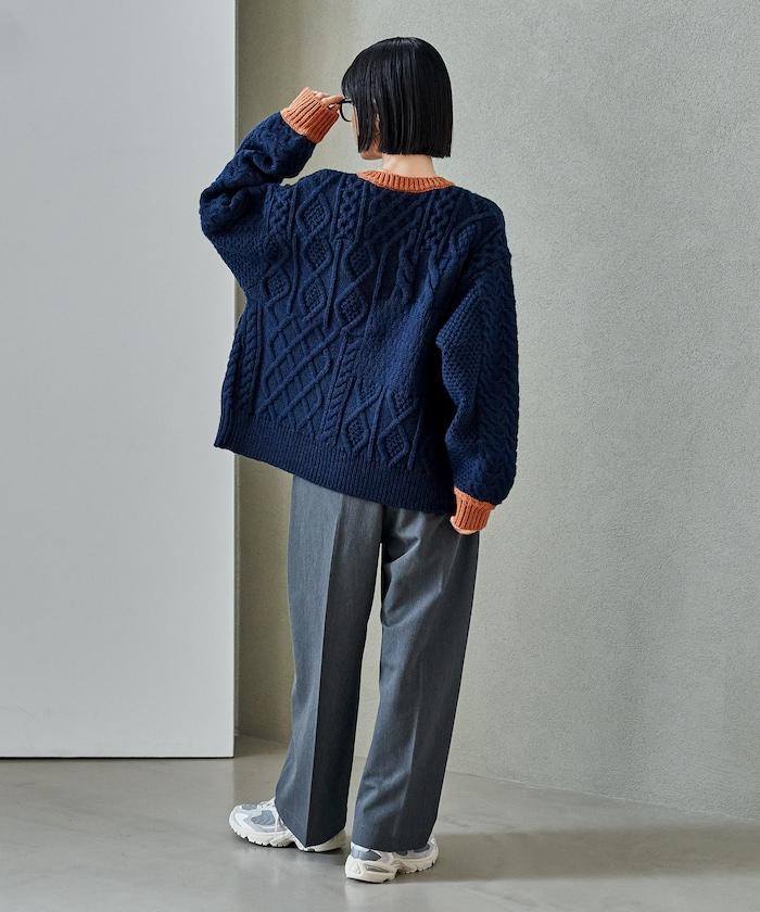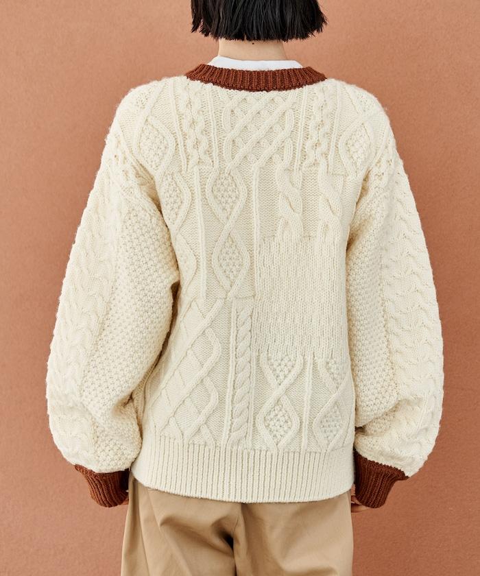 通過調換針織面料,以拼接方式完成的電纜針織衫,並添加了配色設計。