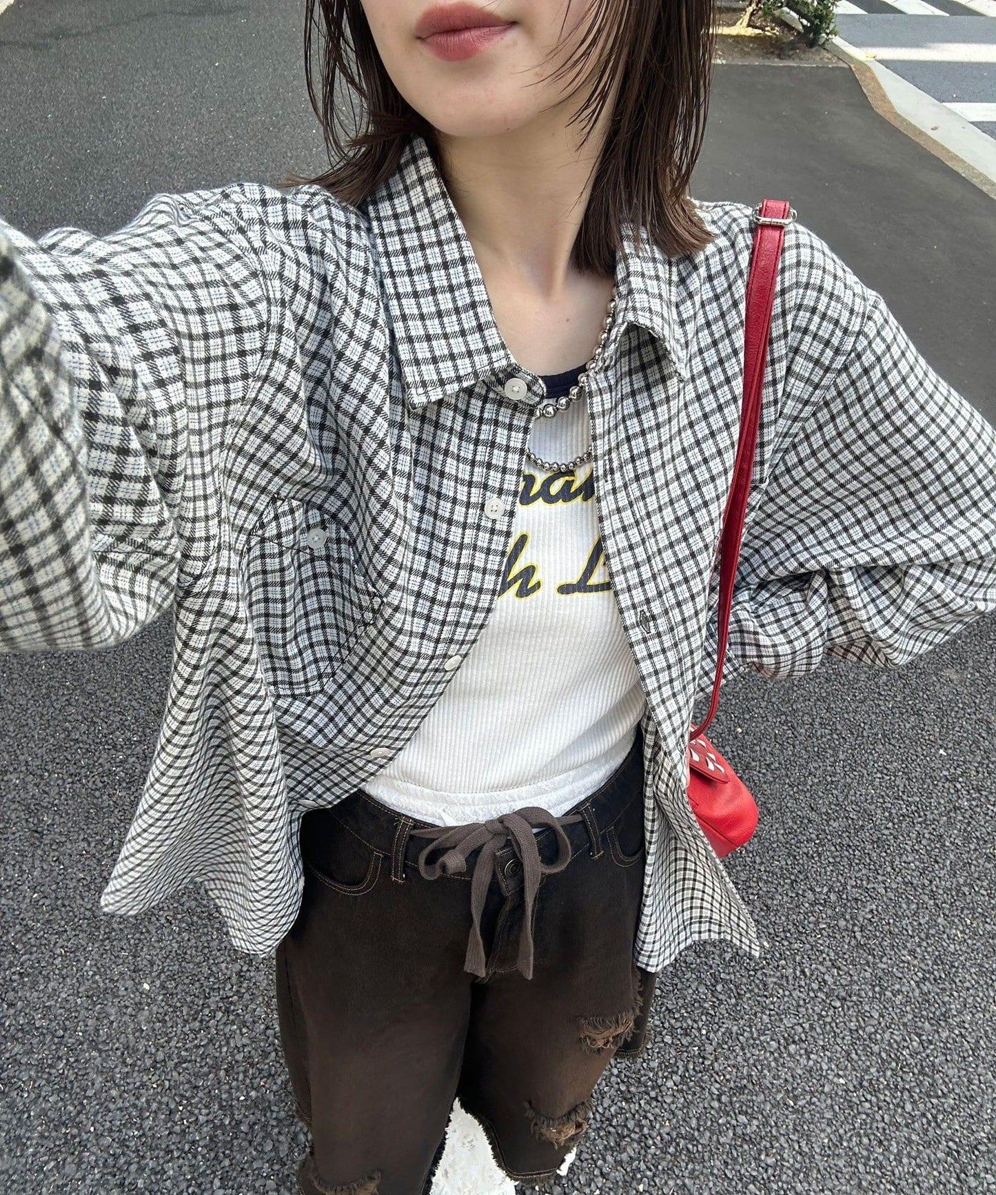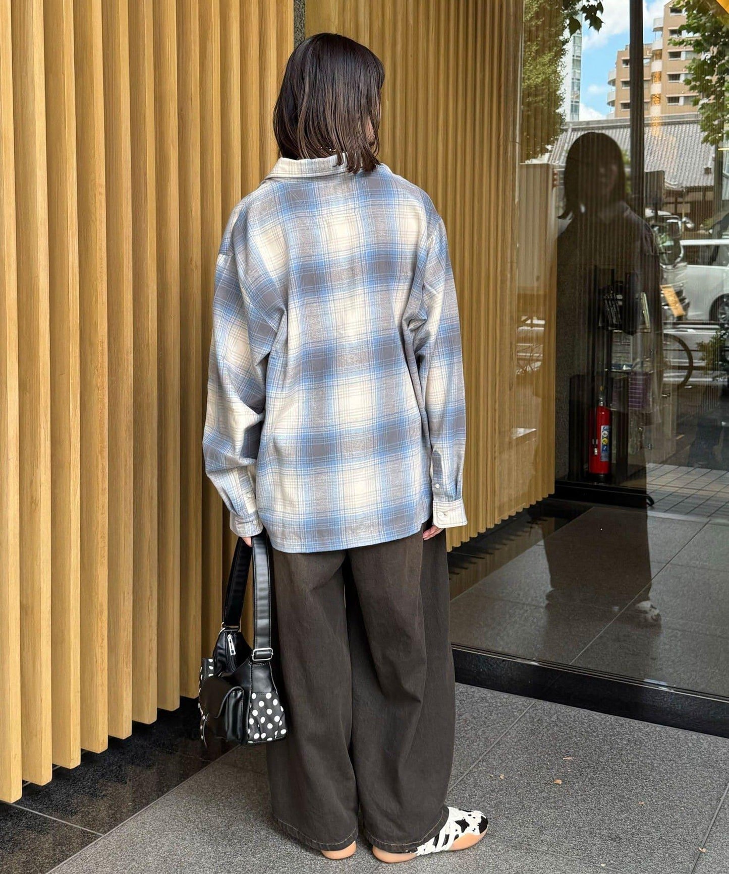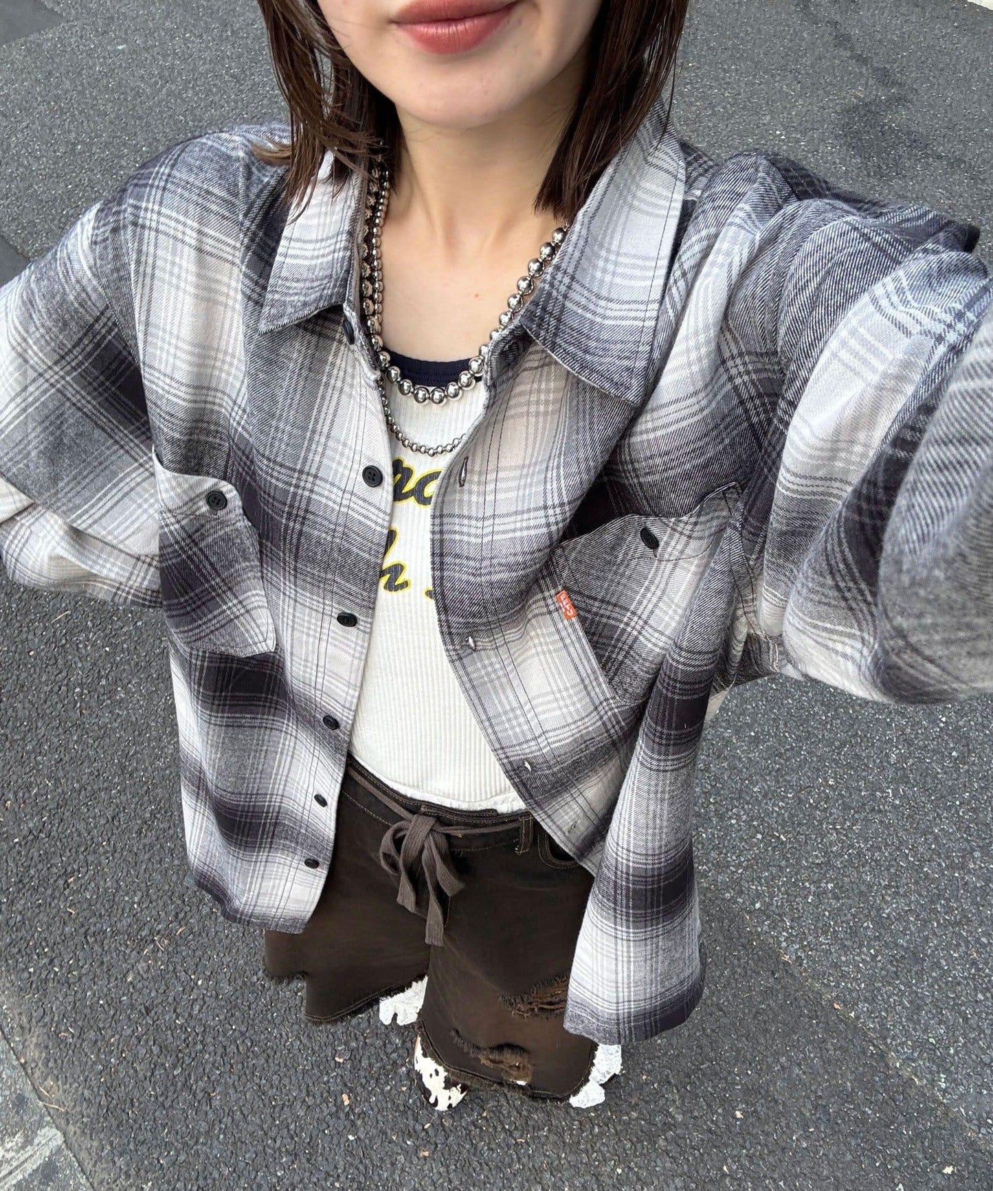 以休閒格紋圖案為基礎,採用適度寬鬆的剪裁,增添了輕鬆的感覺。