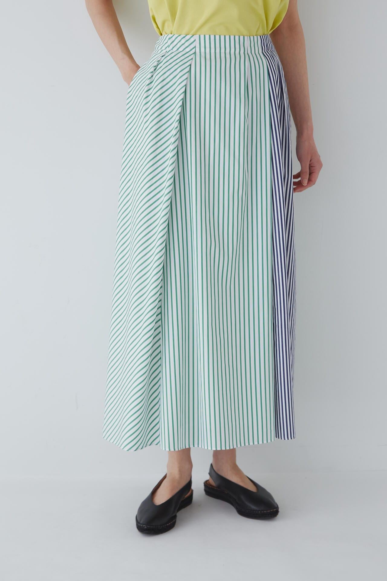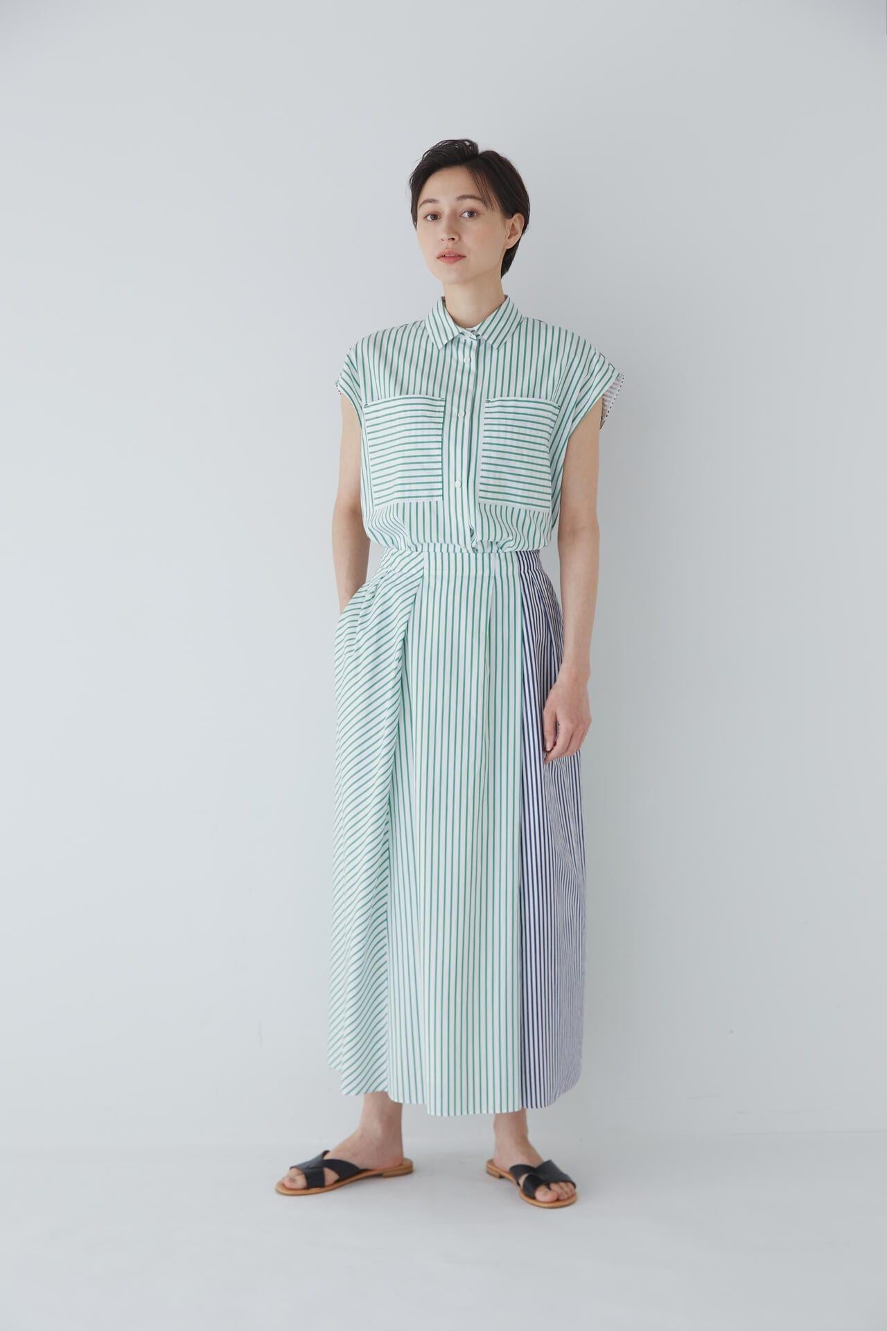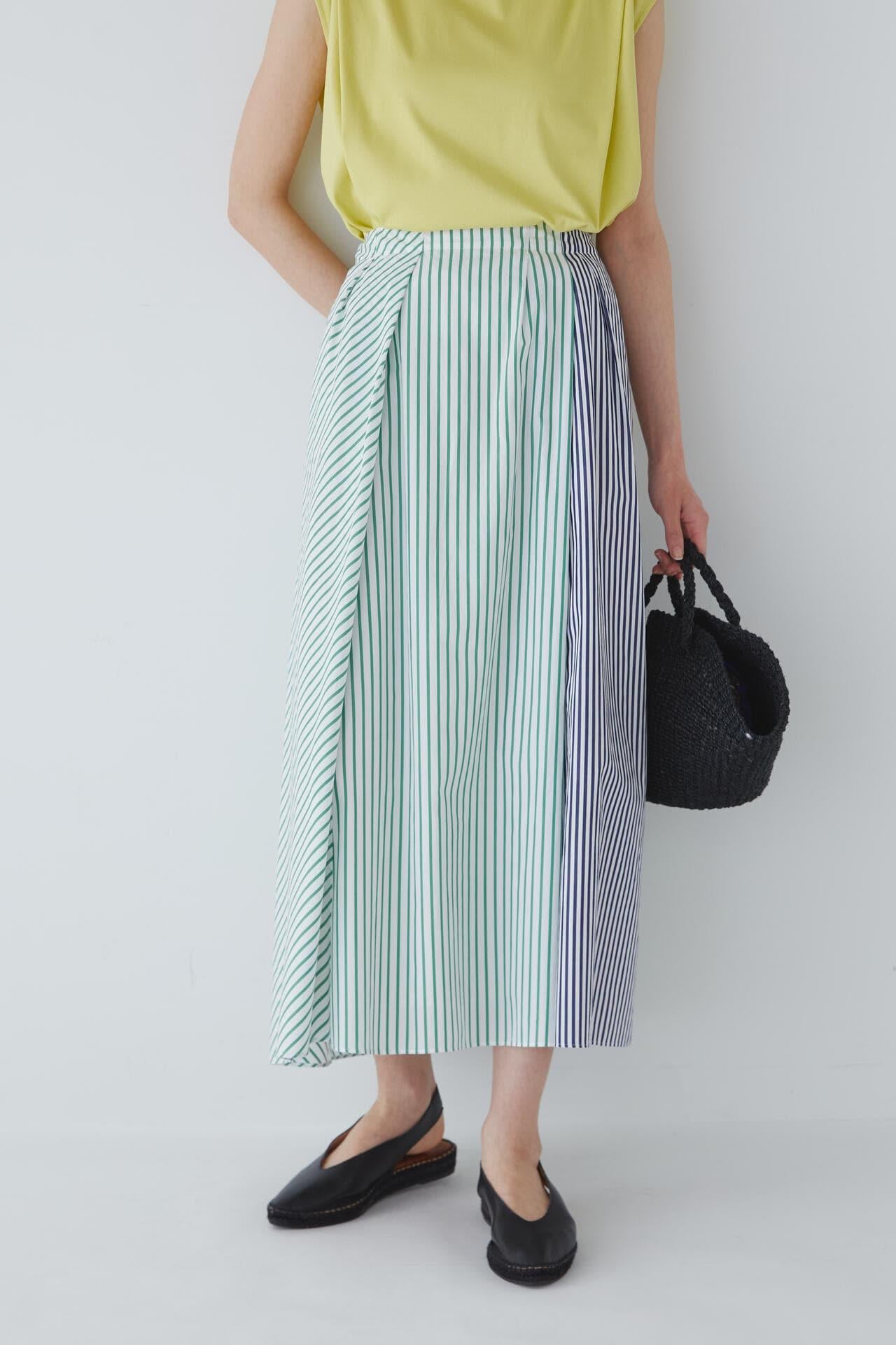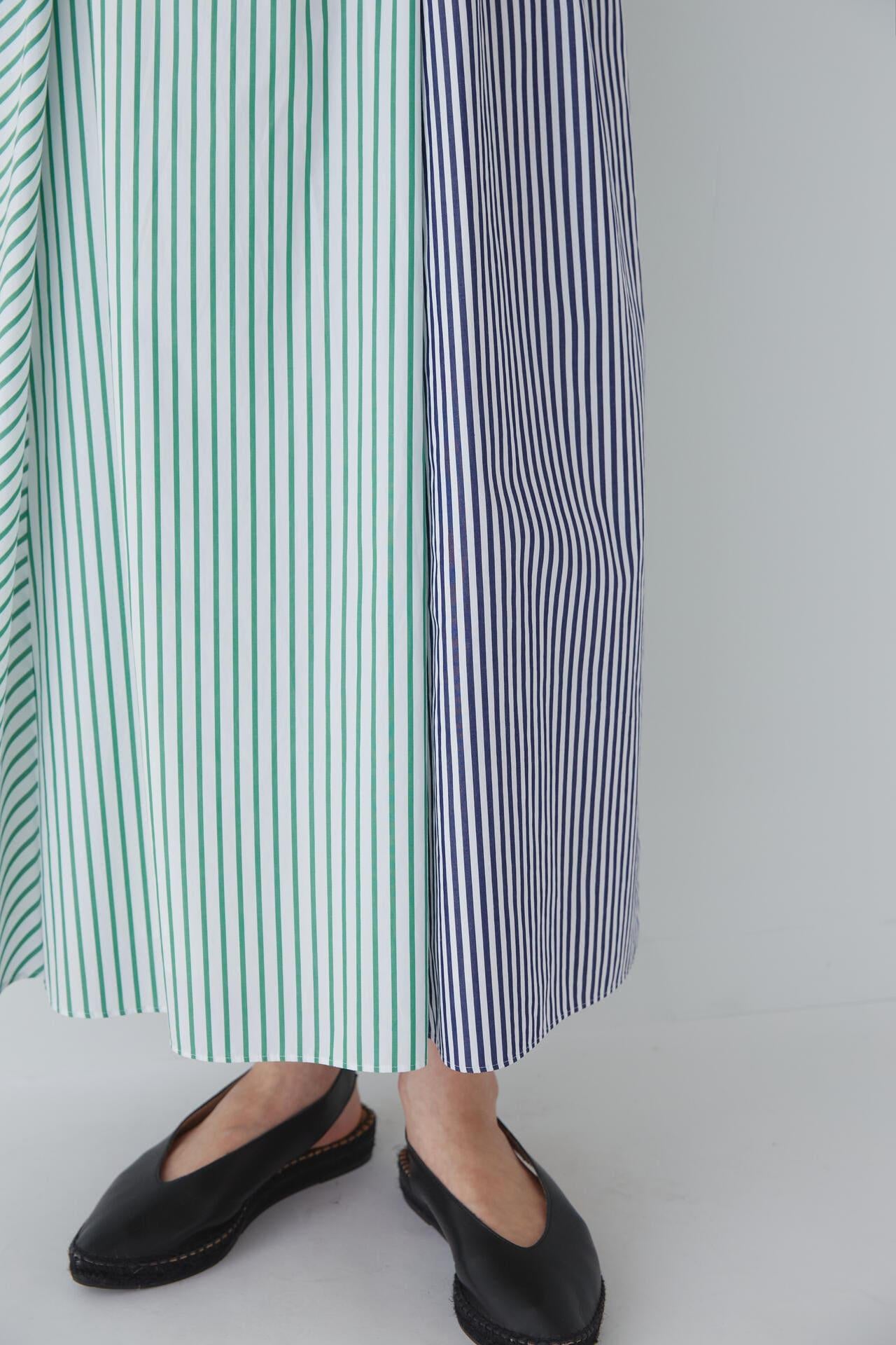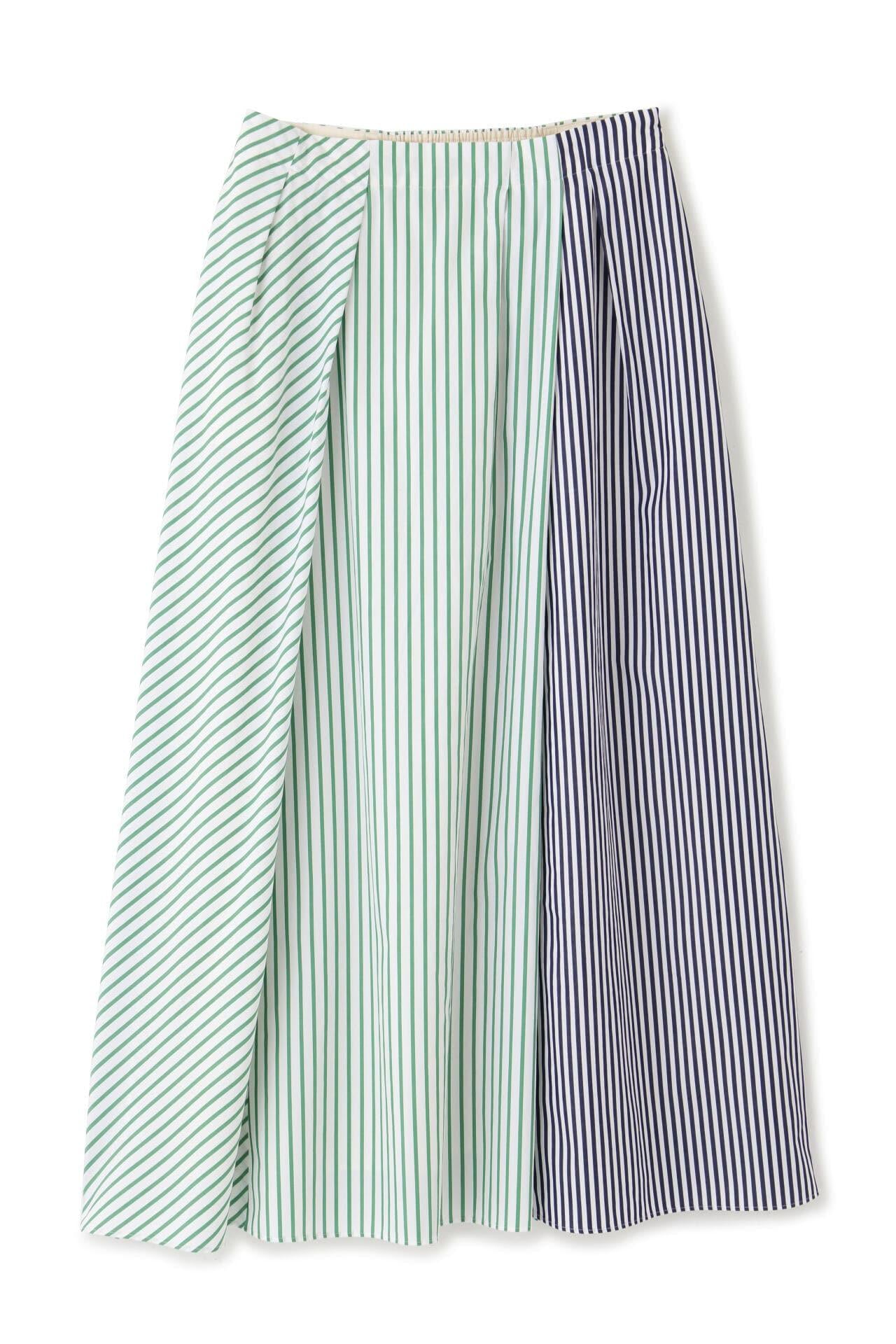 條紋裙,醒目大膽的混合圖案 [設計特色] 隨機燕尾服裙,採用混合條紋圖案設計。僅在側縫處使用了不同圖案的面料。深襉和背面右側圖案方向的變化,使設計充滿俏皮感。背部中央的腰部有鬆緊帶,穿著舒適。採用 100% 純棉色織條紋面料製成。兩種顏色組合分別是綠色和海軍藍的對比組合,以及成人圖案變化組合的藍色單調組合。裙子單穿也很好看,可以簡單搭配一件 T 恤,也可以搭配一件彩色上衣。