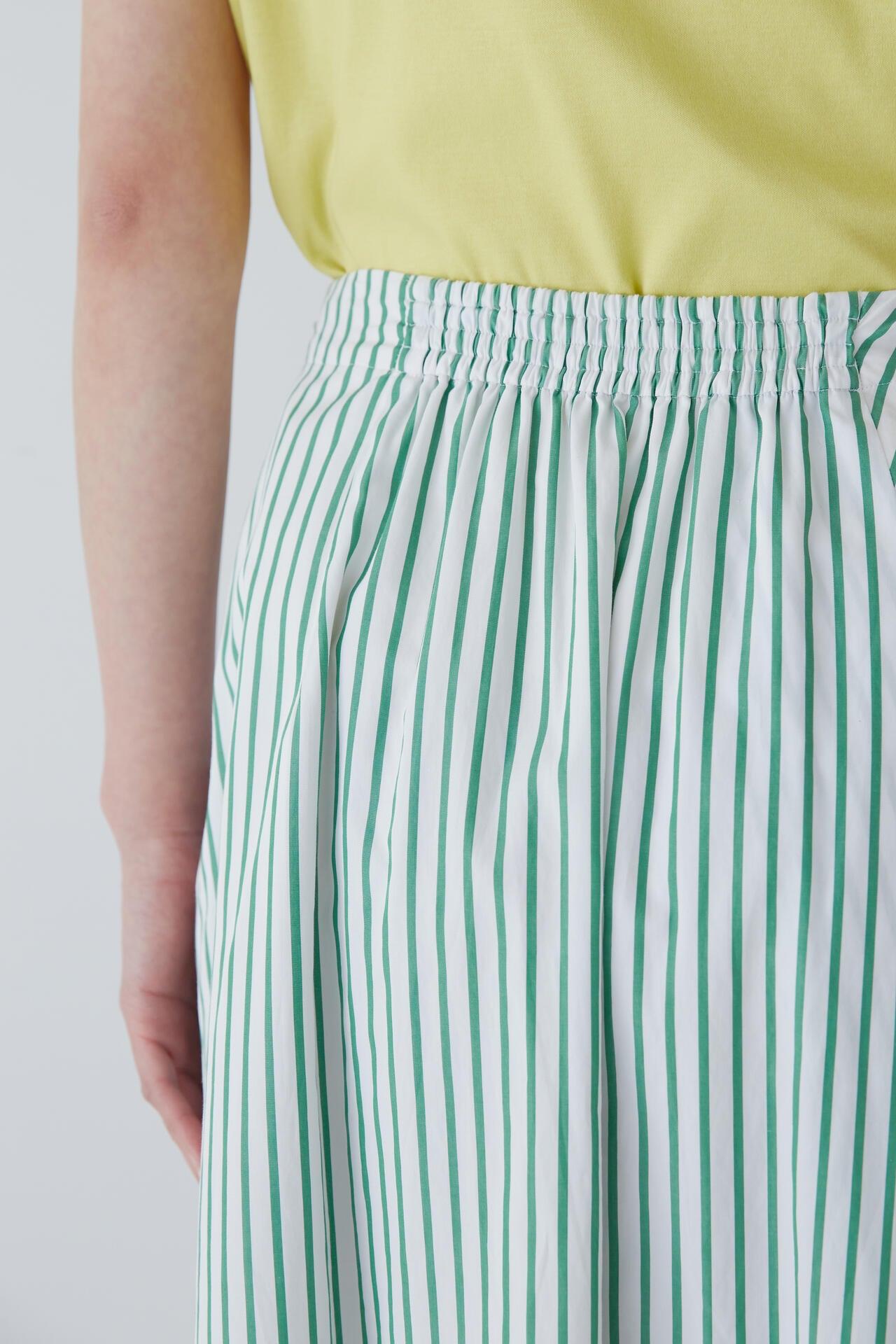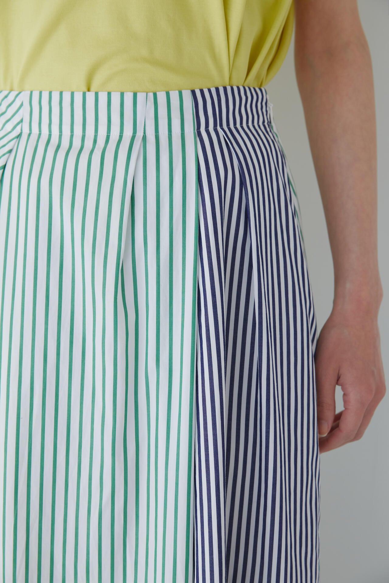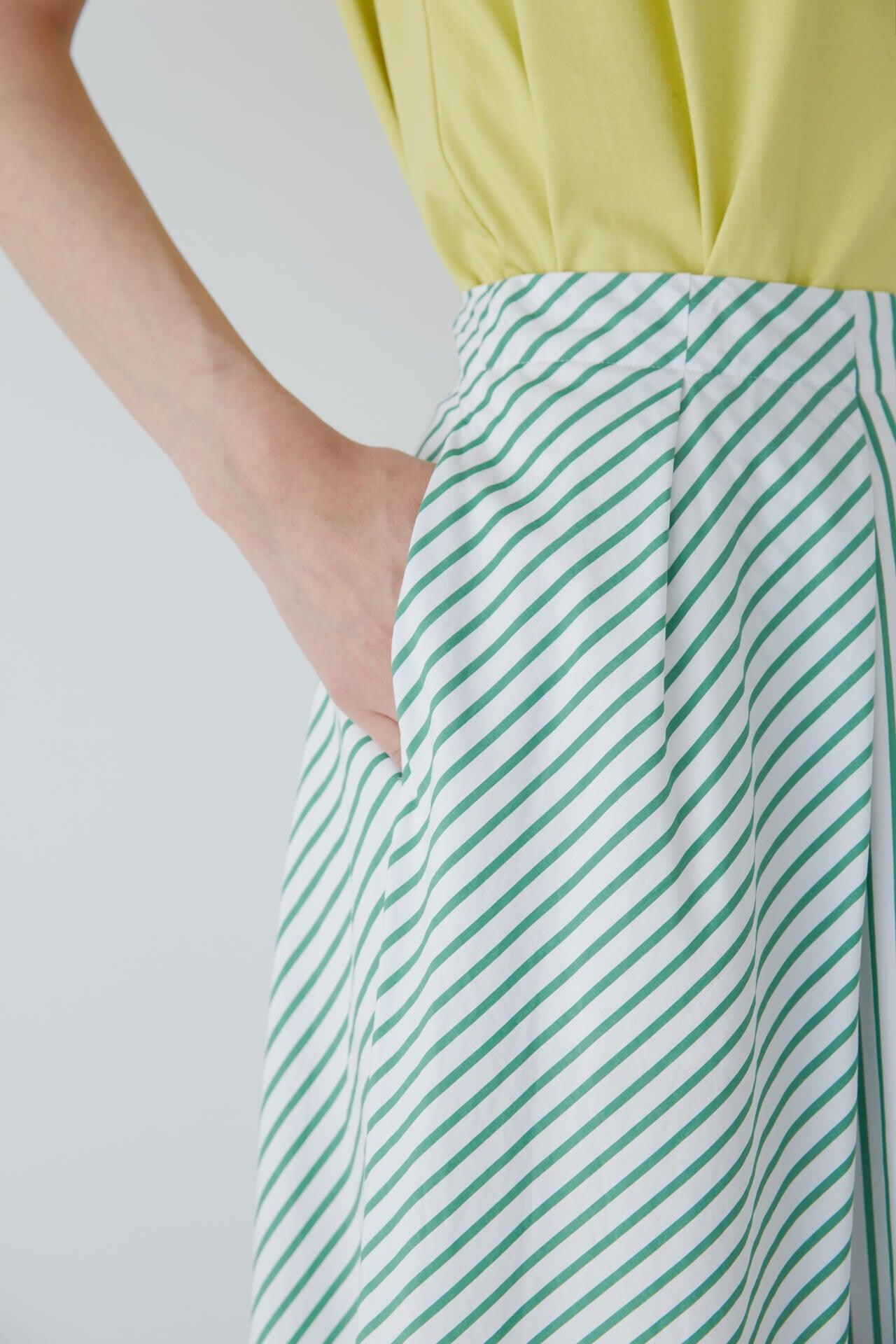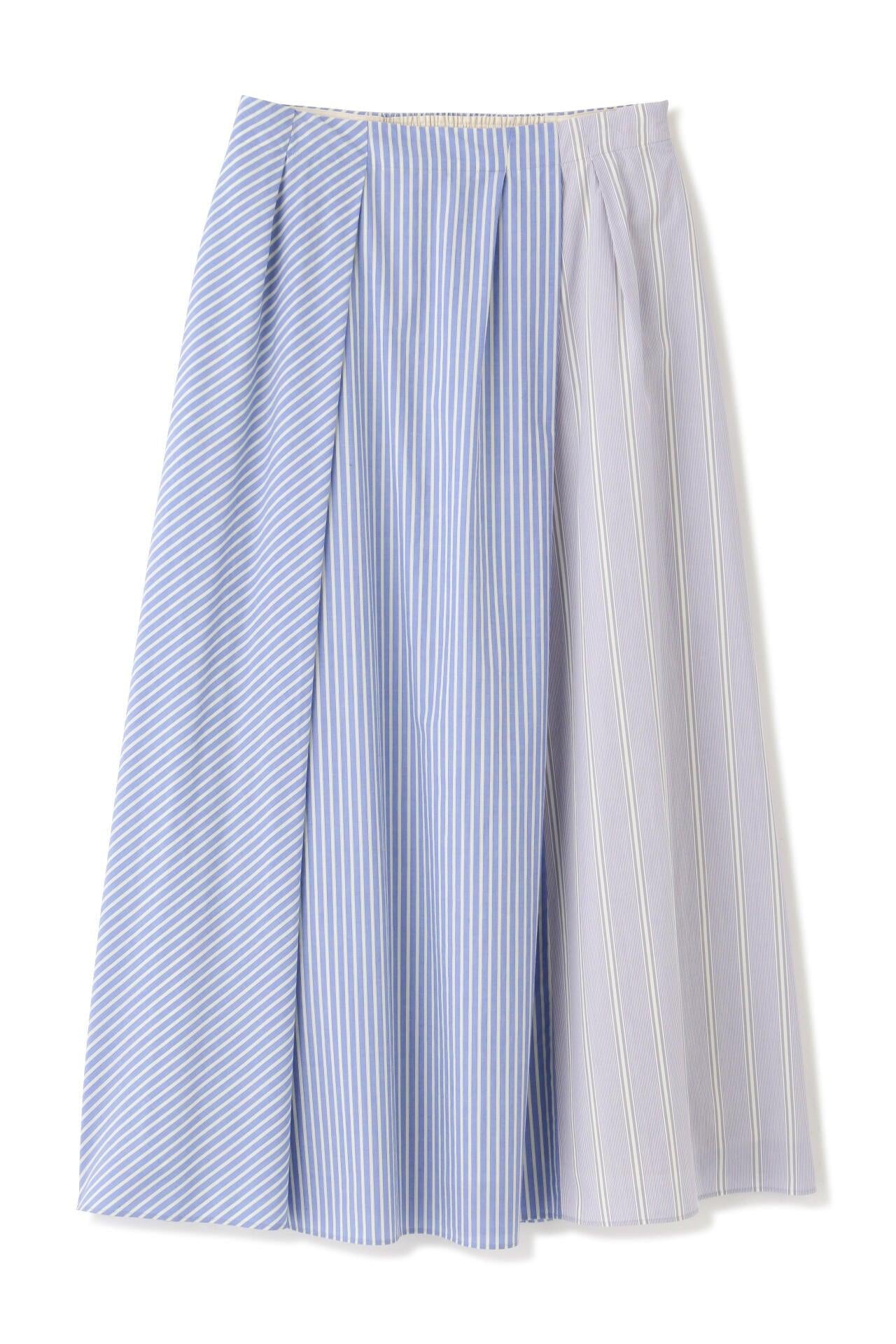 條紋裙,醒目大膽的混合圖案 [設計特色] 隨機燕尾服裙,採用混合條紋圖案設計。僅在側縫處使用了不同圖案的面料。深襉和背面右側圖案方向的變化,使設計充滿俏皮感。背部中央的腰部有鬆緊帶,穿著舒適。採用 100% 純棉色織條紋面料製成。兩種顏色組合分別是綠色和海軍藍的對比組合,以及成人圖案變化組合的藍色單調組合。裙子單穿也很好看,可以簡單搭配一件 T 恤,也可以搭配一件彩色上衣。