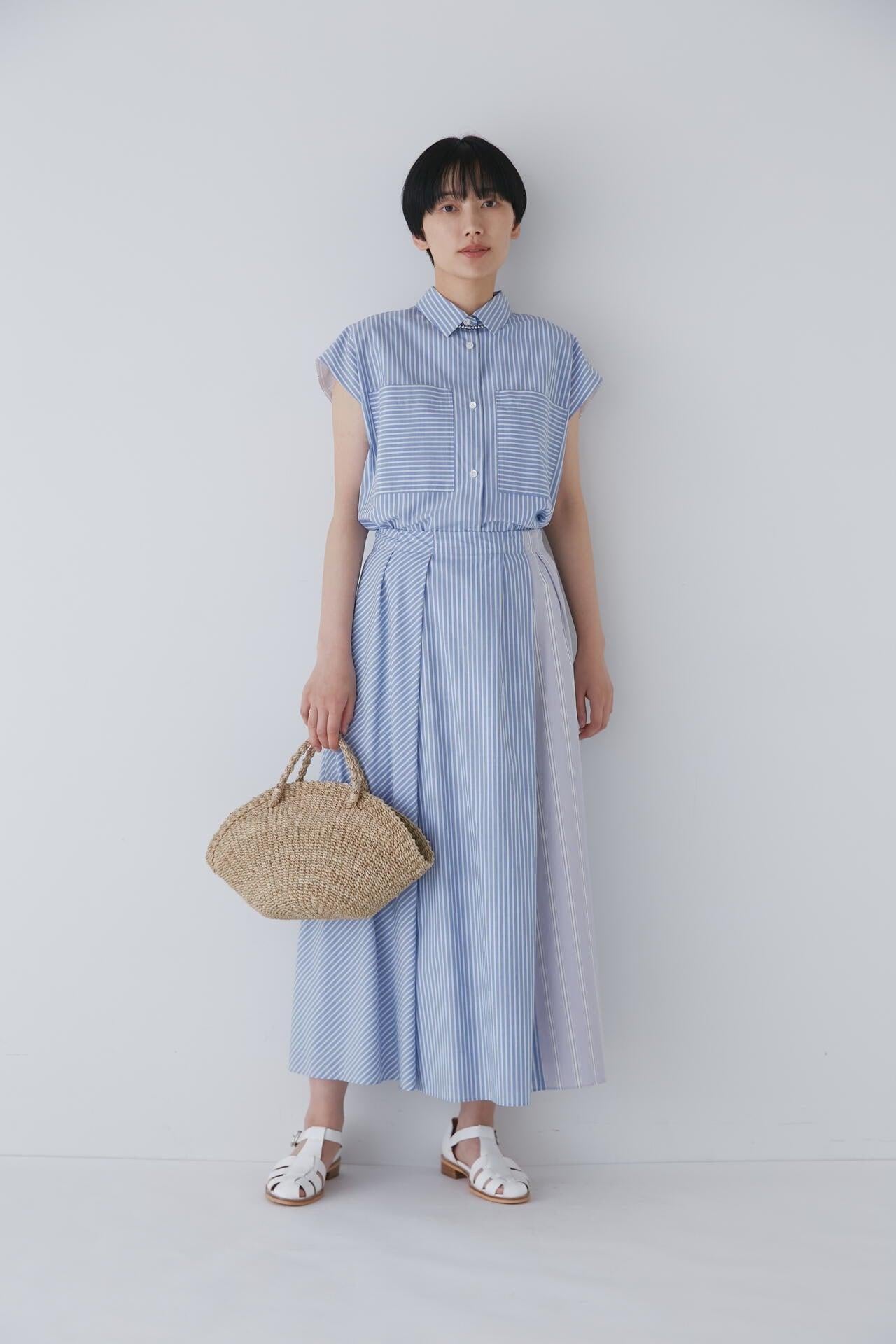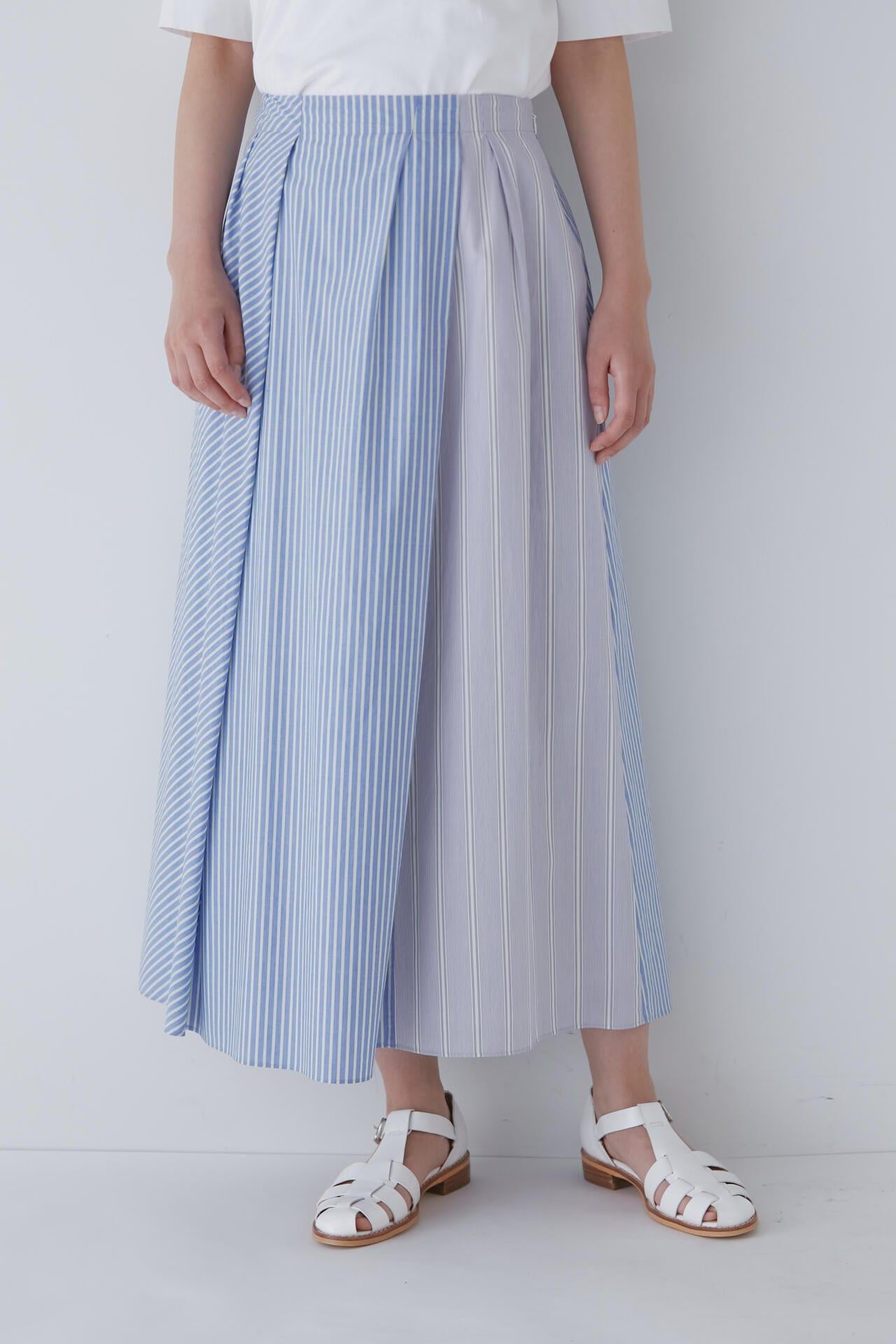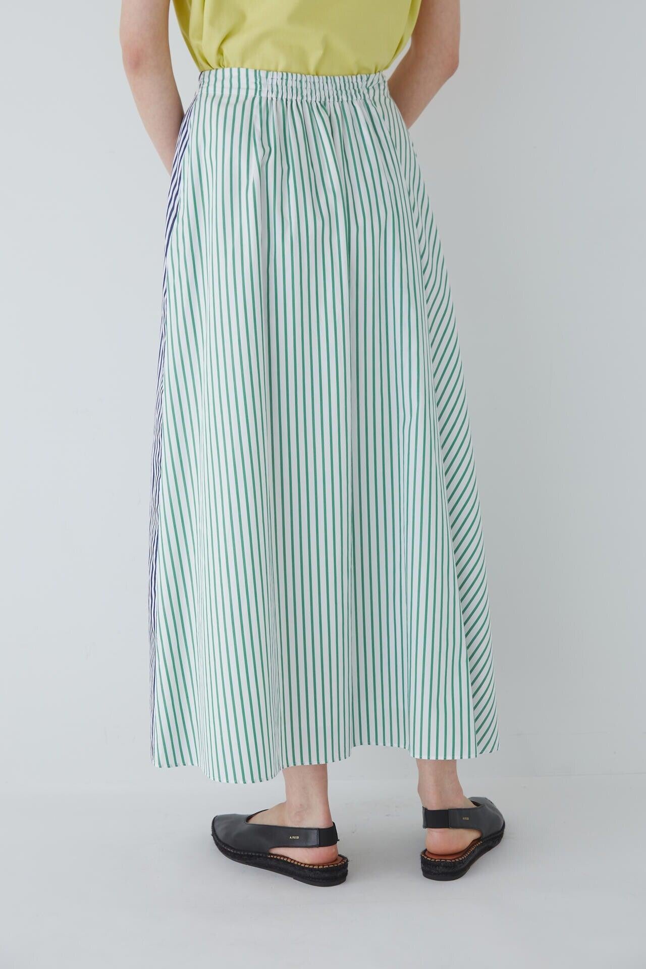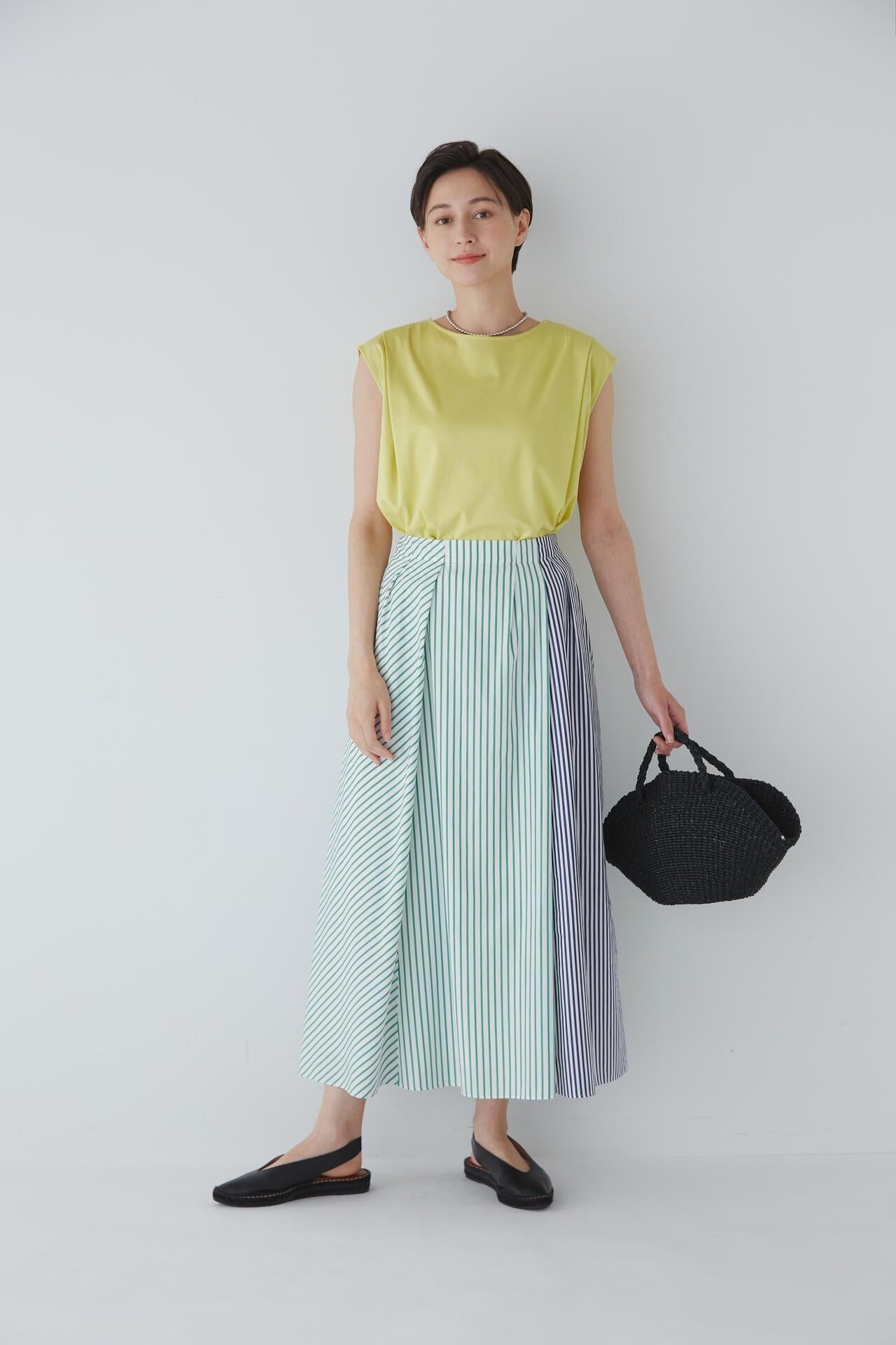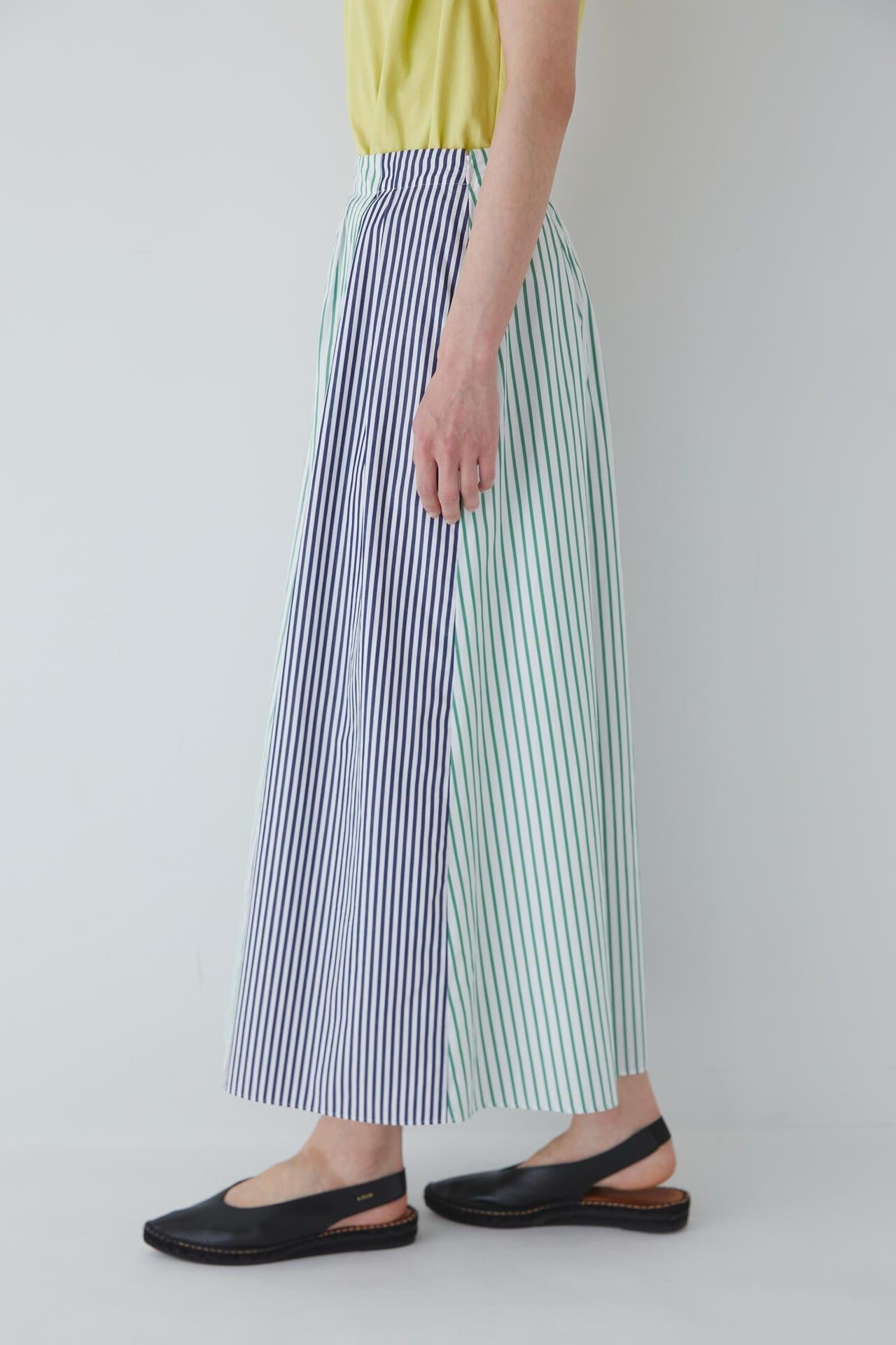 條紋裙,醒目大膽的混合圖案 [設計特色] 隨機燕尾服裙,採用混合條紋圖案設計。僅在側縫處使用了不同圖案的面料。深襉和背面右側圖案方向的變化,使設計充滿俏皮感。背部中央的腰部有鬆緊帶,穿著舒適。採用 100% 純棉色織條紋面料製成。兩種顏色組合分別是綠色和海軍藍的對比組合,以及成人圖案變化組合的藍色單調組合。裙子單穿也很好看,可以簡單搭配一件 T 恤,也可以搭配一件彩色上衣。