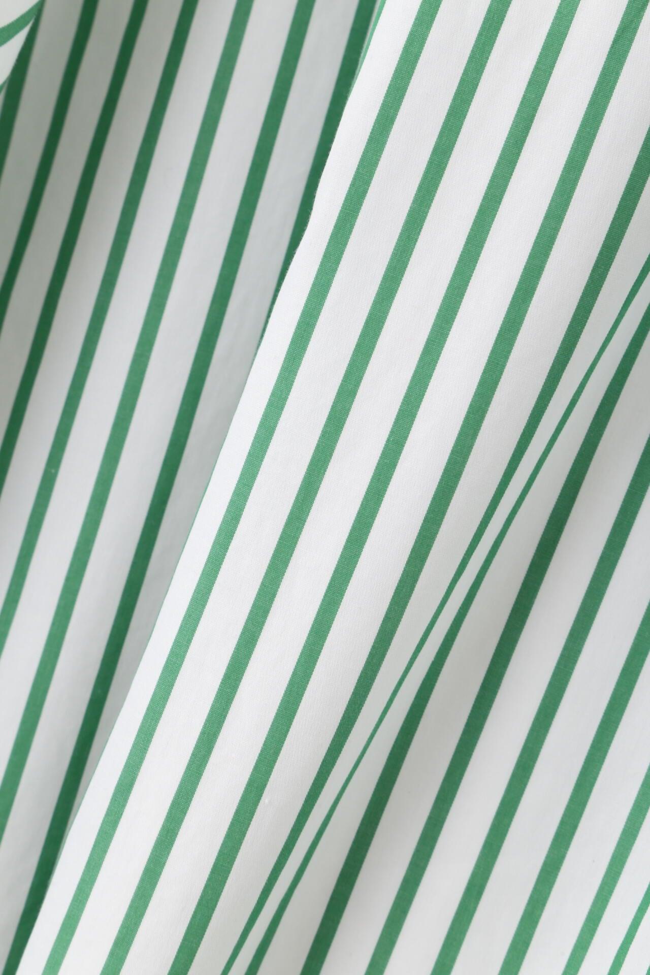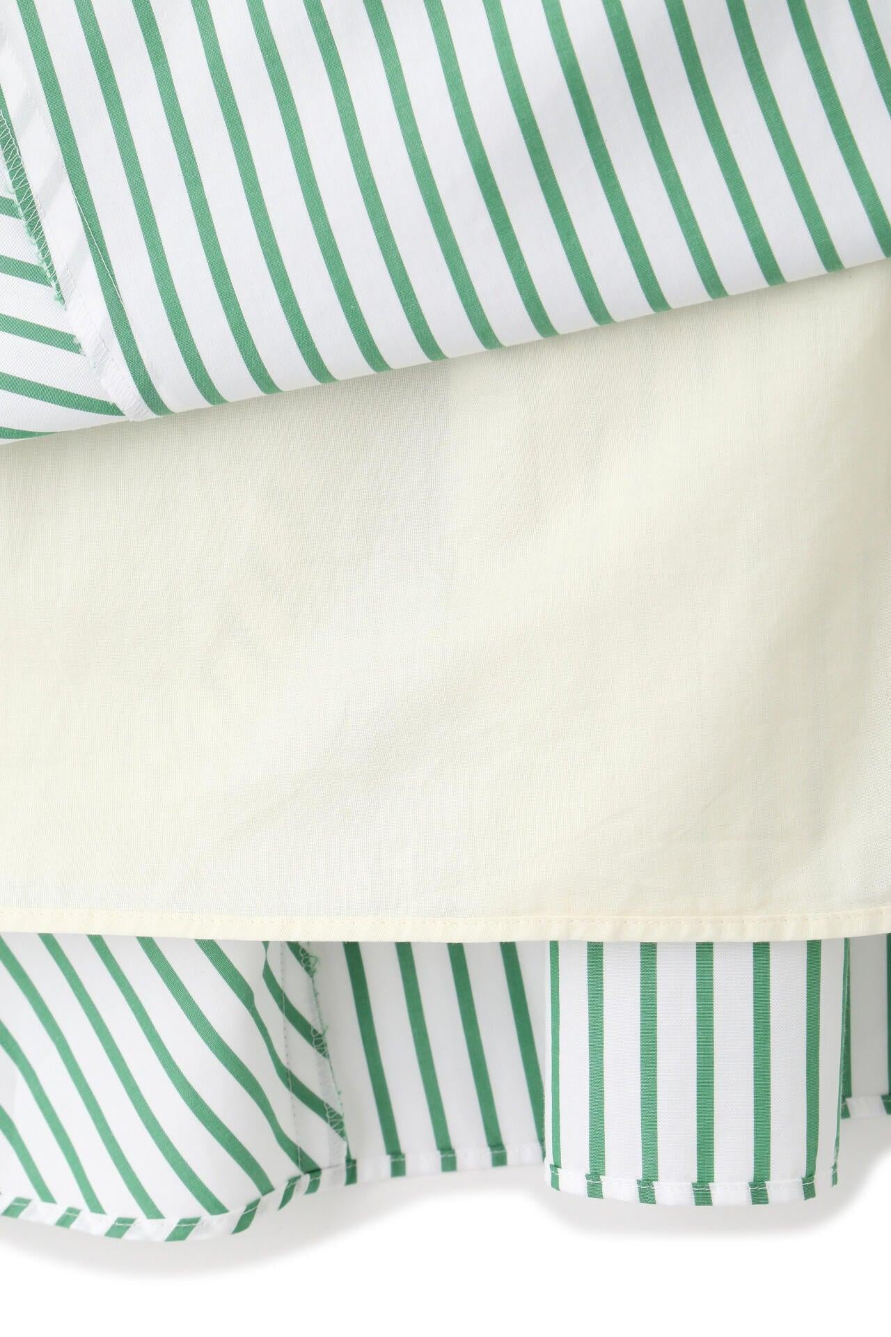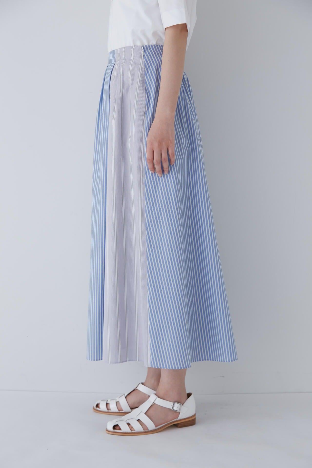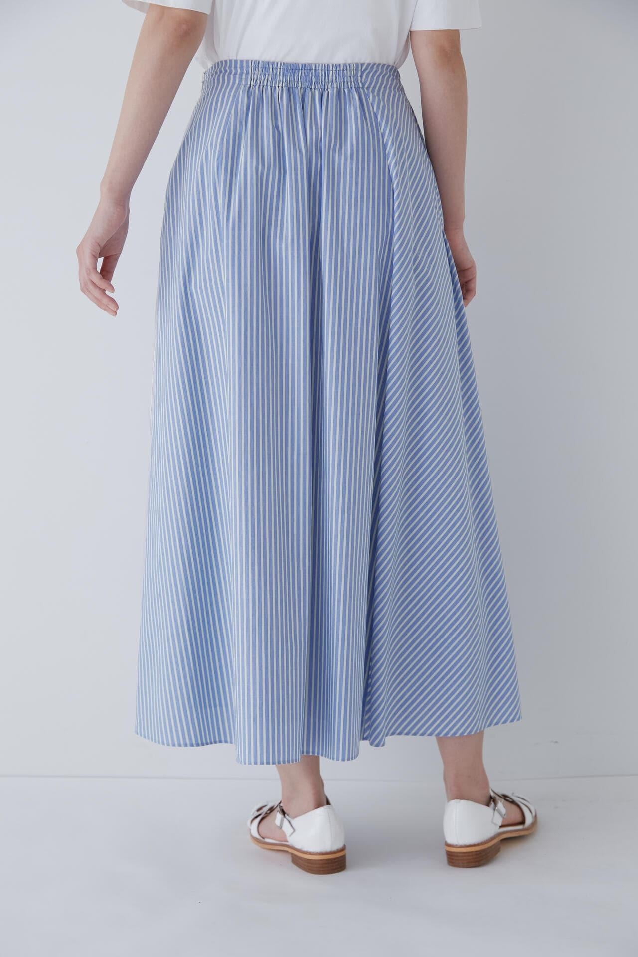 條紋裙,醒目大膽的混合圖案 [設計特色] 隨機燕尾服裙,採用混合條紋圖案設計。僅在側縫處使用了不同圖案的面料。深襉和背面右側圖案方向的變化,使設計充滿俏皮感。背部中央的腰部有鬆緊帶,穿著舒適。採用 100% 純棉色織條紋面料製成。兩種顏色組合分別是綠色和海軍藍的對比組合,以及成人圖案變化組合的藍色單調組合。裙子單穿也很好看,可以簡單搭配一件 T 恤,也可以搭配一件彩色上衣。