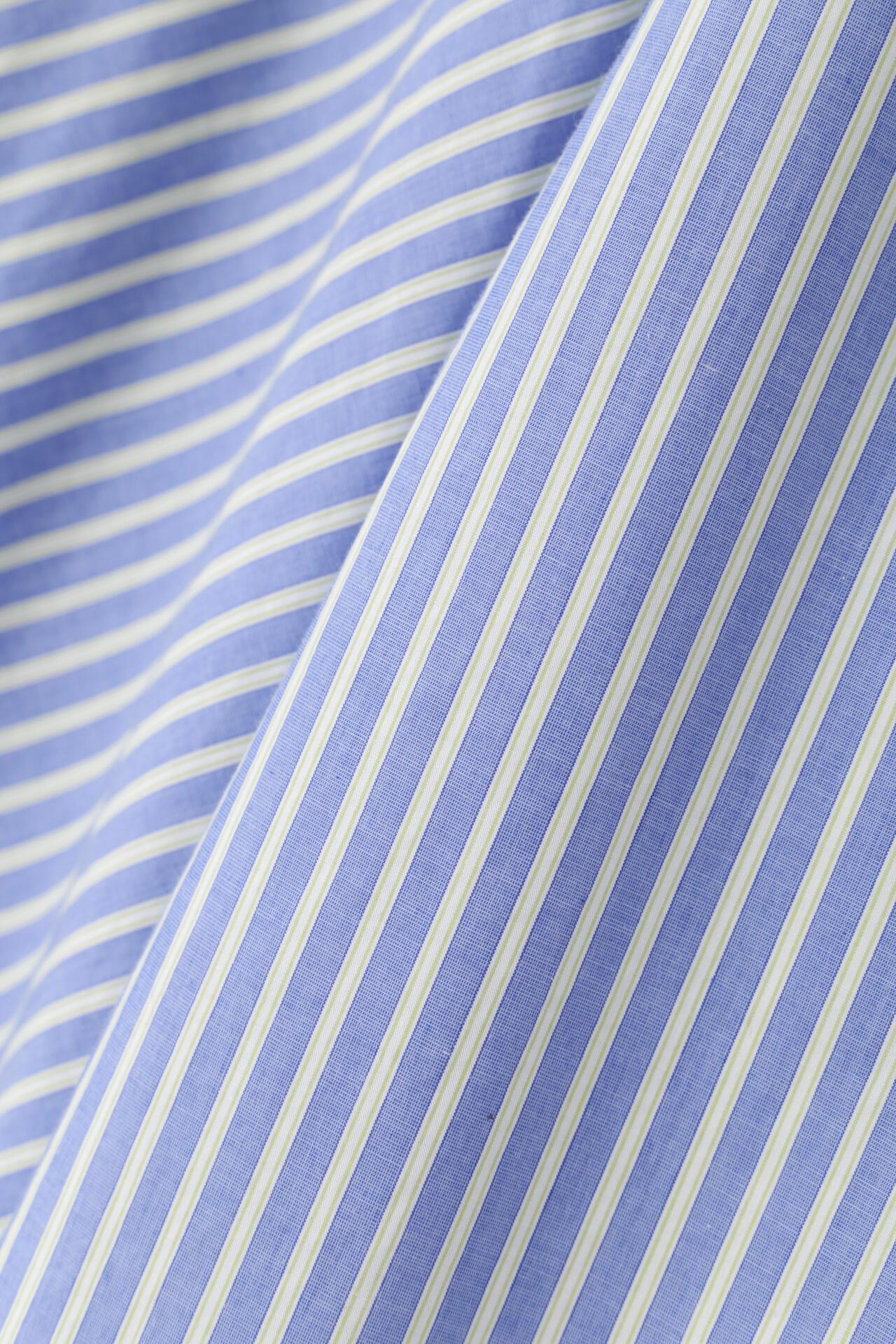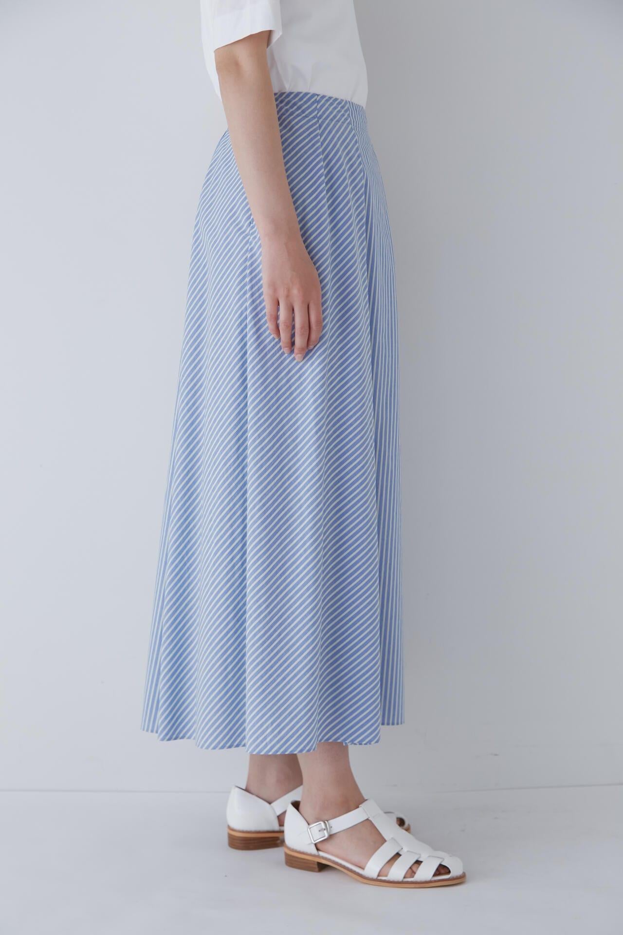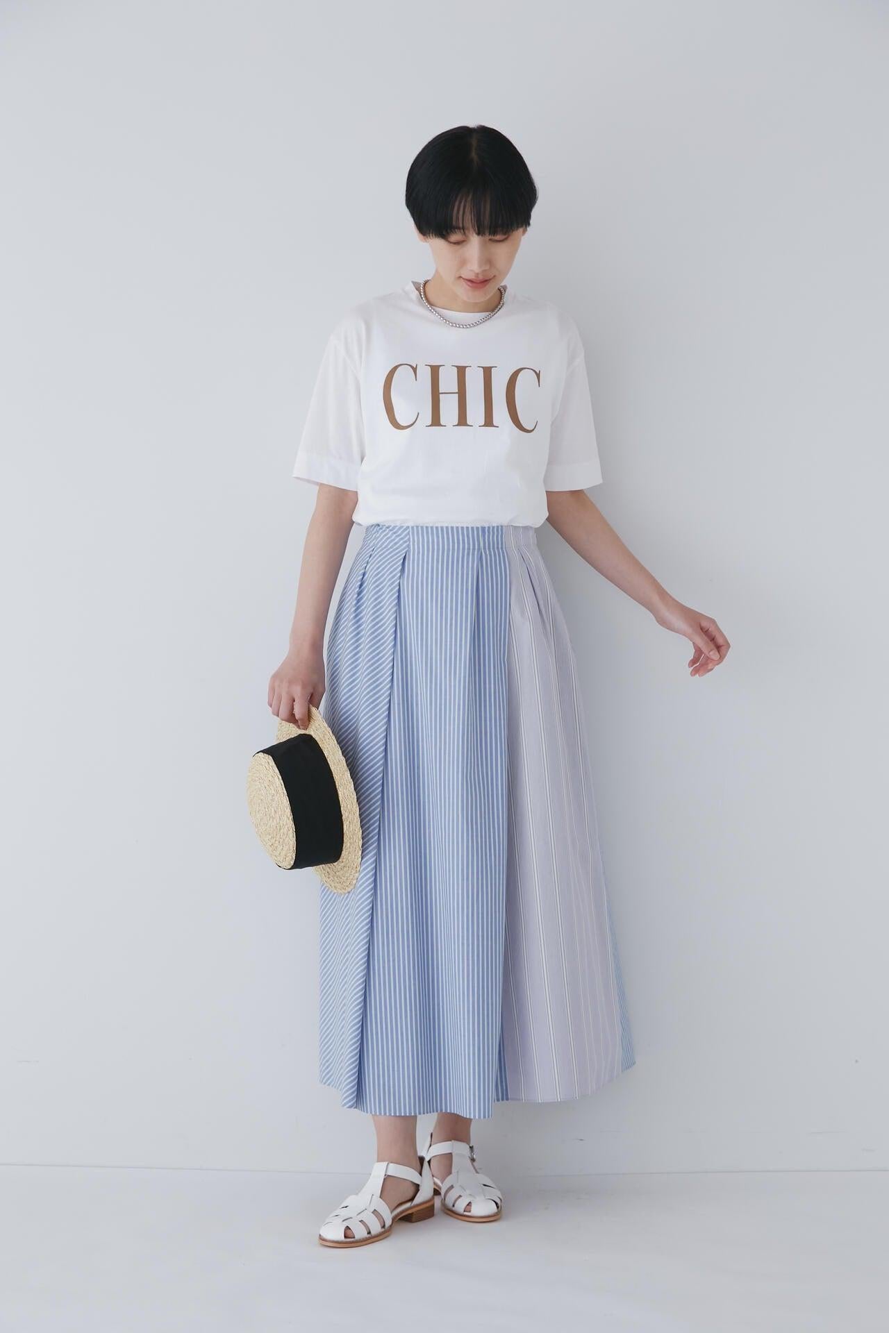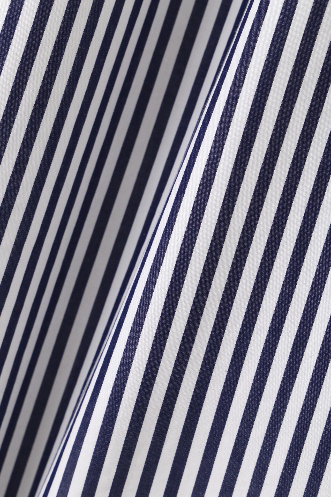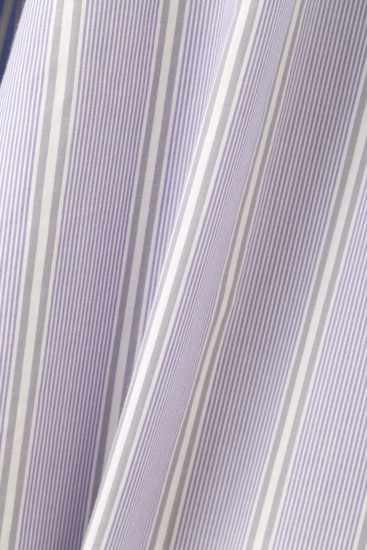條紋裙,醒目大膽的混合圖案 [設計特色] 隨機燕尾服裙,採用混合條紋圖案設計。僅在側縫處使用了不同圖案的面料。深襉和背面右側圖案方向的變化,使設計充滿俏皮感。背部中央的腰部有鬆緊帶,穿著舒適。採用 100% 純棉色織條紋面料製成。兩種顏色組合分別是綠色和海軍藍的對比組合,以及成人圖案變化組合的藍色單調組合。裙子單穿也很好看,可以簡單搭配一件 T 恤,也可以搭配一件彩色上衣。