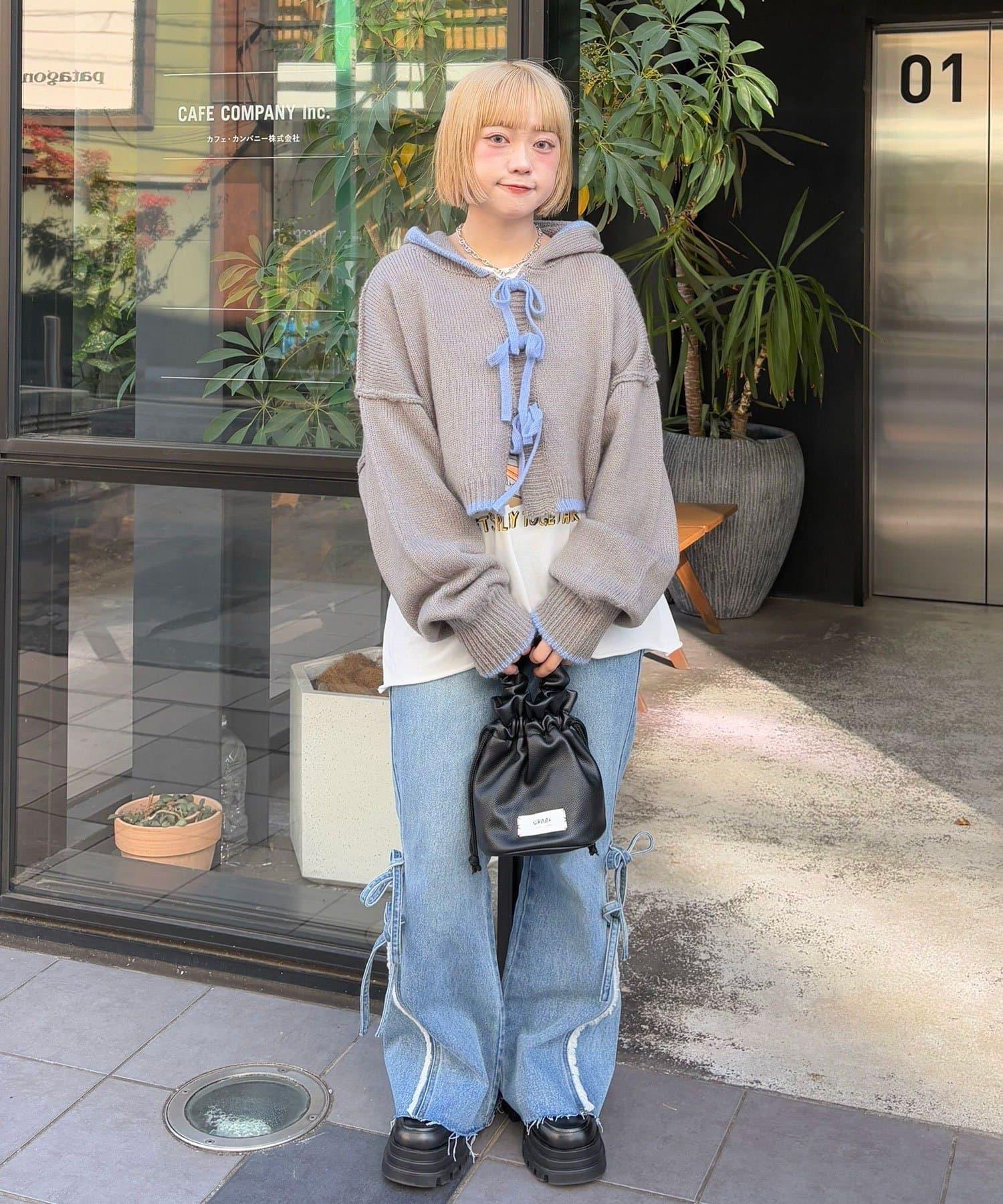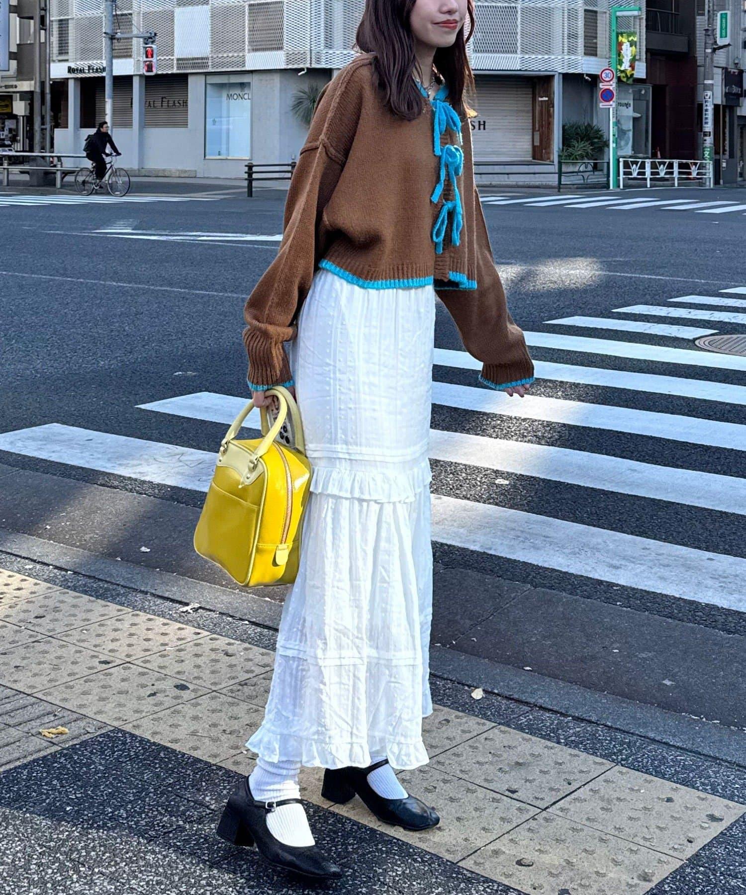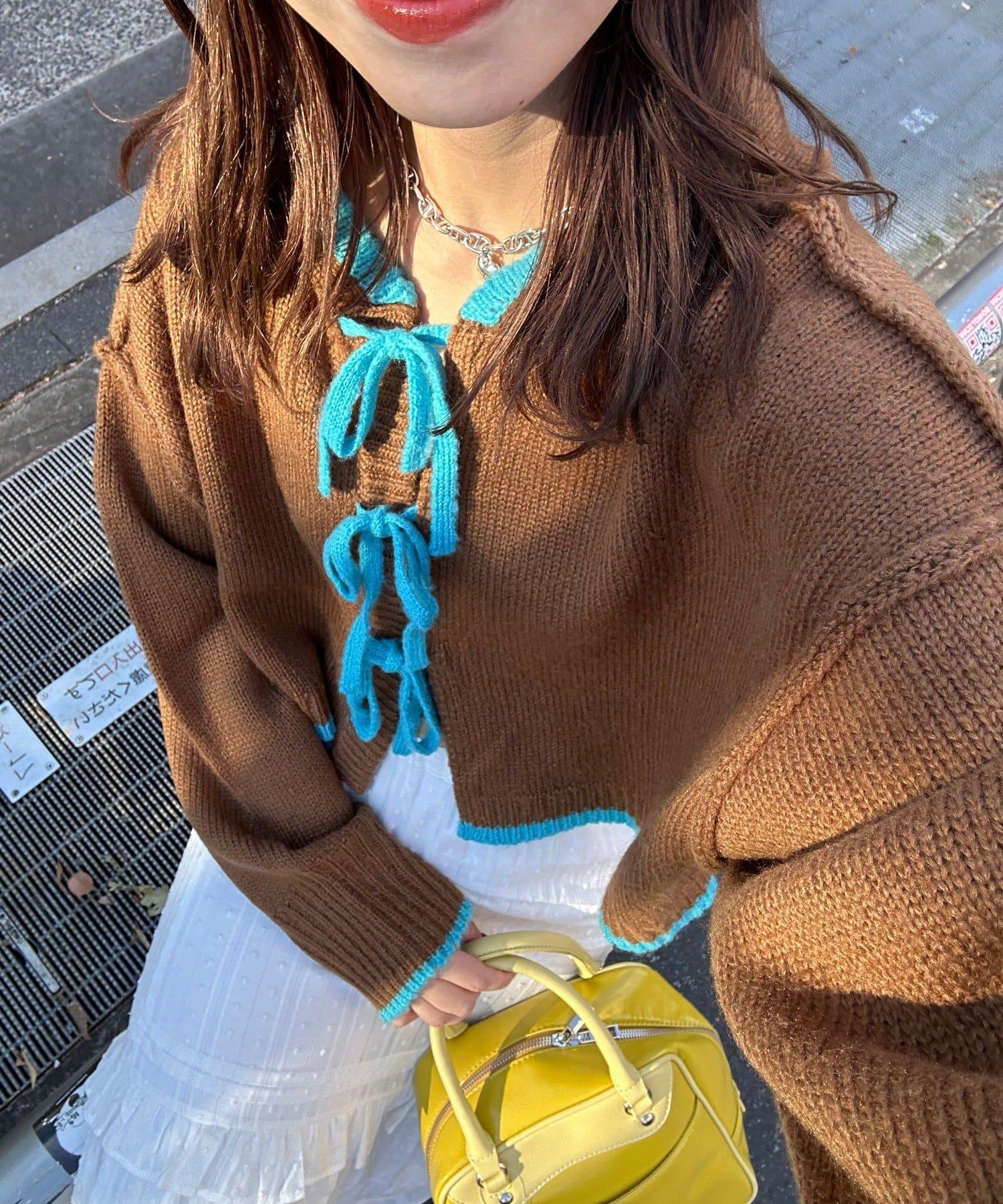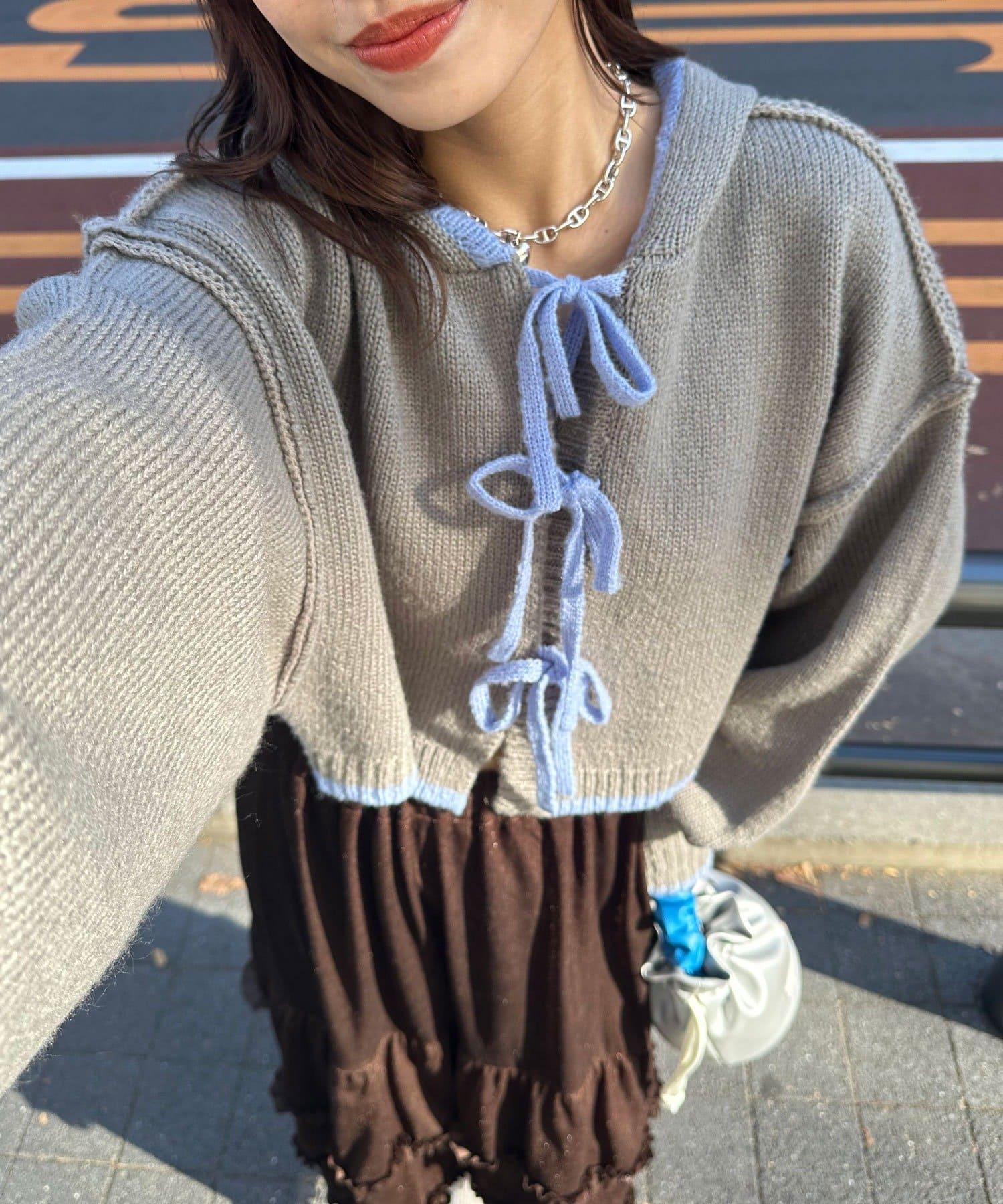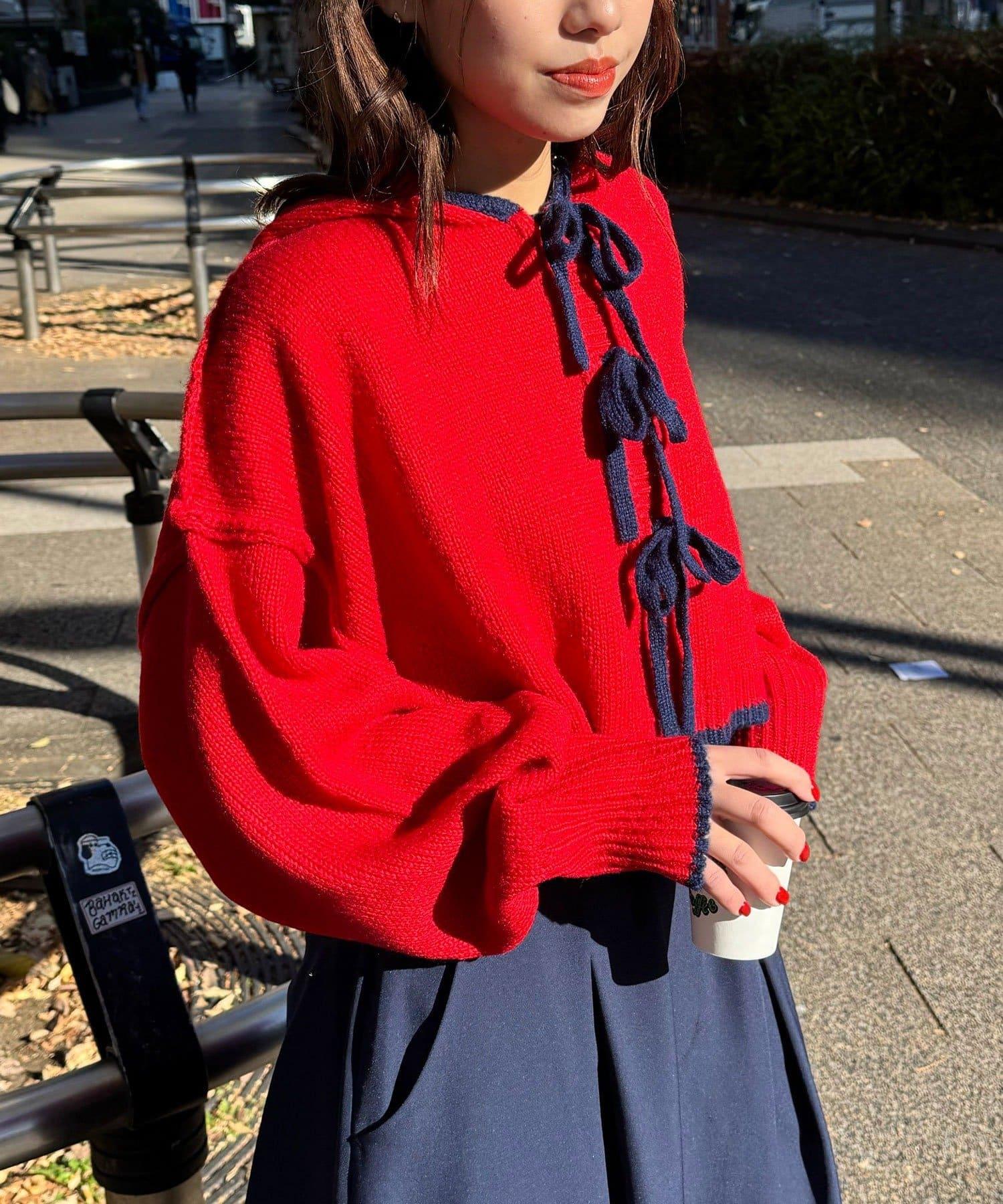 前襟的絲帶和寬大的袖子增添了甜美的印象!