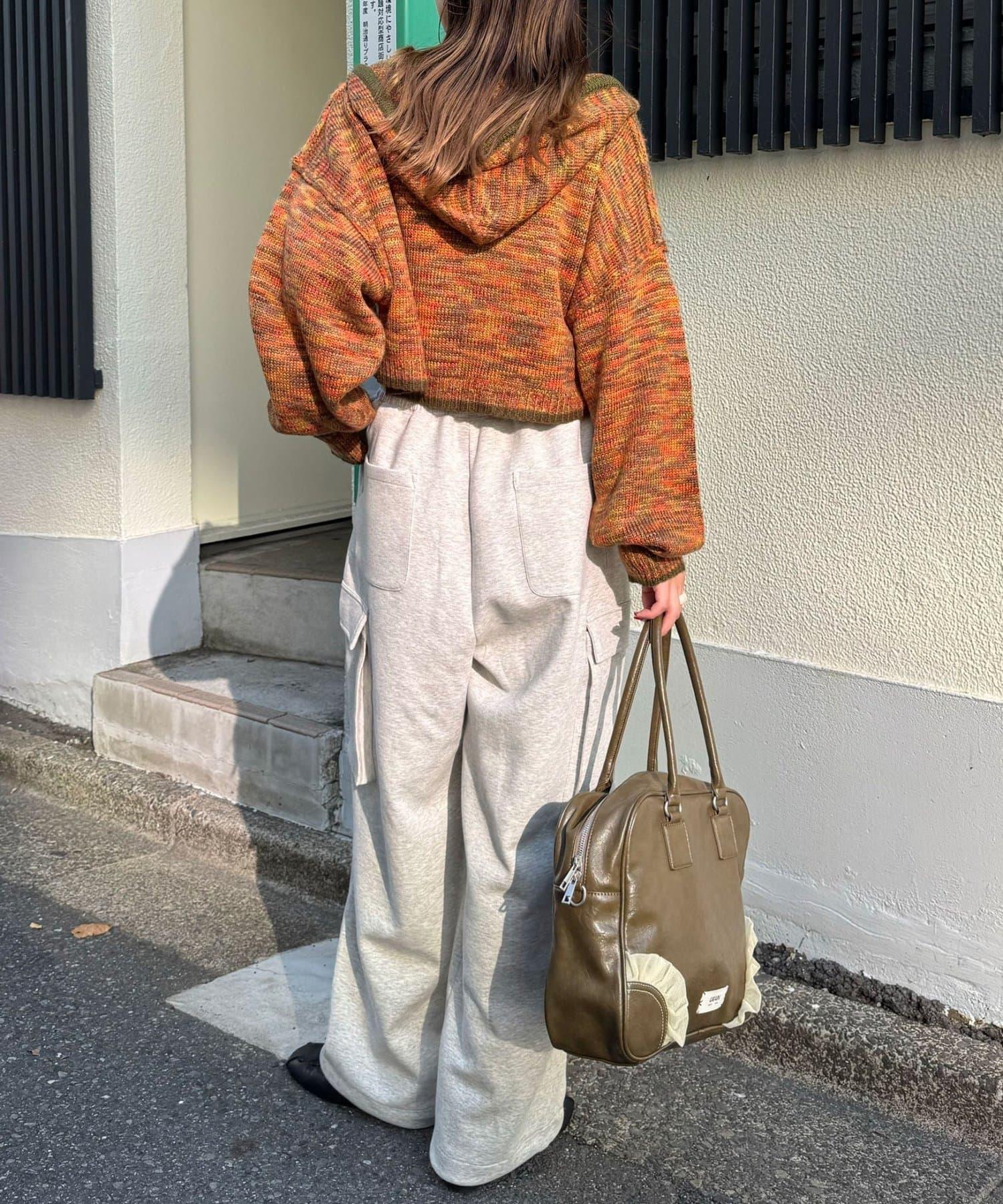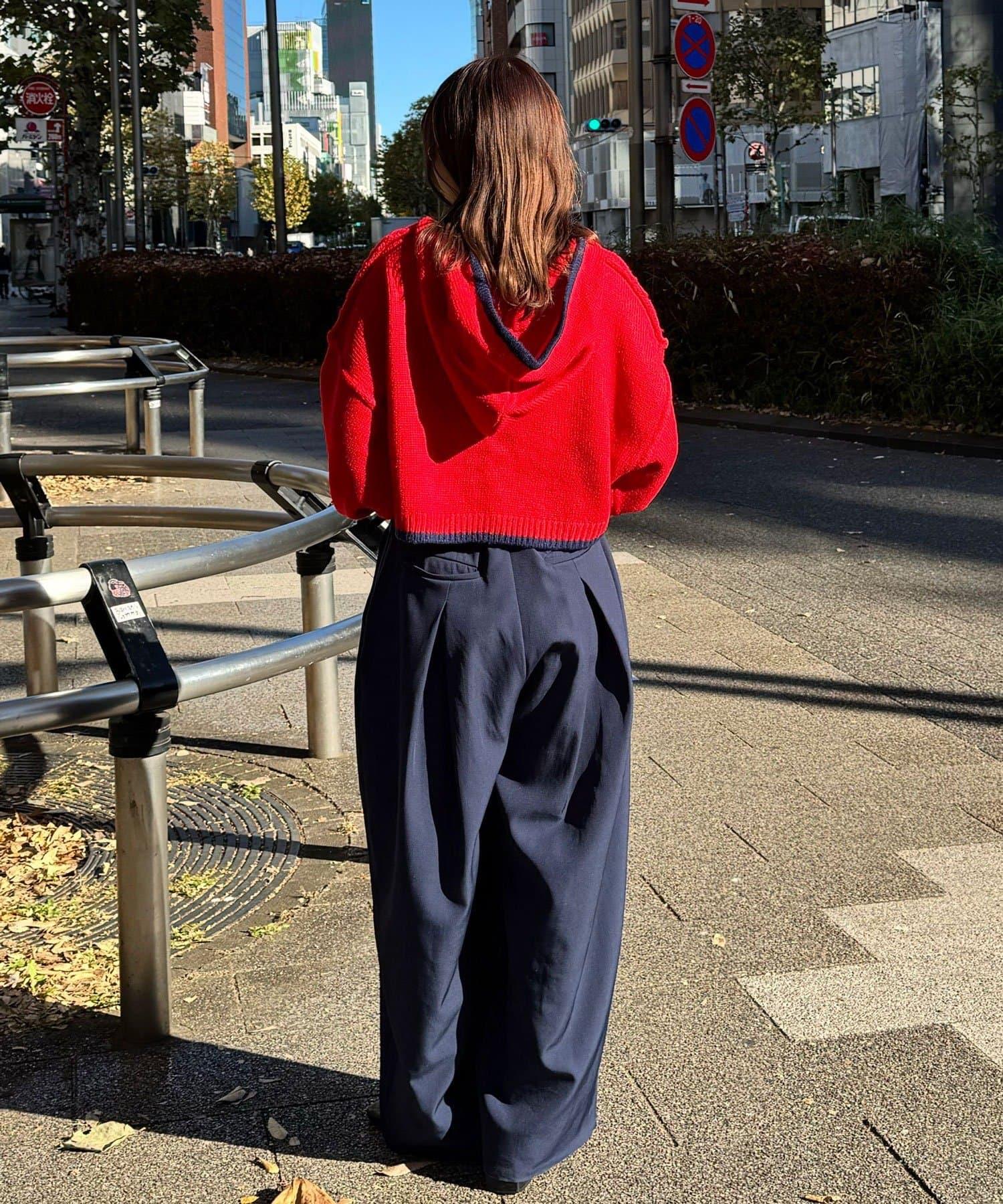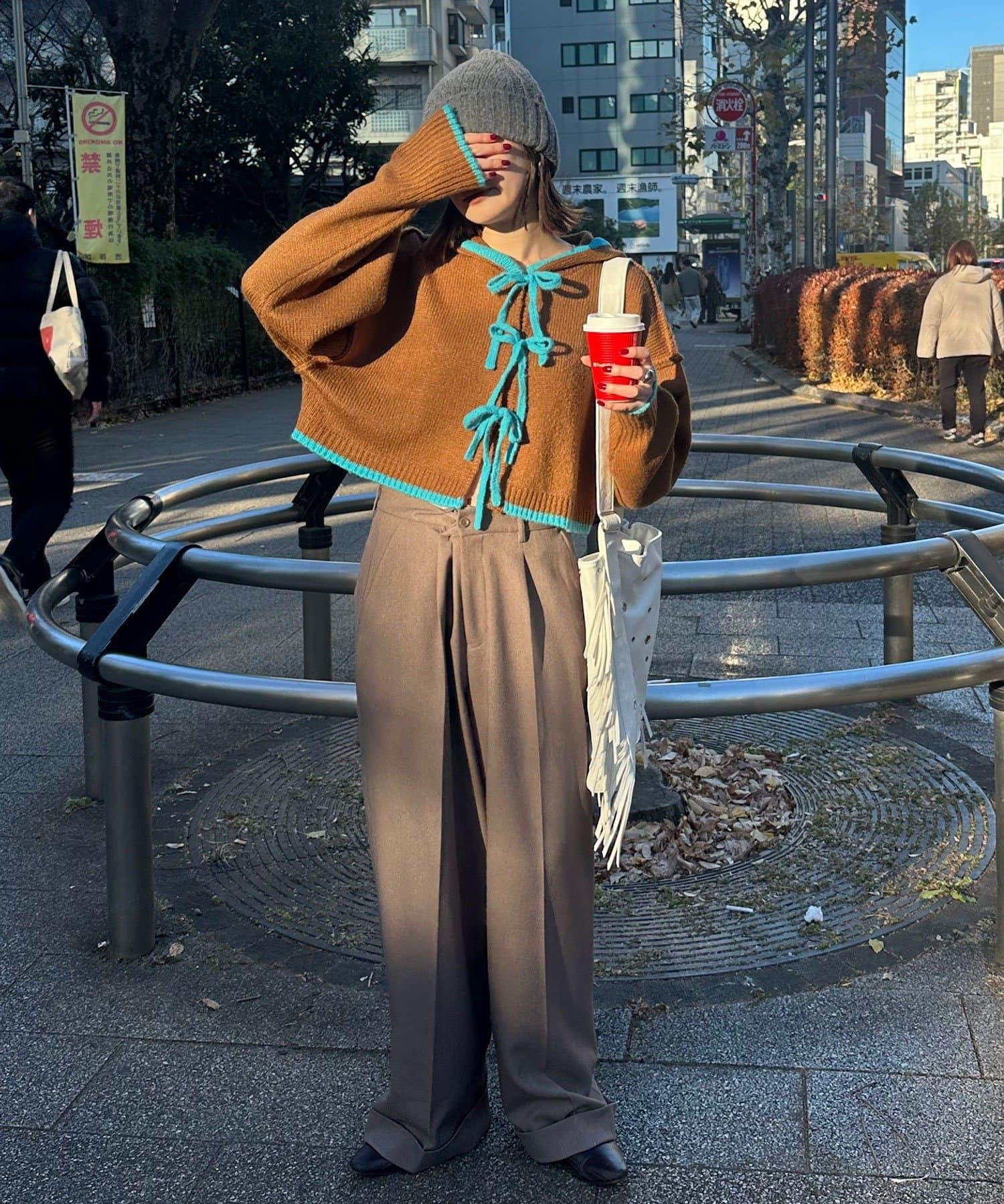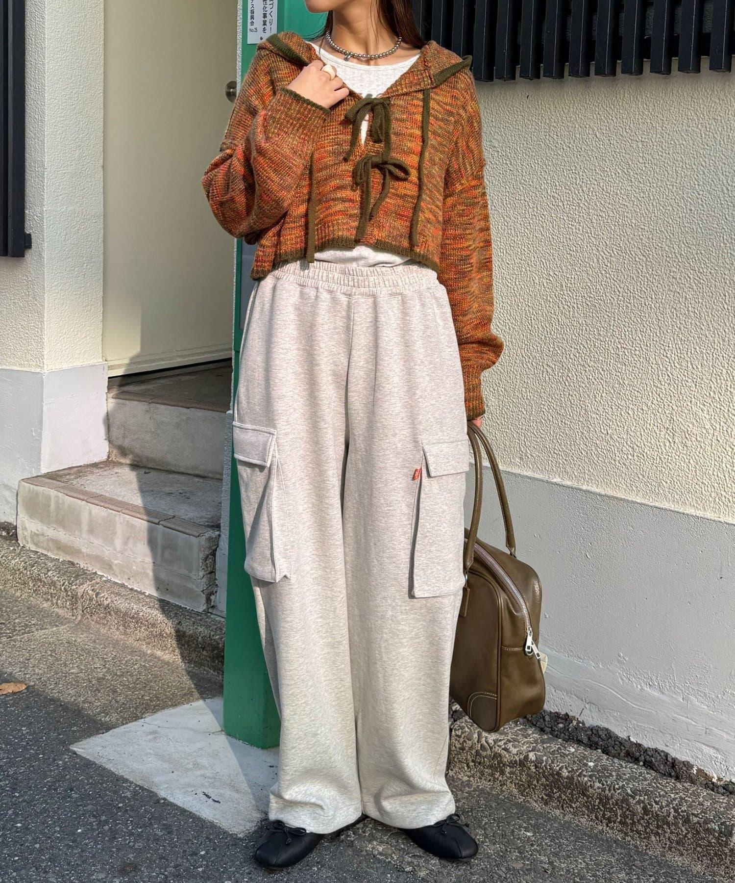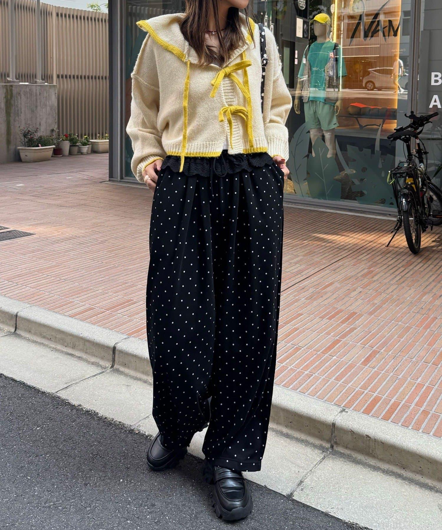 貨郎褲的寬鬆感和針織衫的緊湊感營造出時尚的輪廓。