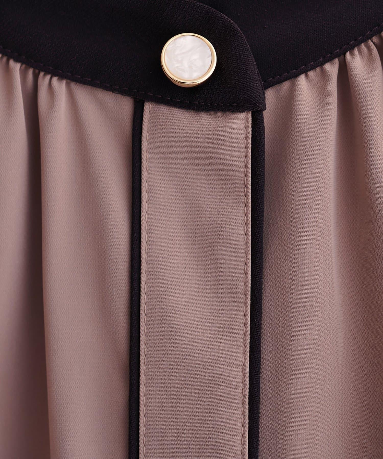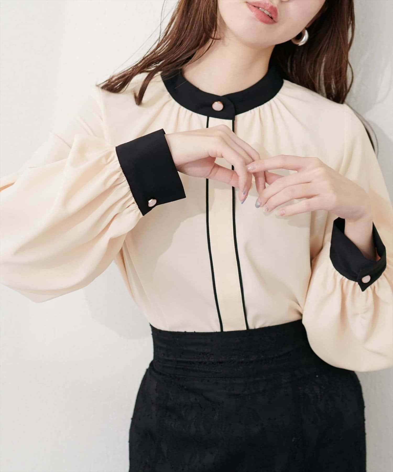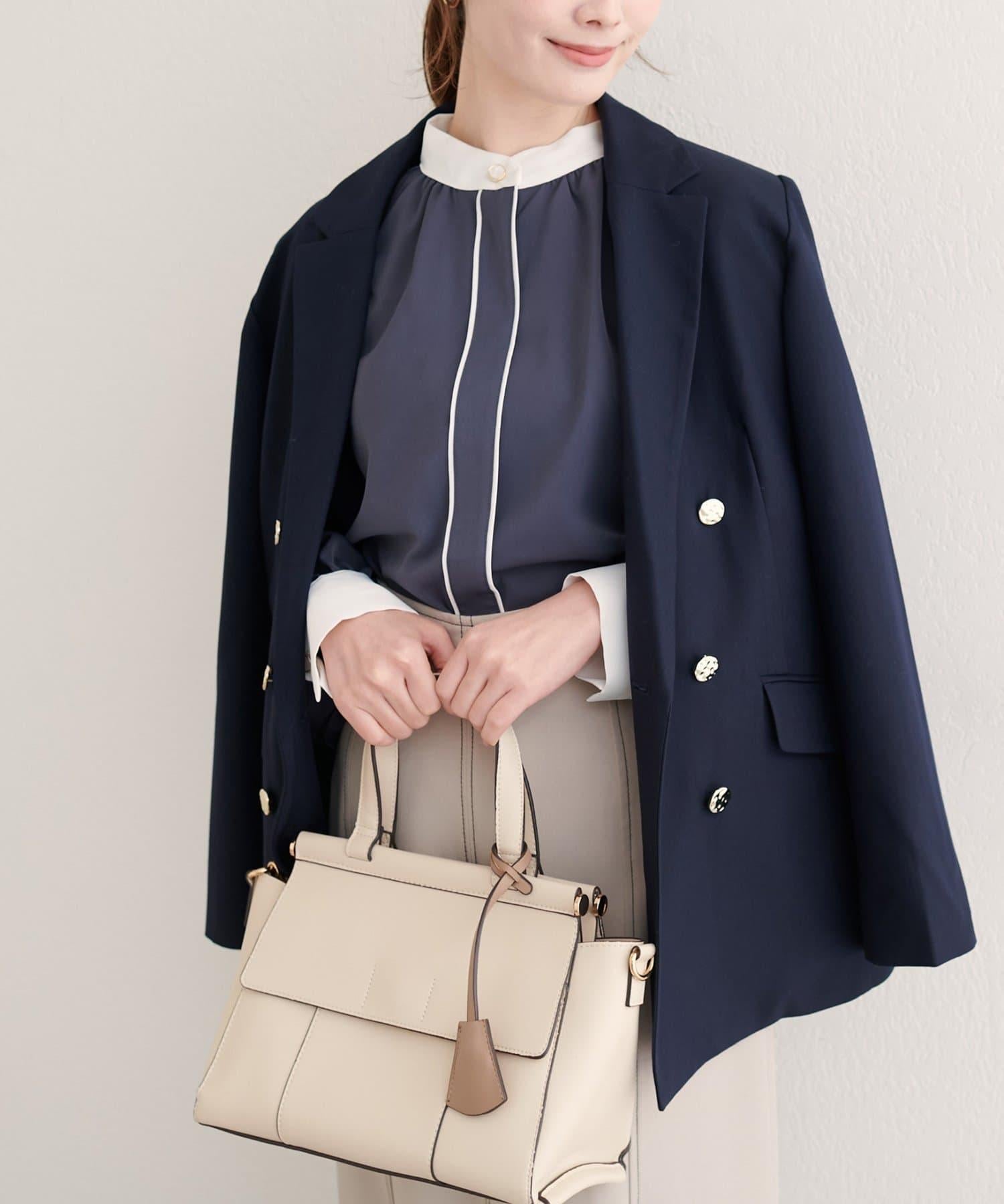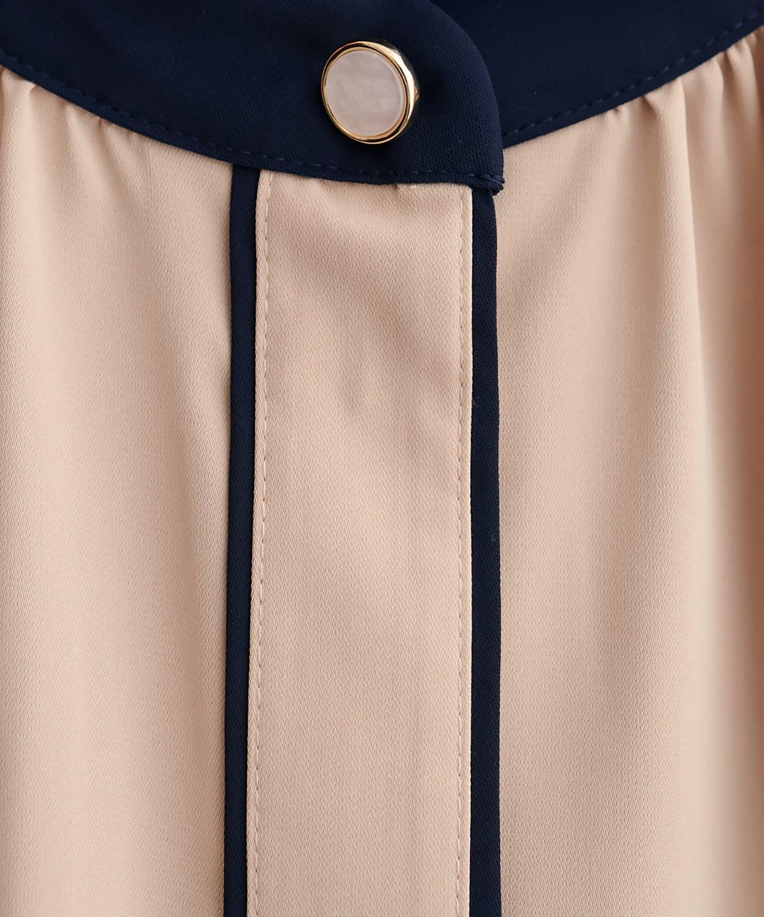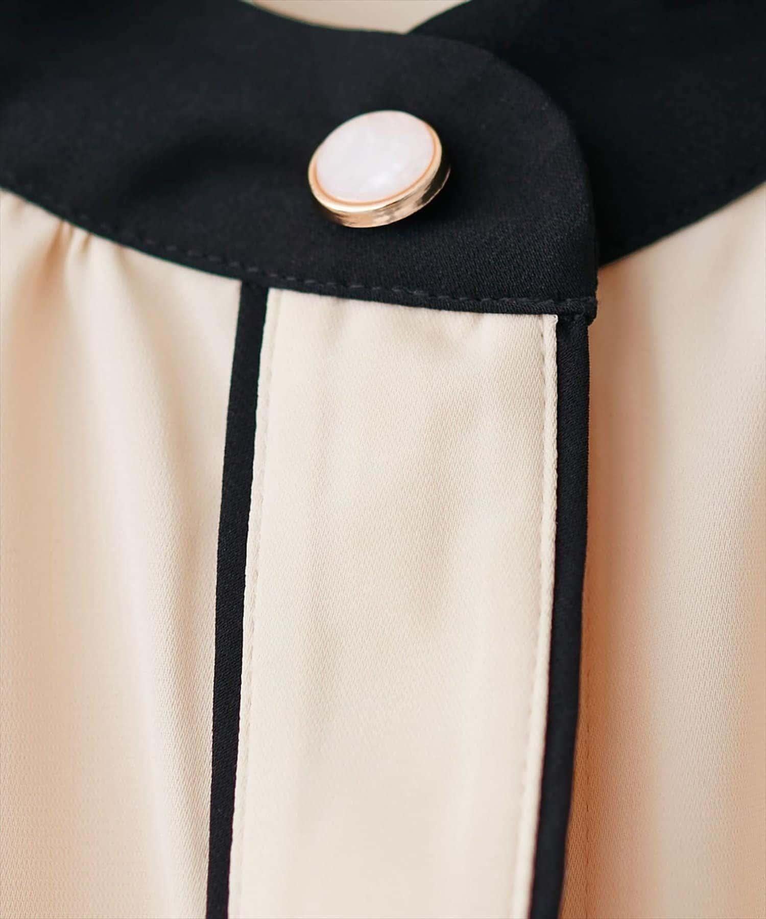 這款上衣的領口和袖口採用貝殼材料和金色相結合的紐扣,給人一種優雅的印象、
