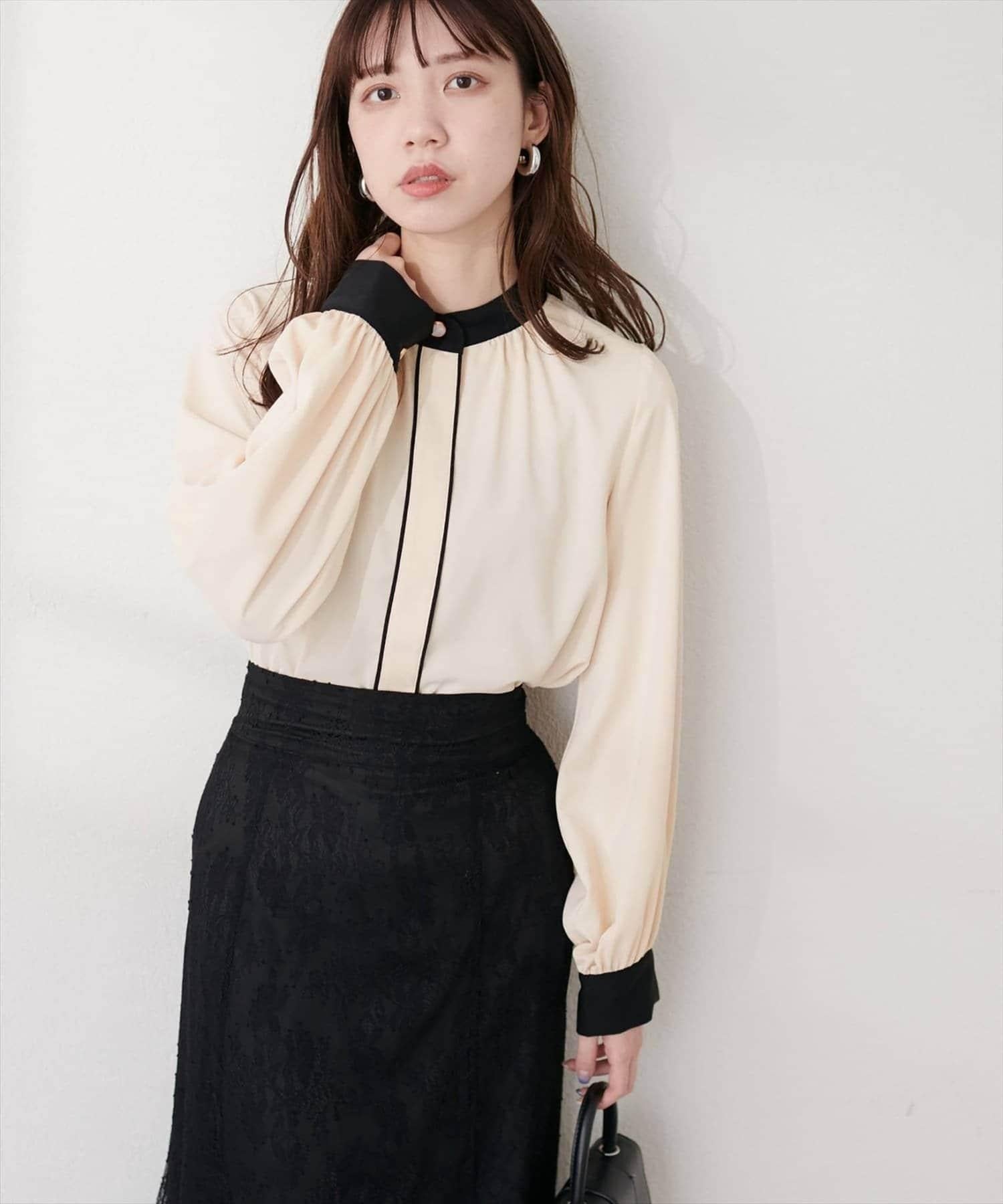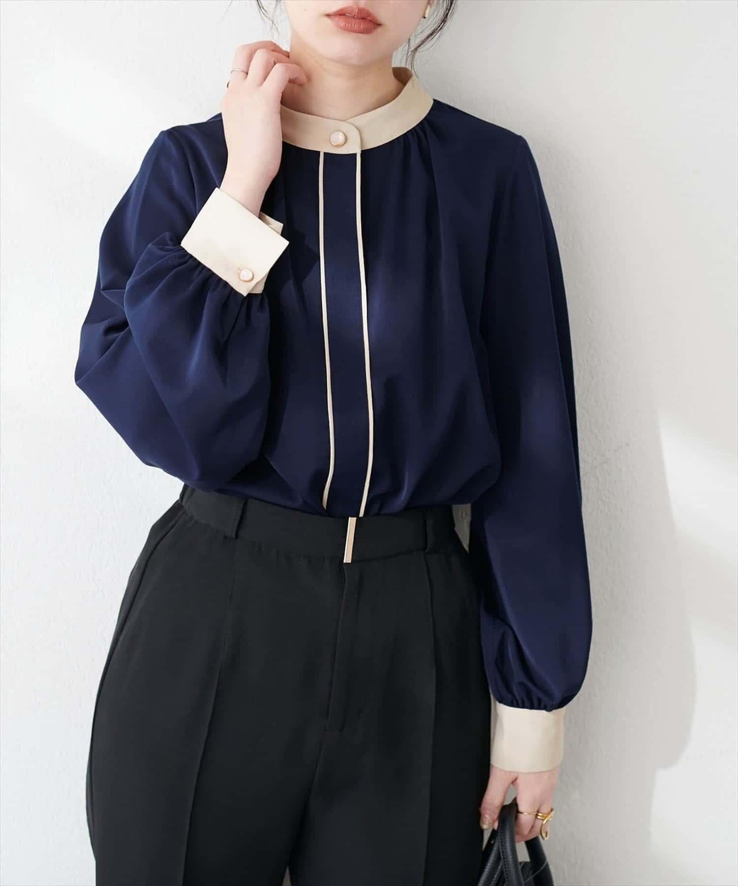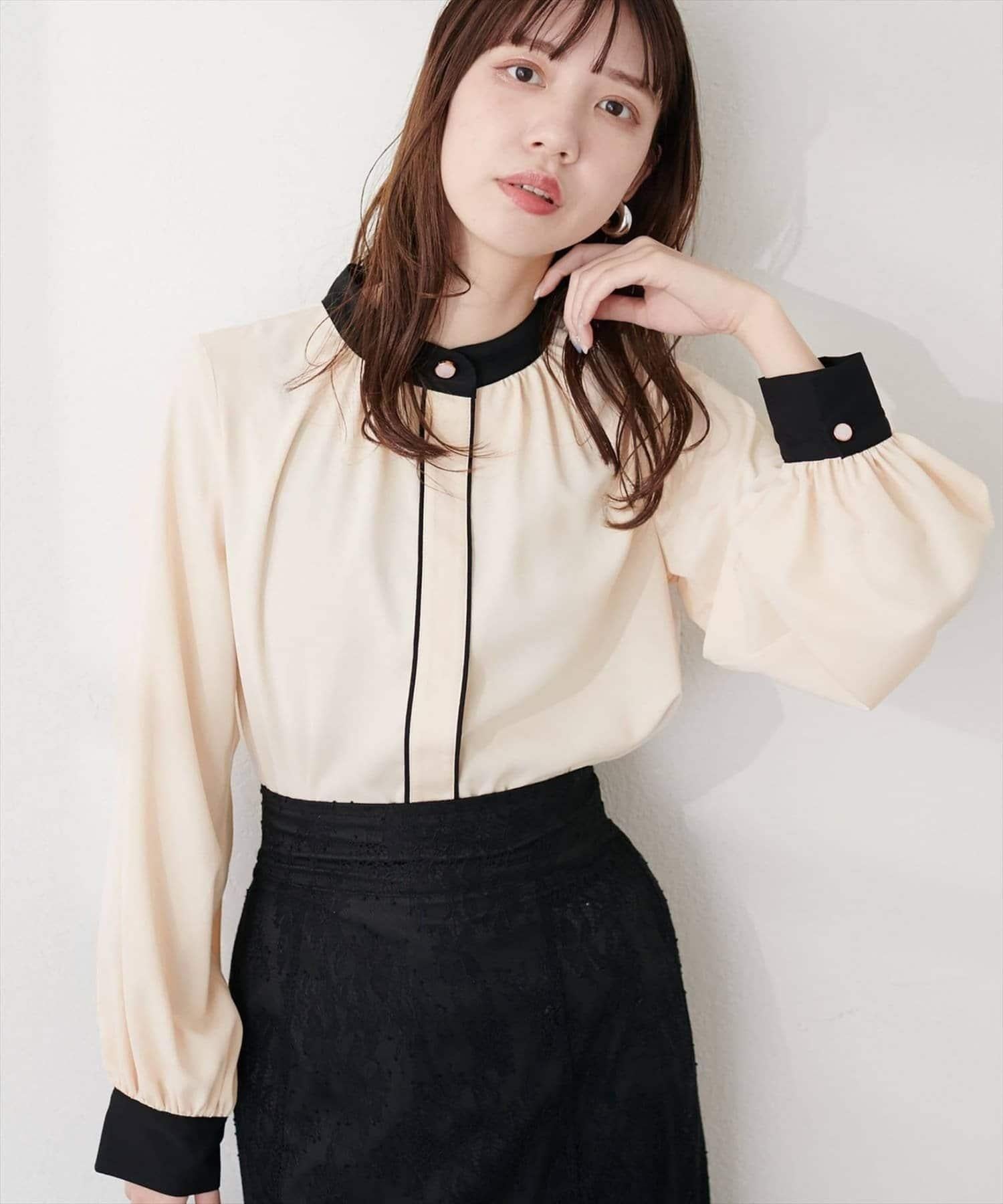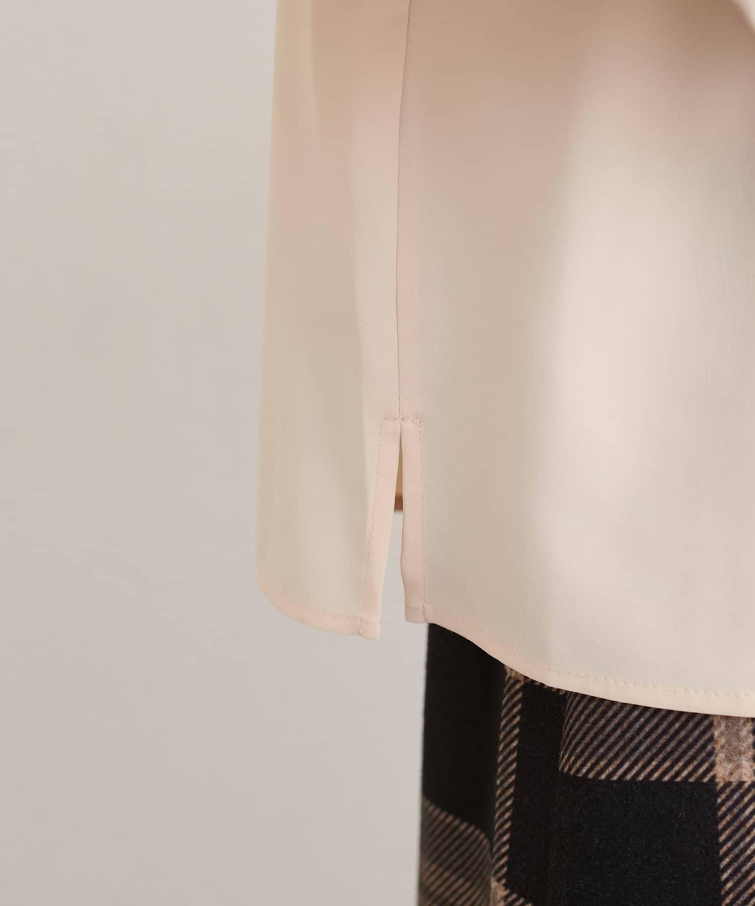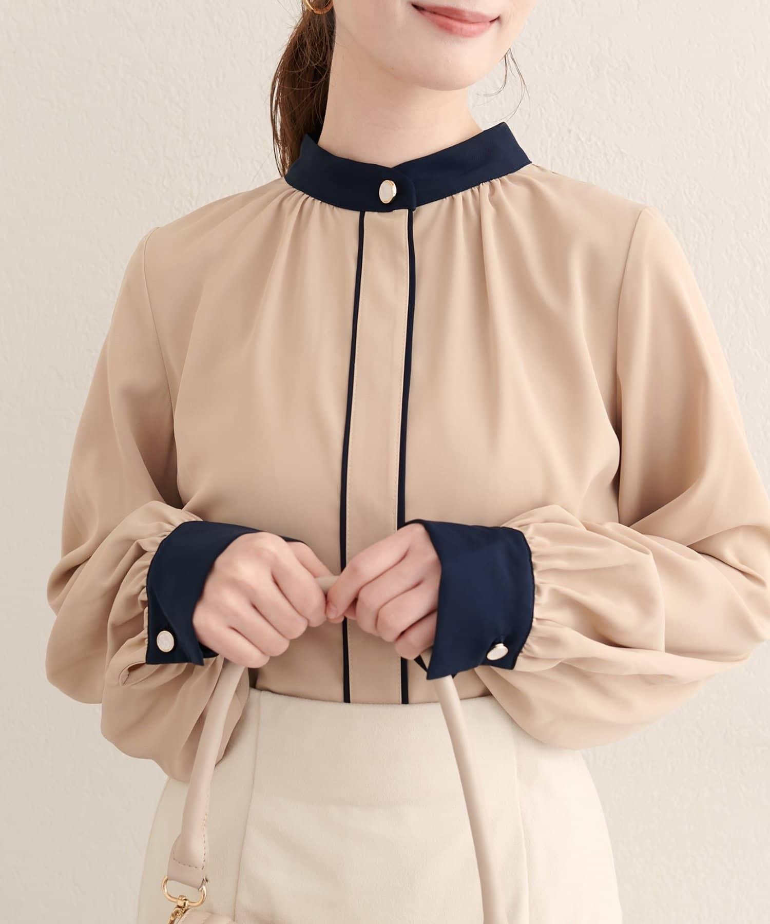 這款上衣的領口和袖口採用貝殼材料和金色相結合的紐扣,給人一種優雅的印象、