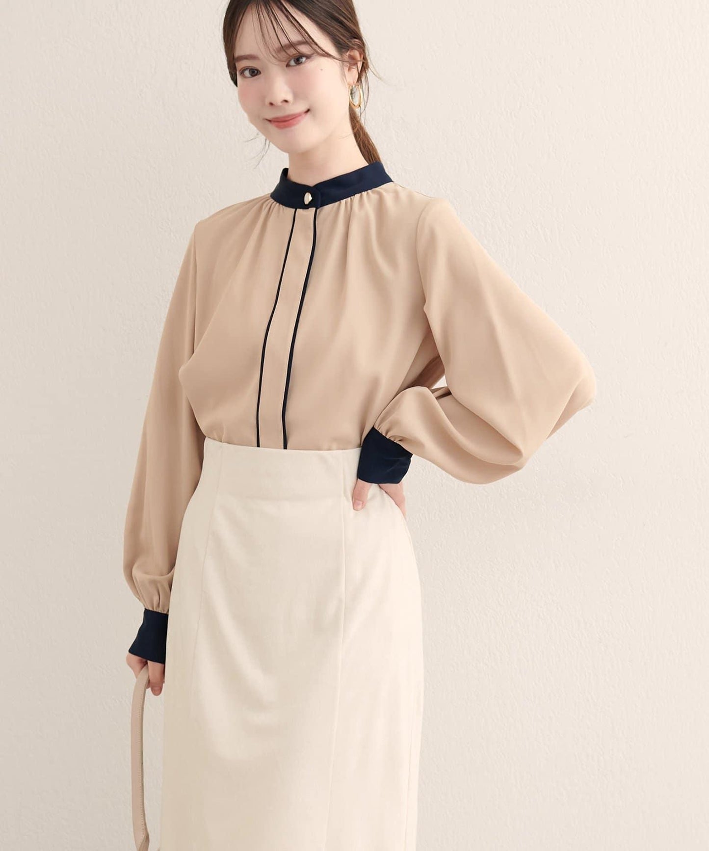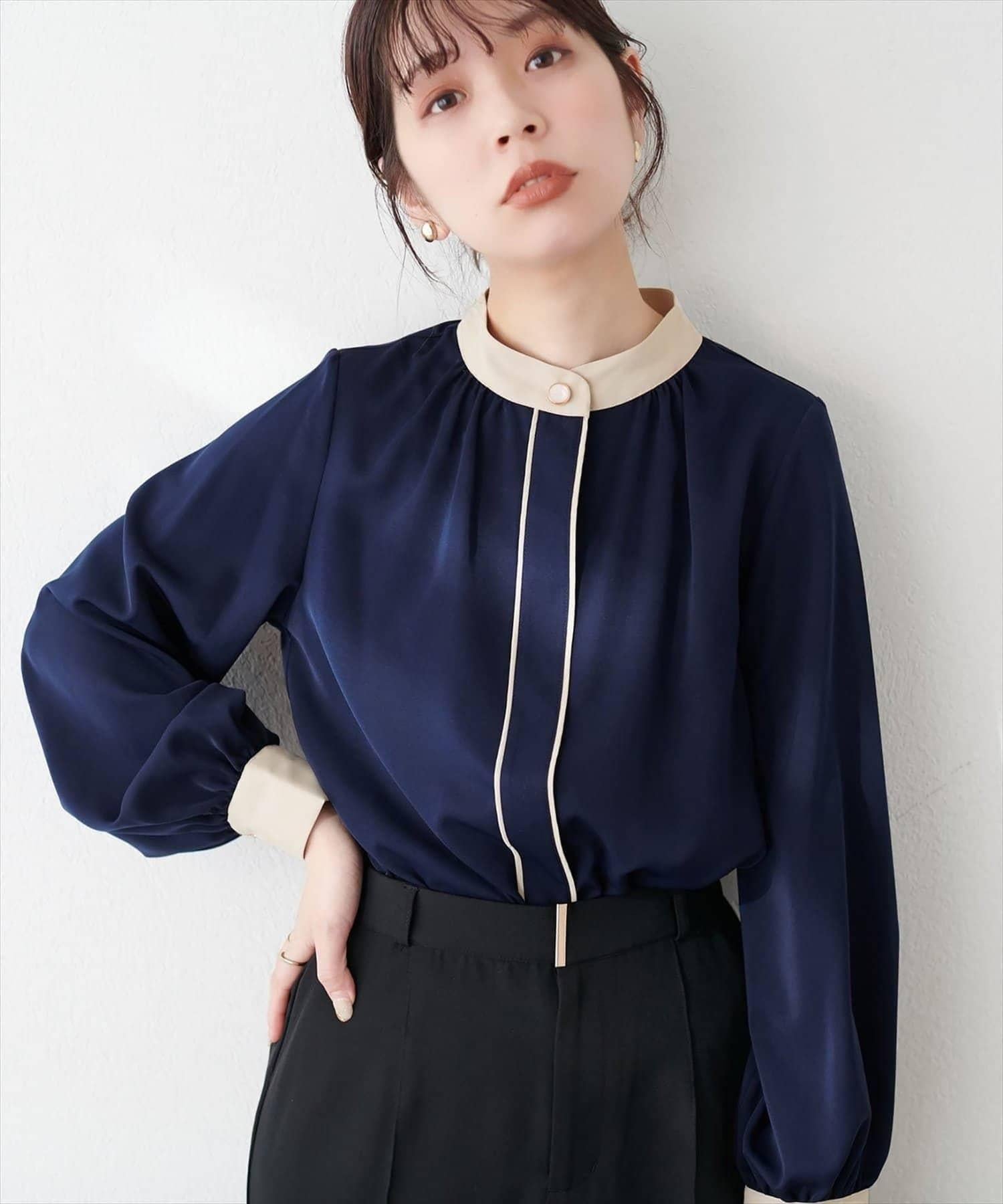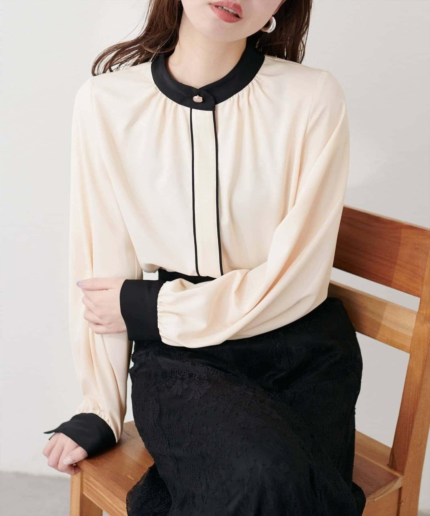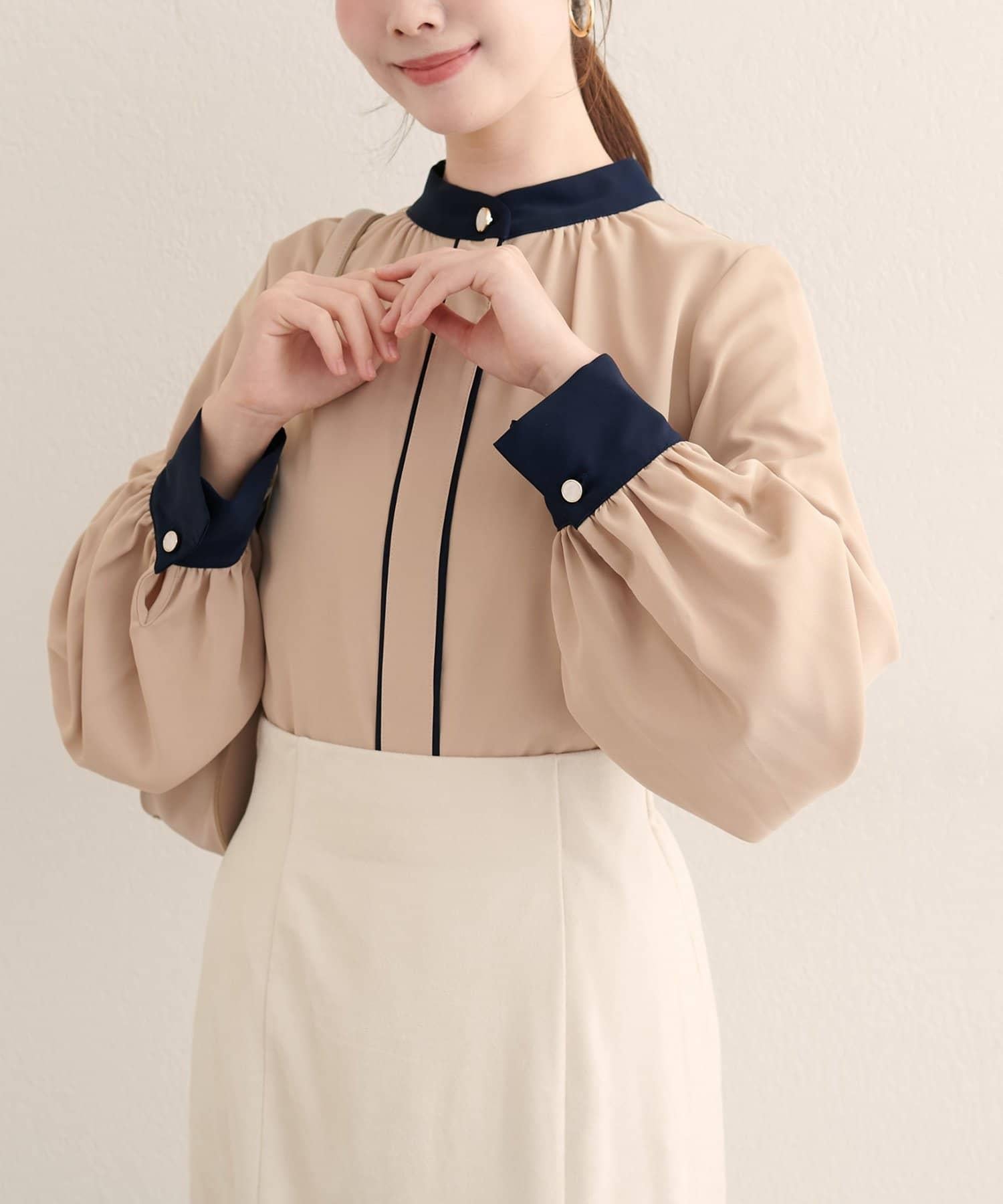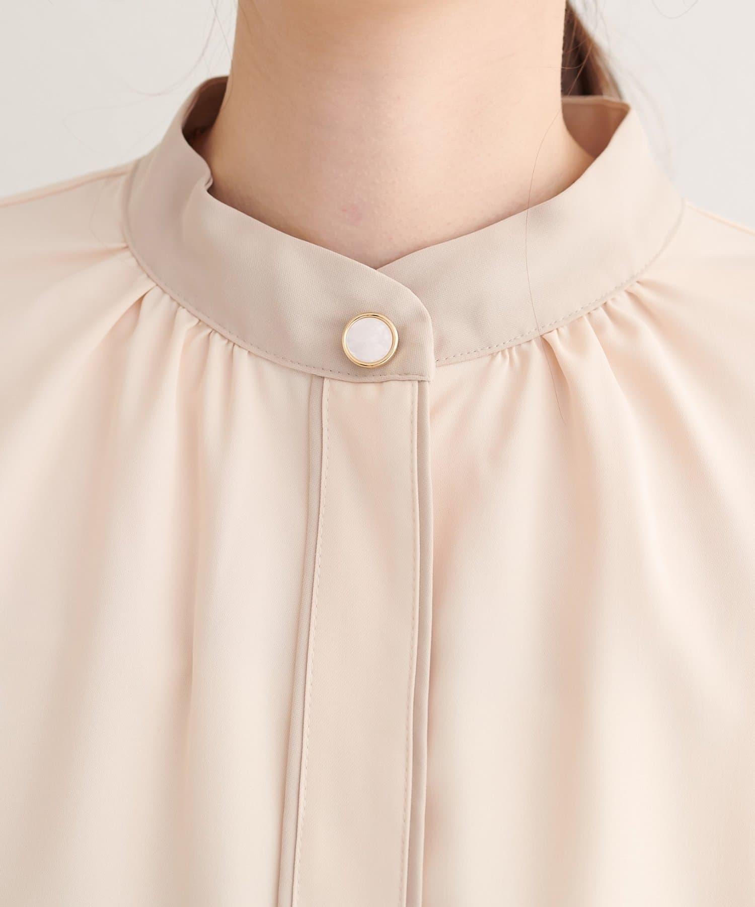 這款上衣的領口和袖口採用貝殼材料和金色相結合的紐扣,給人一種優雅的印象、