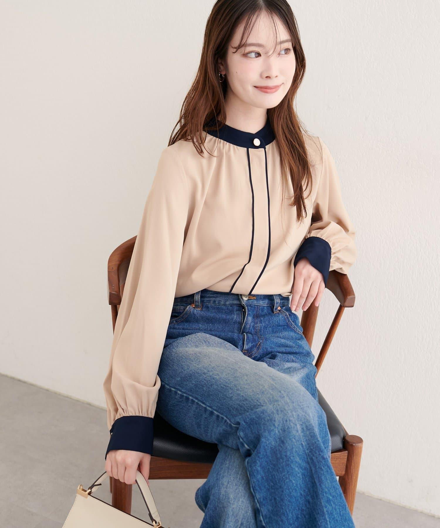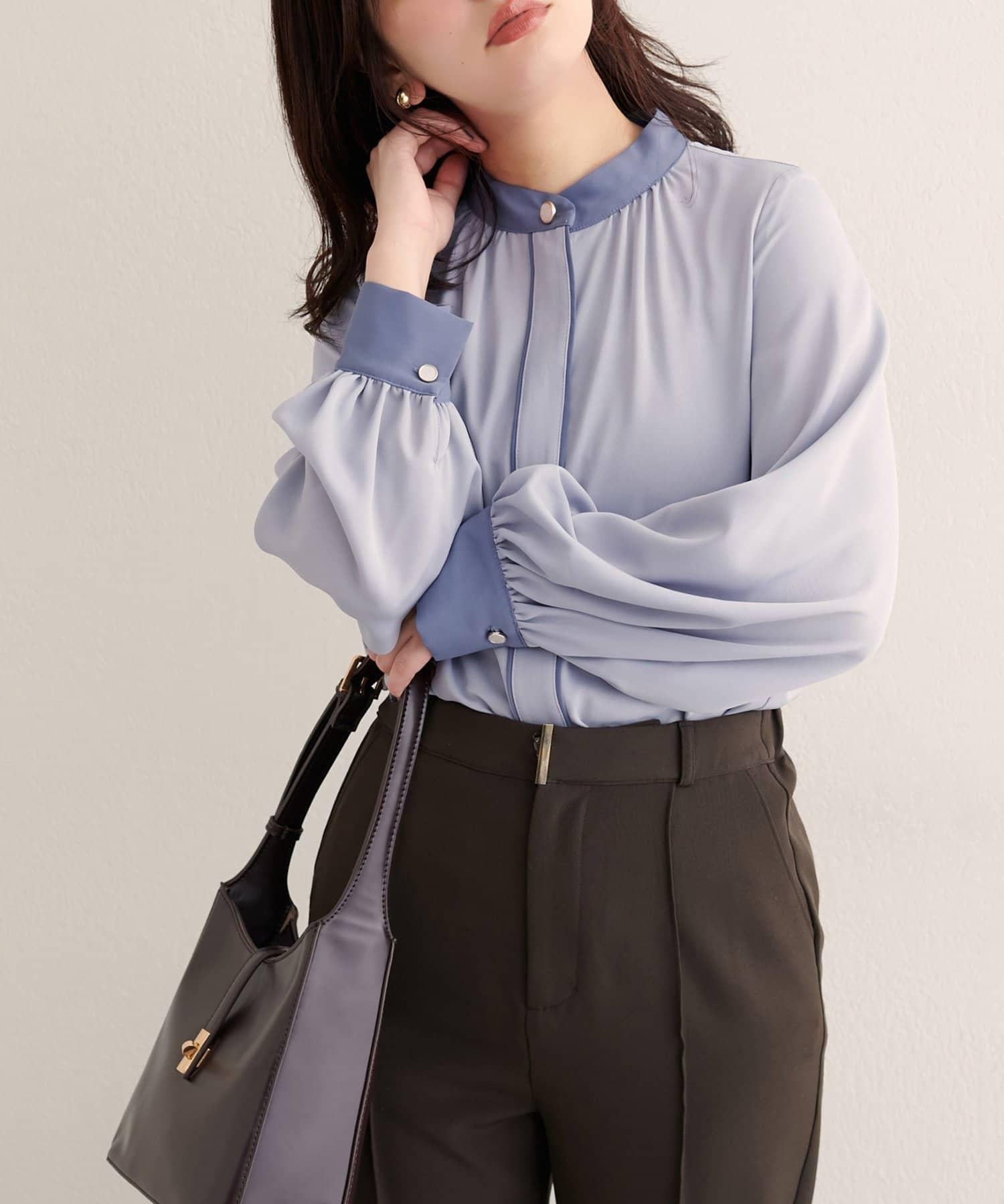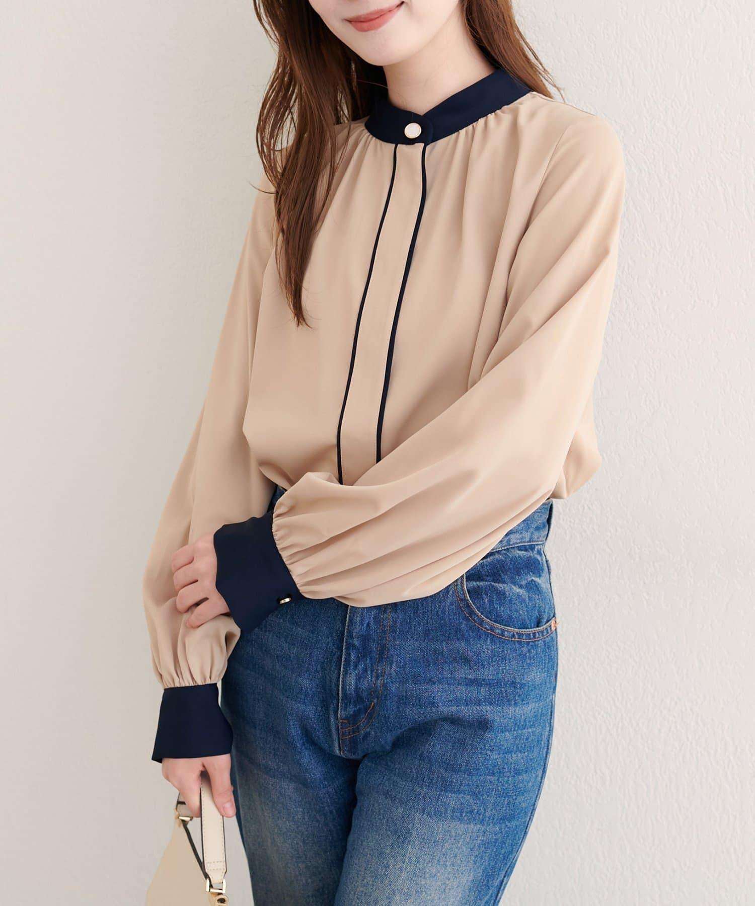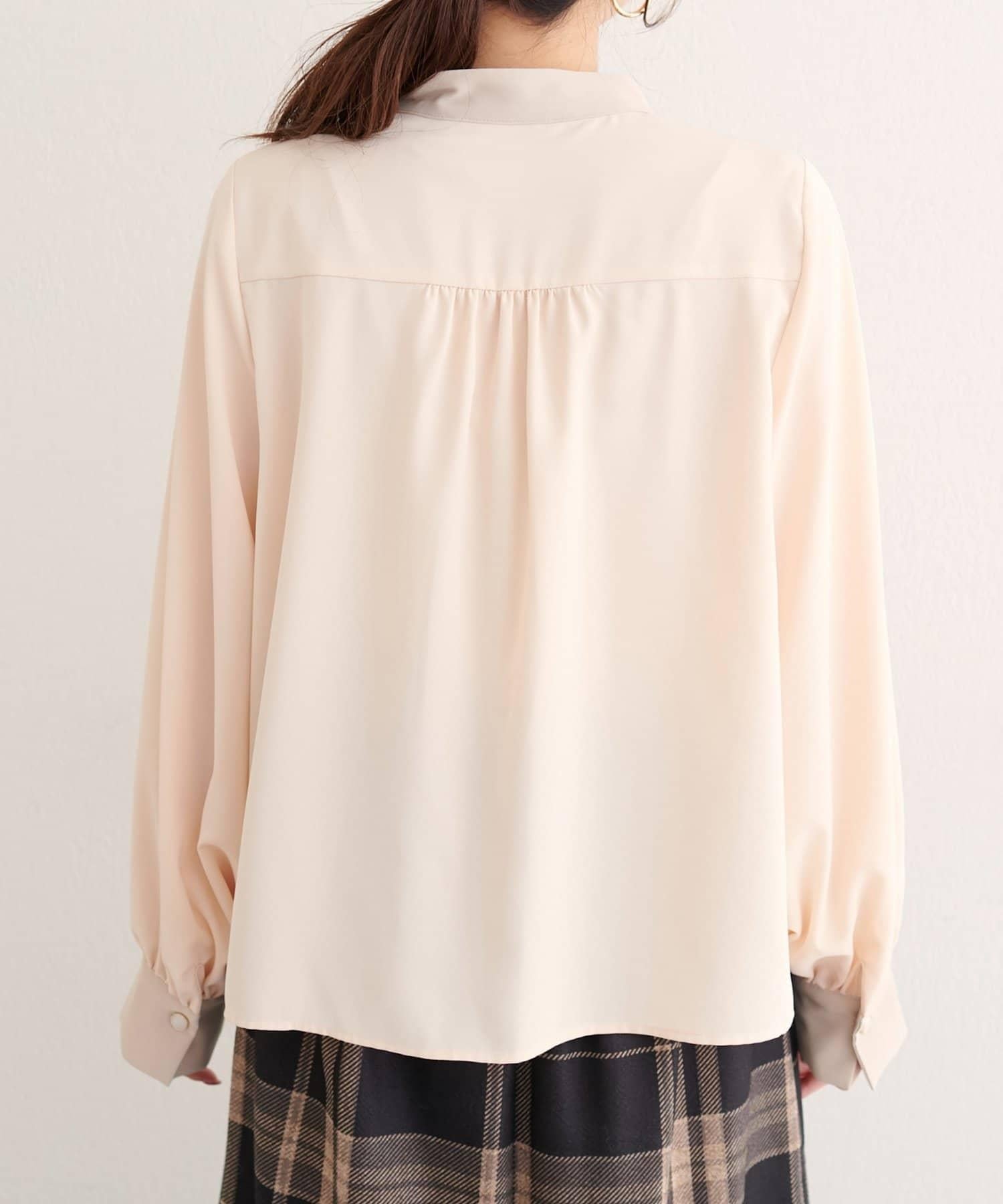 這款上衣的領口和袖口採用貝殼材料和金色相結合的紐扣,給人一種優雅的印象、