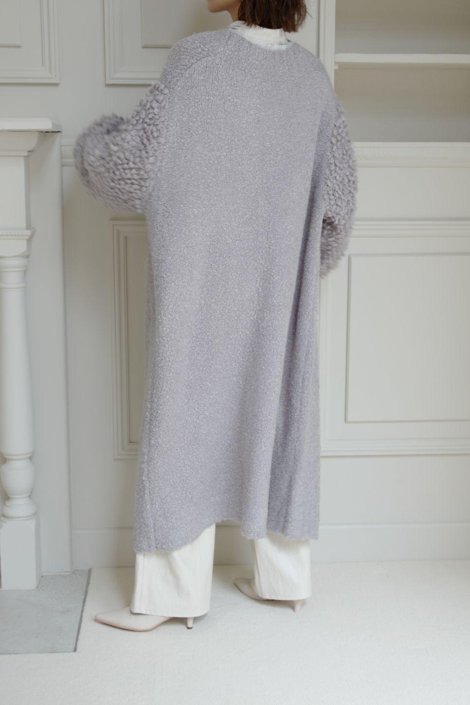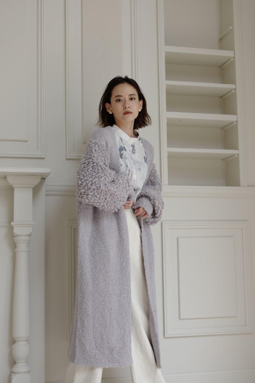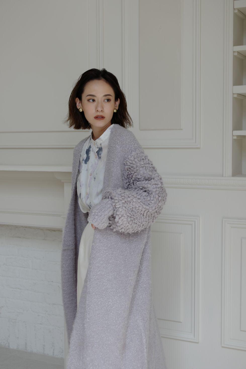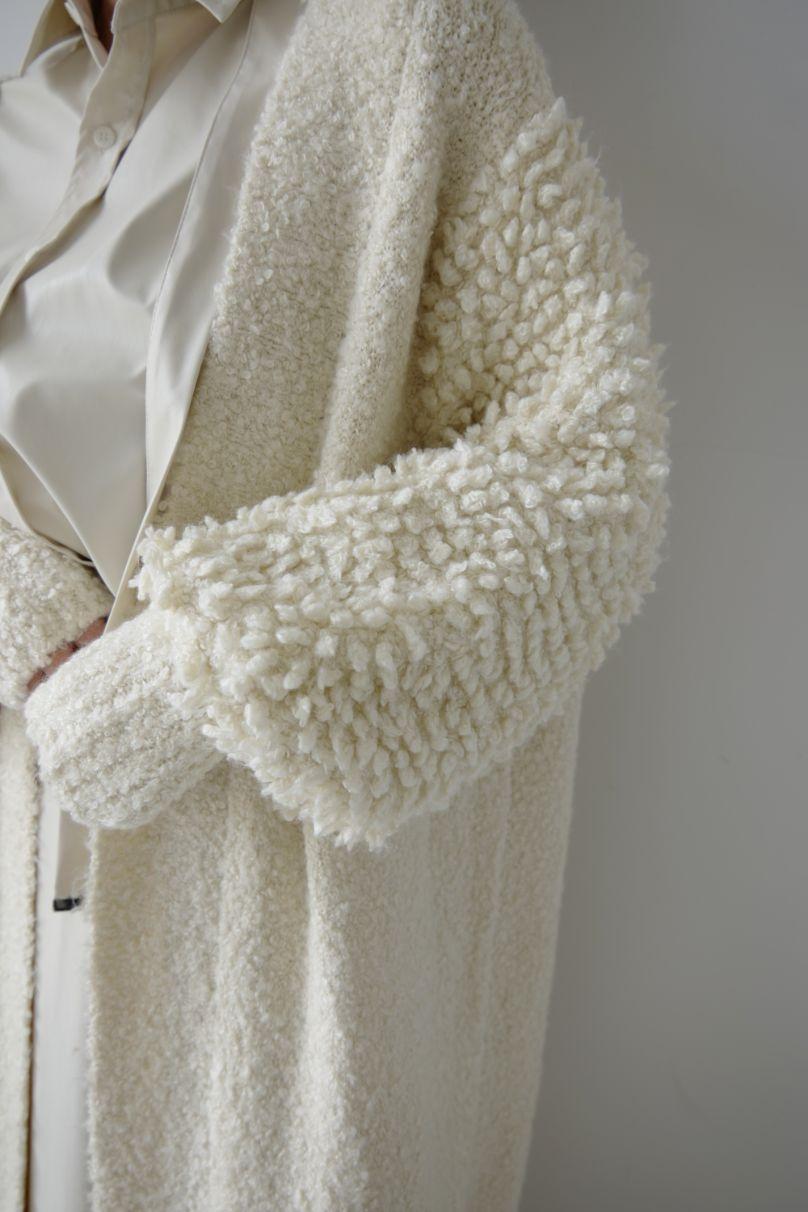 這是一款針織開衫,表面採用捲曲紗線編織而成,袖子則進一步編織成環狀,看起來利落而富有衝擊力。 下垂的肩部設計給人一種輕鬆的感覺。 除了簡單的搭配外,它還可以與多種疊穿方式搭配。 建議在腰部繫上腰帶。