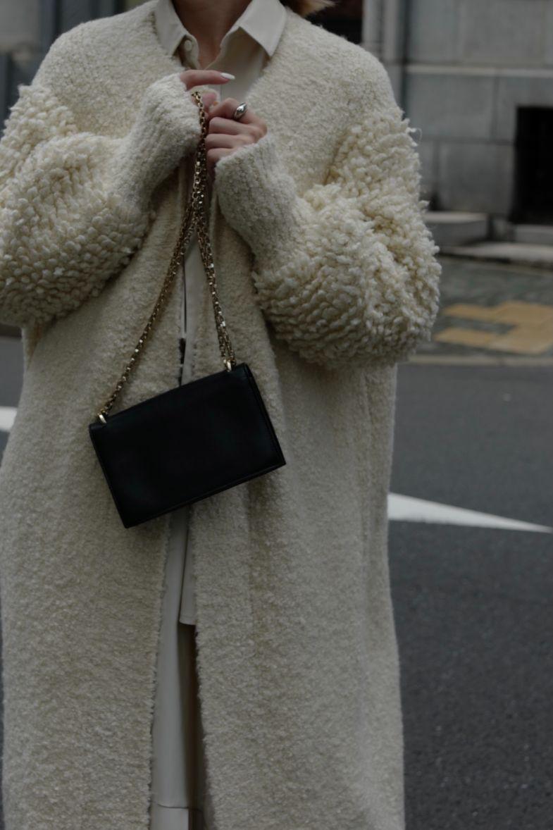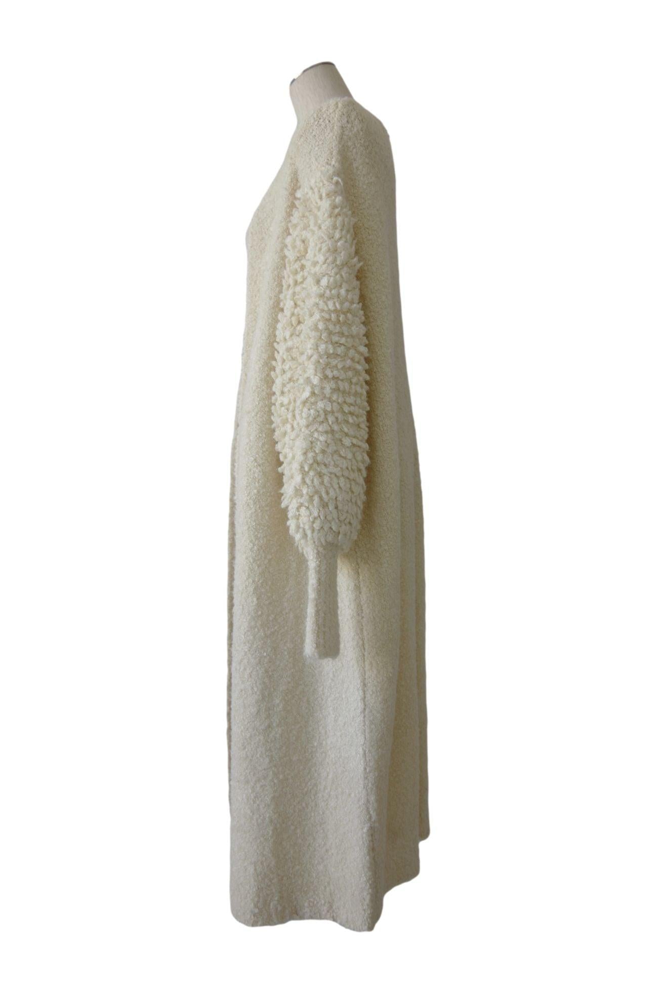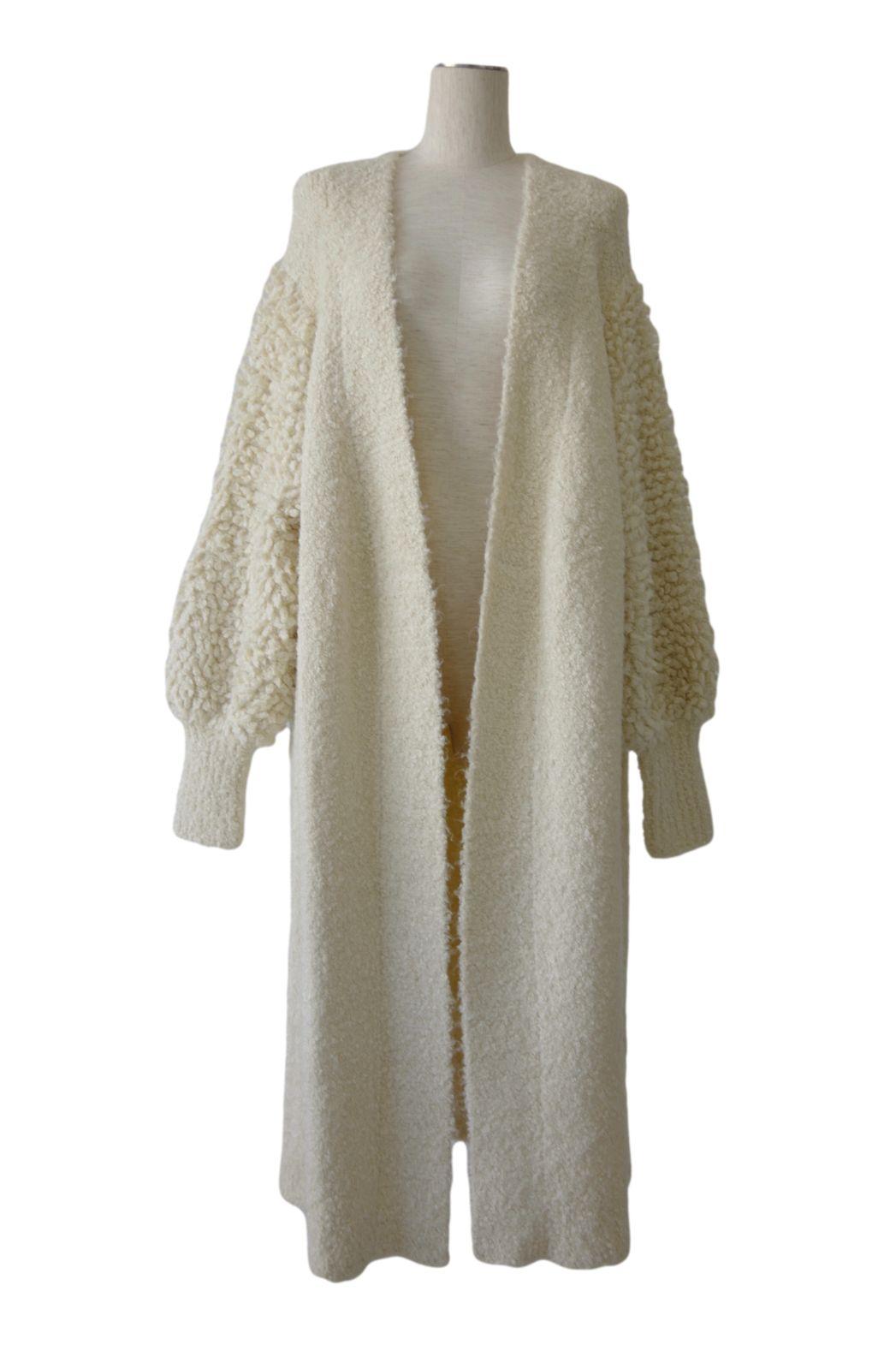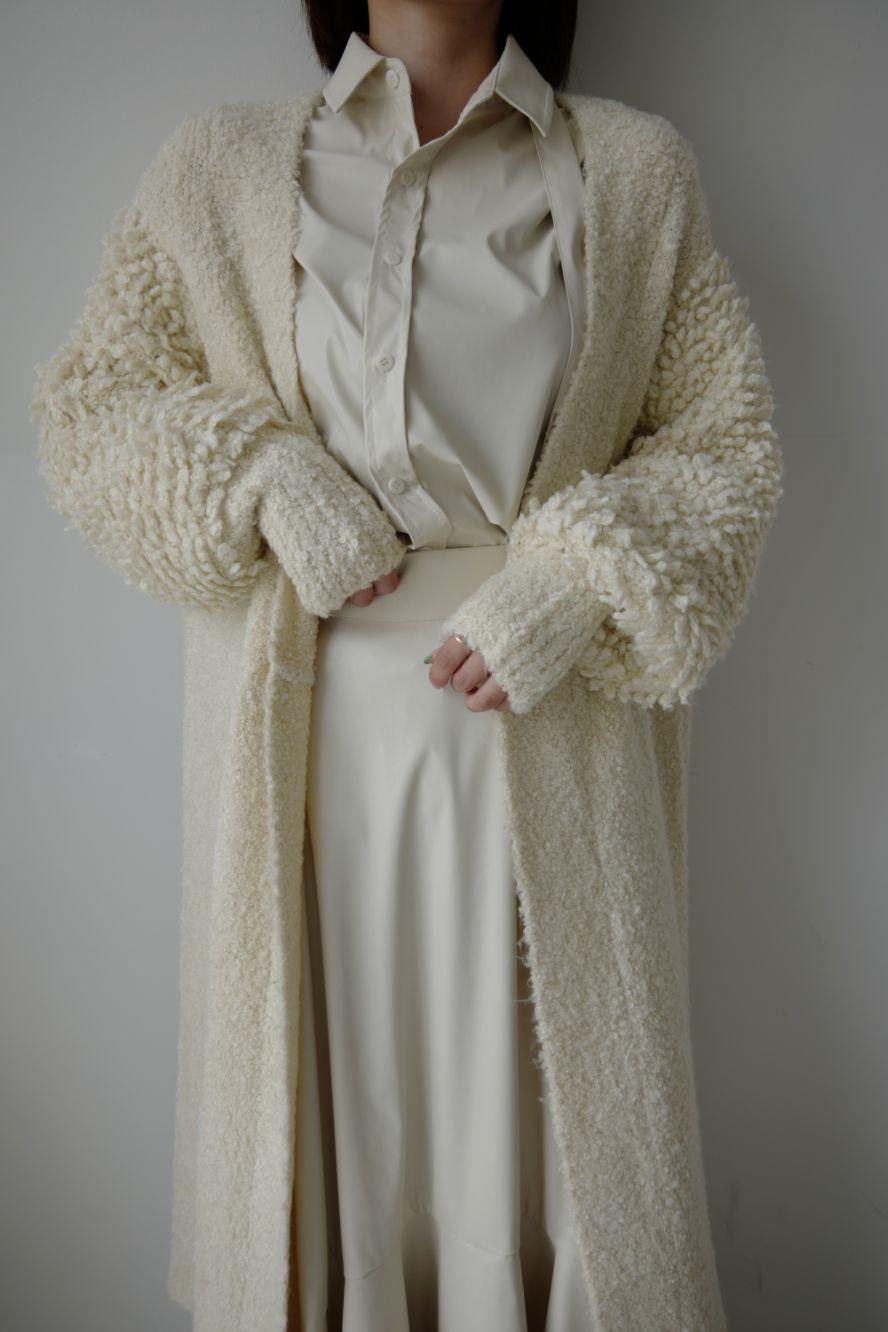 這是一款針織開衫,表面採用捲曲紗線編織而成,袖子則進一步編織成環狀,看起來利落而富有衝擊力。 下垂的肩部設計給人一種輕鬆的感覺。 除了簡單的搭配外,它還可以與多種疊穿方式搭配。 建議在腰部繫上腰帶。