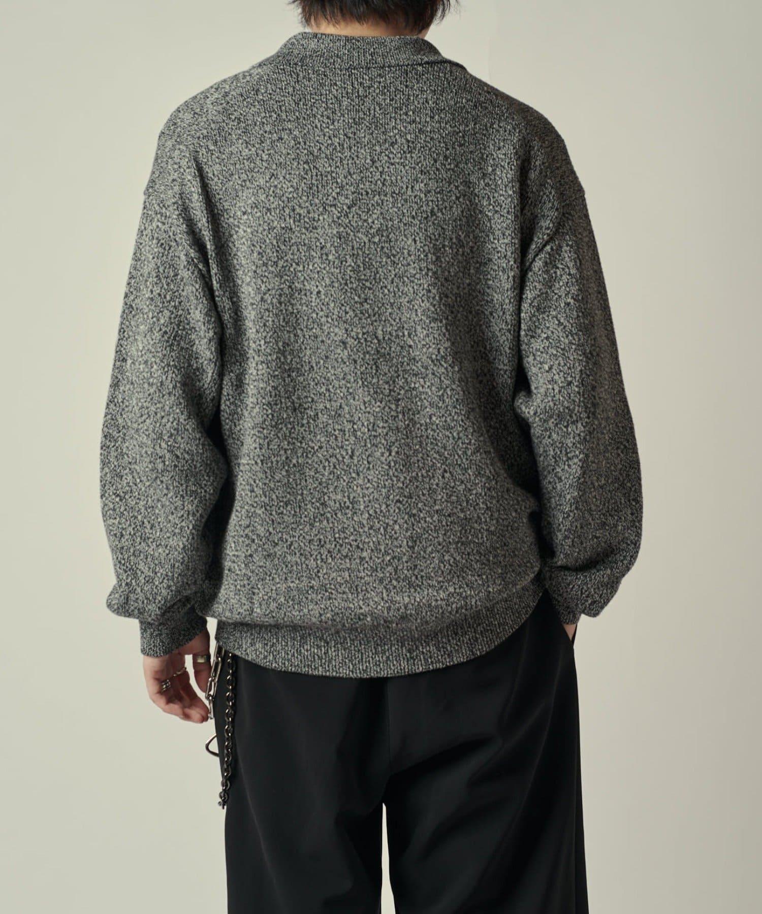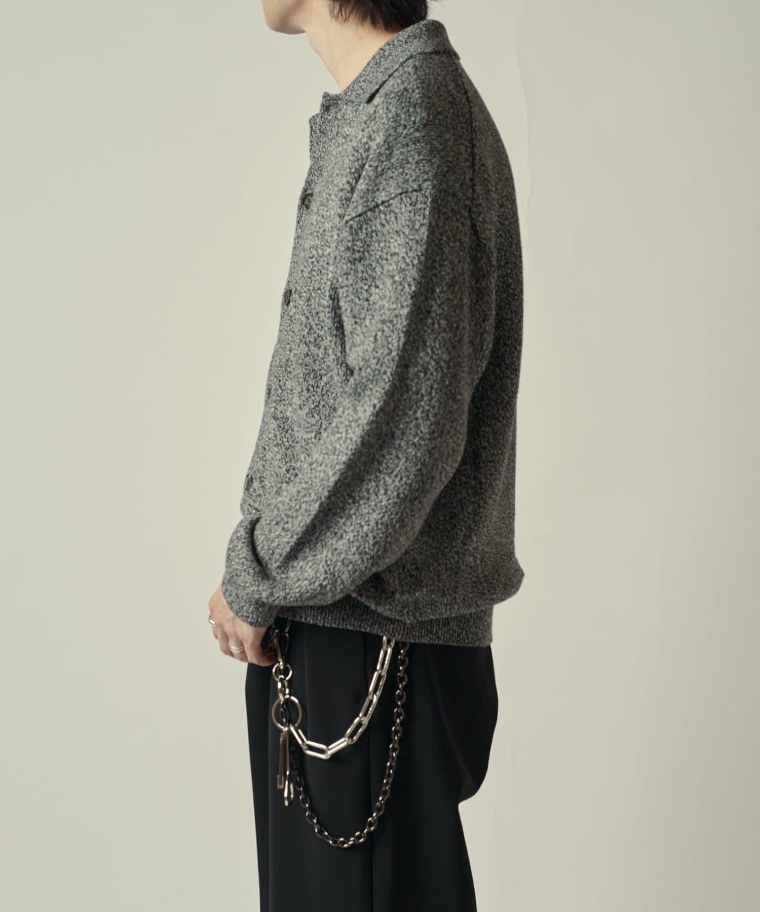 這款針織襯衫開衫採用芝麻鹽般的斑點圖案。寬大的廓形,相對於長度,衣身寬度稍寬。