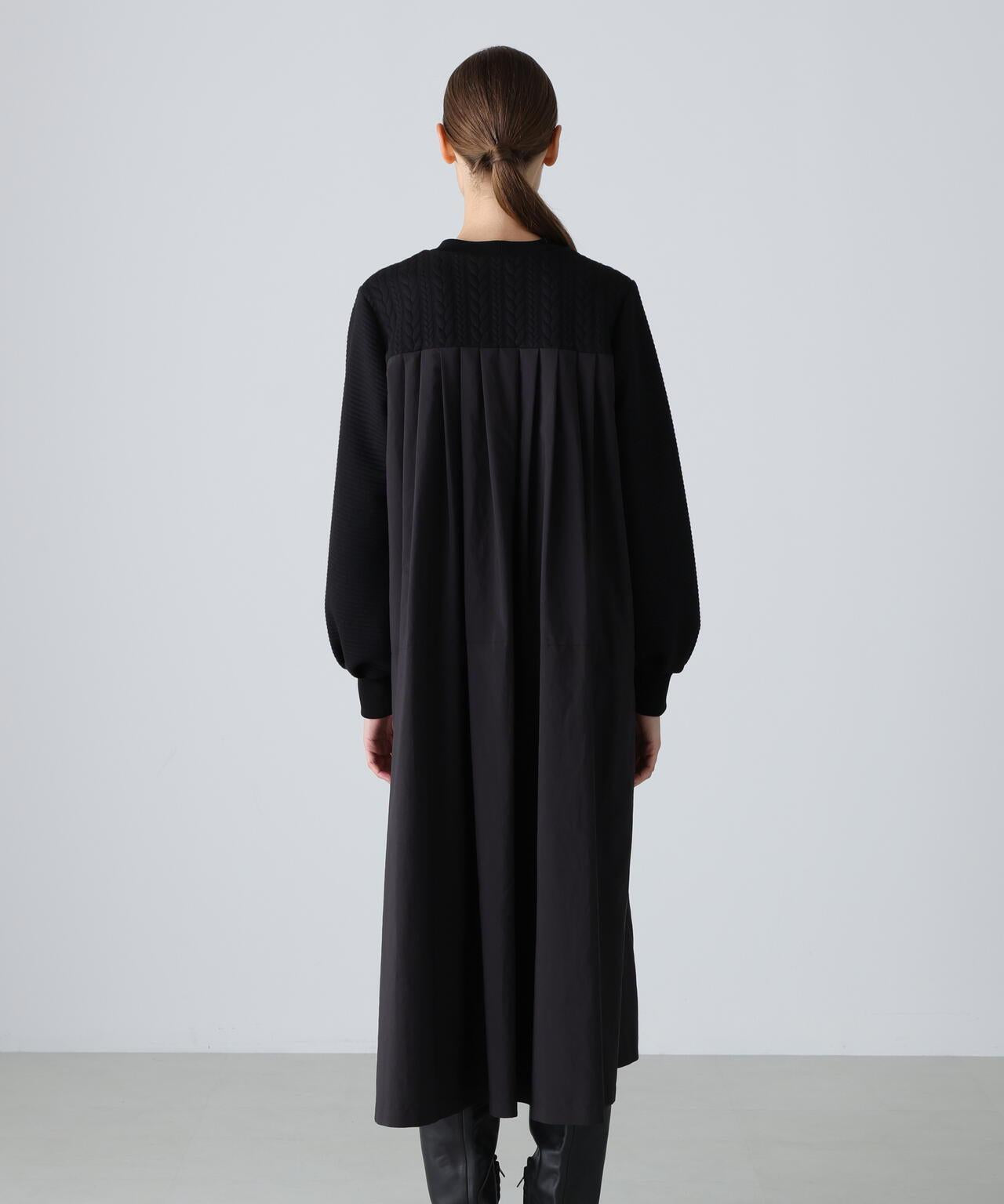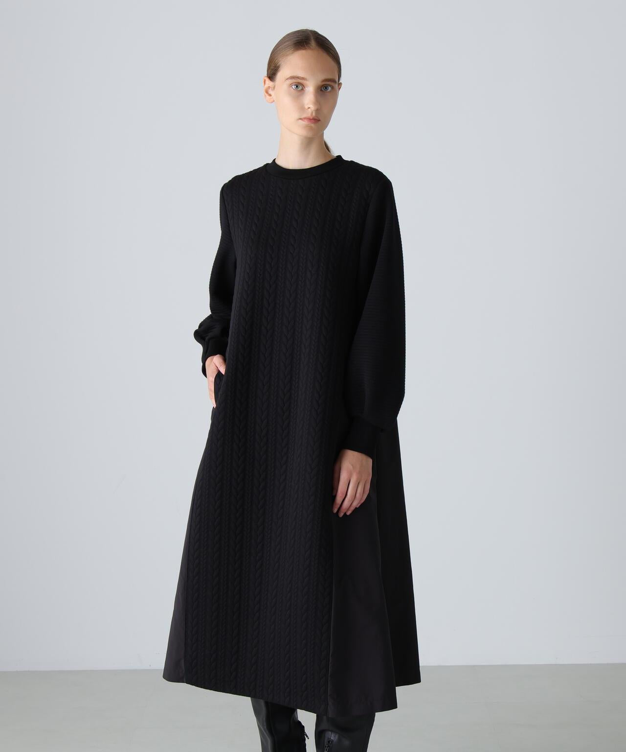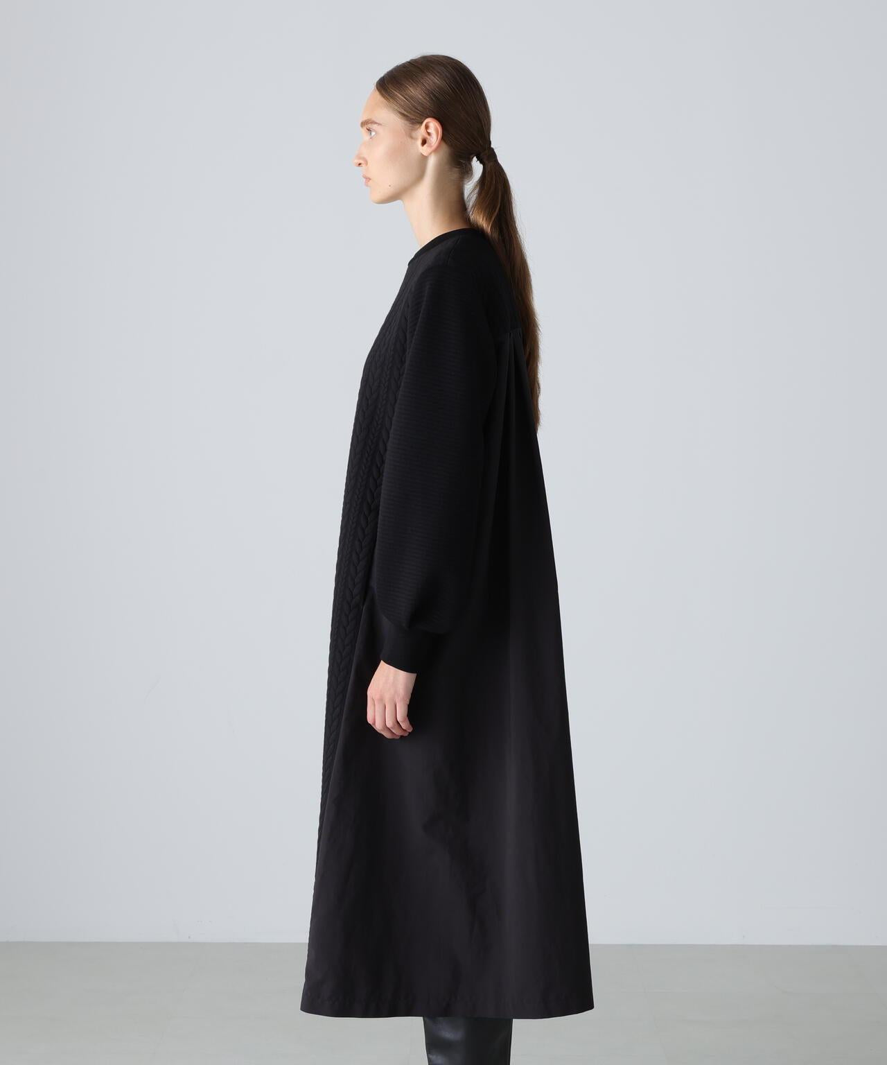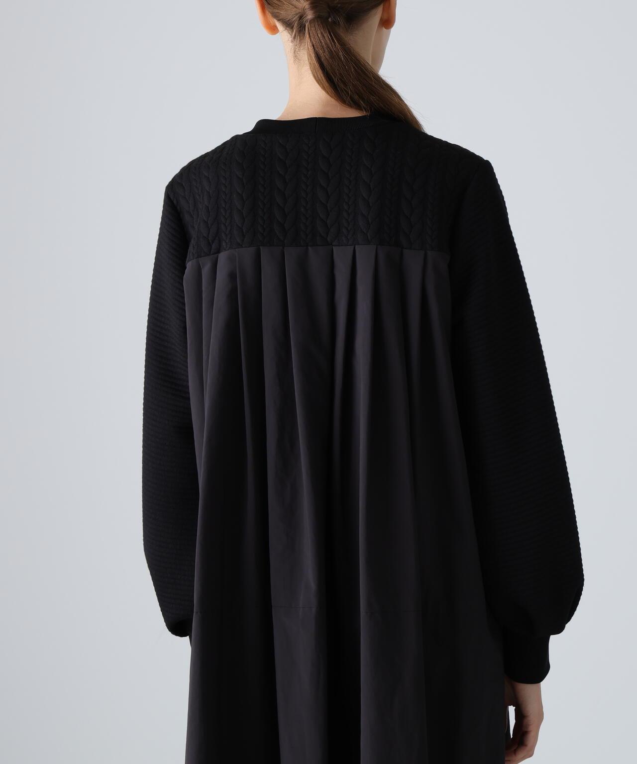 平整的針織連衣裙,採用不平整的提花面料,這款連衣裙結合了裁剪縫製和塔夫綢面料。塔夫綢部分採用內收設計,使其更加豐滿。不同面料的組合創造出一件引人注目的作品。