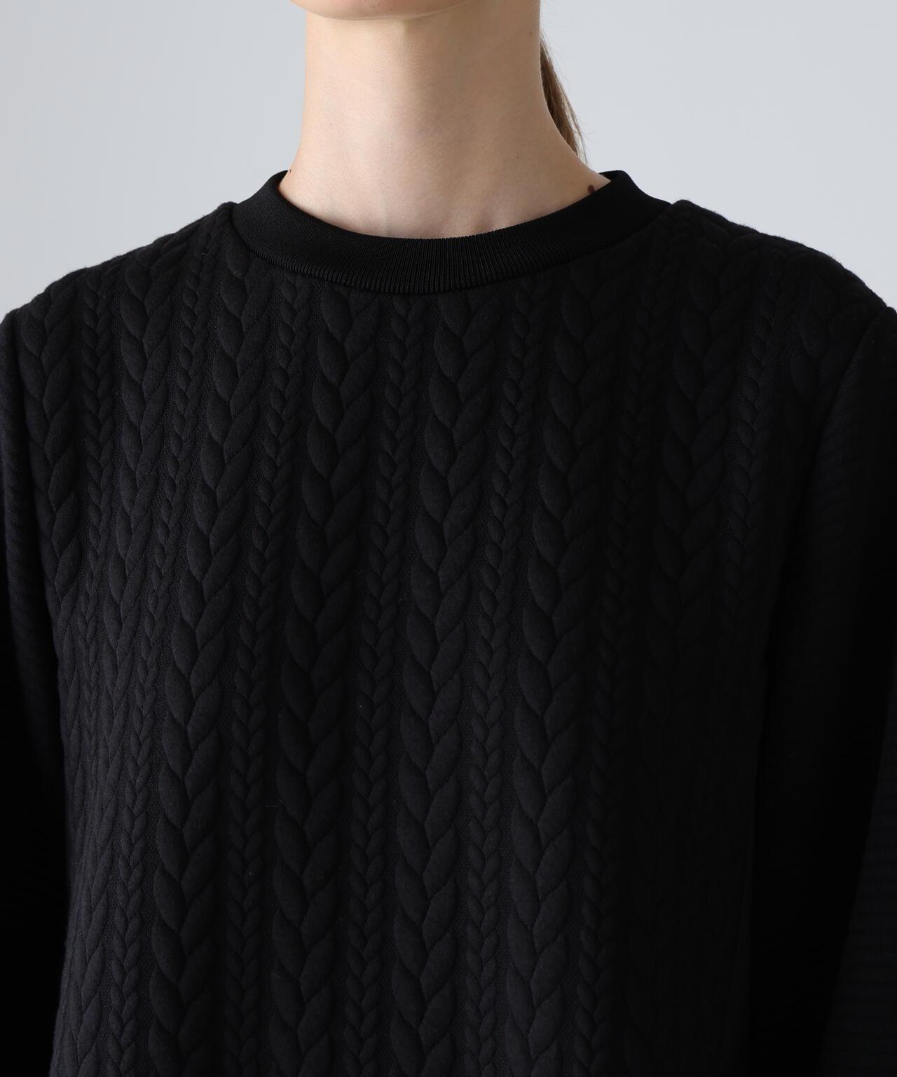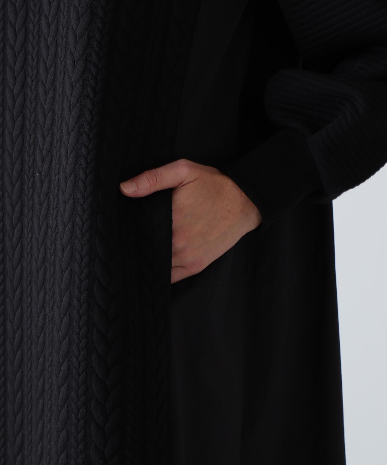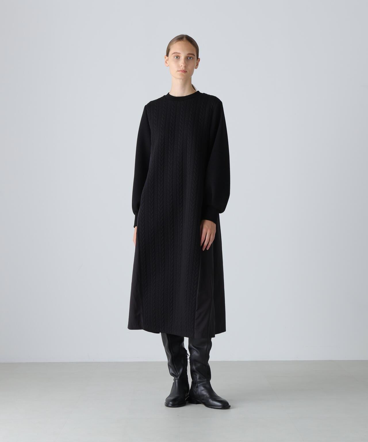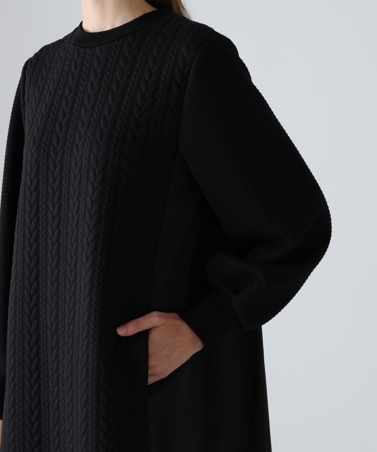 平整的針織連衣裙,採用不平整的提花面料,這款連衣裙結合了裁剪縫製和塔夫綢面料。塔夫綢部分採用內收設計,使其更加豐滿。不同面料的組合創造出一件引人注目的作品。