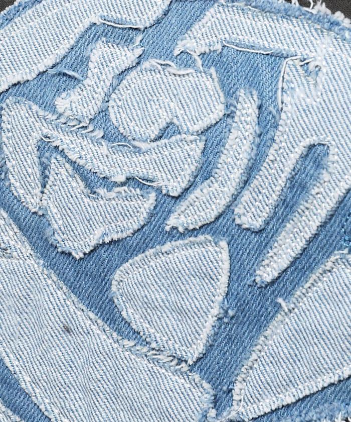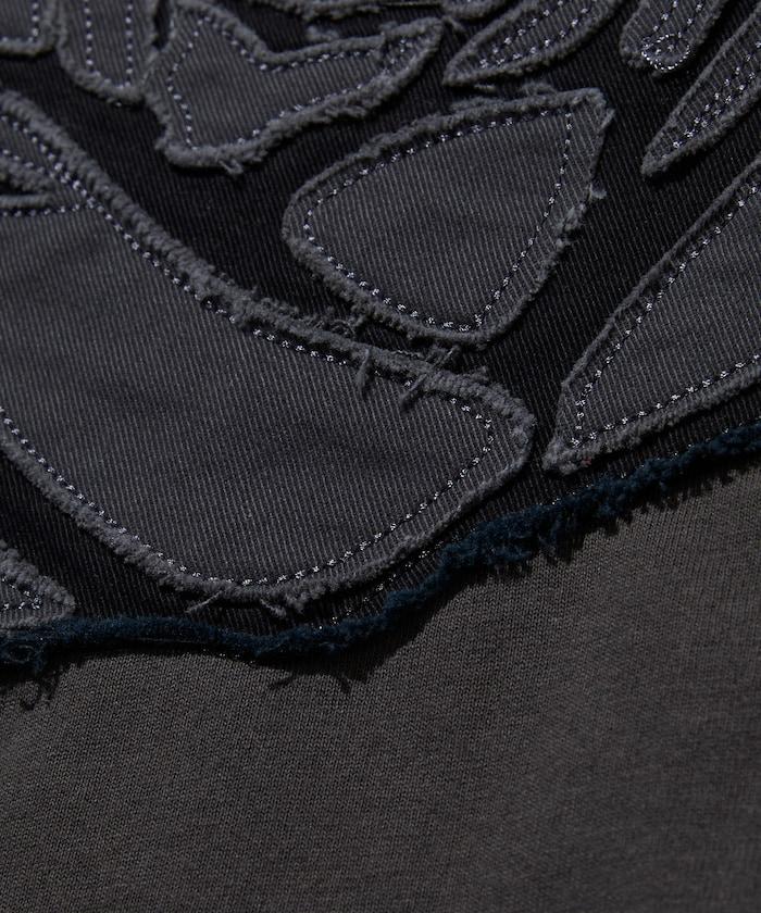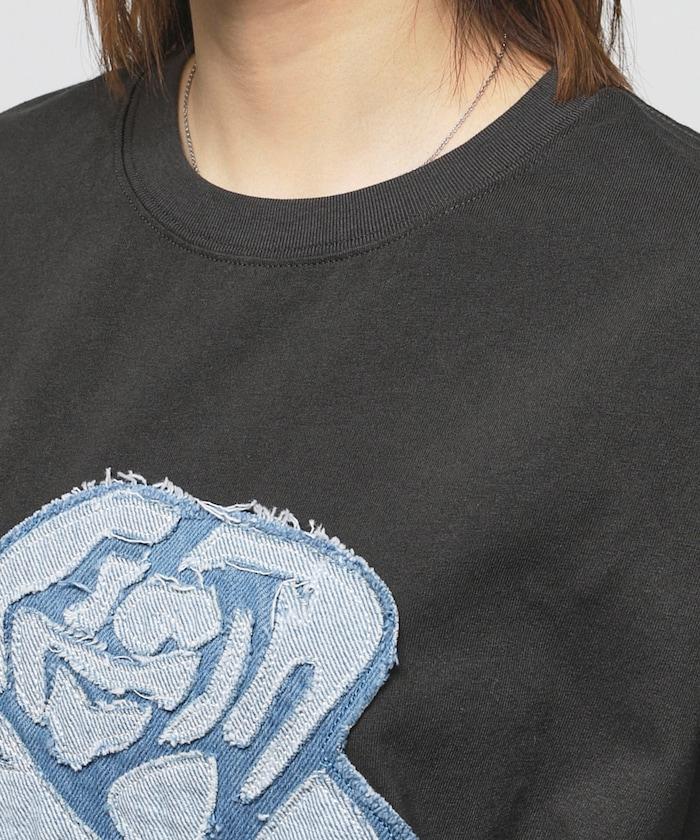 這款 T 恤通過層疊的牛仔面料表現出立體的玫瑰圖案。