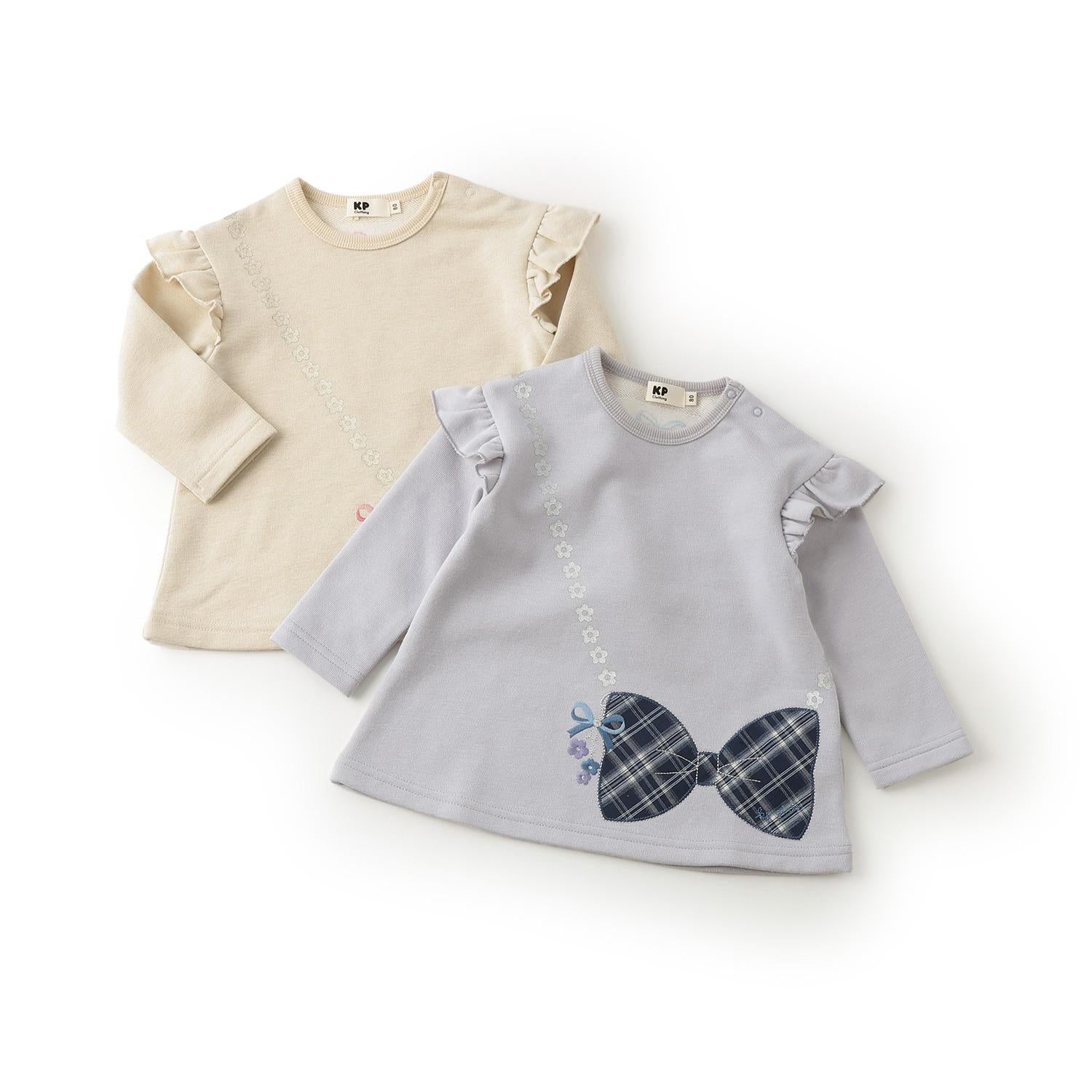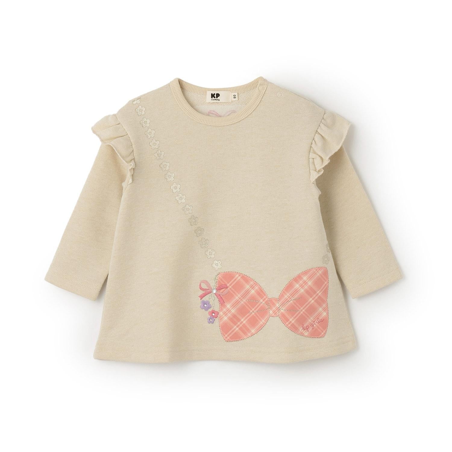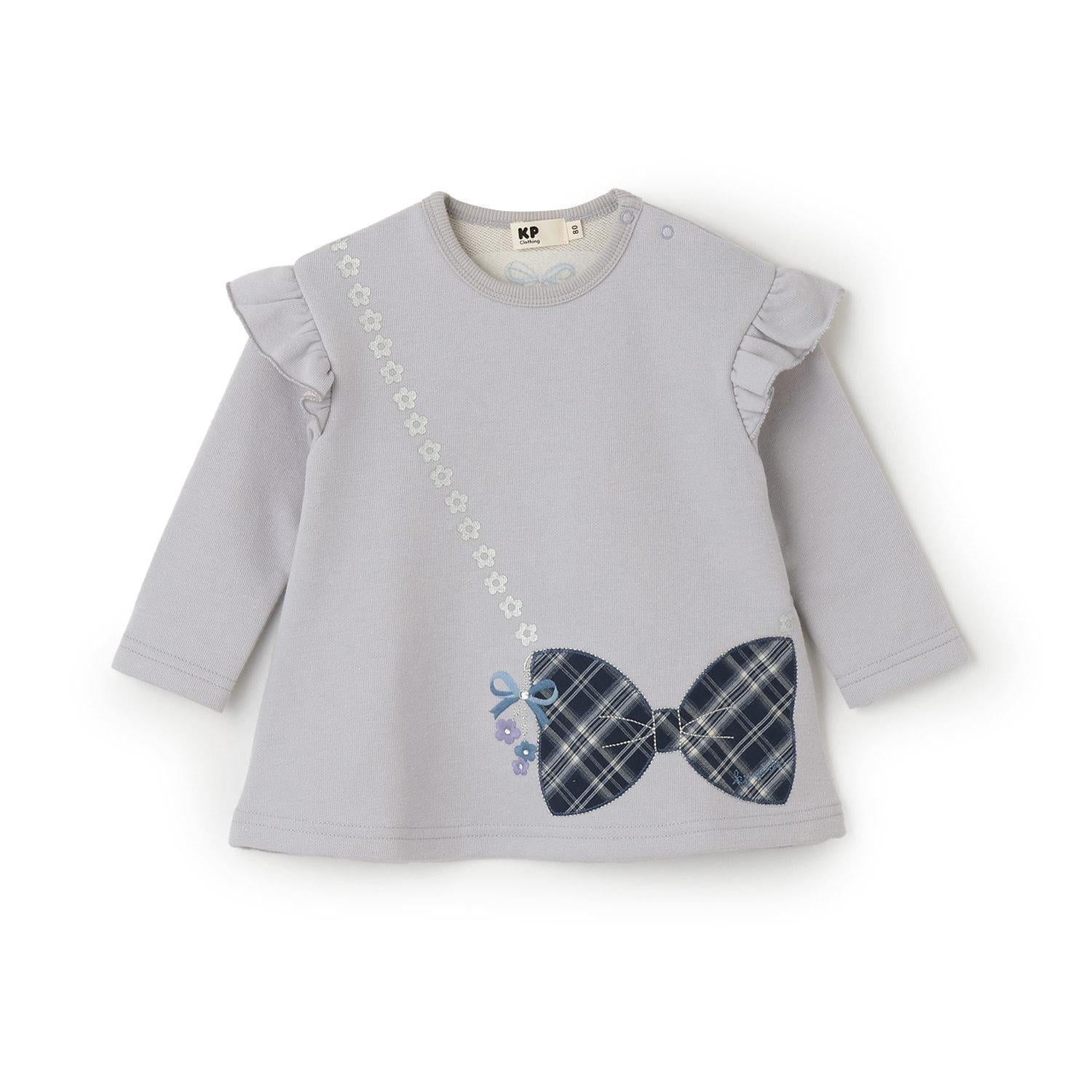 下垂的肩部飾有荷葉邊和緞帶袋式貼花。