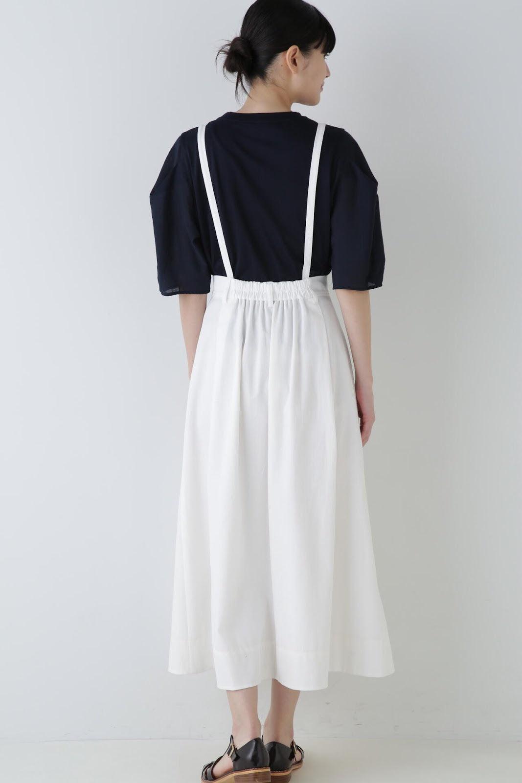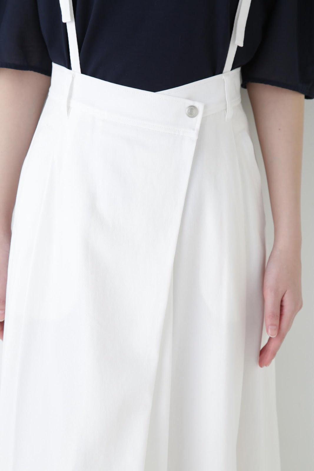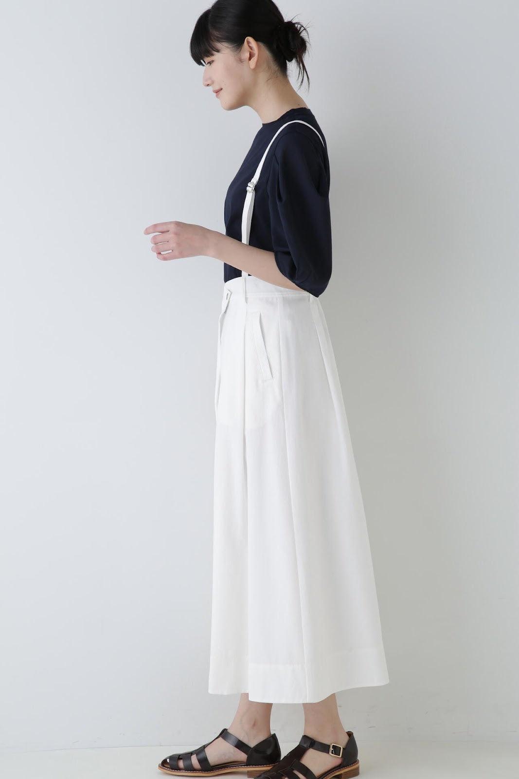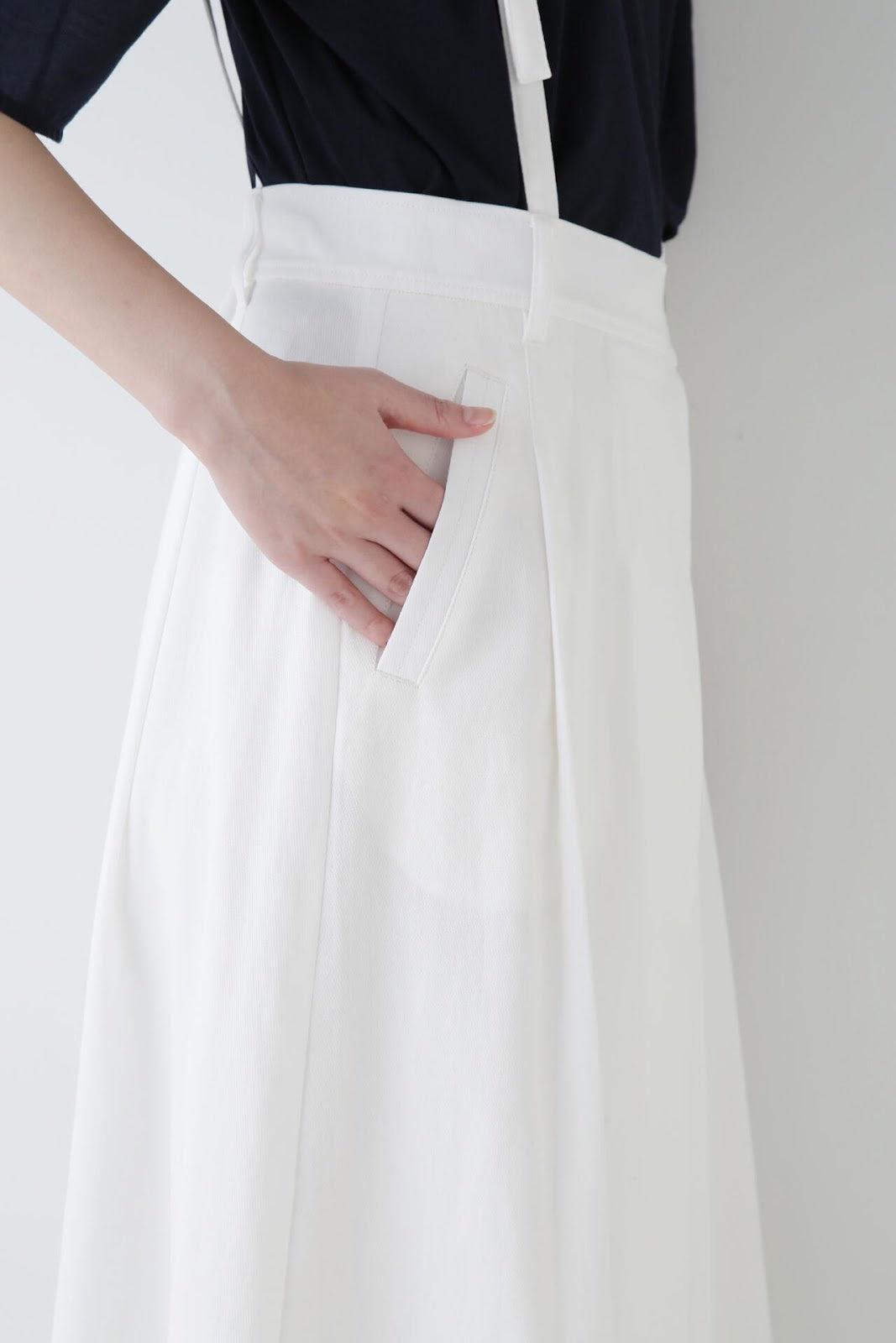 懸掛式裙襬,輪廓分明 [設計要點] 這款懸掛式裙襬可展現隨意收起的裙襬。裙襬部分的開口處配有獨創的圓點紐扣。肩帶可拆卸,長度可調節。白色有內襯,穿起來不會有透明感。帶有精細花紋的多臂克斯面料經過後處理,具有防水性,水溶性汙漬耐髒且易於去除。裙襬也經過潑水處理,具有水溶性、抗汙性和易清洗性。根據內搭的不同,它可以長穿一季,拆下懸掛繩還可以當裙子穿,這樣就可以擴大服裝的搭配範圍。