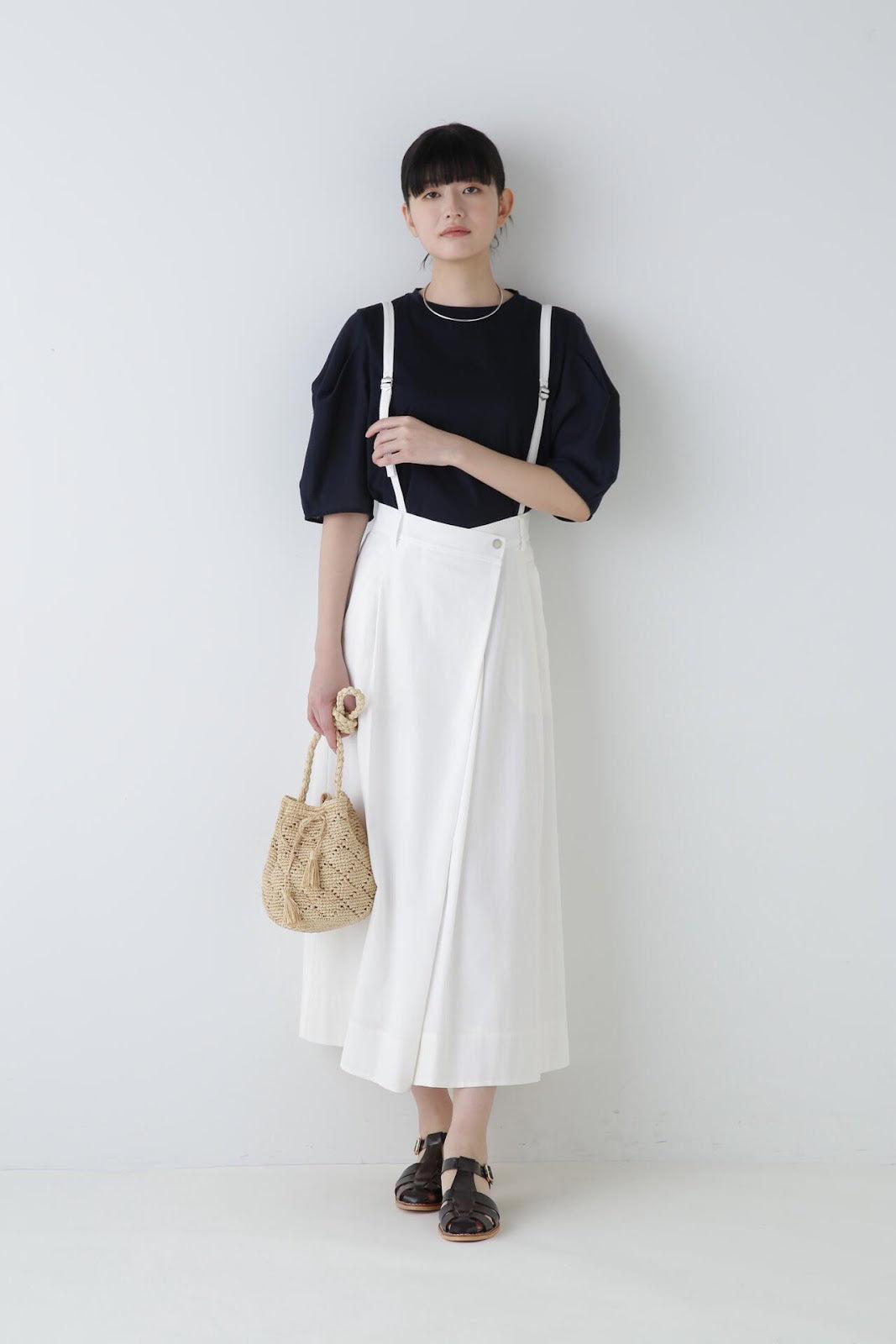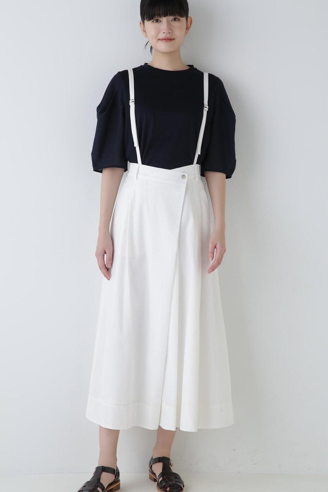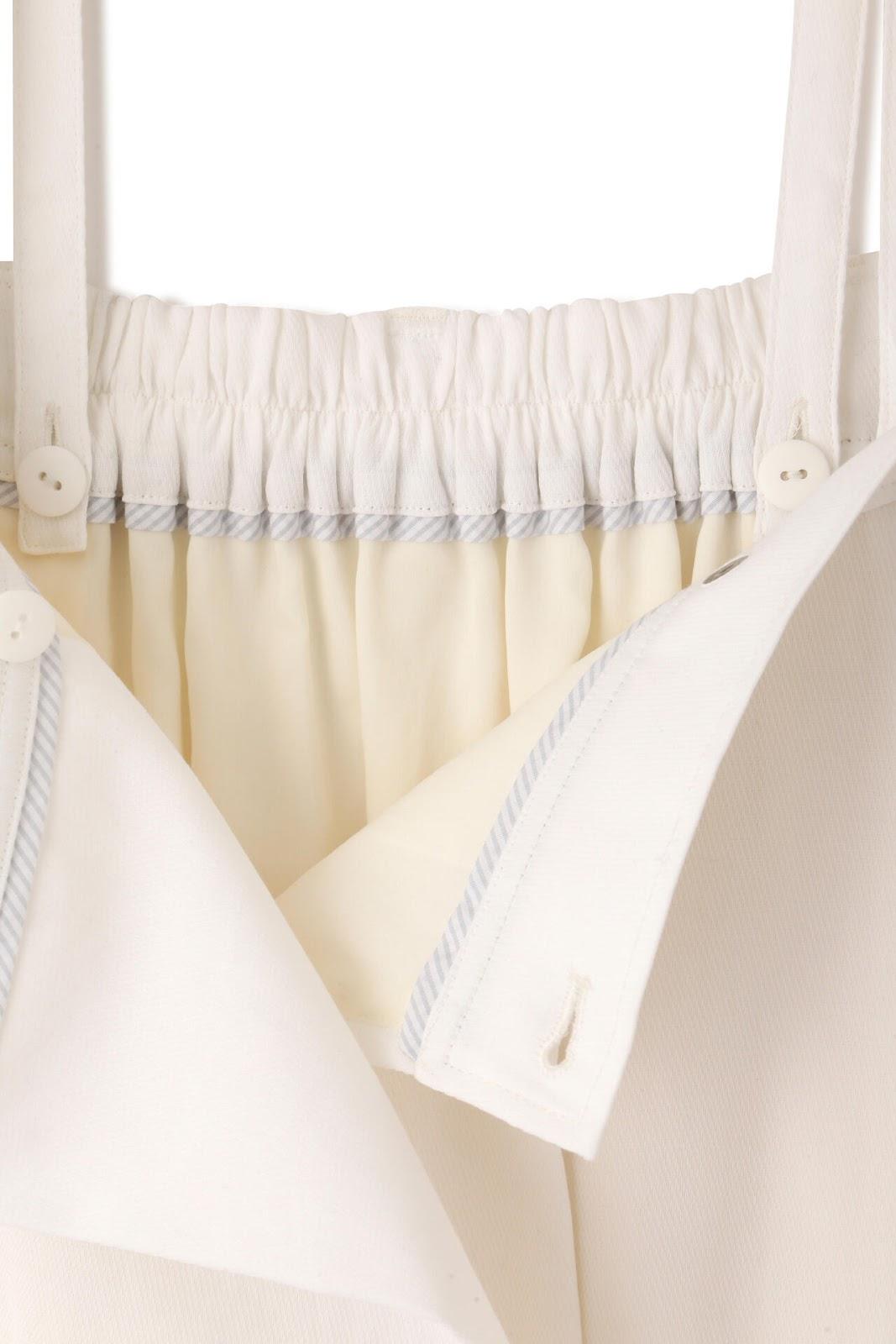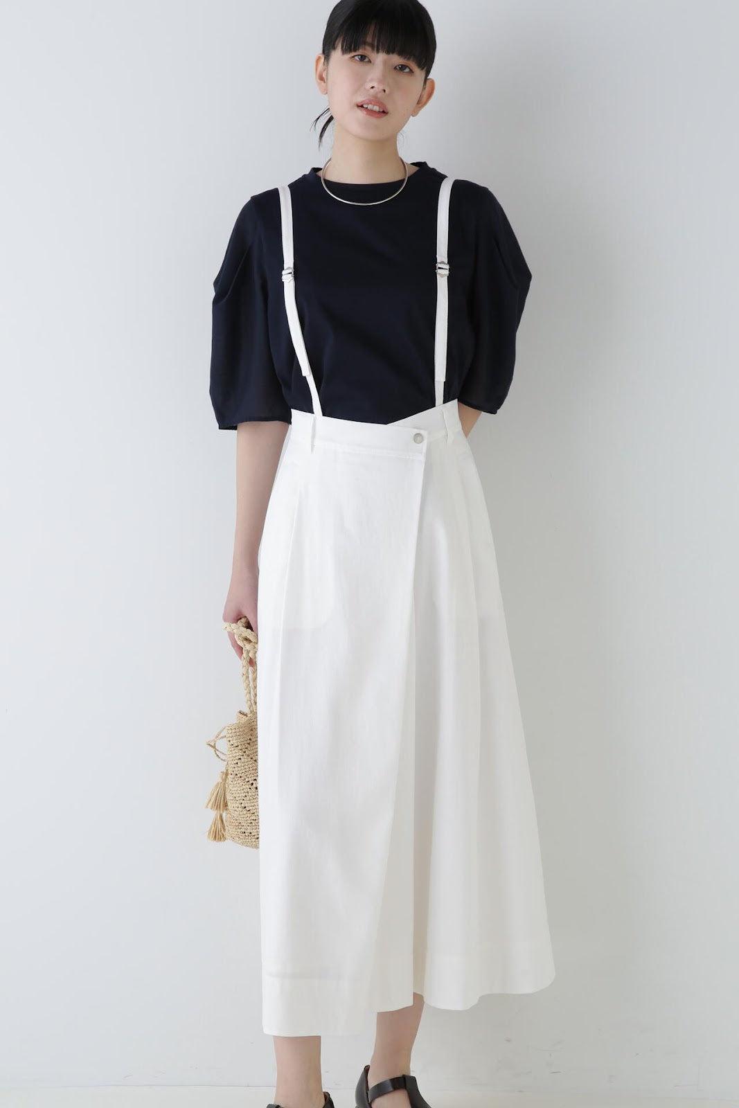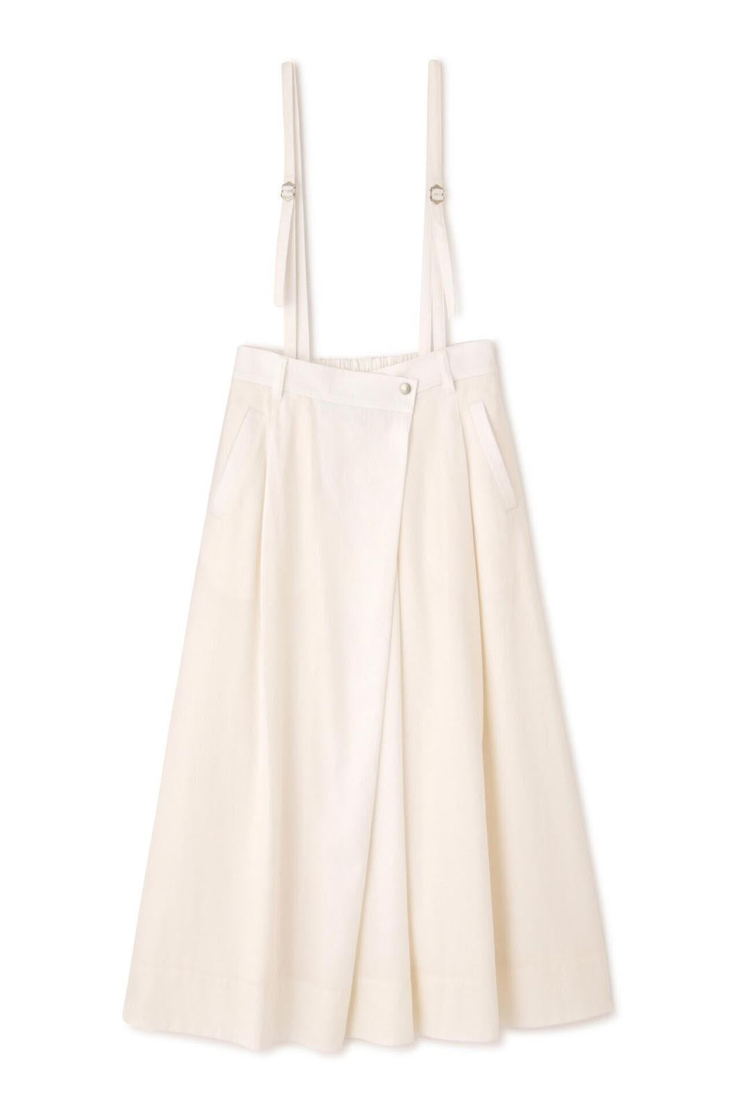 懸掛式裙襬,輪廓分明 [設計要點] 這款懸掛式裙襬可展現隨意收起的裙襬。裙襬部分的開口處配有獨創的圓點紐扣。肩帶可拆卸,長度可調節。白色有內襯,穿起來不會有透明感。帶有精細花紋的多臂克斯面料經過後處理,具有防水性,水溶性汙漬耐髒且易於去除。裙襬也經過潑水處理,具有水溶性、抗汙性和易清洗性。根據內搭的不同,它可以長穿一季,拆下懸掛繩還可以當裙子穿,這樣就可以擴大服裝的搭配範圍。