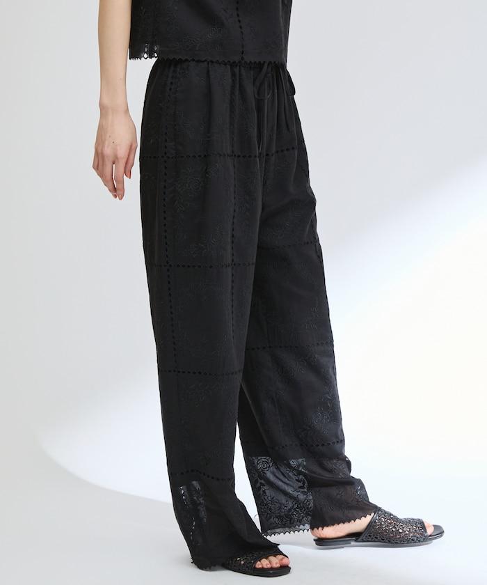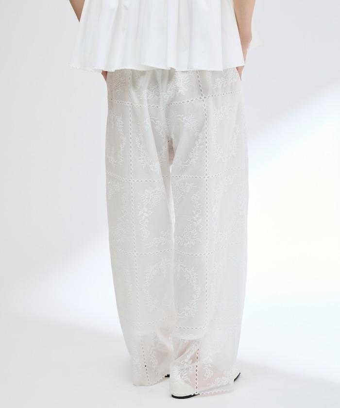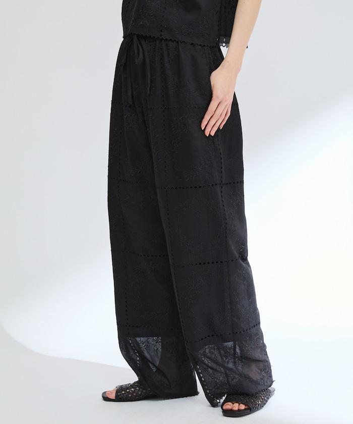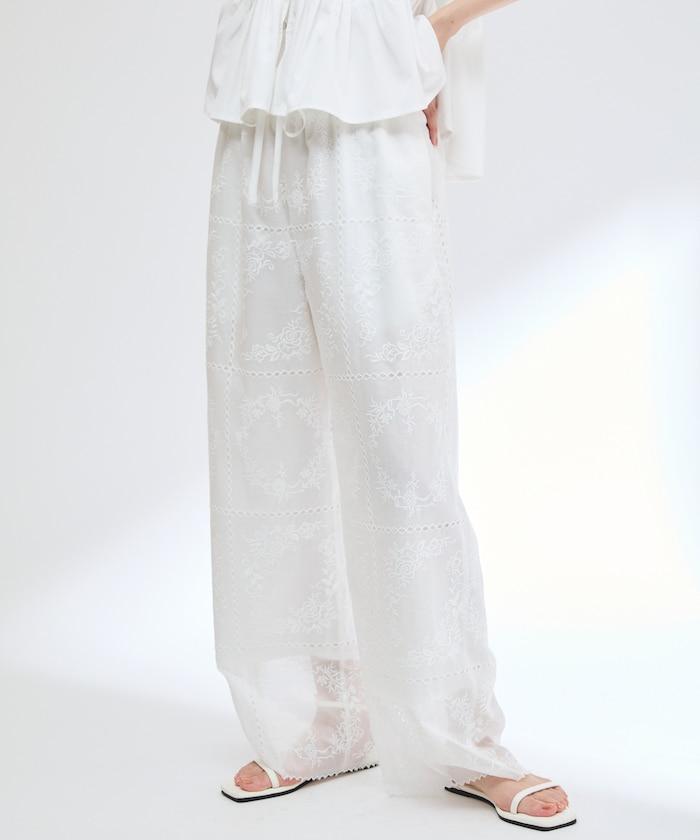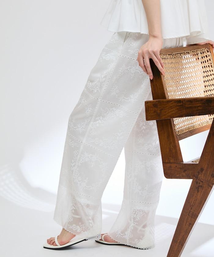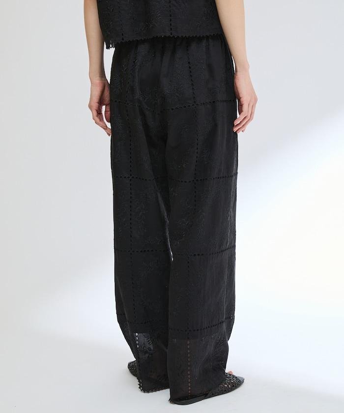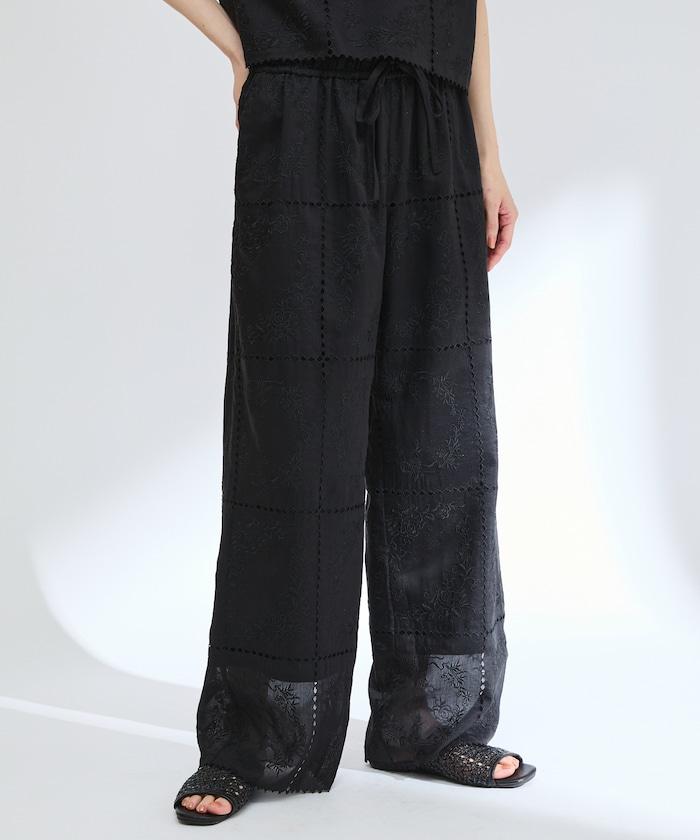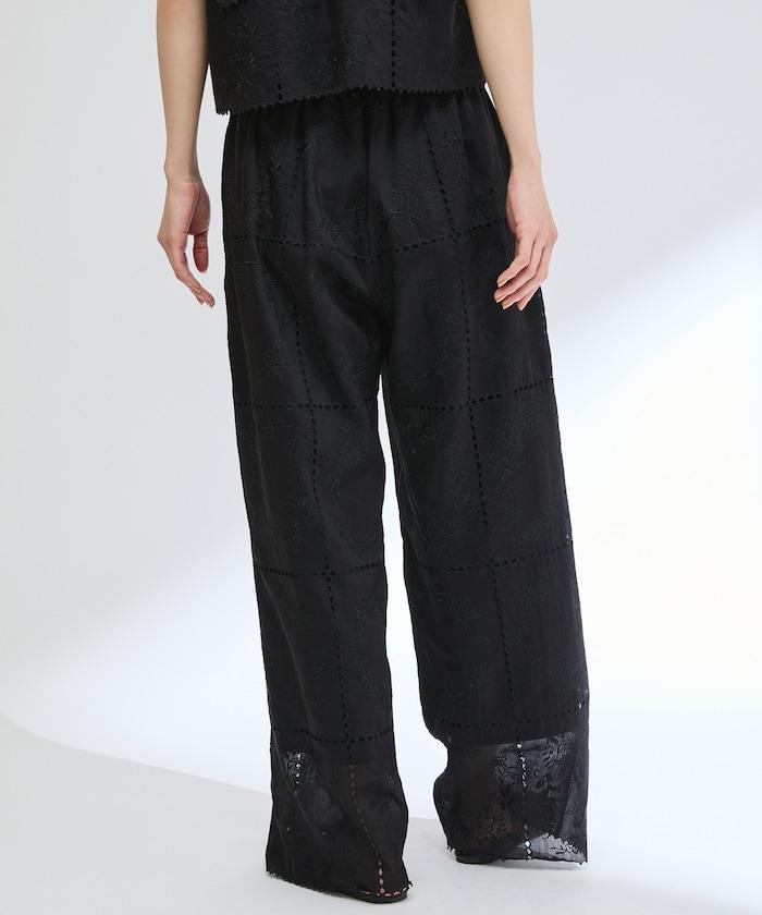 具有奢華感的寬鬆長褲,由帶有原創刺繡的薄紗面料製成。