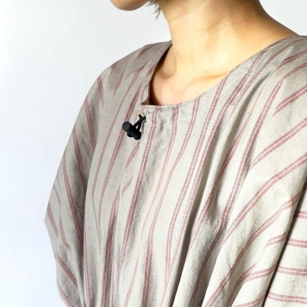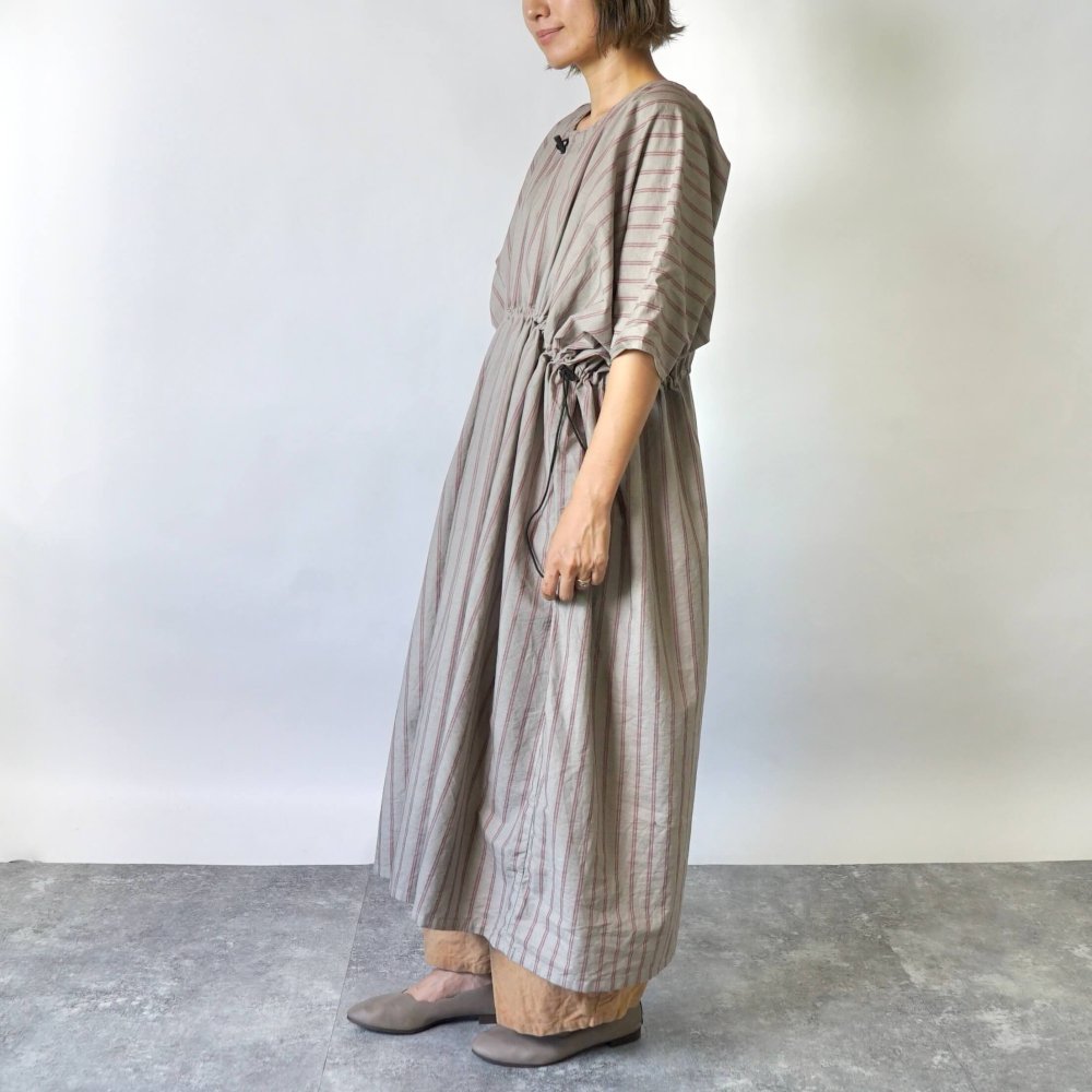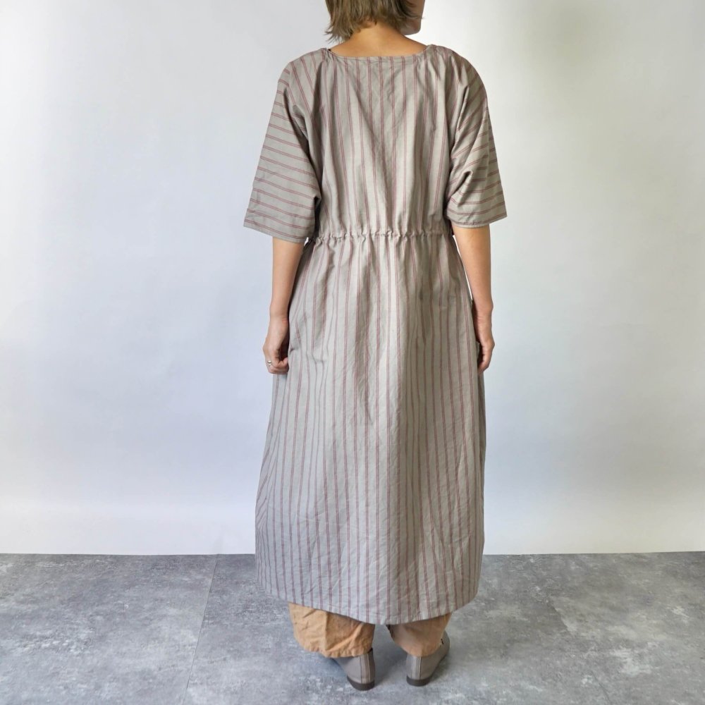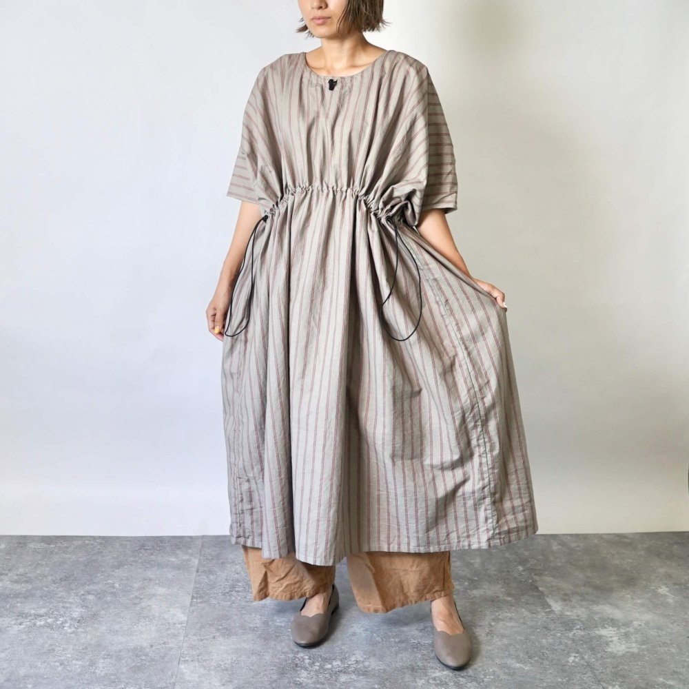 清新的條紋圖案與草染卡其色的結合,與這款連衣裙相得益彰。