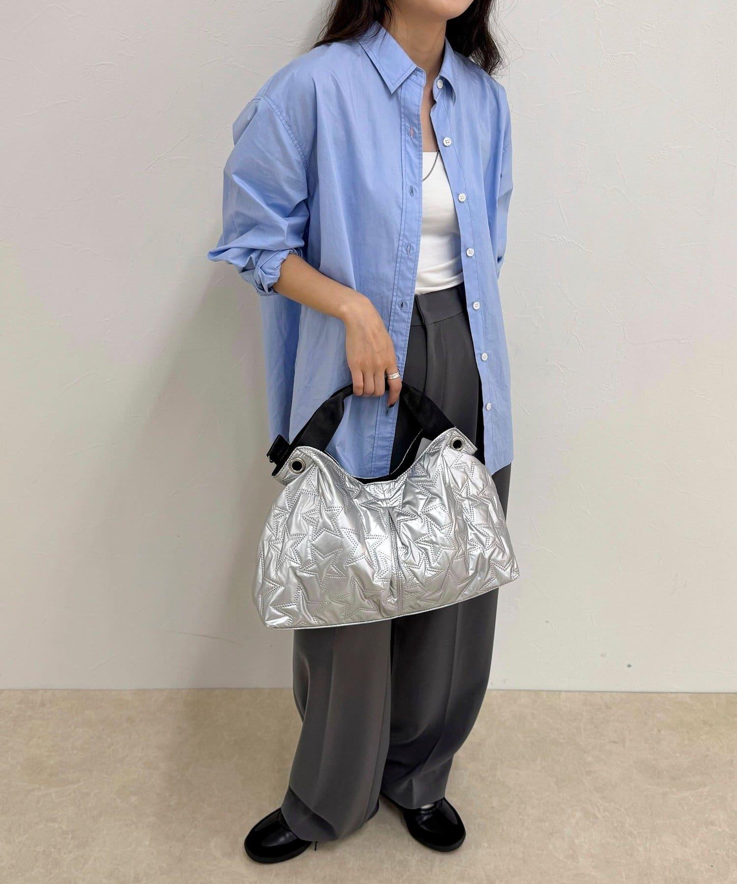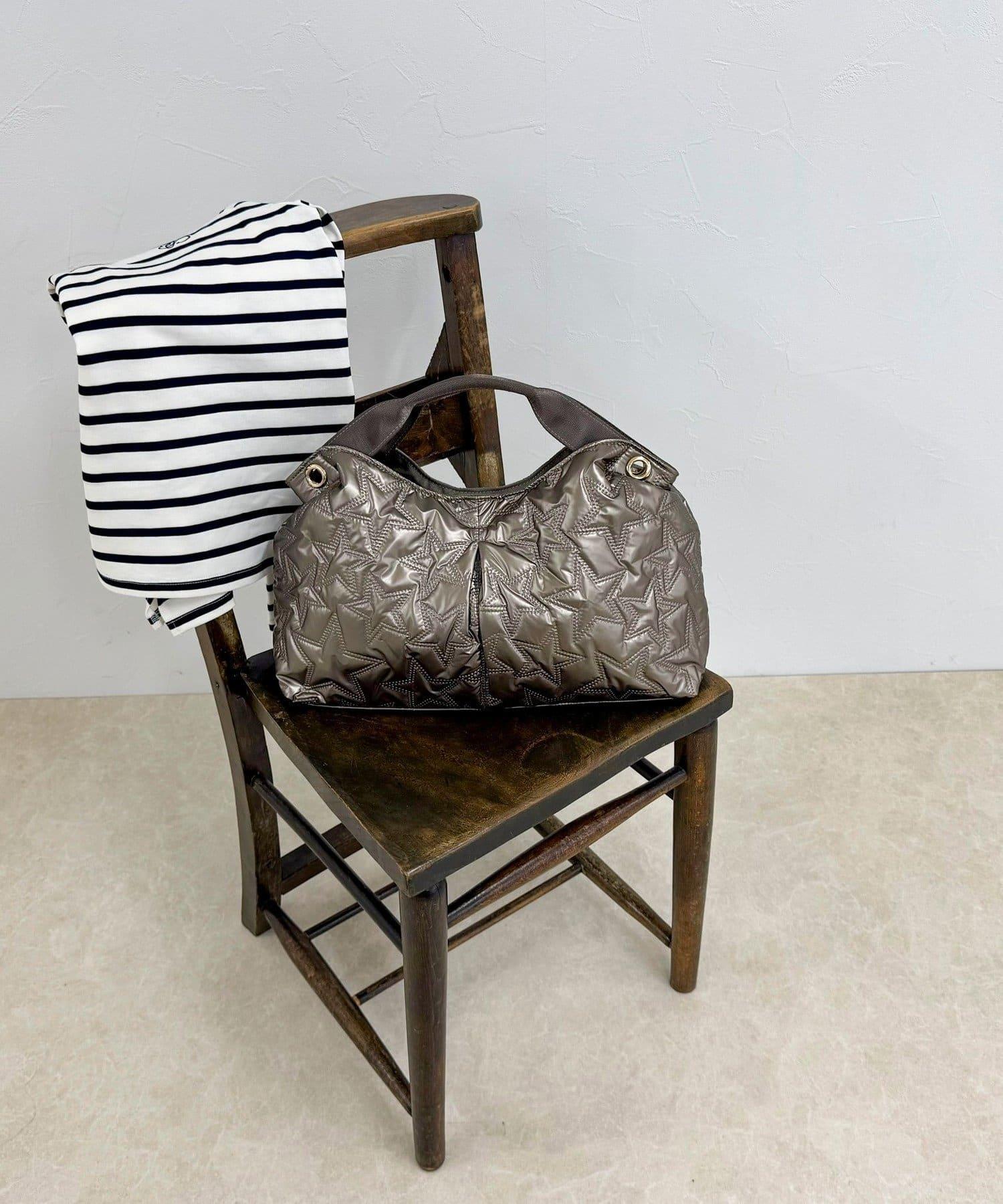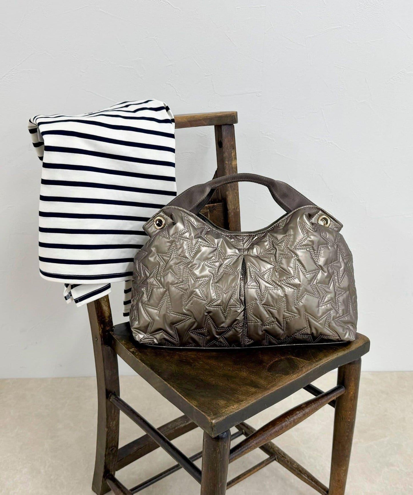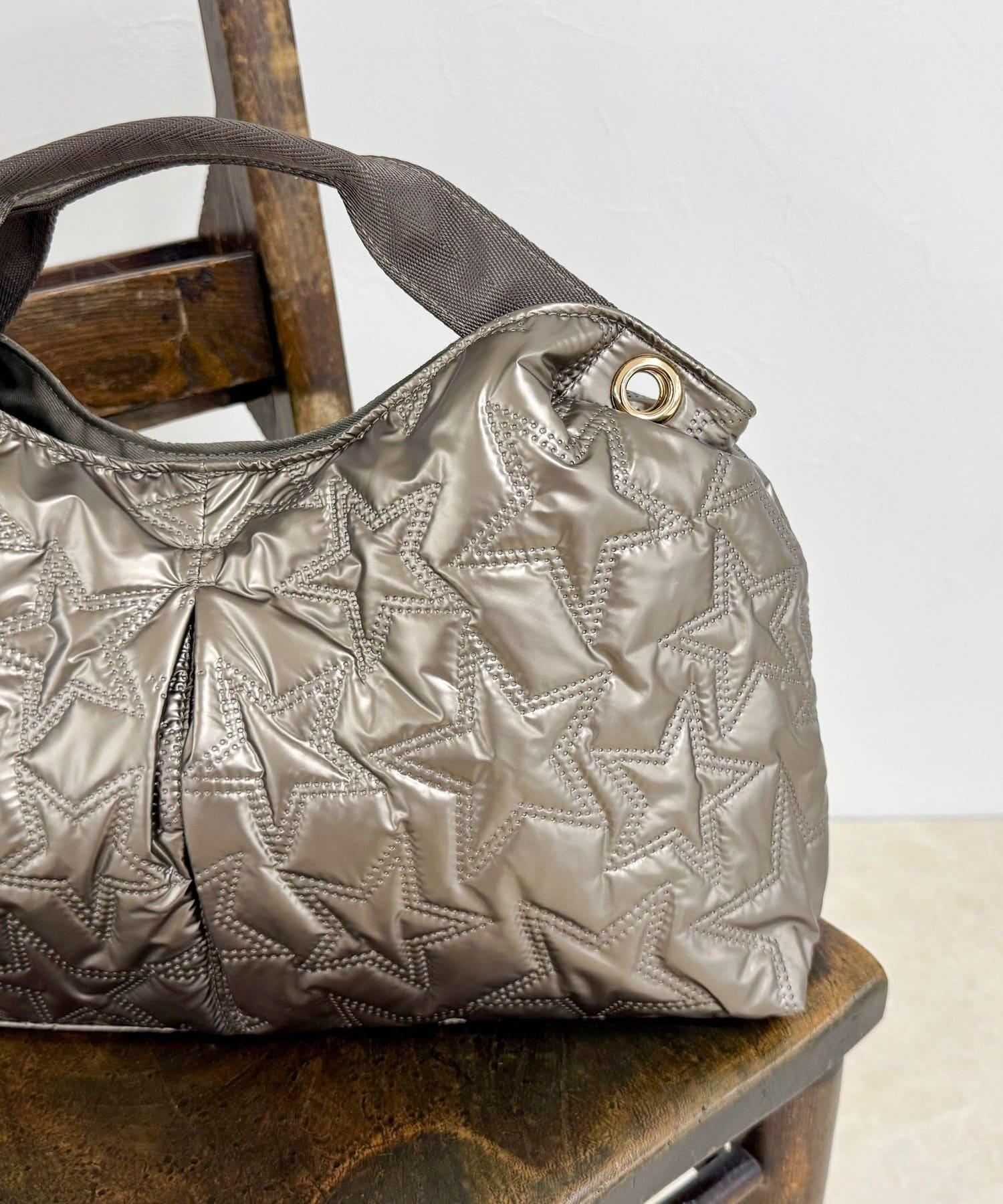 一款星形絎縫手提包,其金屬材質成為一個協調點。