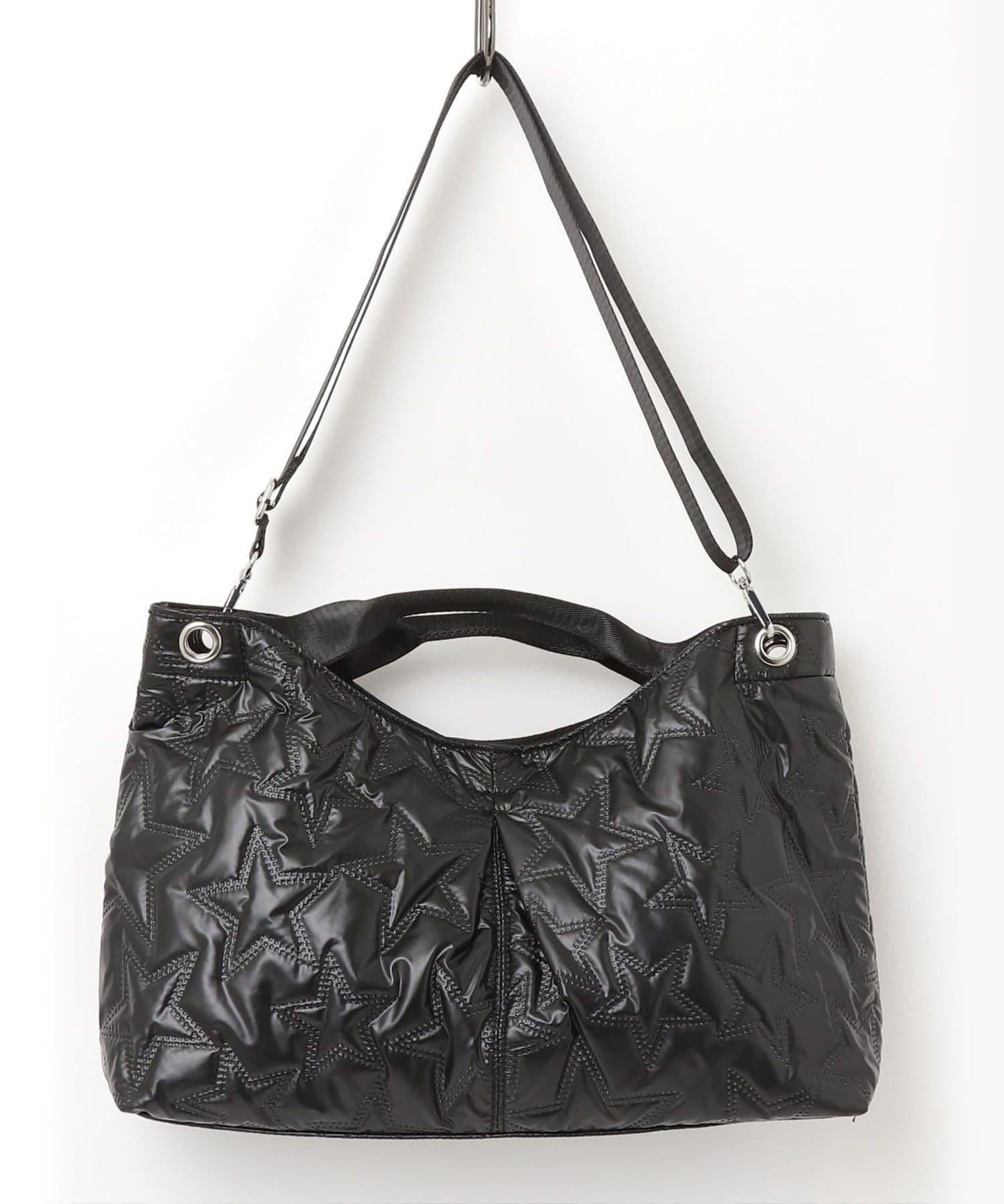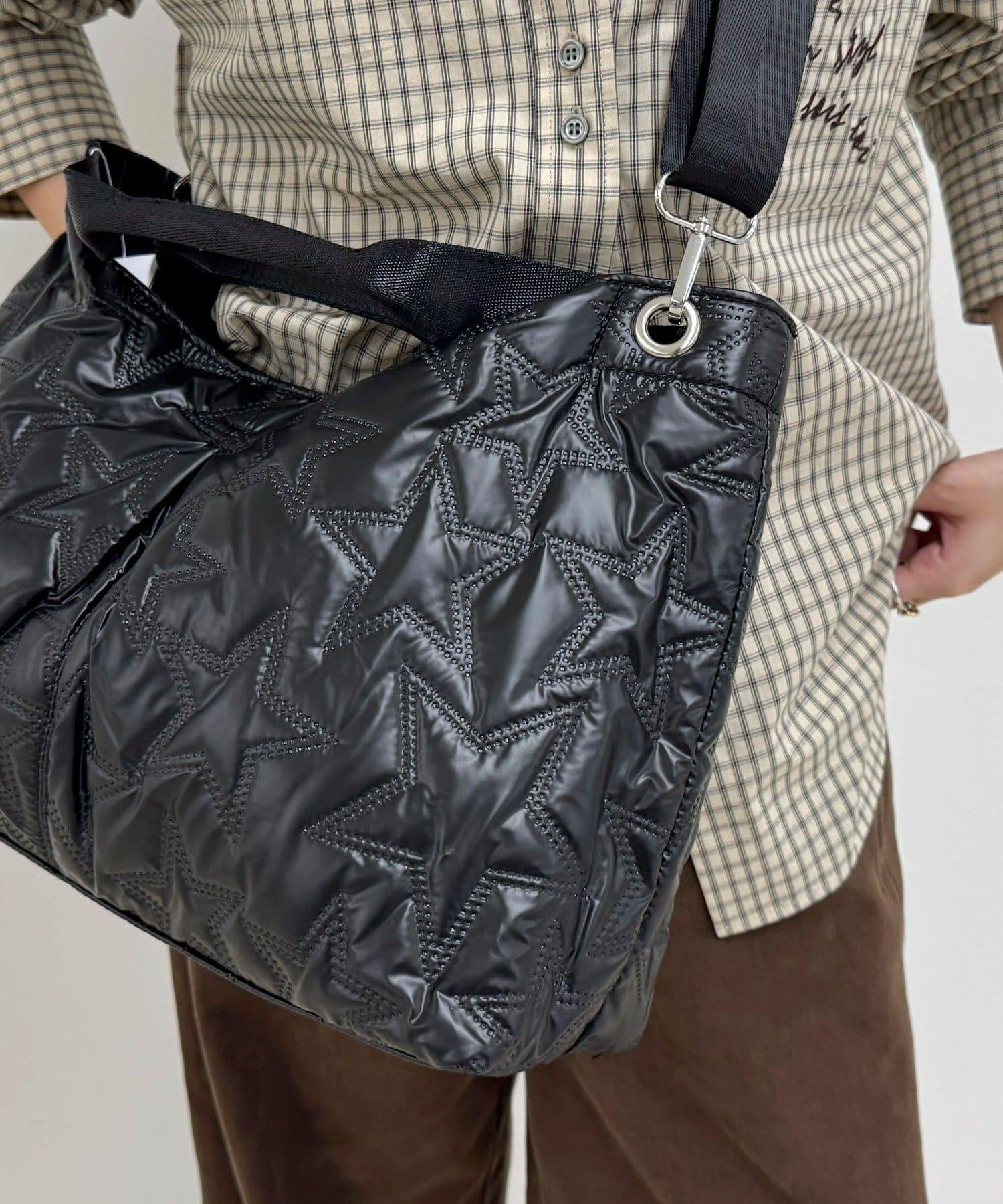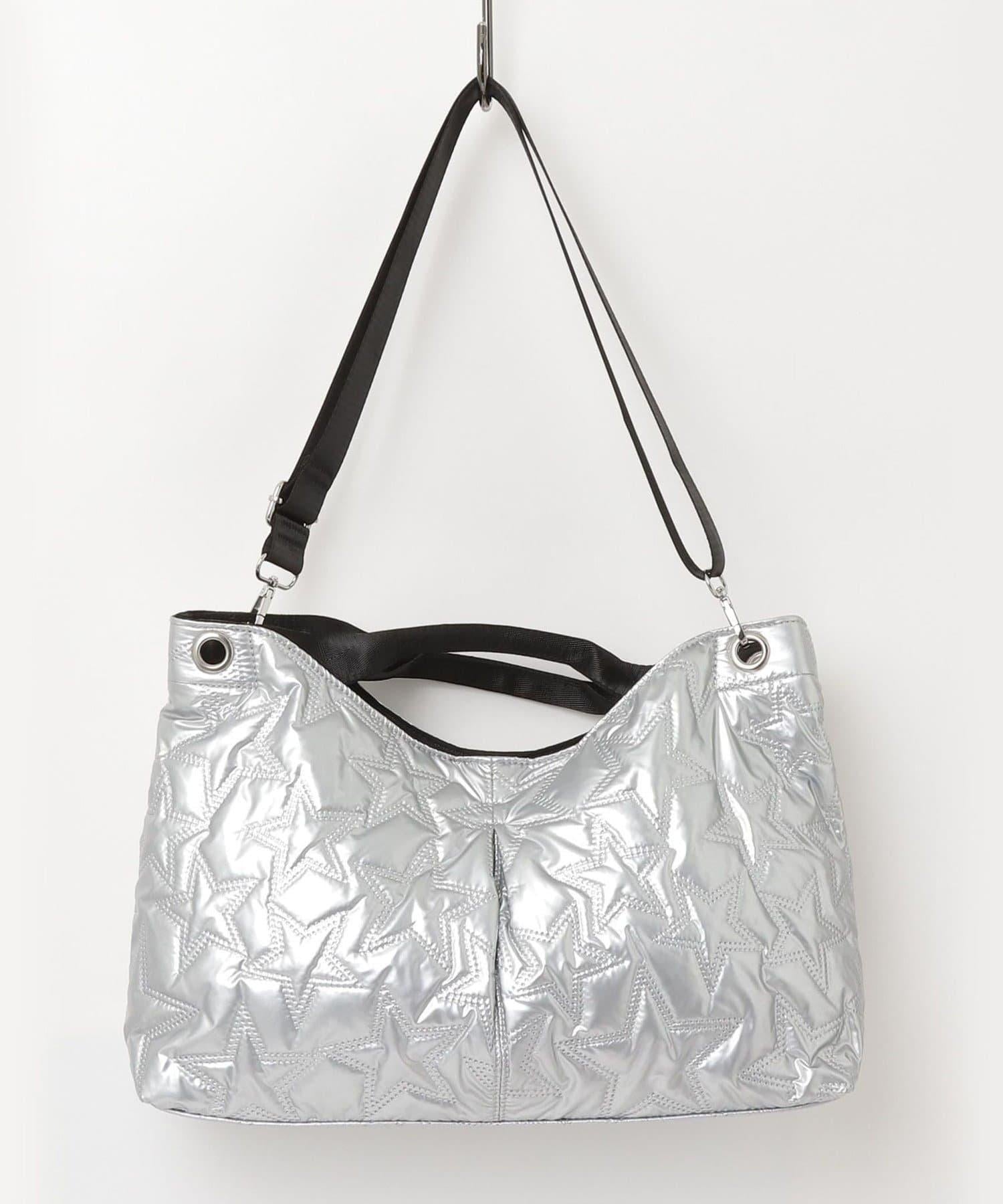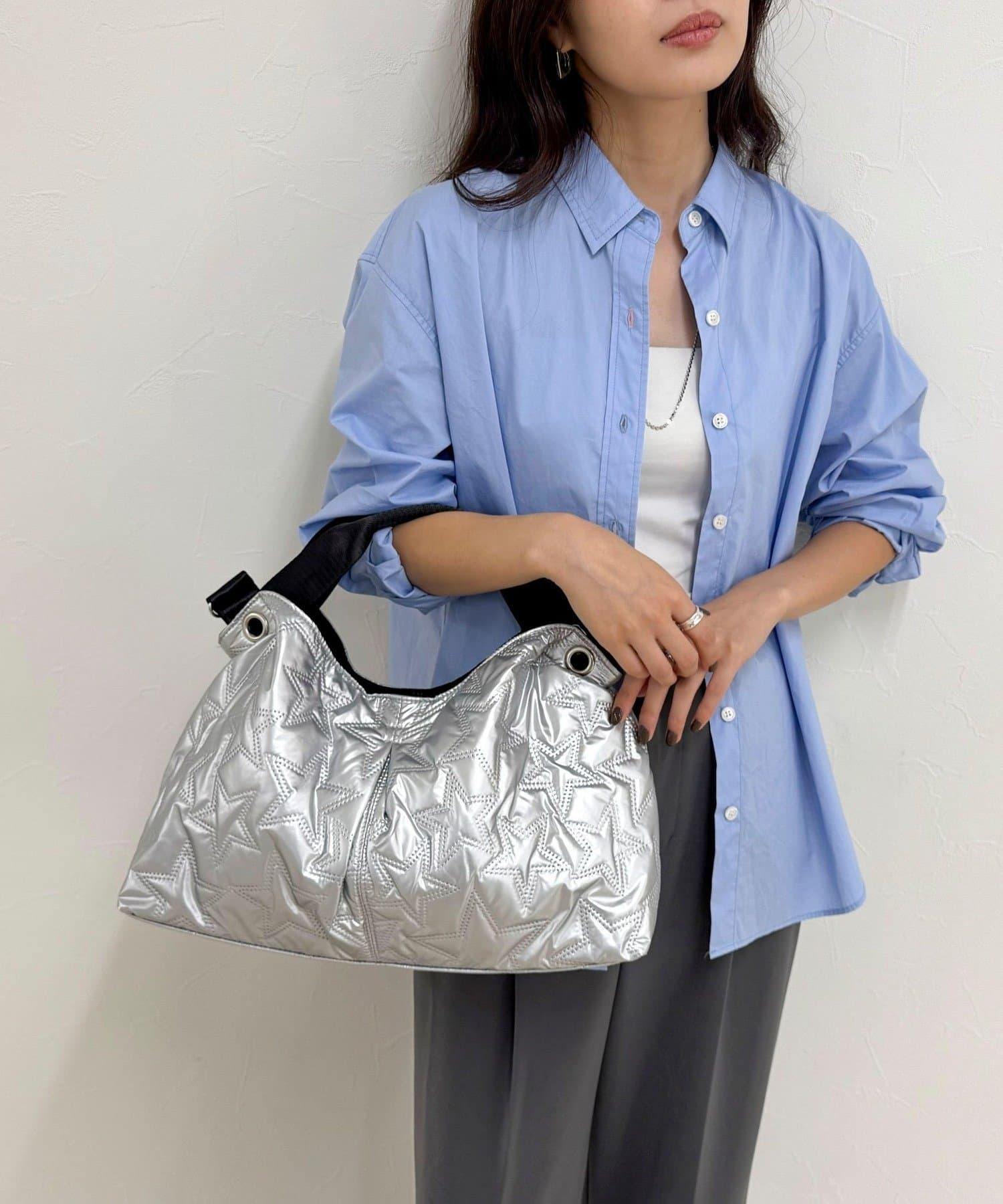 一款星形絎縫手提包,其金屬材質成為一個協調點。