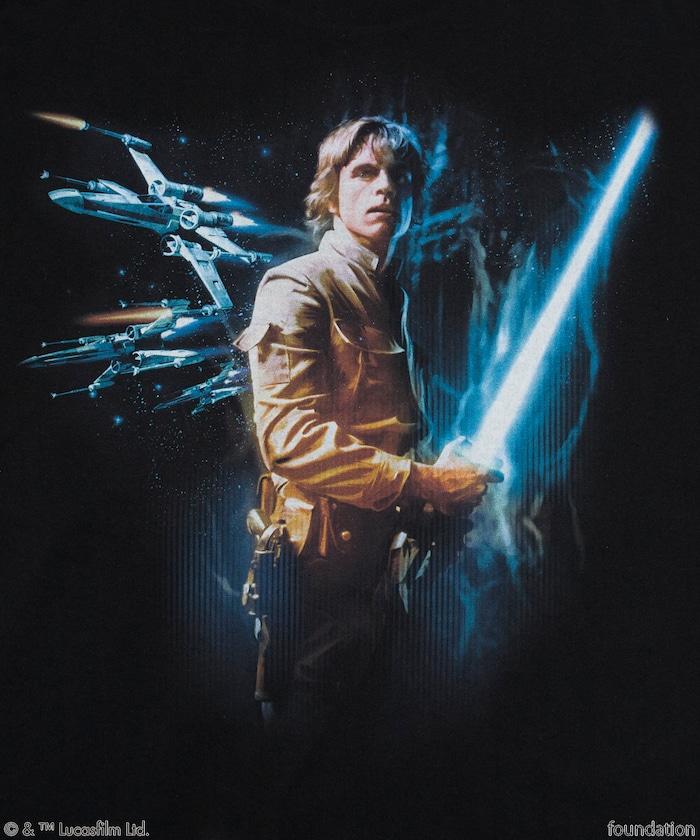 來自《星球大戰:帝國反擊戰(第 5 集)》,正面印有大幅日文關鍵視覺圖案。背面圖案是盧克-天行者(Luke Skywalker)和他的藍色光劍,以及他身後的 X 翼戰鬥機(X-Wing Starfighter)。