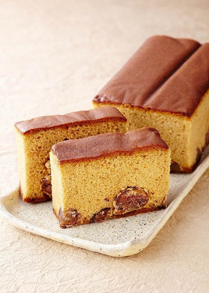 這種豪華的海綿蛋糕裡裝的是用蜂蜜浸泡過的栗子,其表皮很澀。麵糰是用紅糖製成的,並烘烤成溼潤的狀態。紅糖的溫和香氣與栗子的溫和味道相結合,使海綿蛋糕具有溫和的味道,每個人都會喜歡。