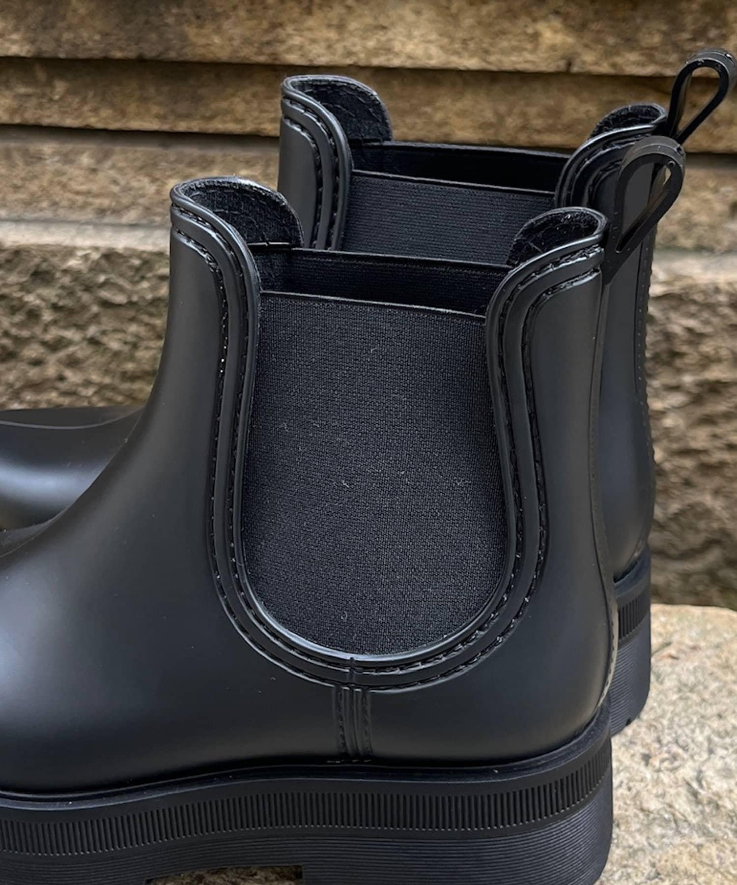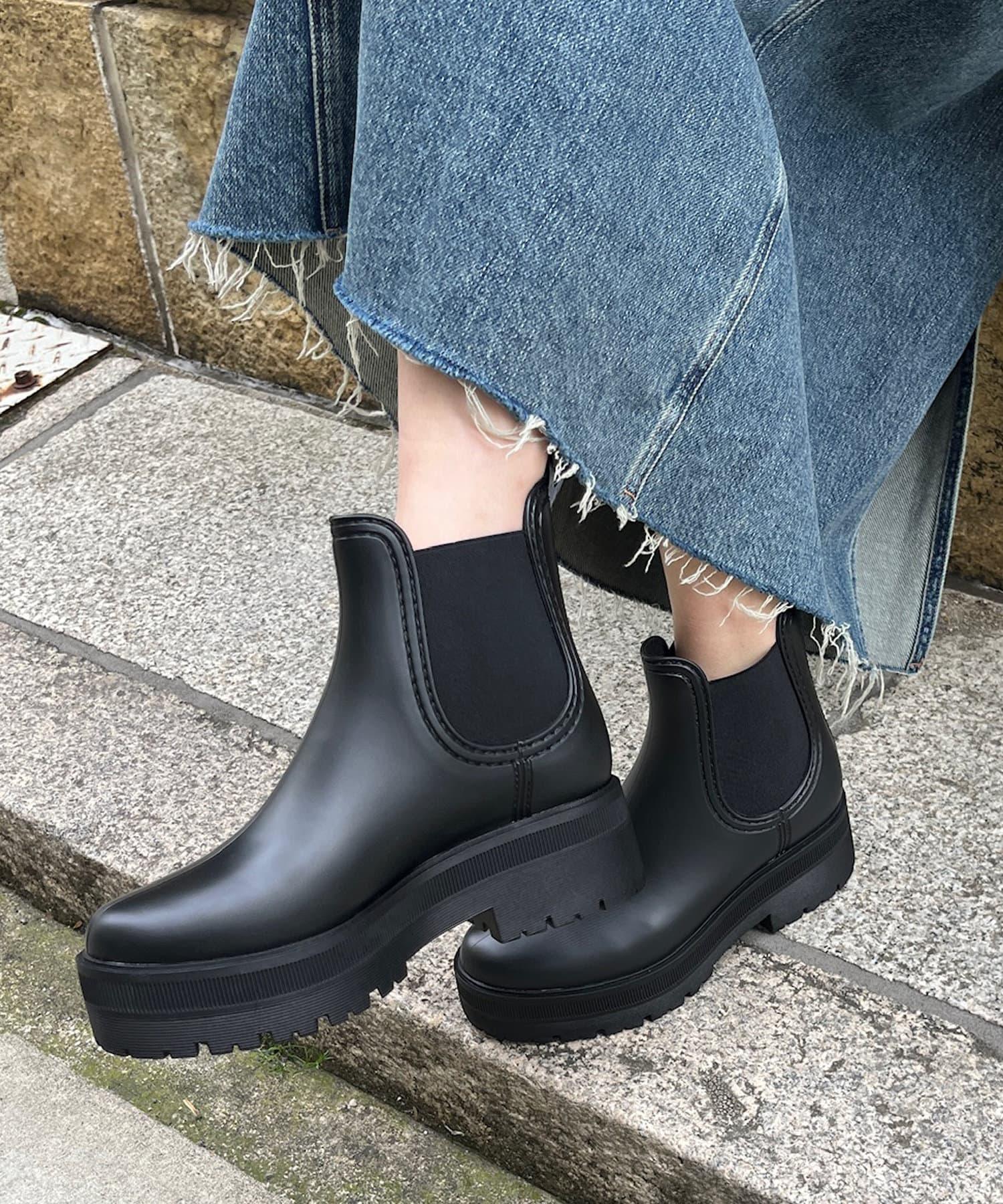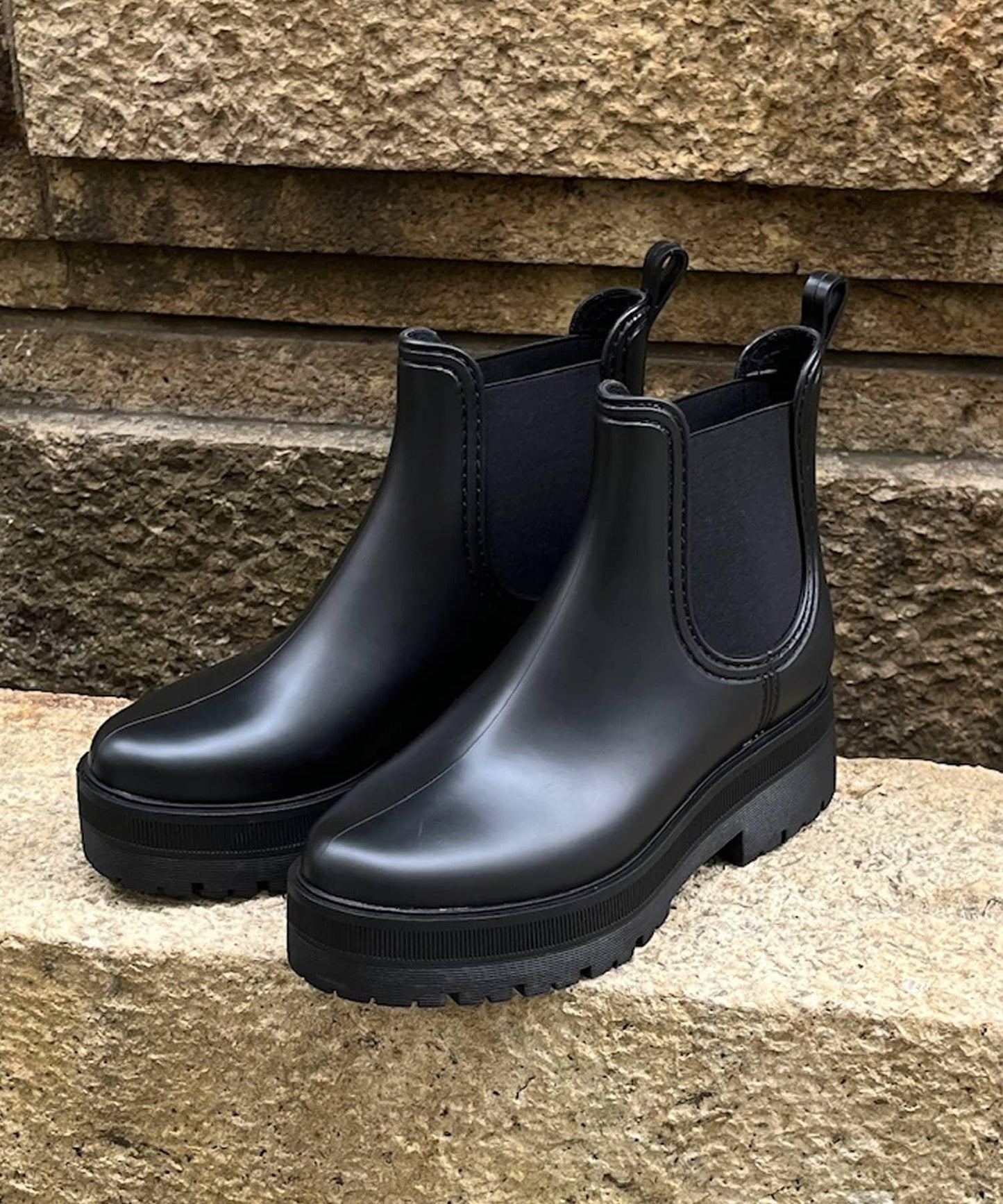 雨靴的設計很特別,厚底鞋底的轉彎處為你的搭配增添了亮點。