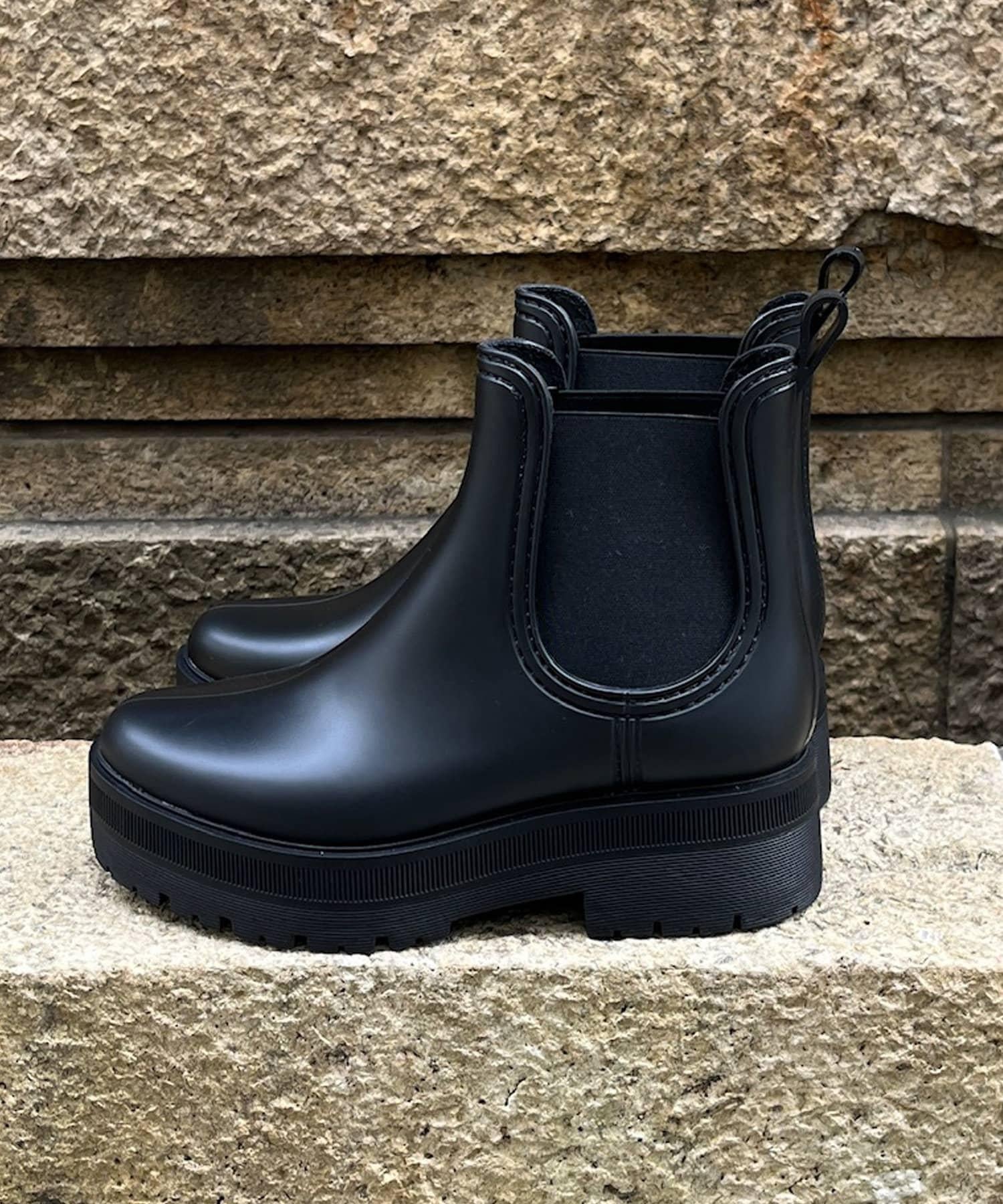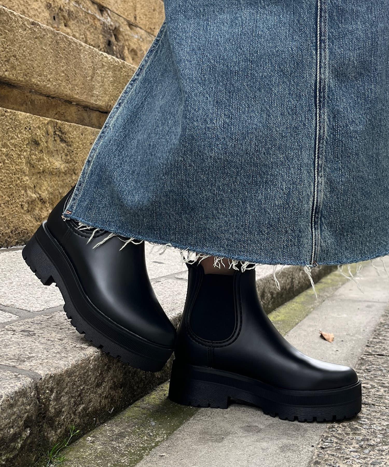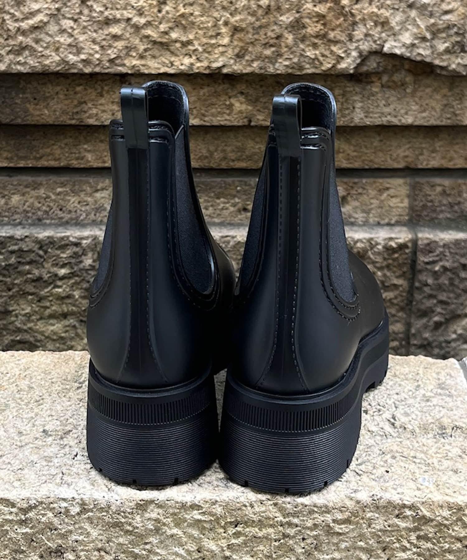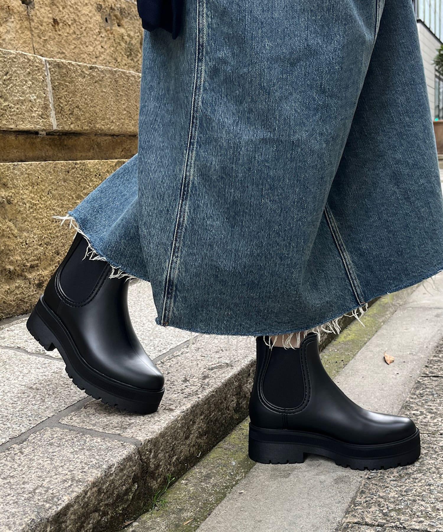 雨靴的設計很特別,厚底鞋底的轉彎處為你的搭配增添了亮點。