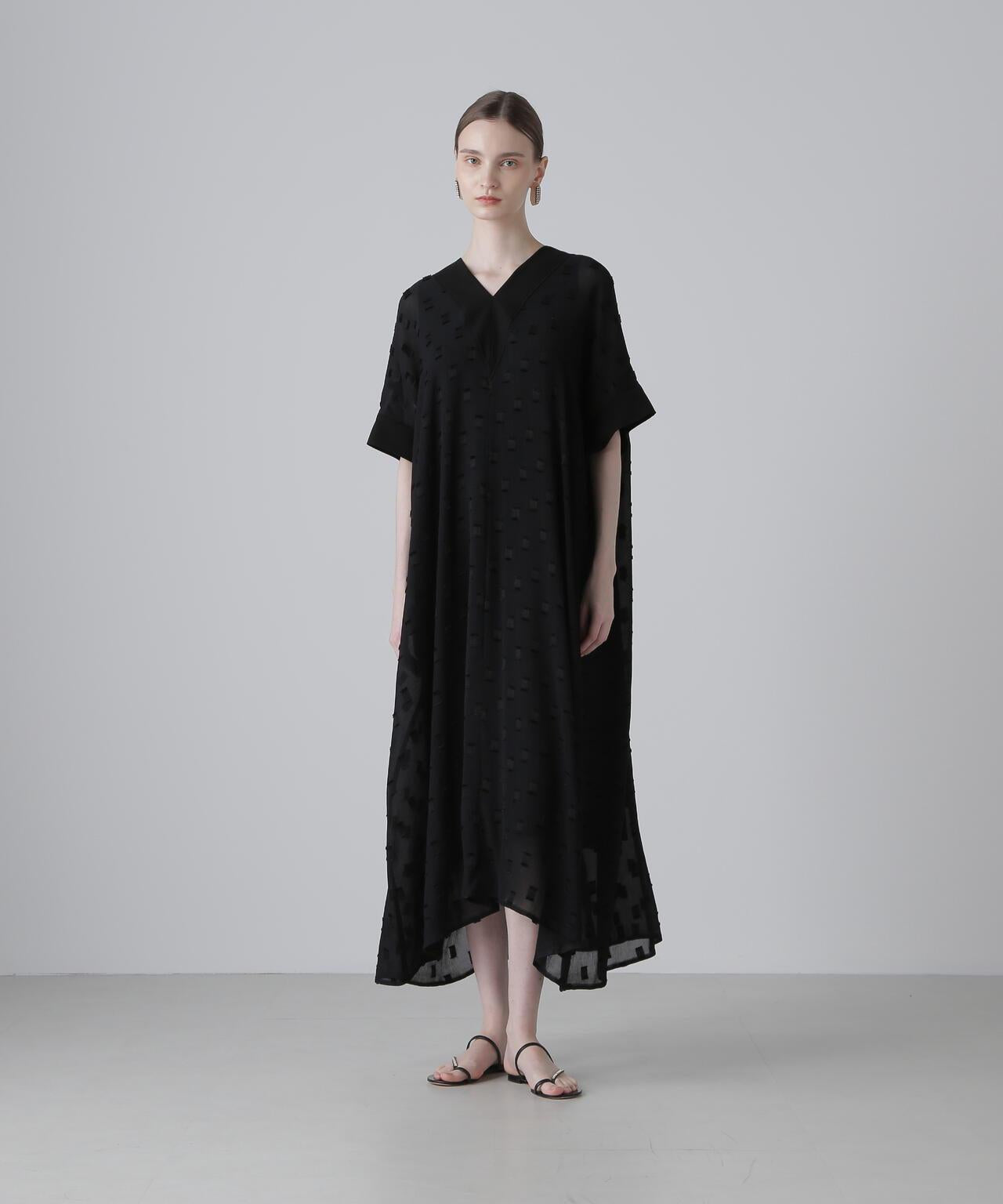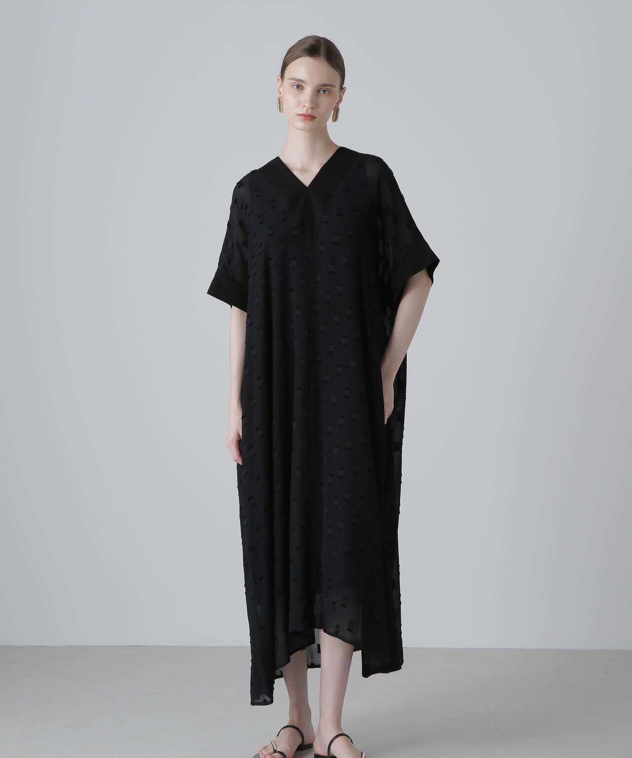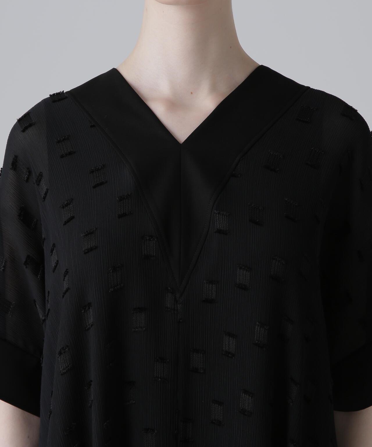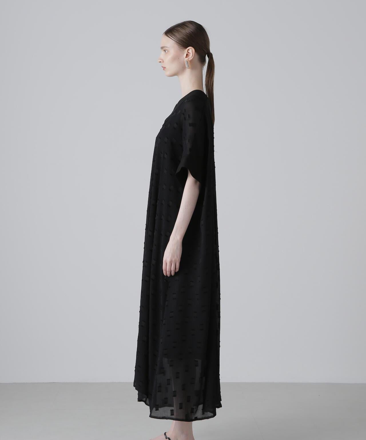 方形圖案提花面料連衣裙這款連衣裙採用優質提花面料製成,非常適合初秋季節穿著。V 領和寬鬆廓形,頸部和軛部採用單獨的不透明材料製成。後軛下大膽的褶襉設計更突出了設計感。這種提花面料未經加工,但由於紗線捻度和收縮率的不同,經線上會出現像柳條一樣的褶皺,用閃亮的聚酯紗線表現出重點剪裁的圖案。請注意,這種面料較薄,比較脆弱,請注意防滑和防撕裂。