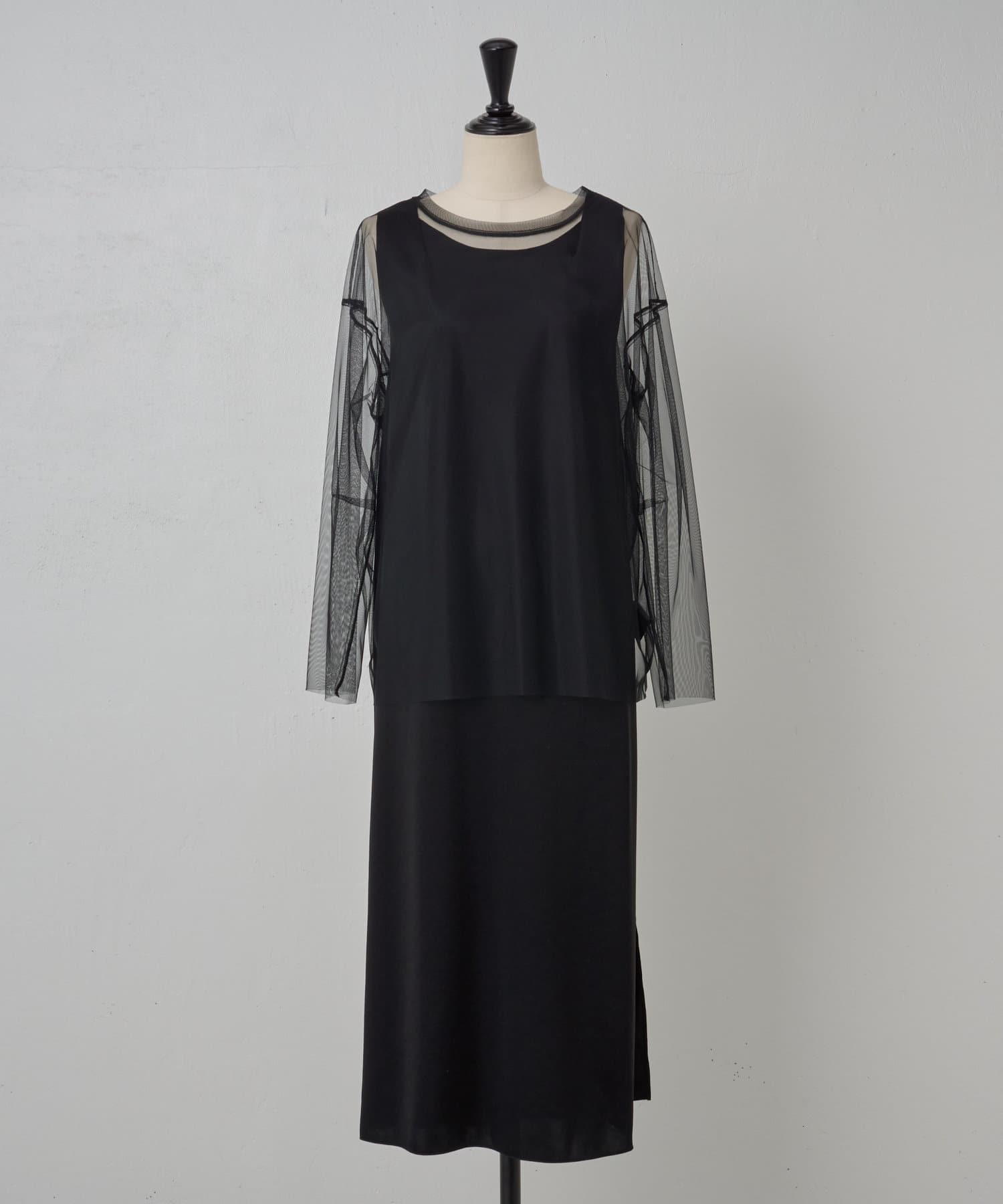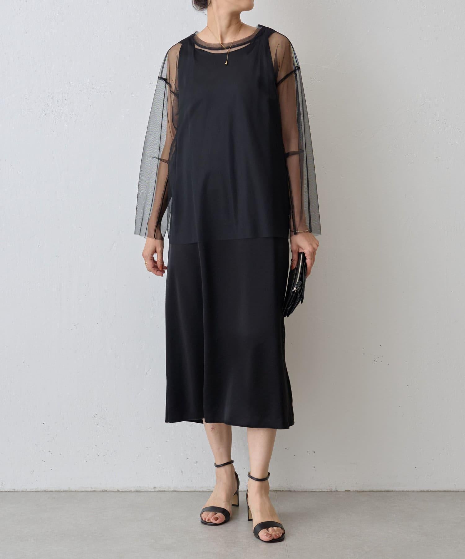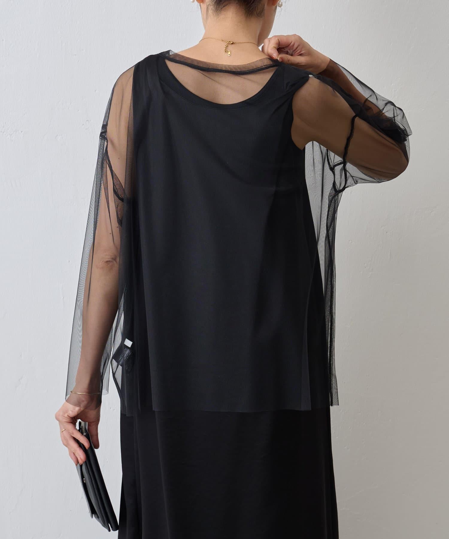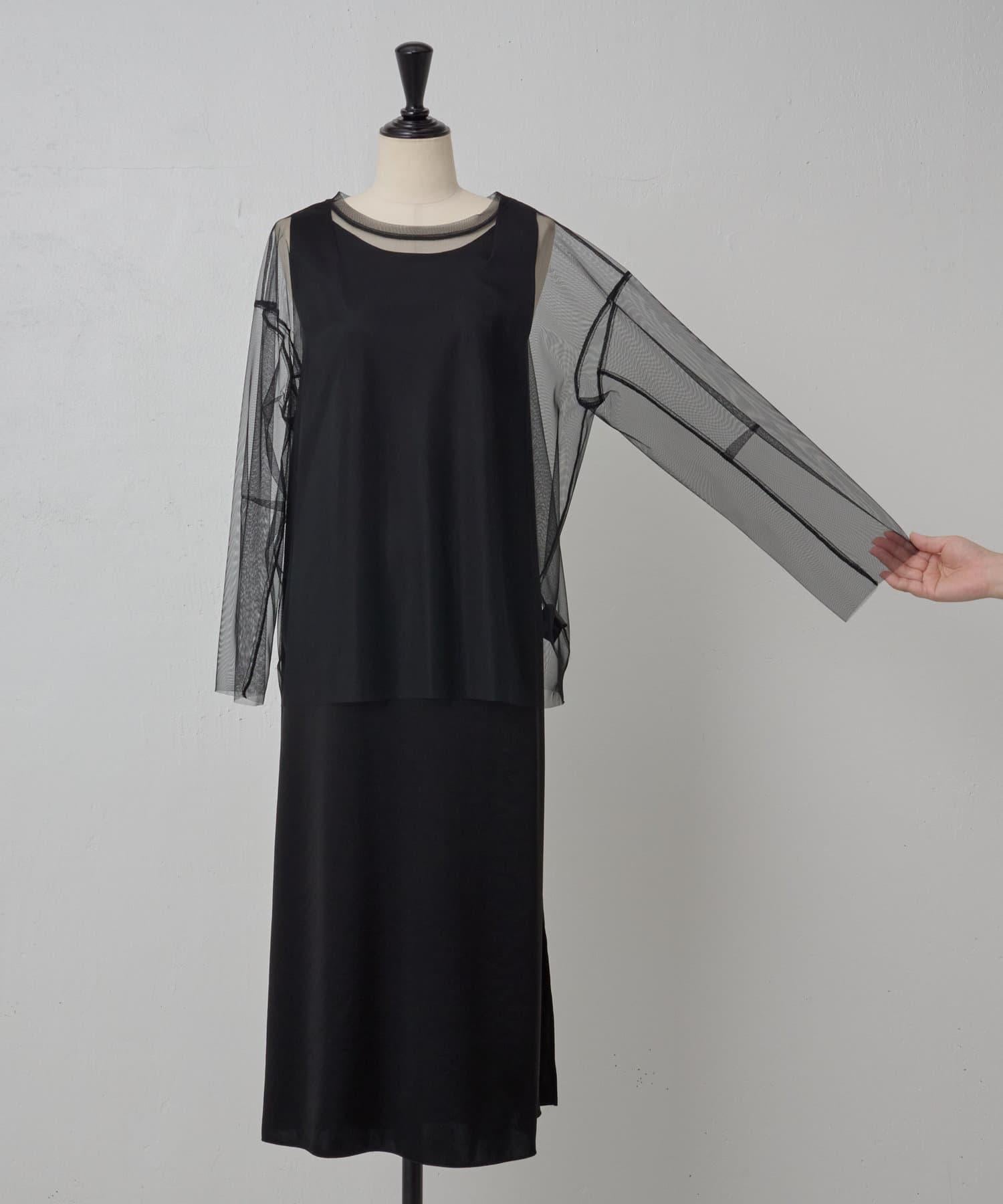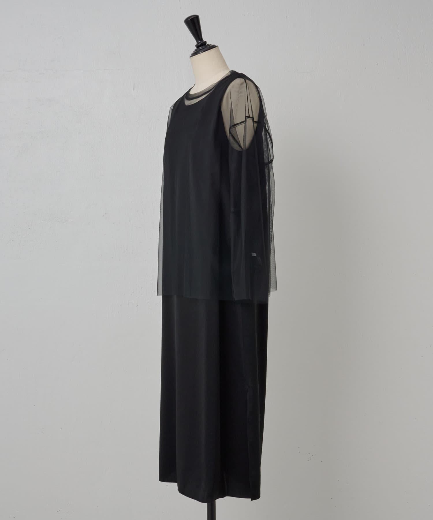 透明薄紗罩衫和無袖連身裙套裝,具有墜落感。