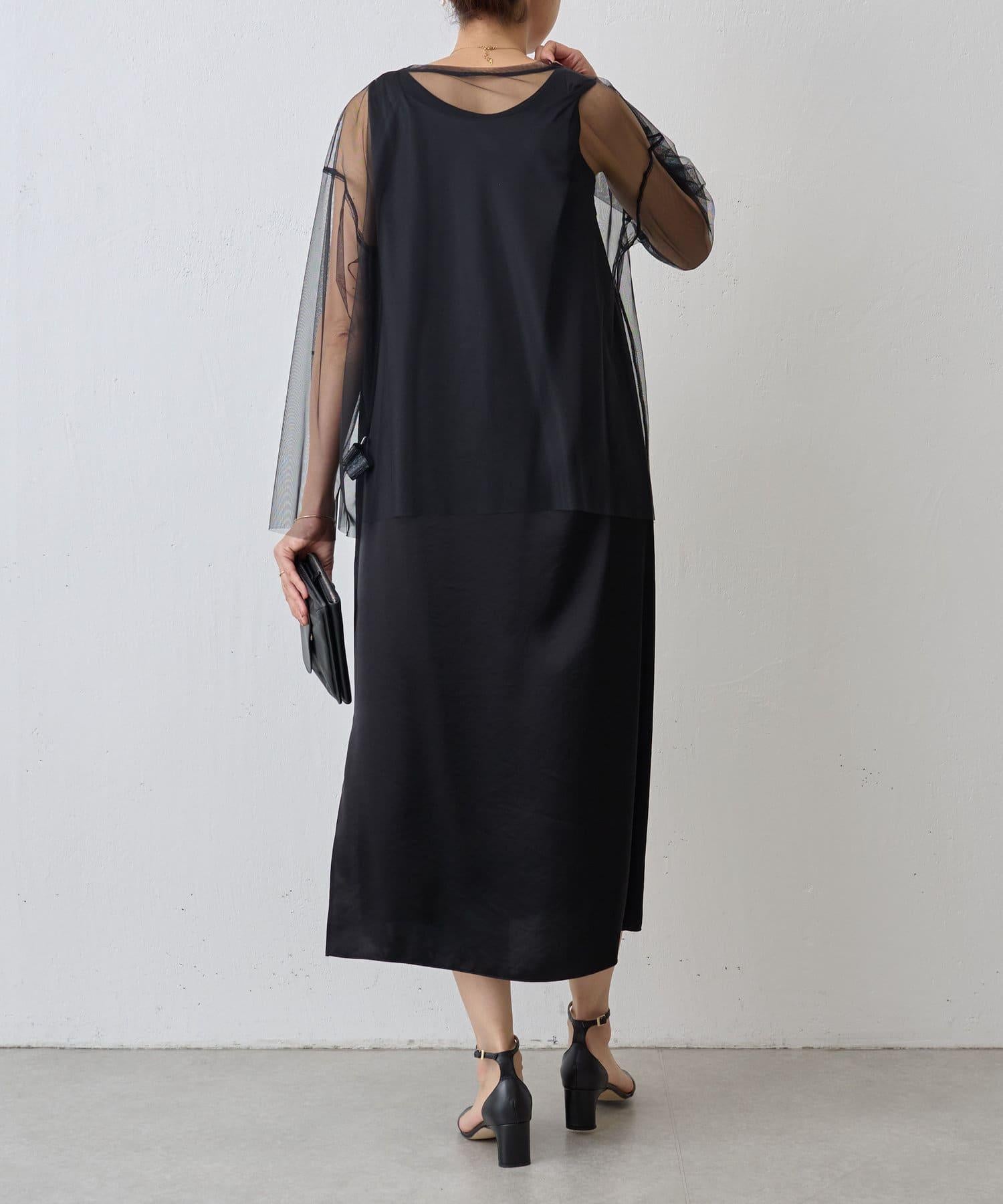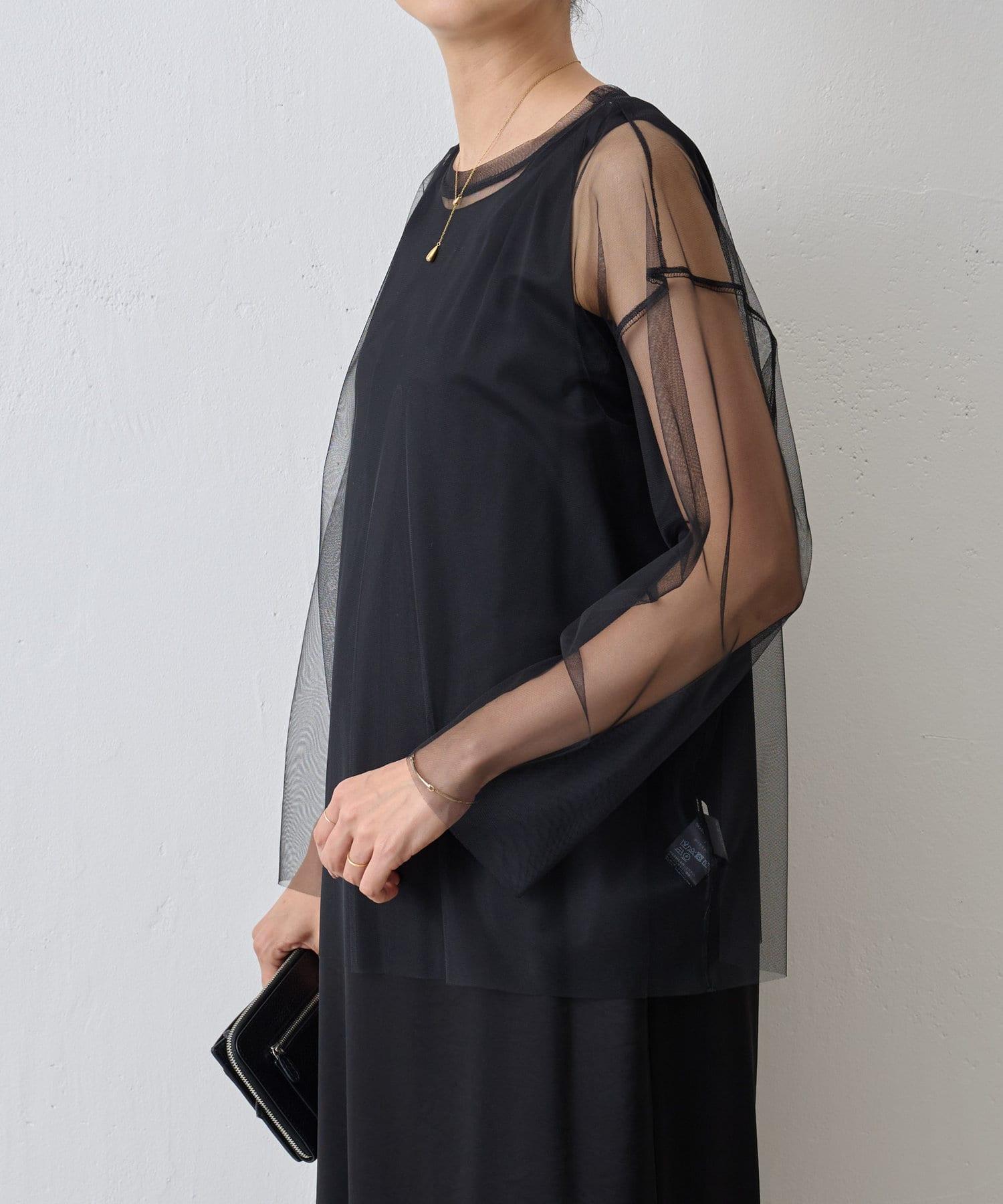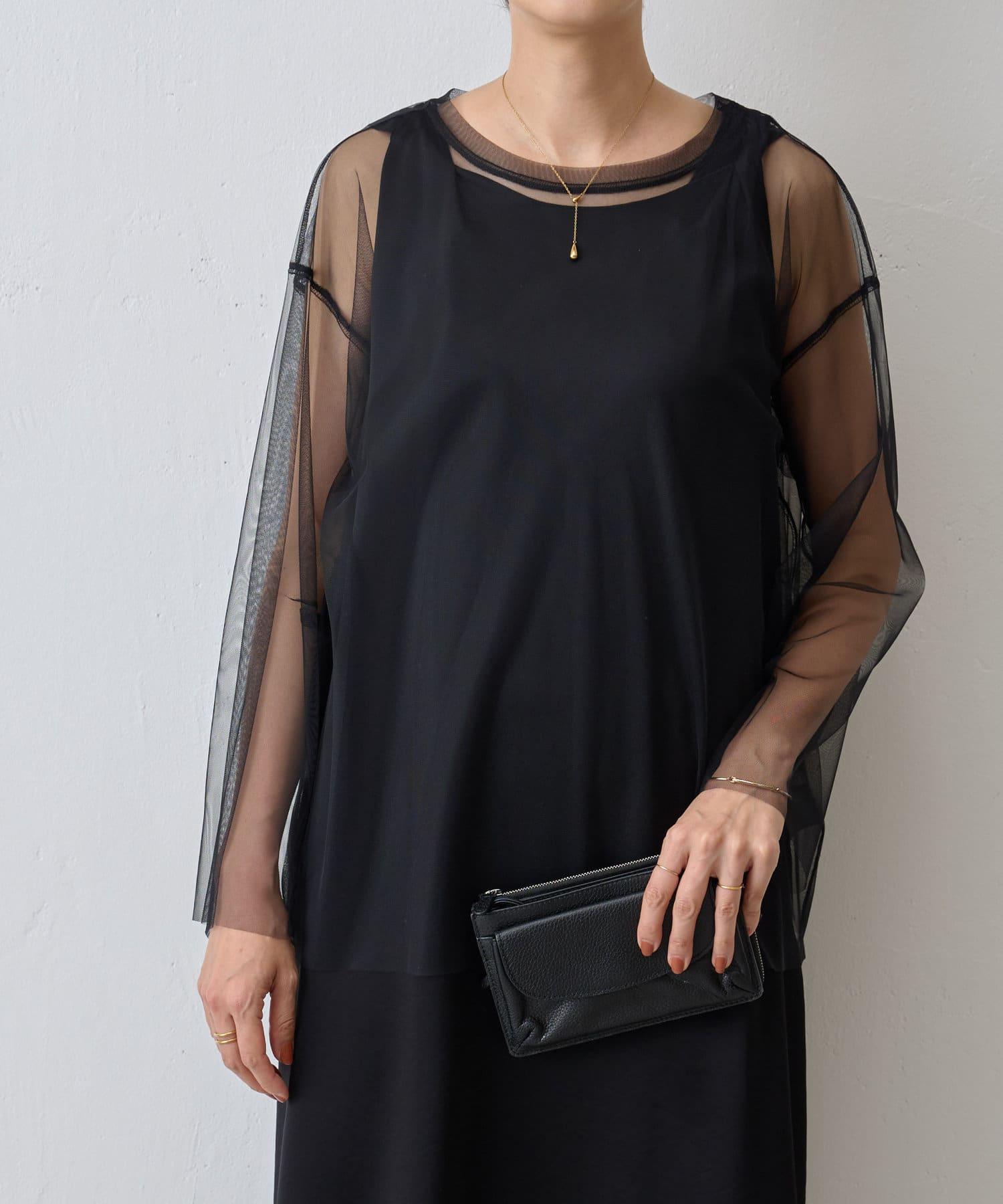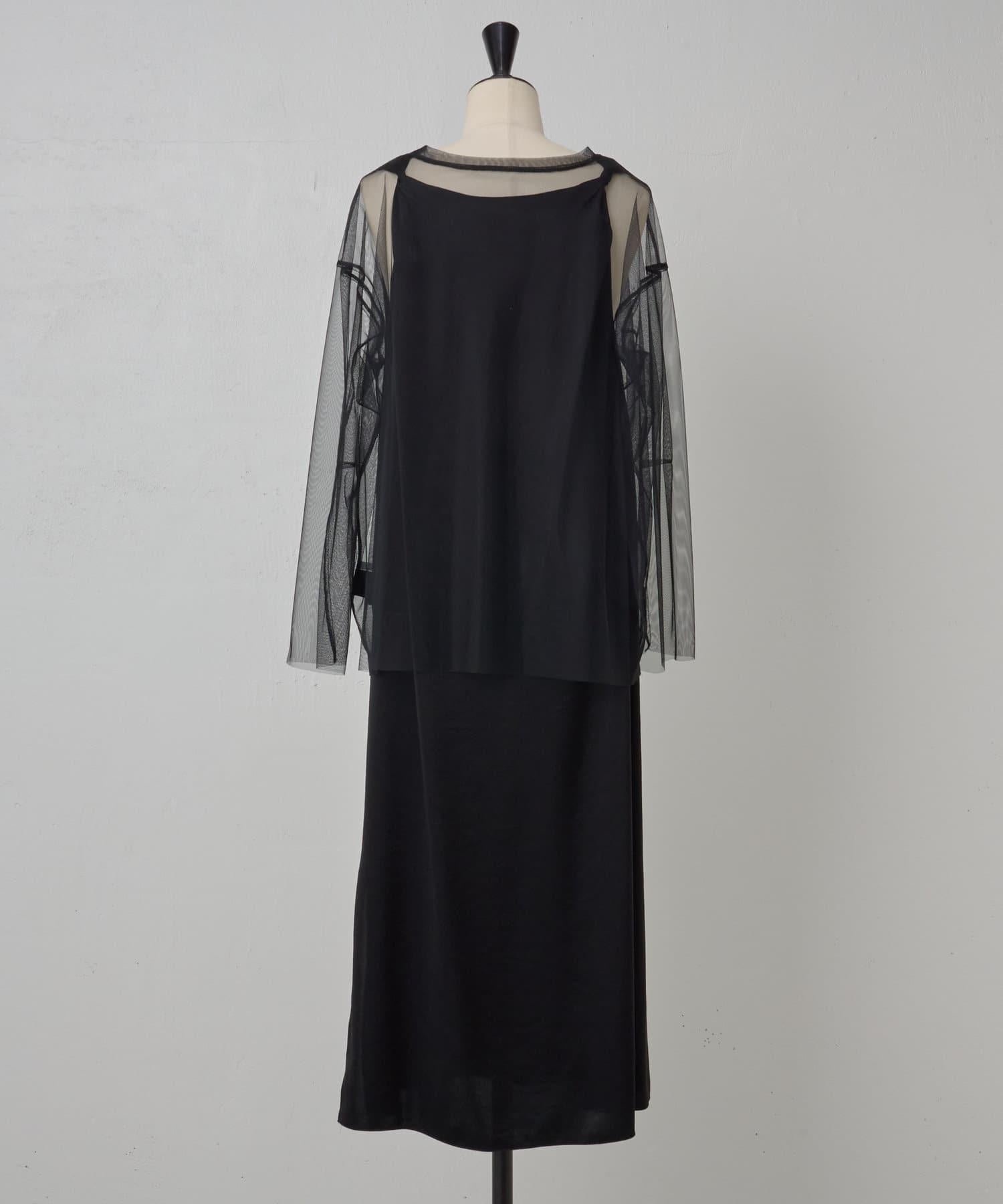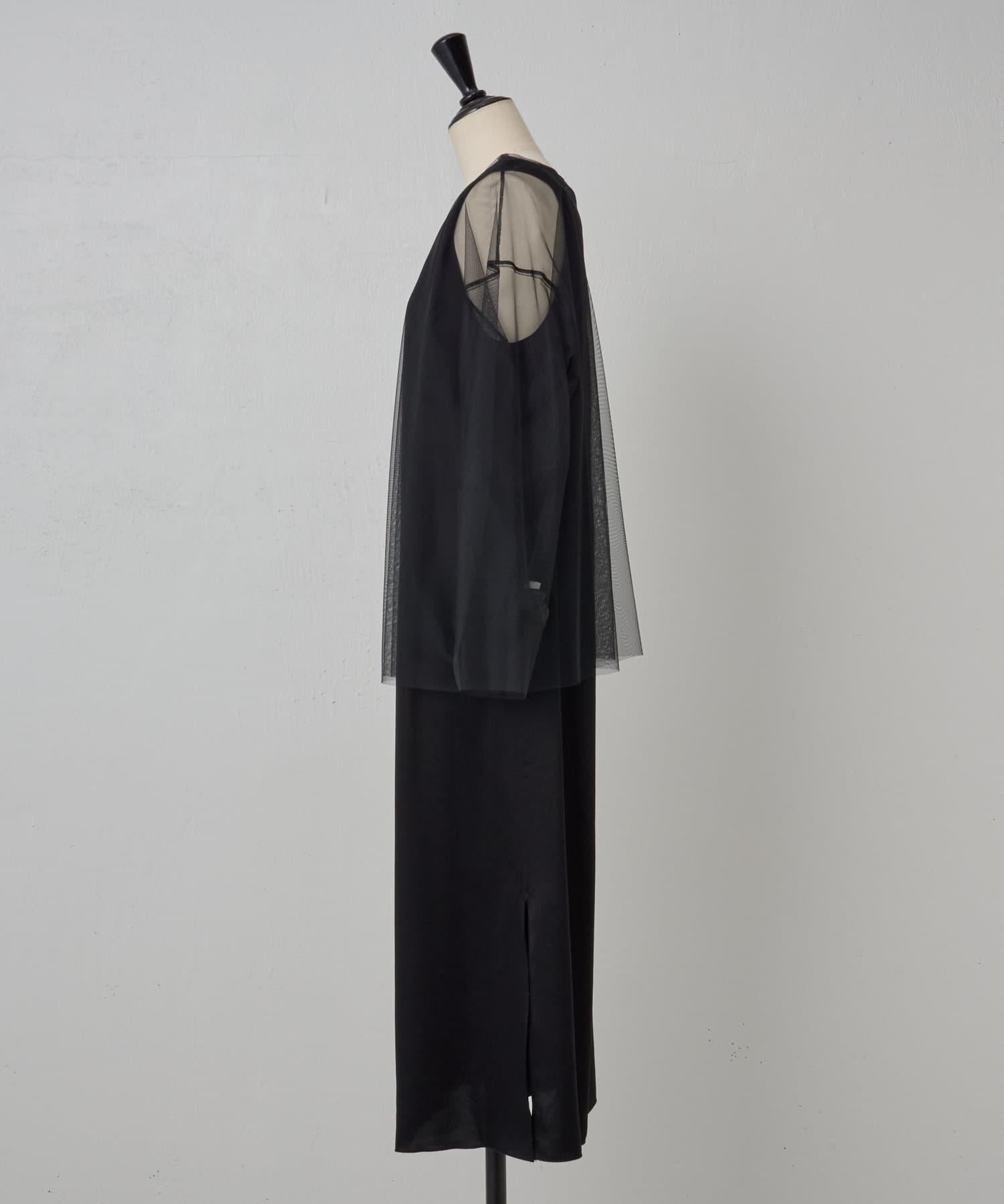 透明薄紗罩衫和無袖連身裙套裝,具有墜落感。