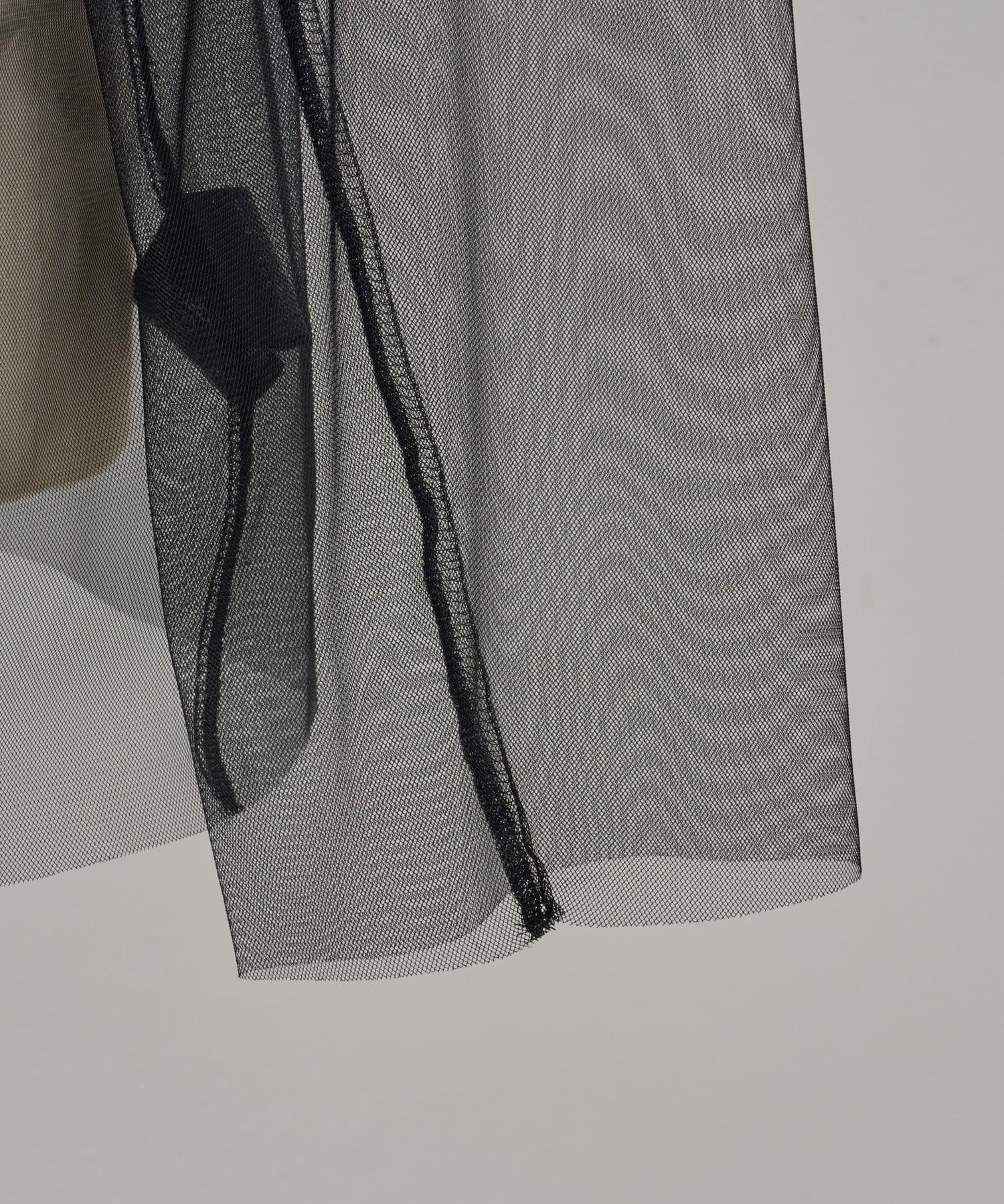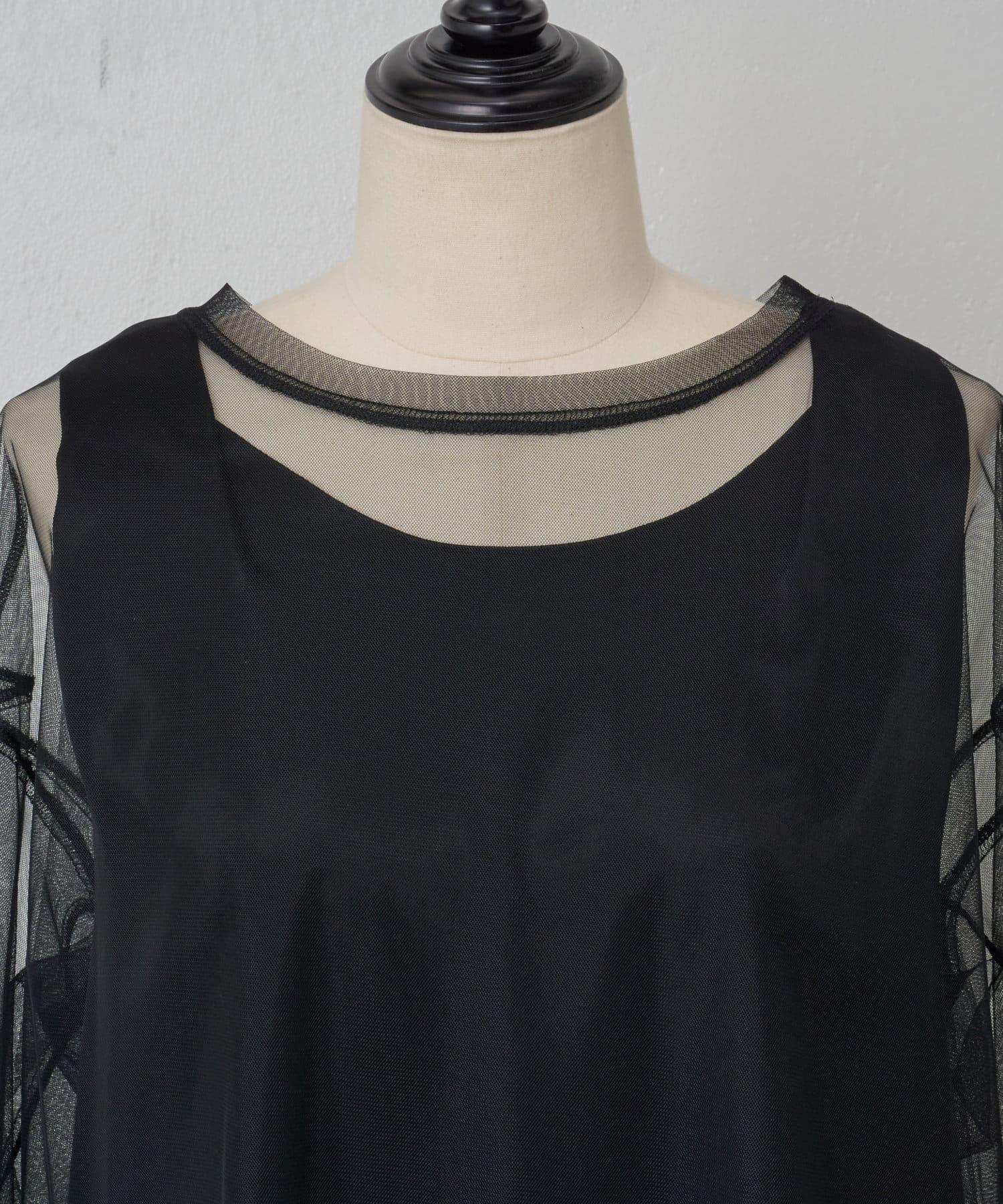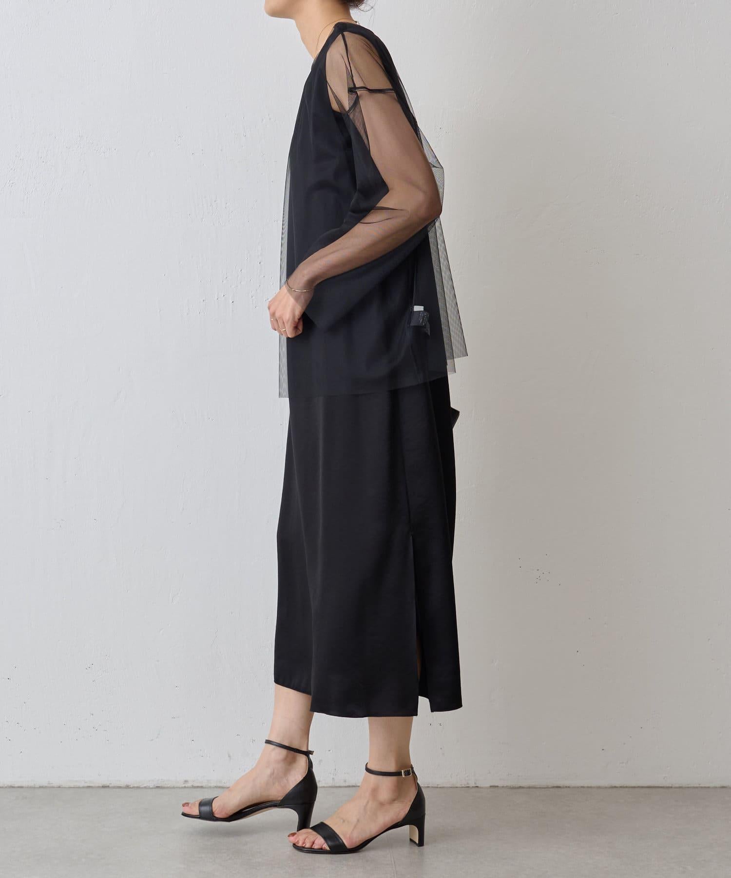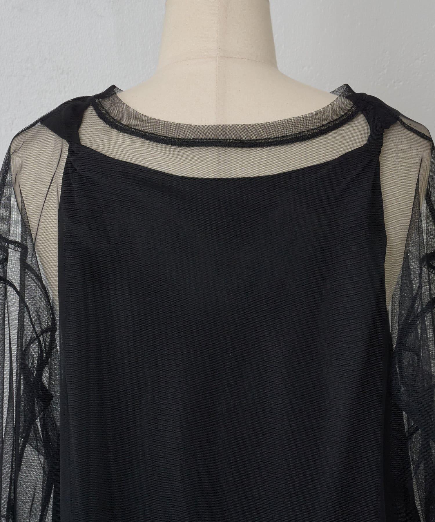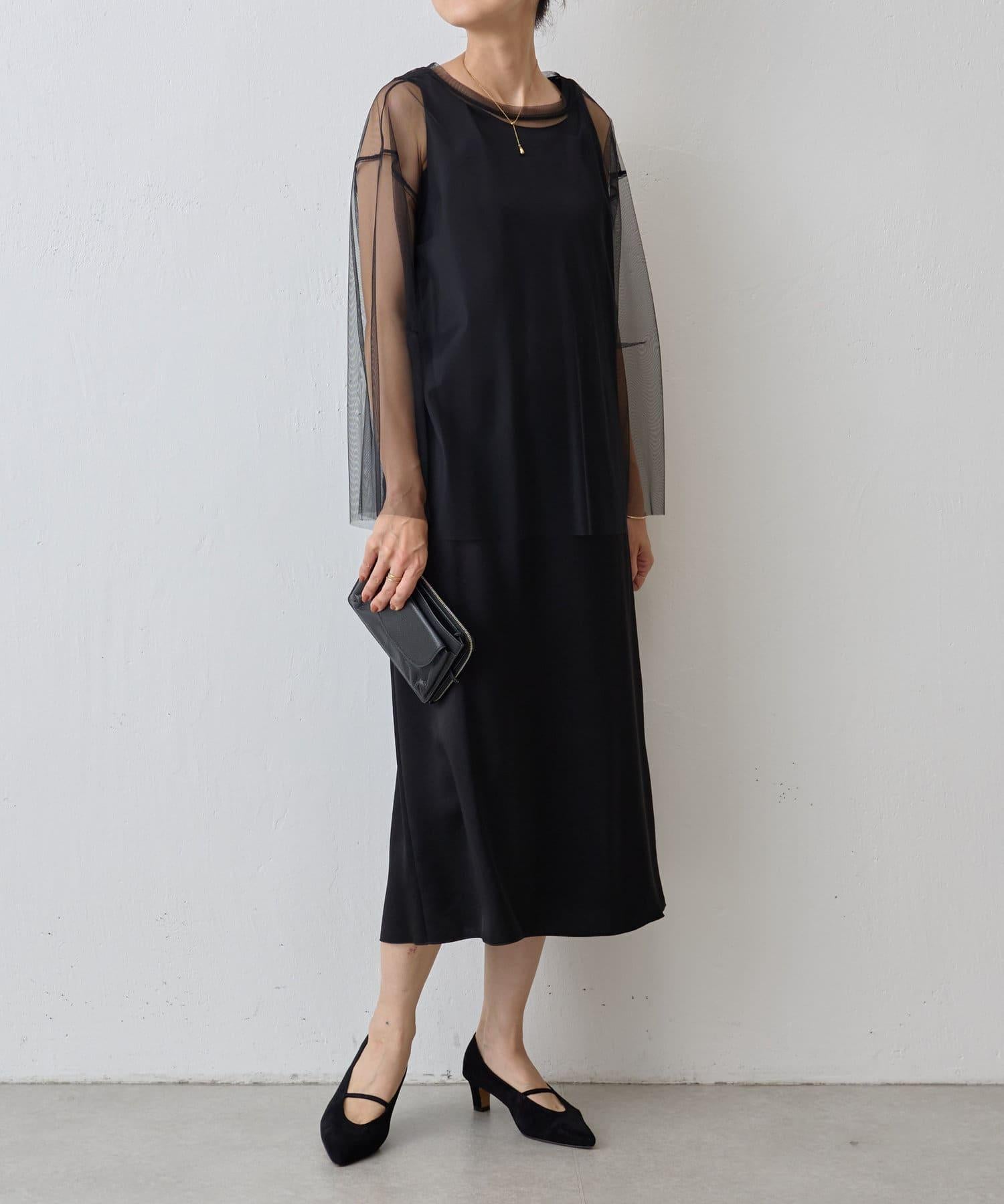 透明薄紗罩衫和無袖連身裙套裝,具有墜落感。