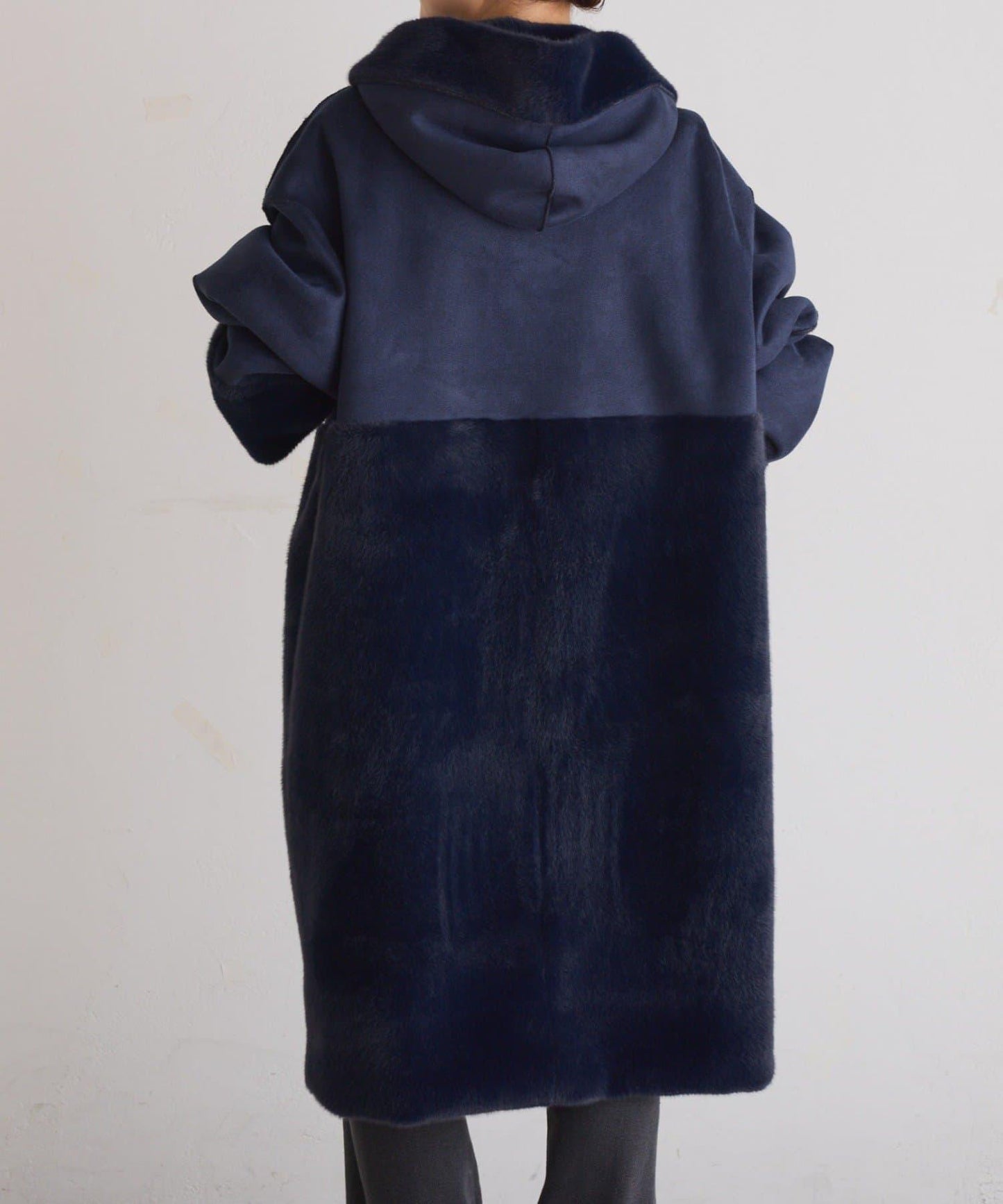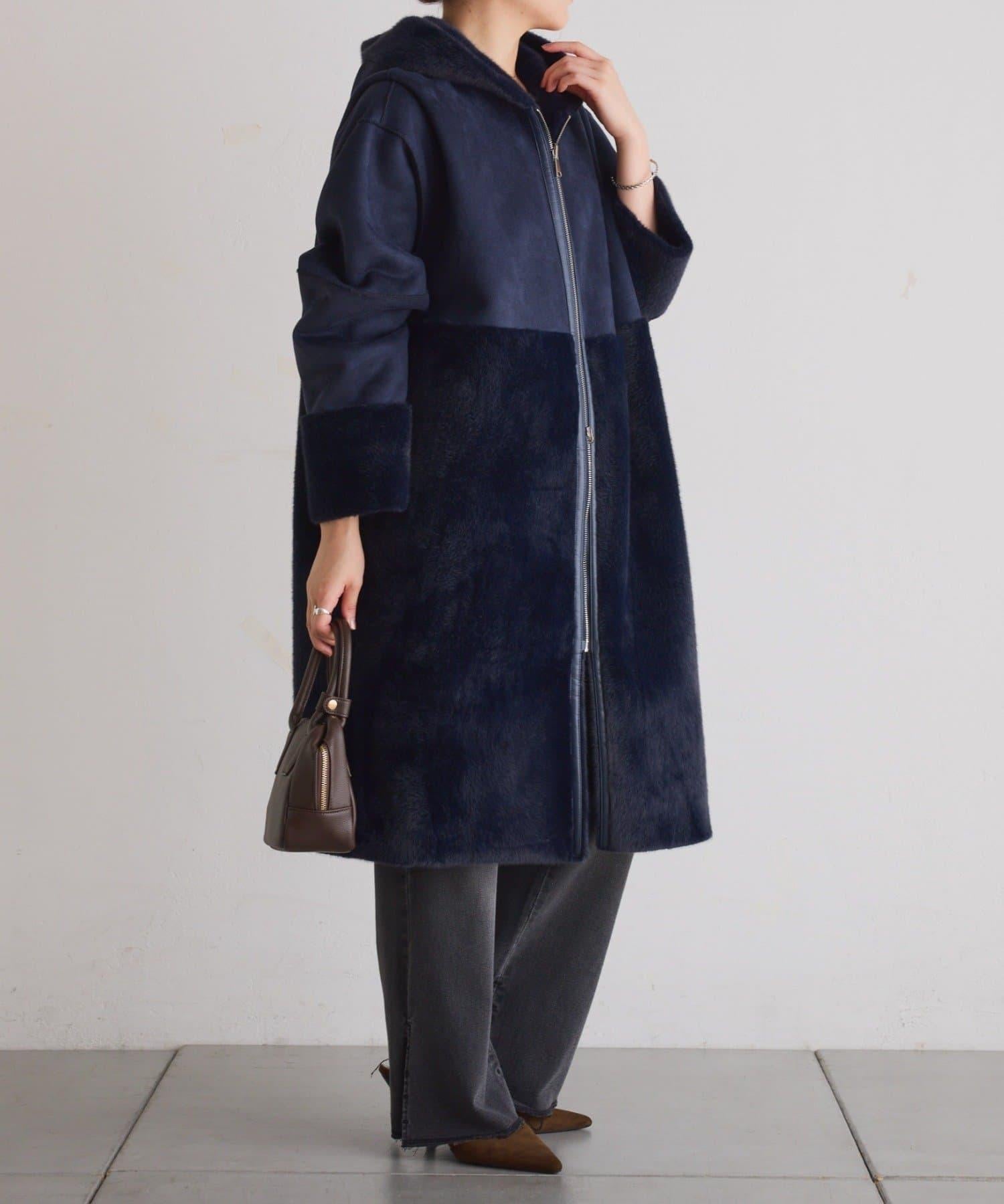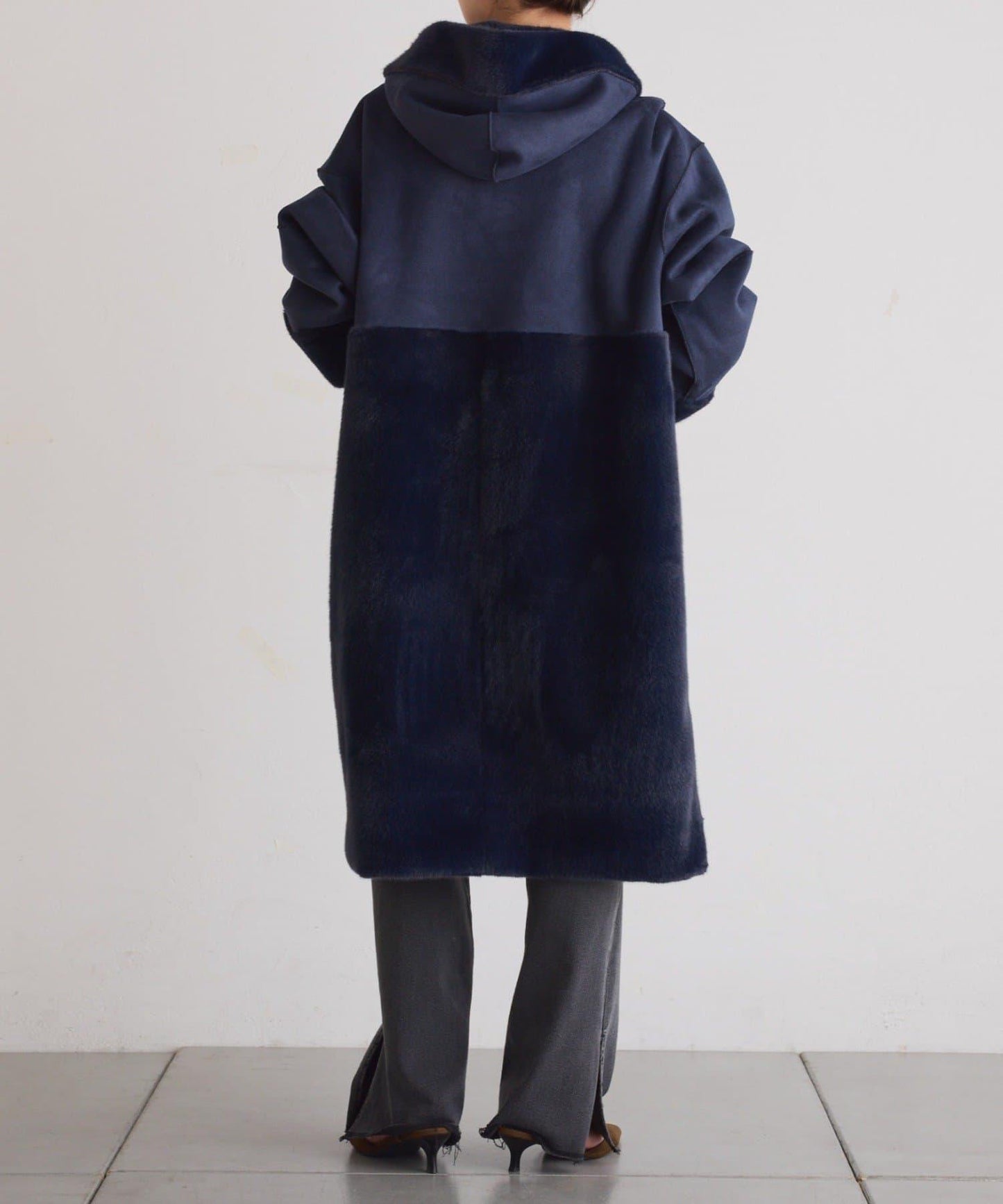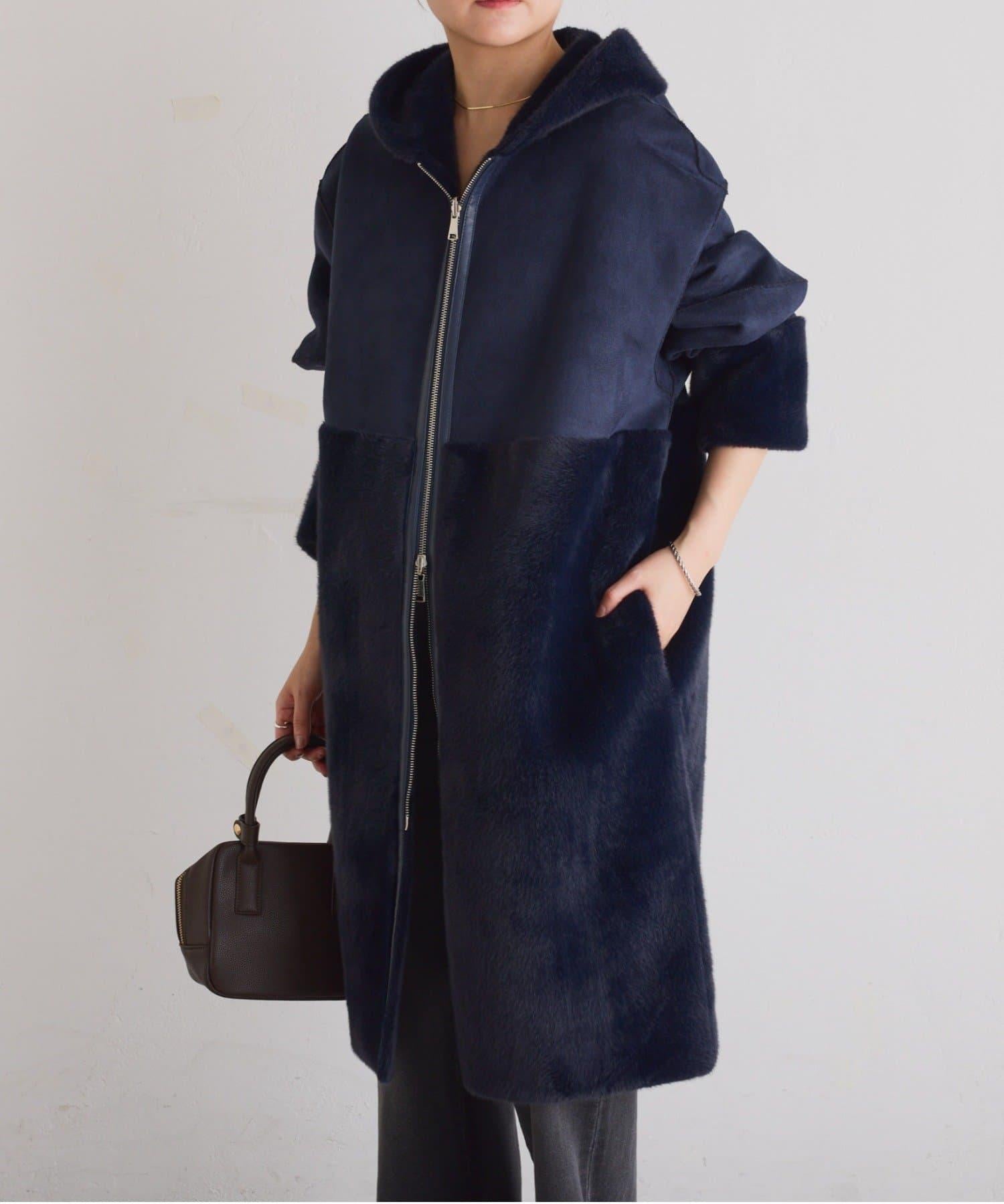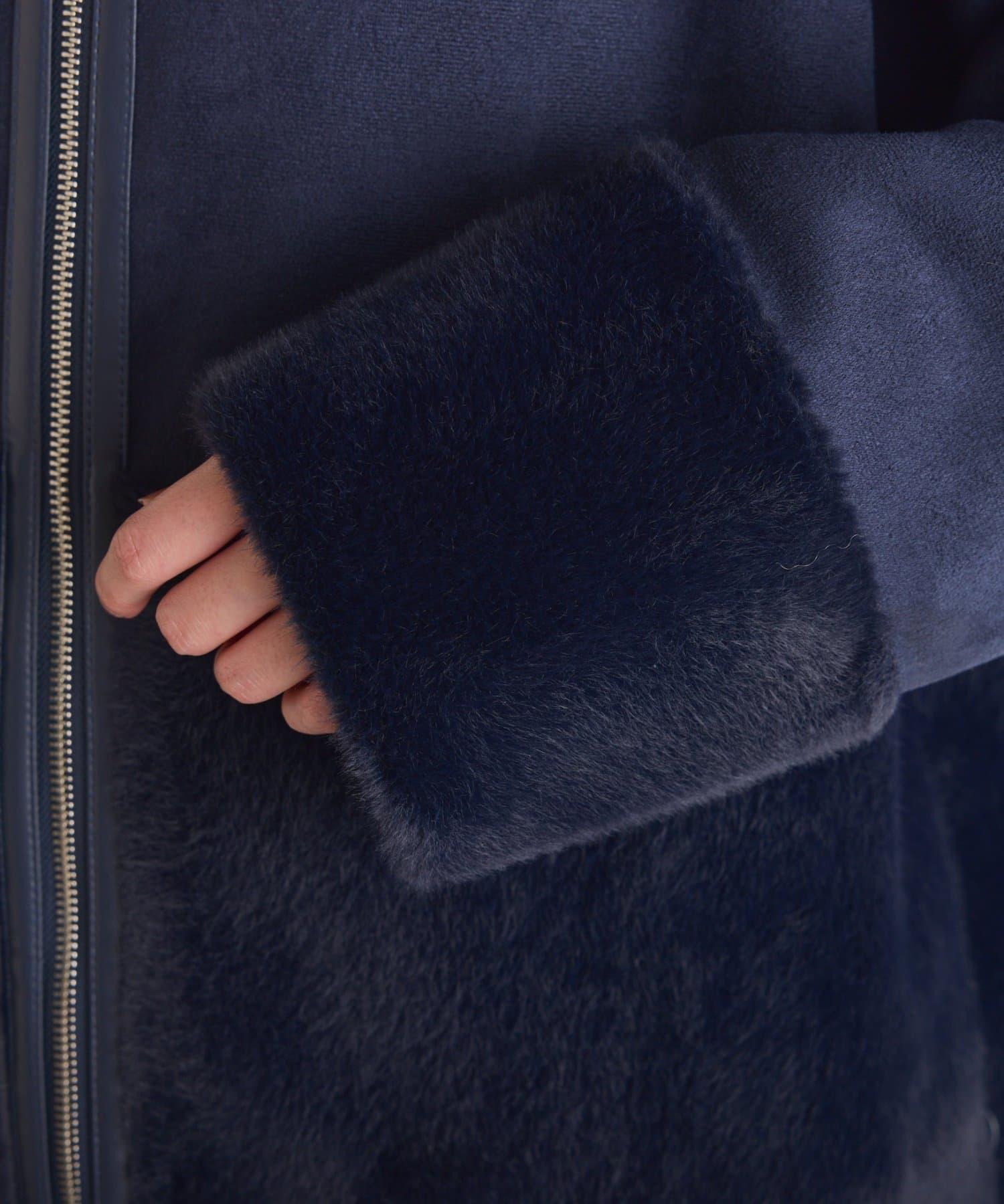 人造麂皮絨和人造皮草的組合,全身可以穿雙面人造皮草的長款大衣。