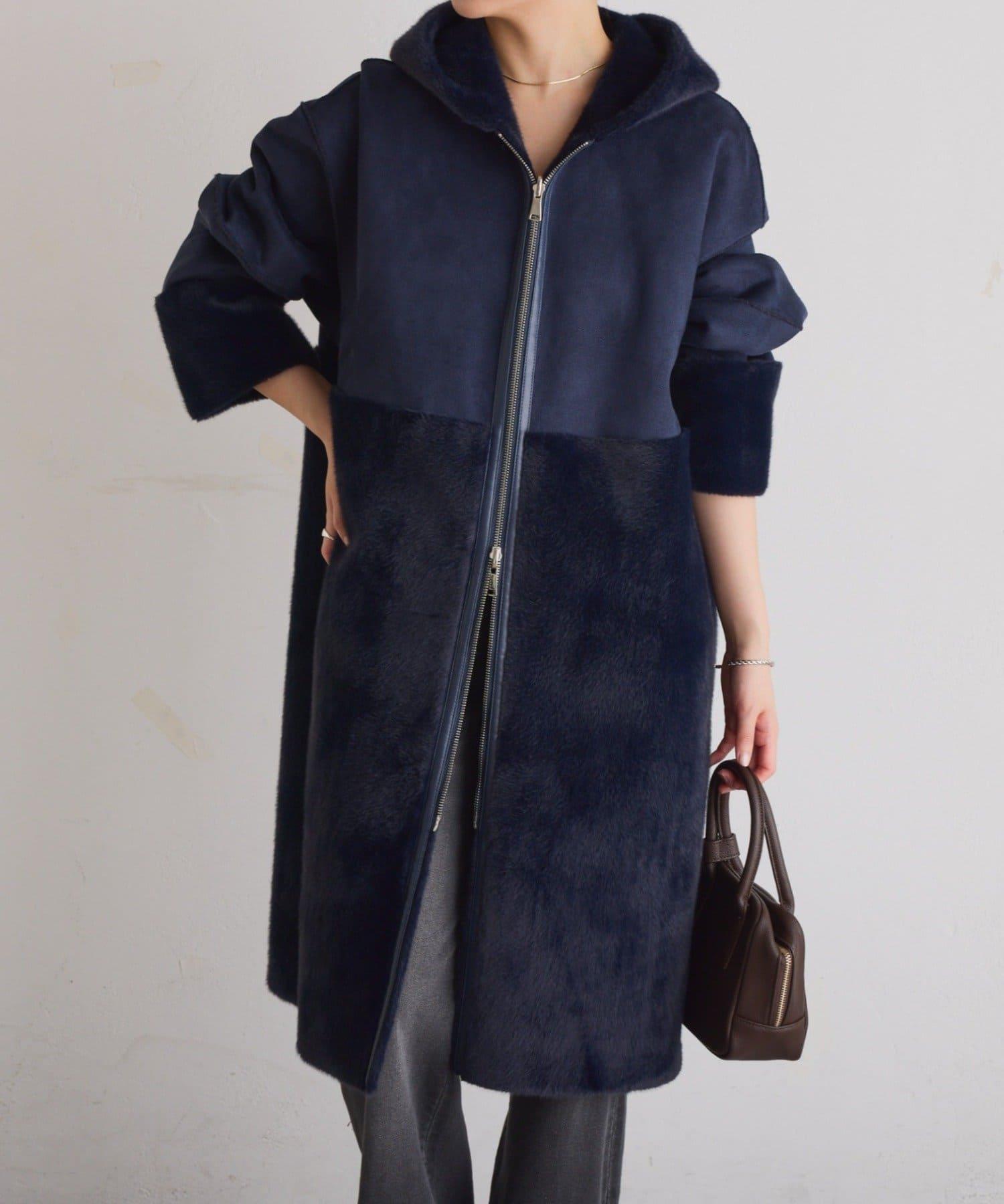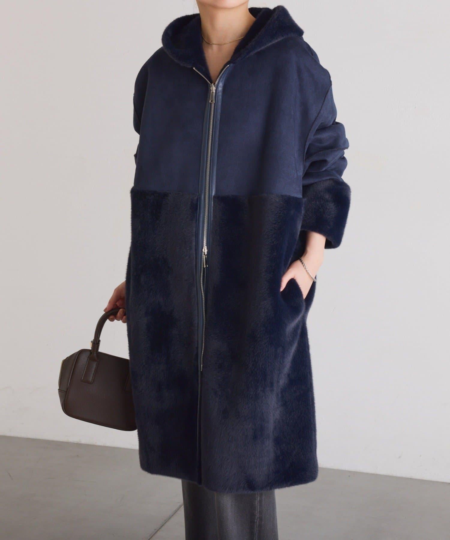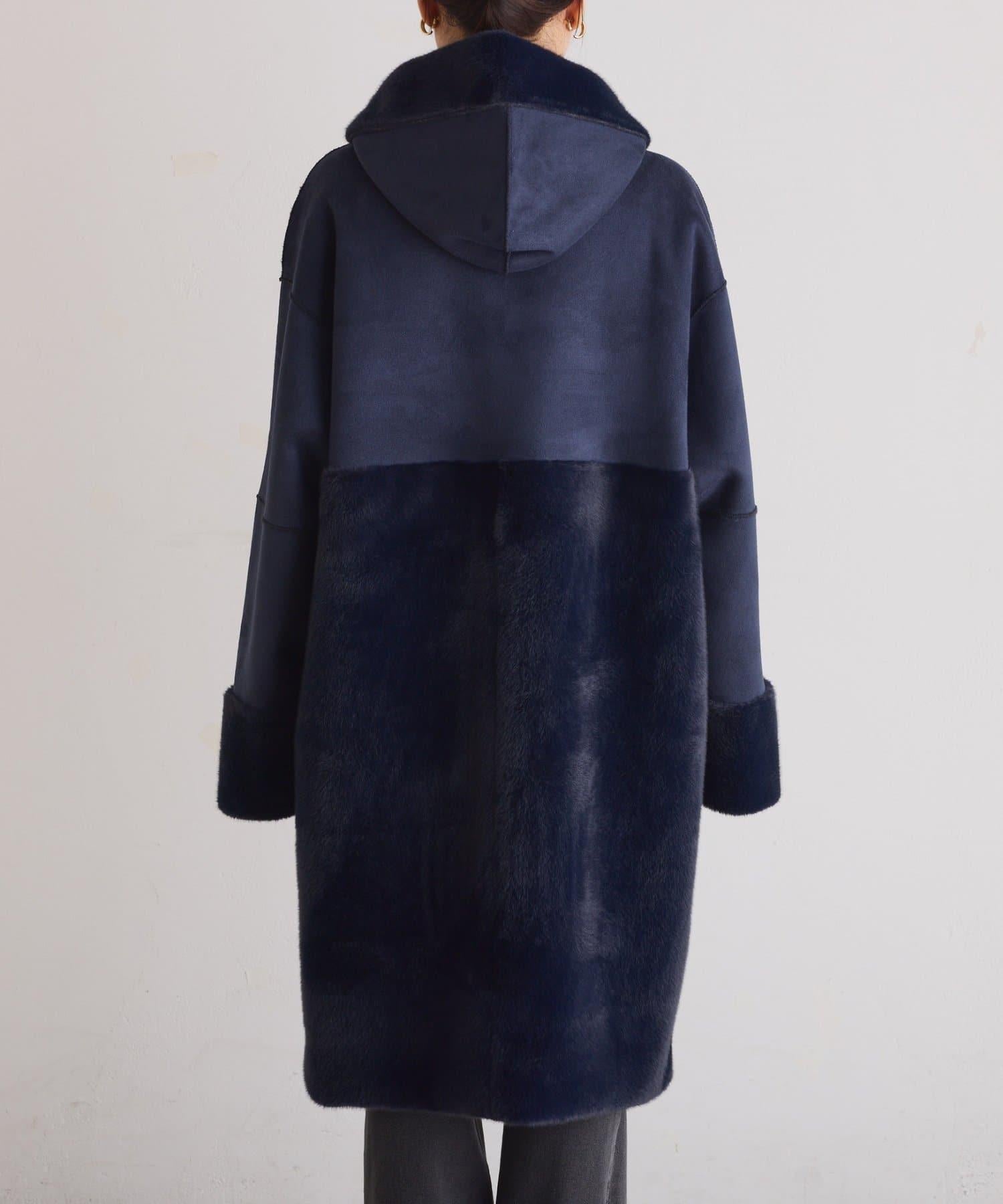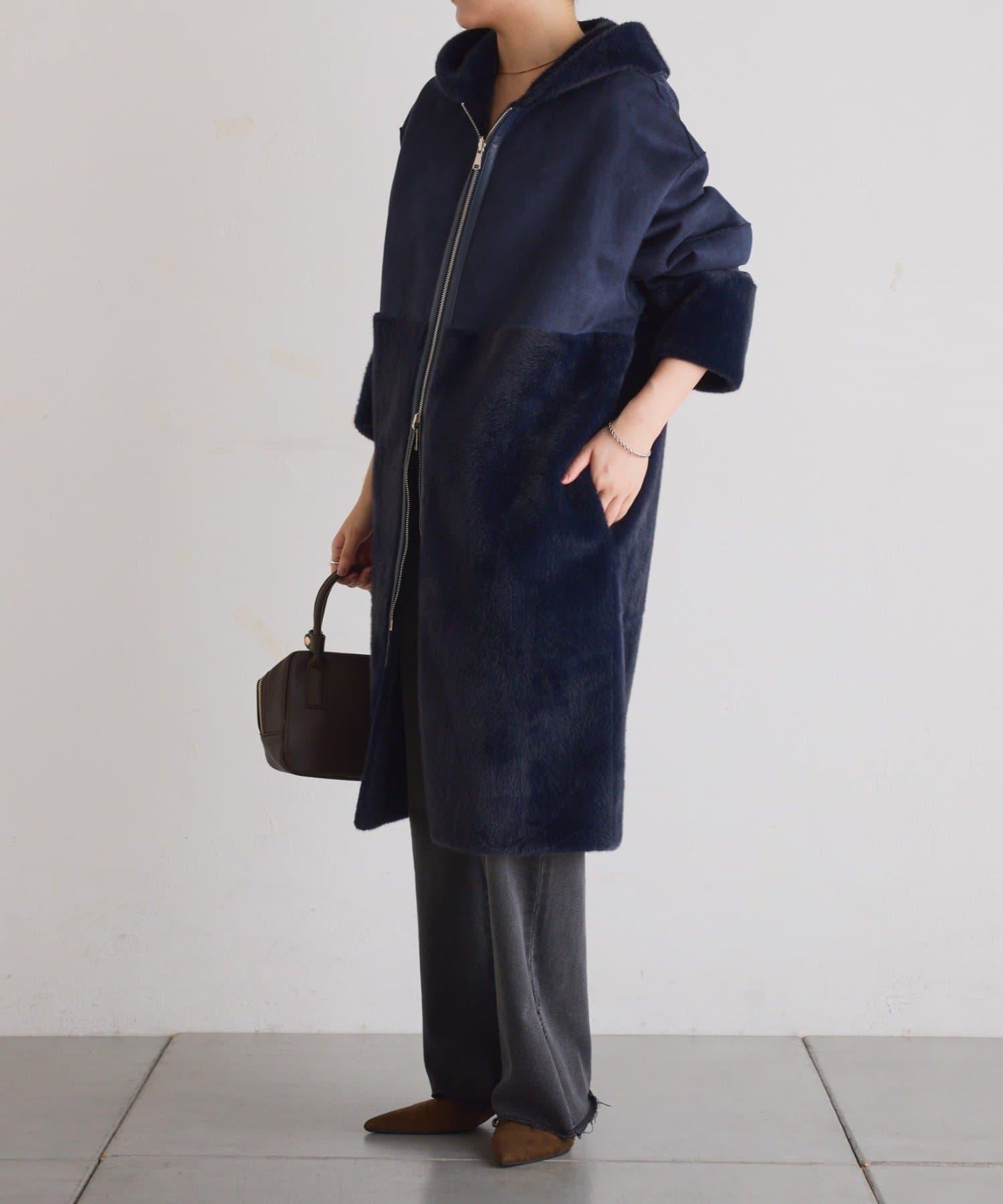 人造麂皮絨和人造皮草的組合,全身可以穿雙面人造皮草的長款大衣。