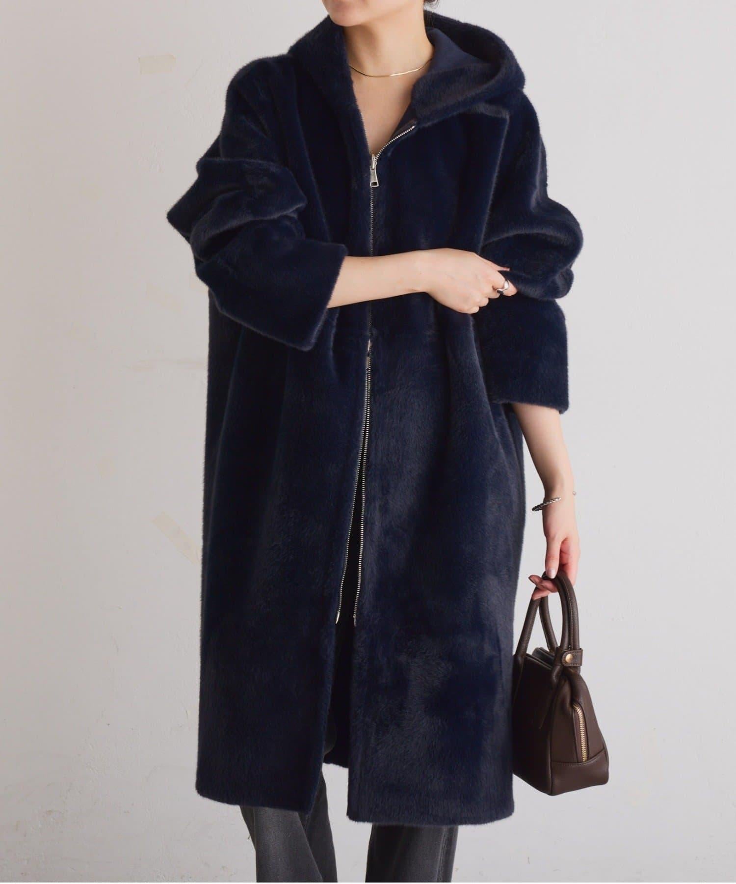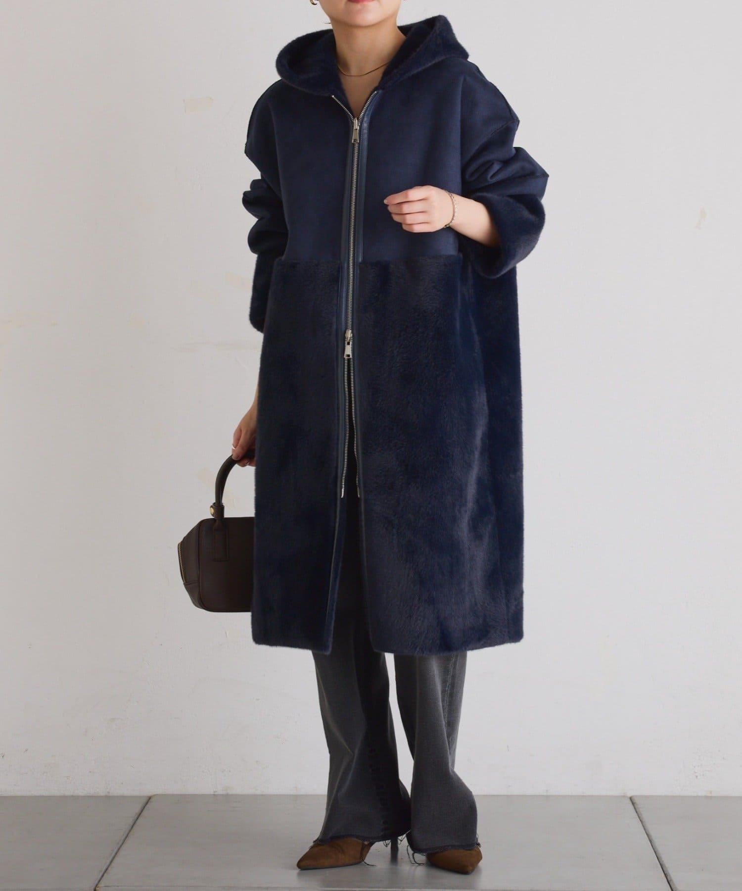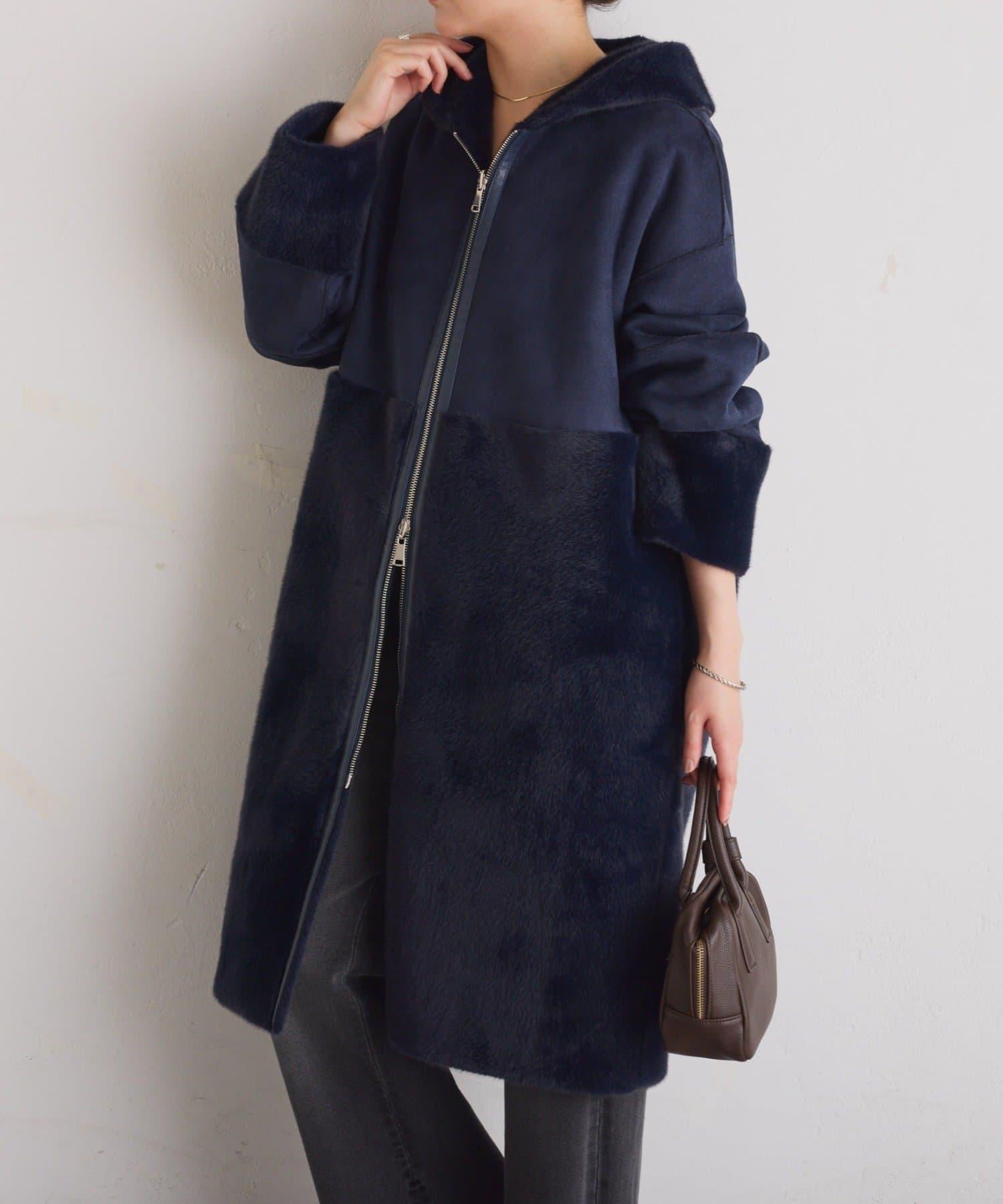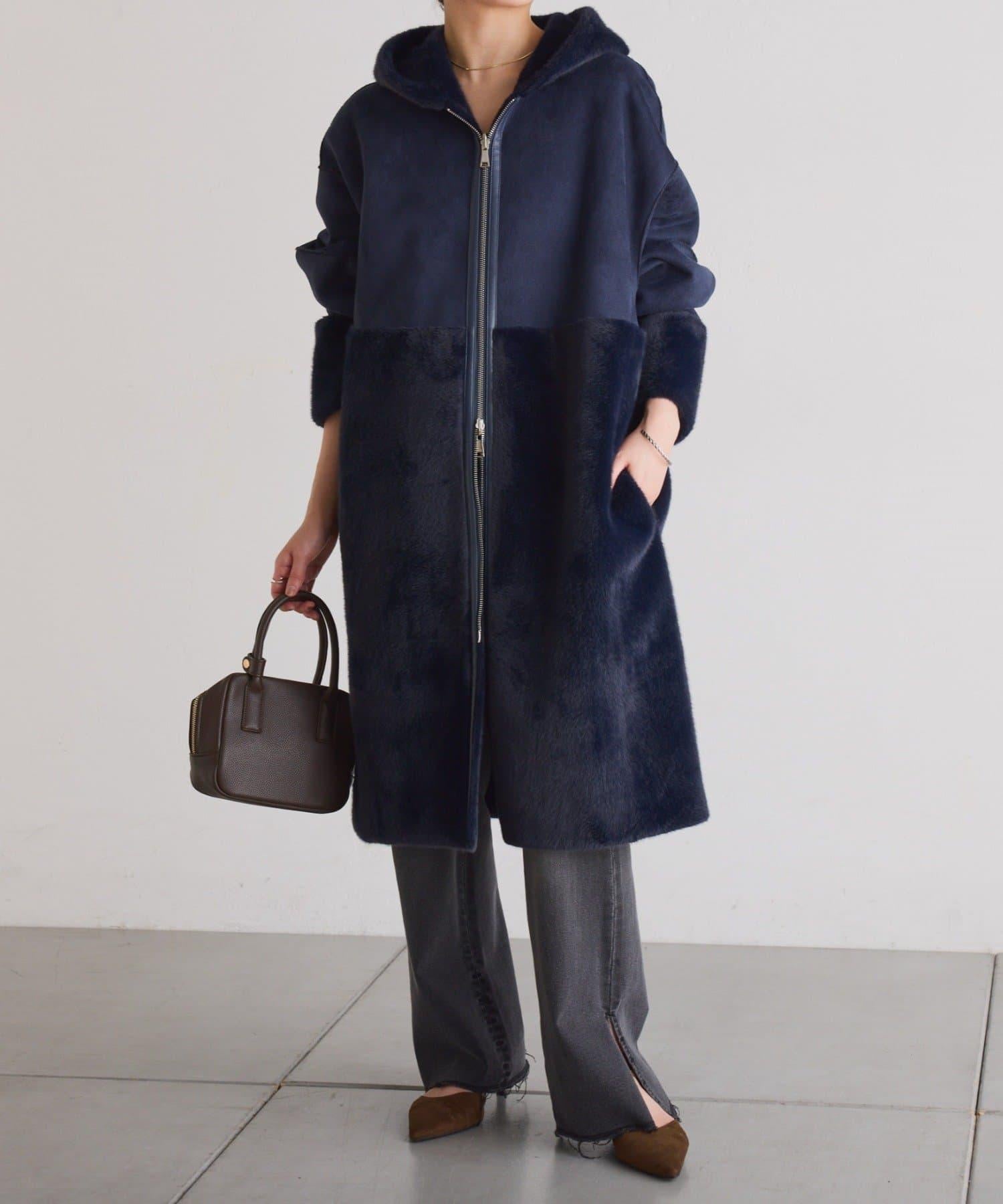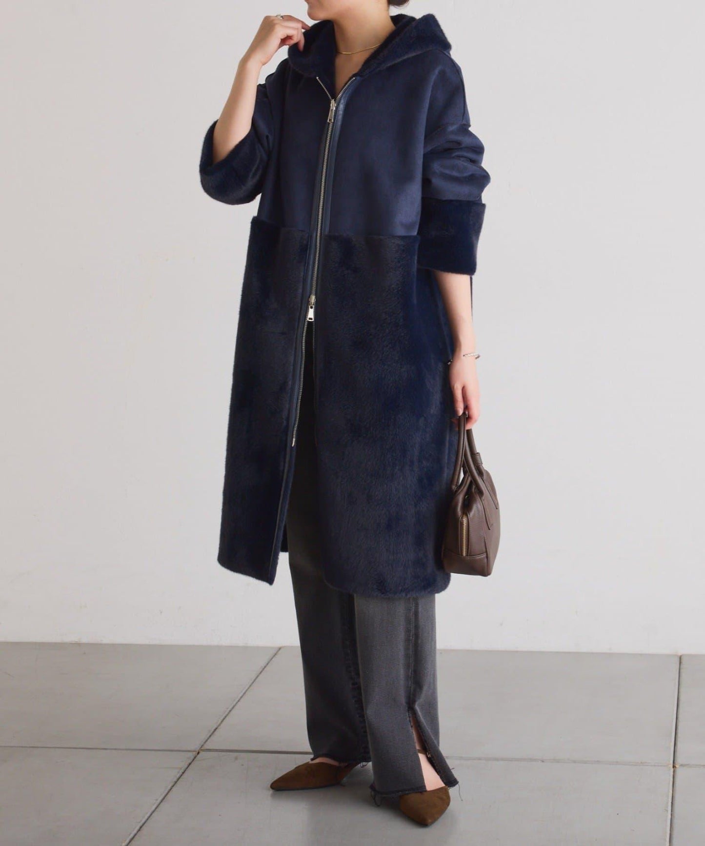 人造麂皮絨和人造皮草的組合,全身可以穿雙面人造皮草的長款大衣。