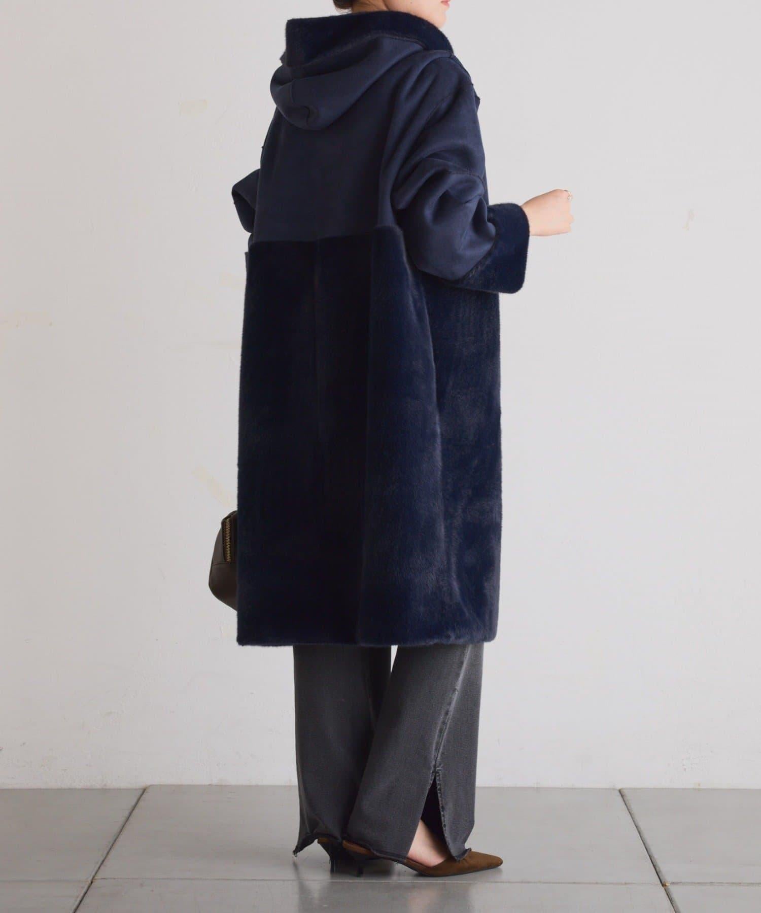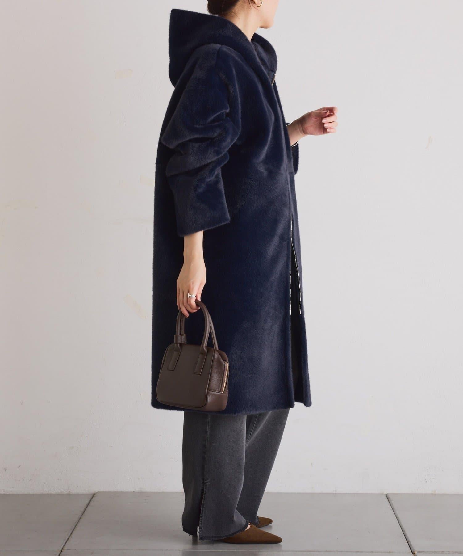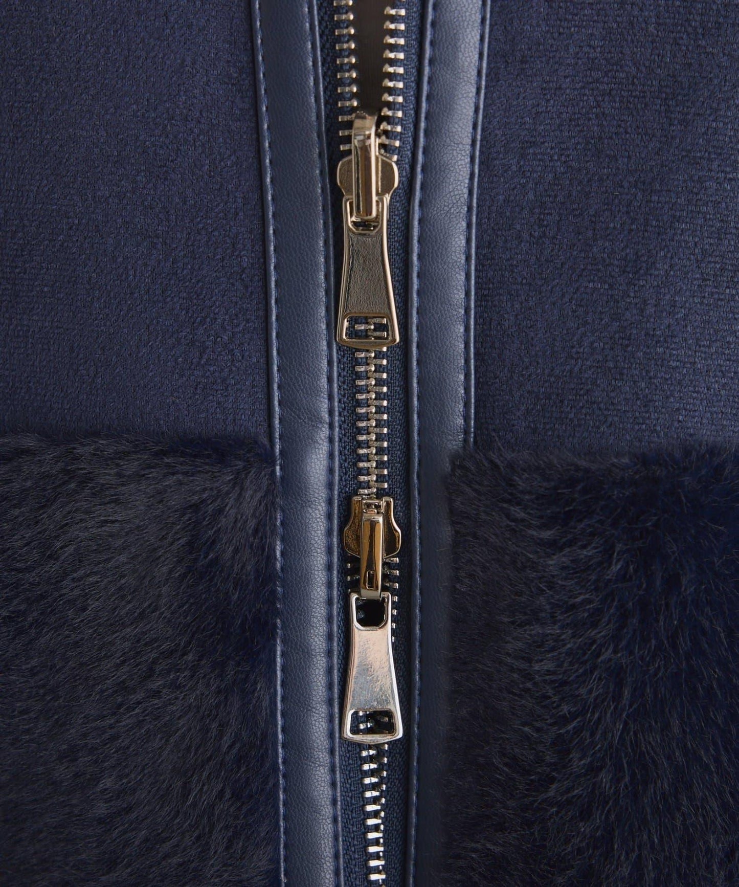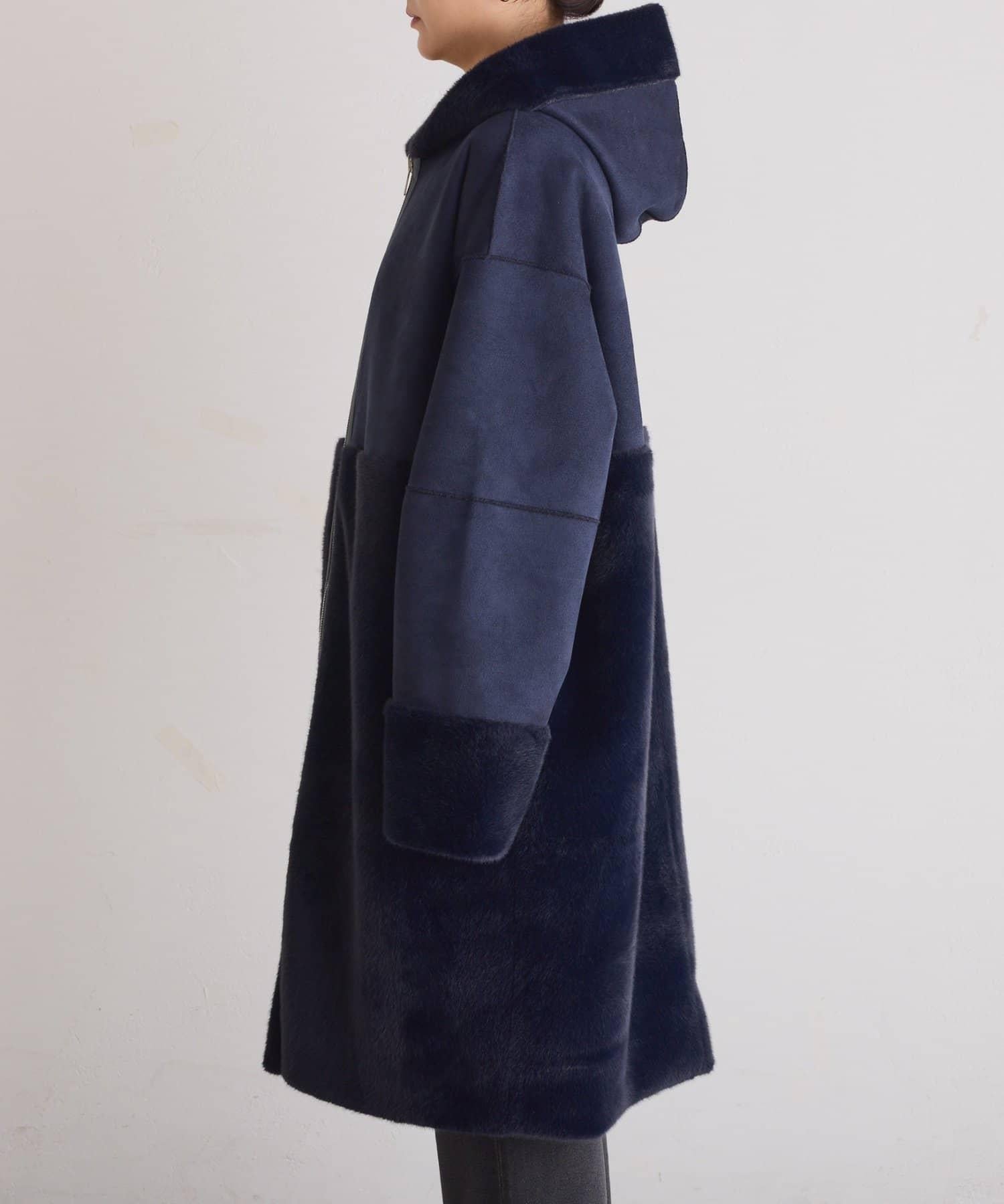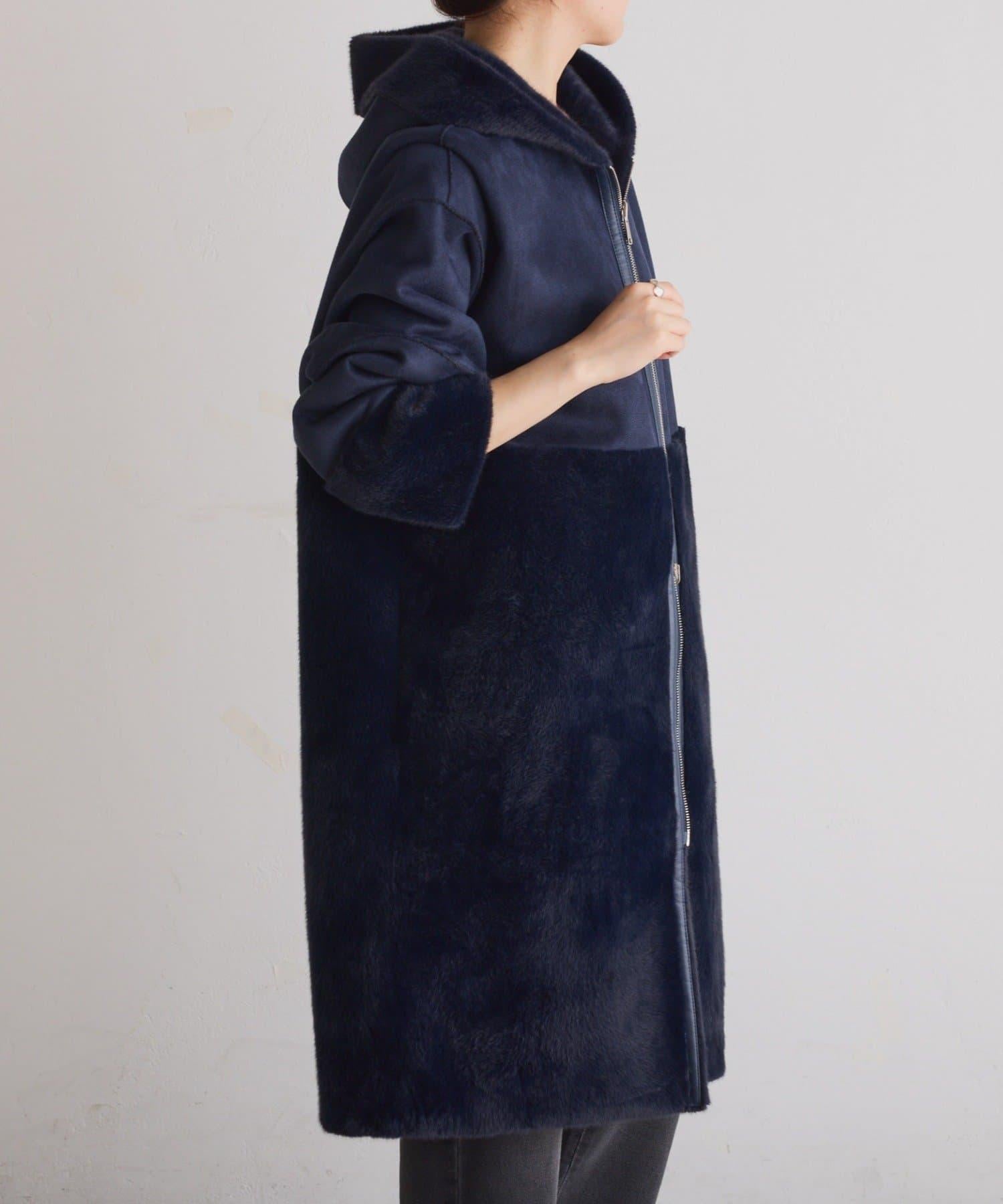 人造麂皮絨和人造皮草的組合,全身可以穿雙面人造皮草的長款大衣。