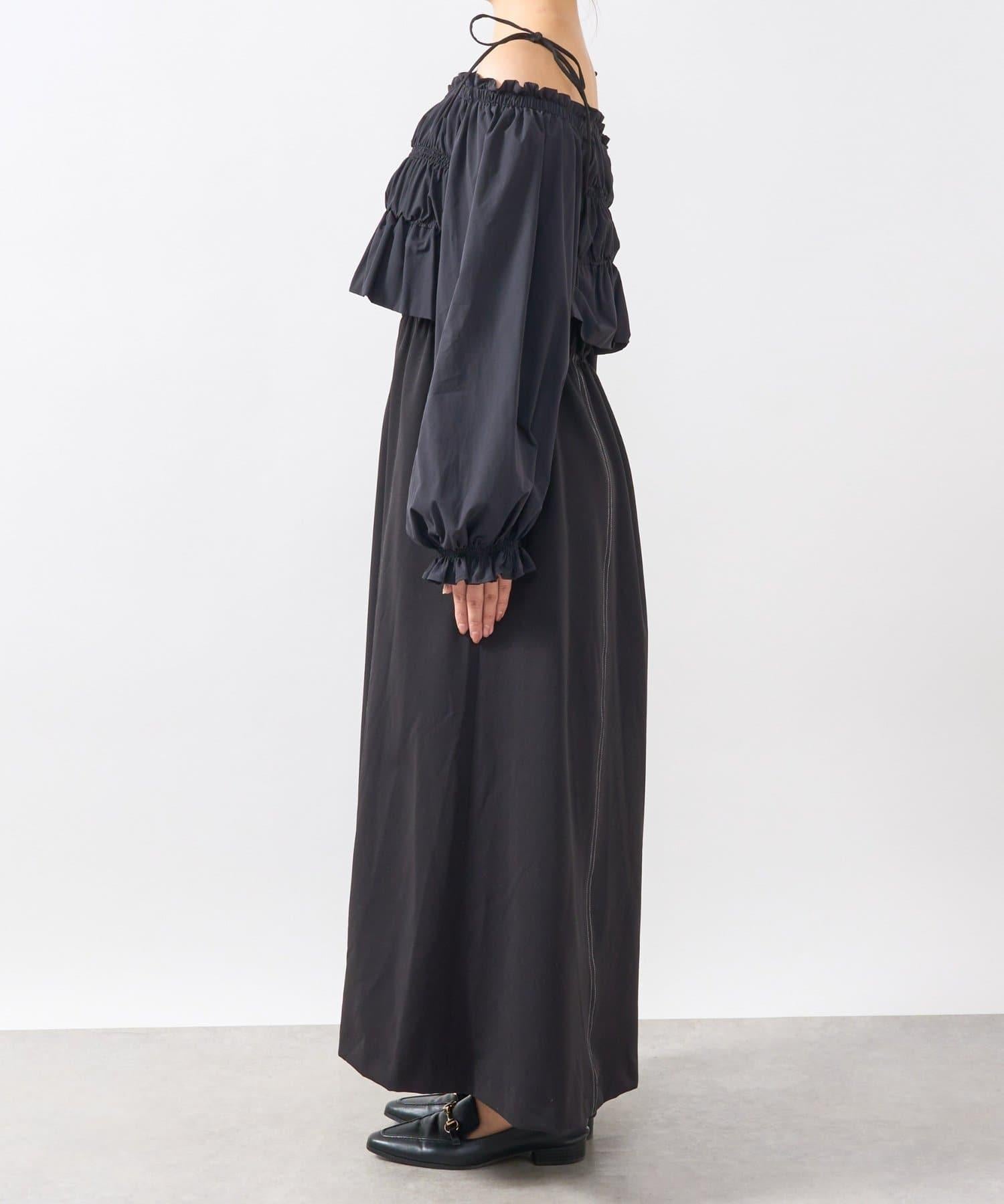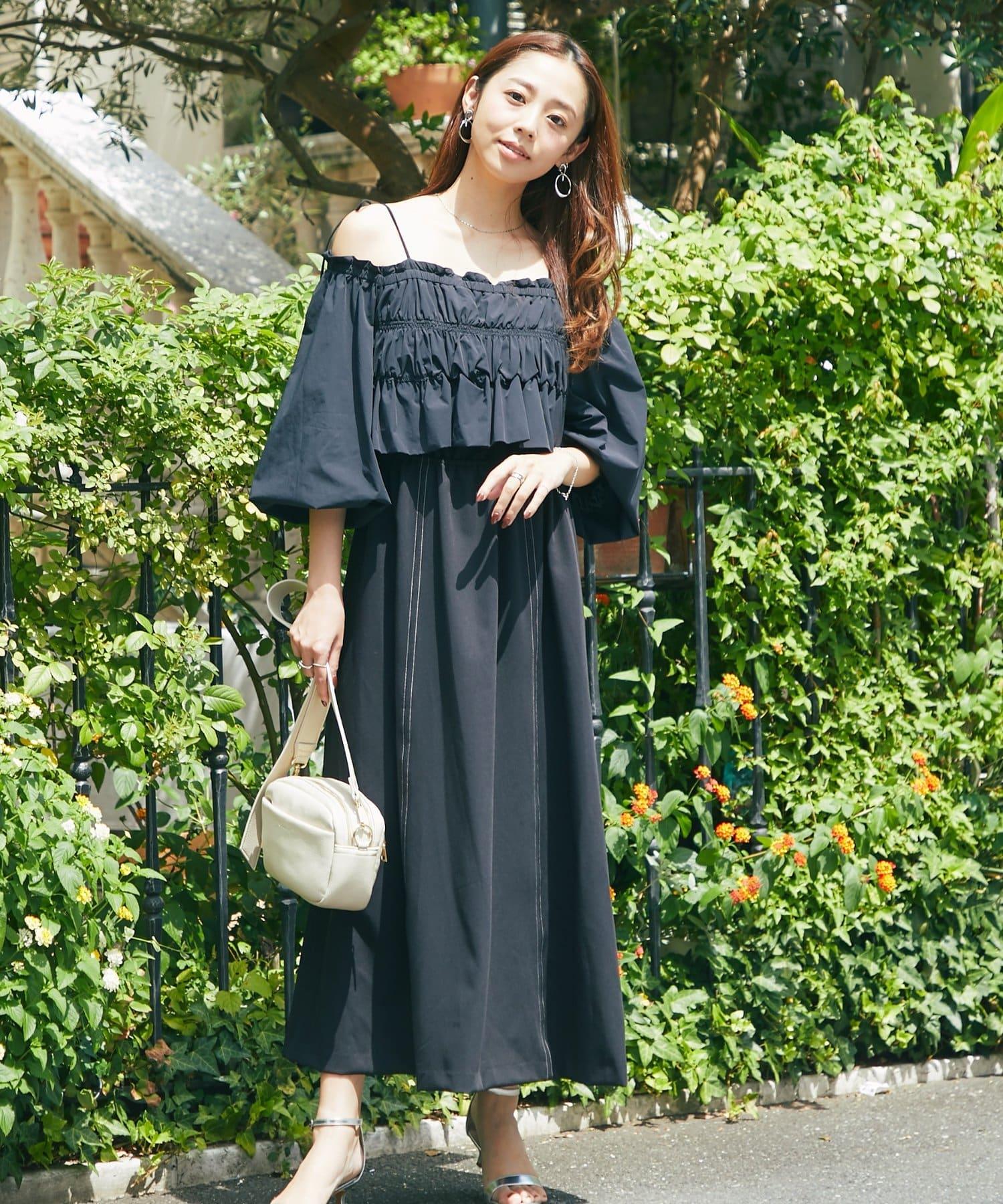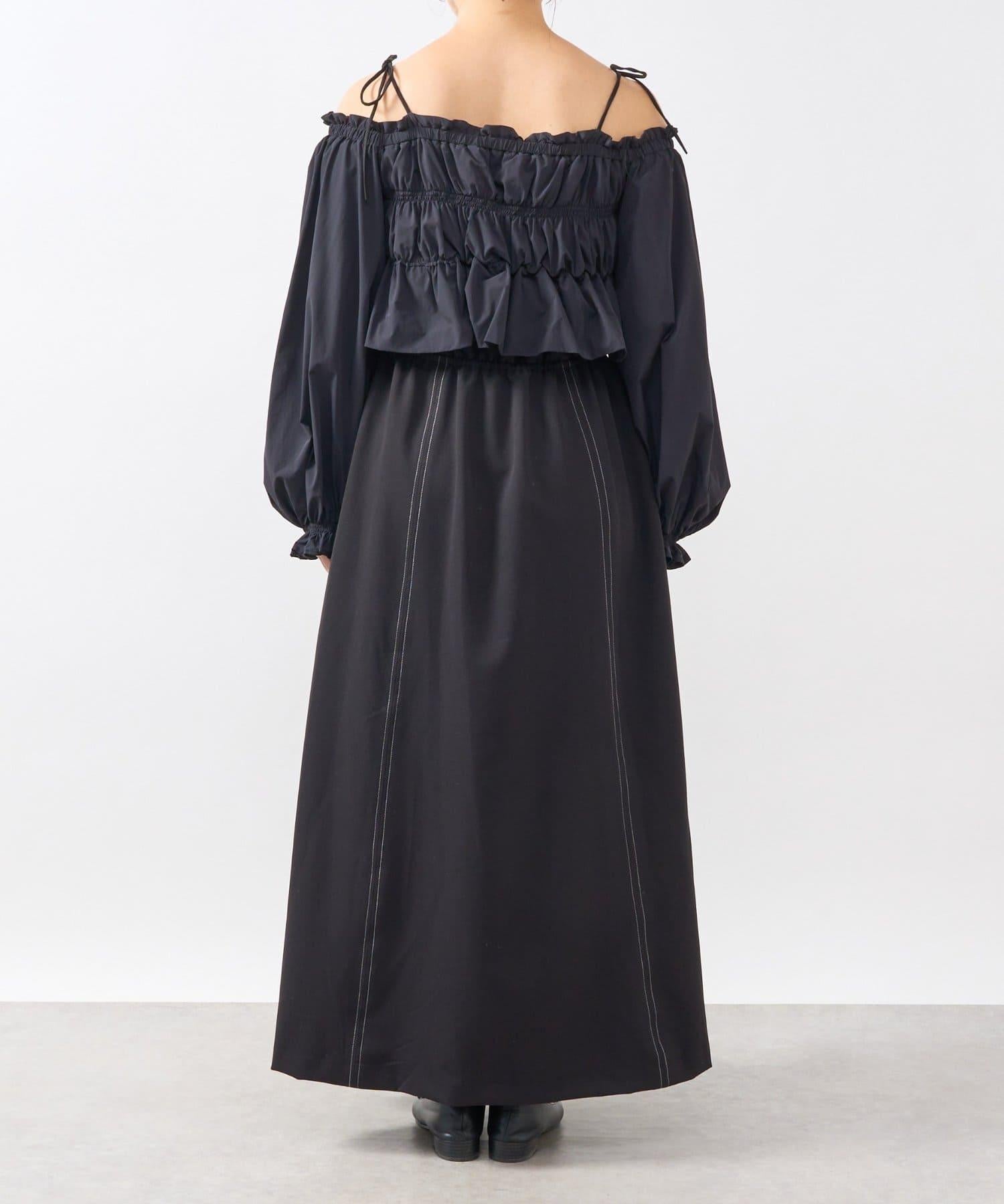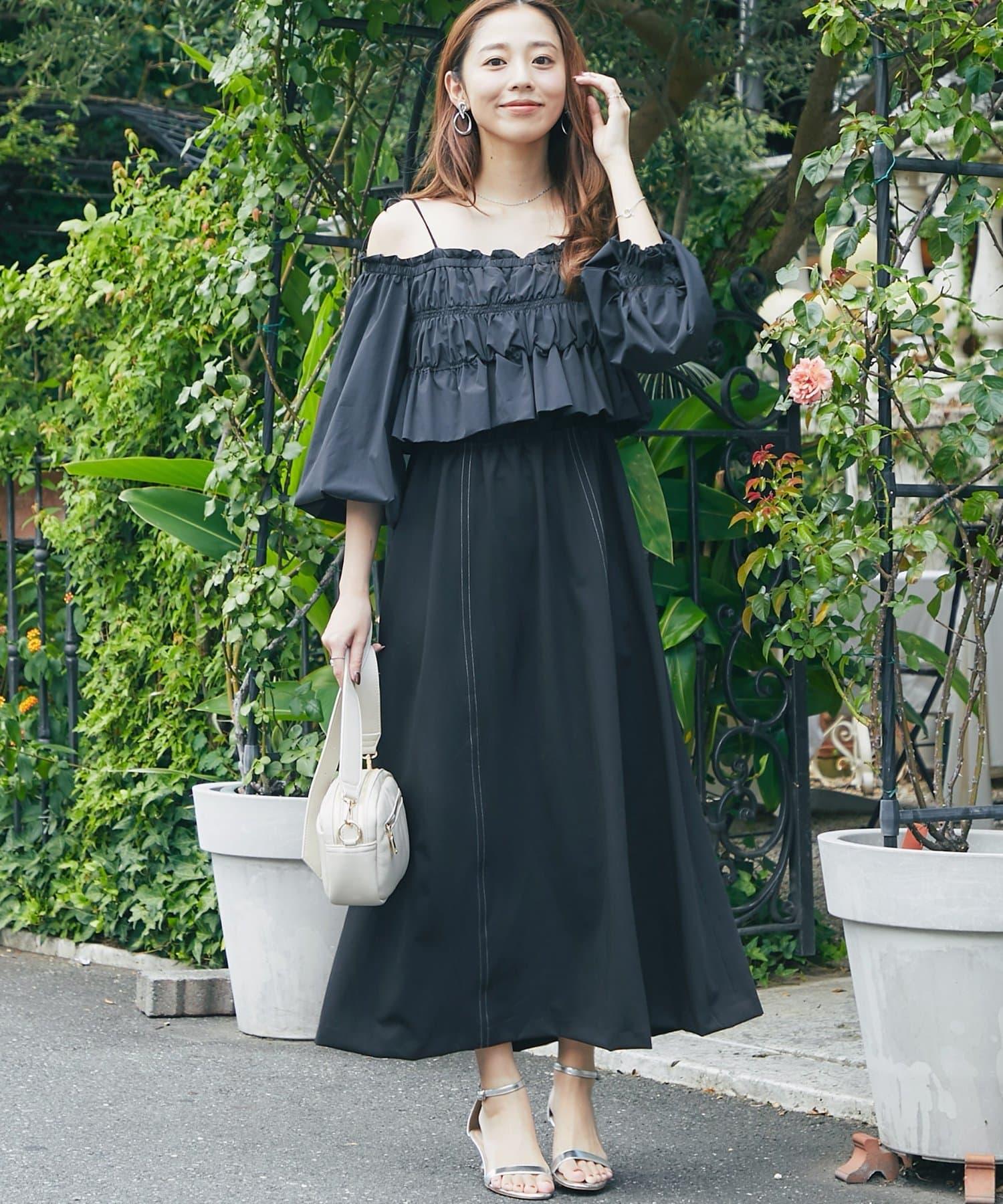 【有小個子尺碼・成熟女性優雅感◎】方領拼接材質褶皺連衣裙