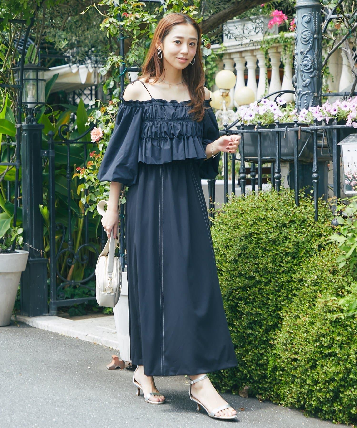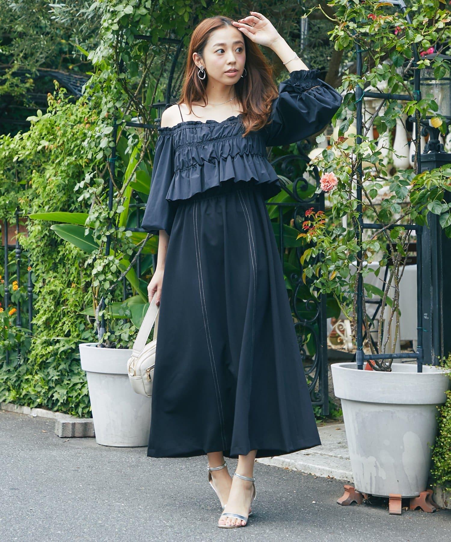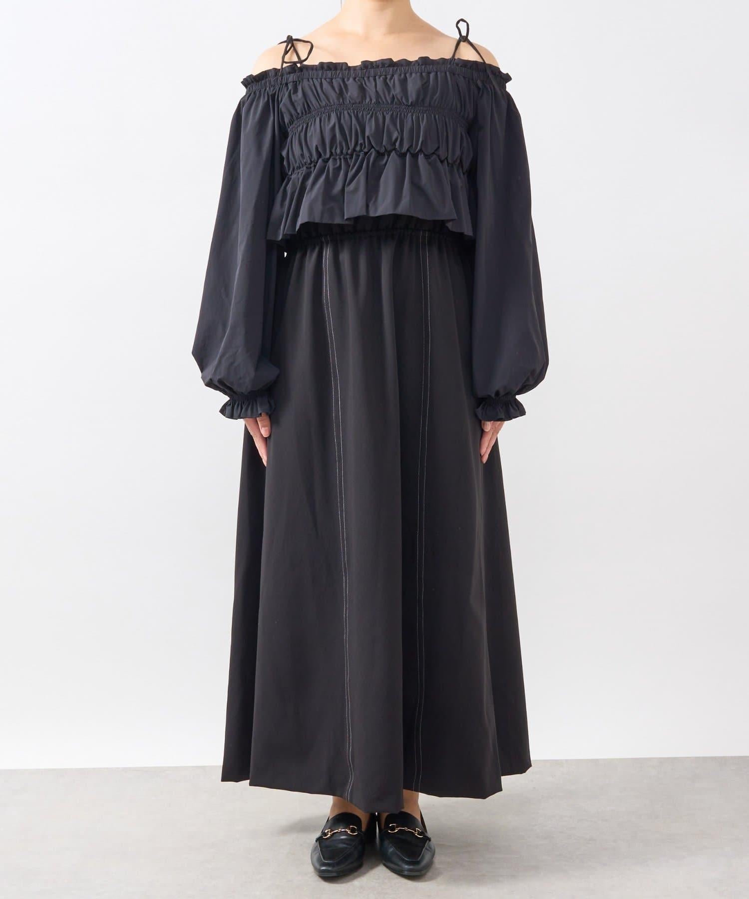 【有小個子尺碼・成熟女性優雅感◎】方領拼接材質褶皺連衣裙
