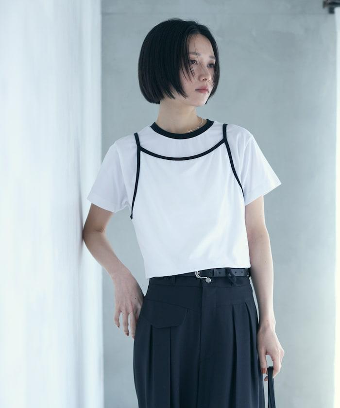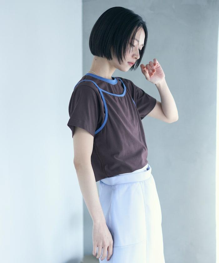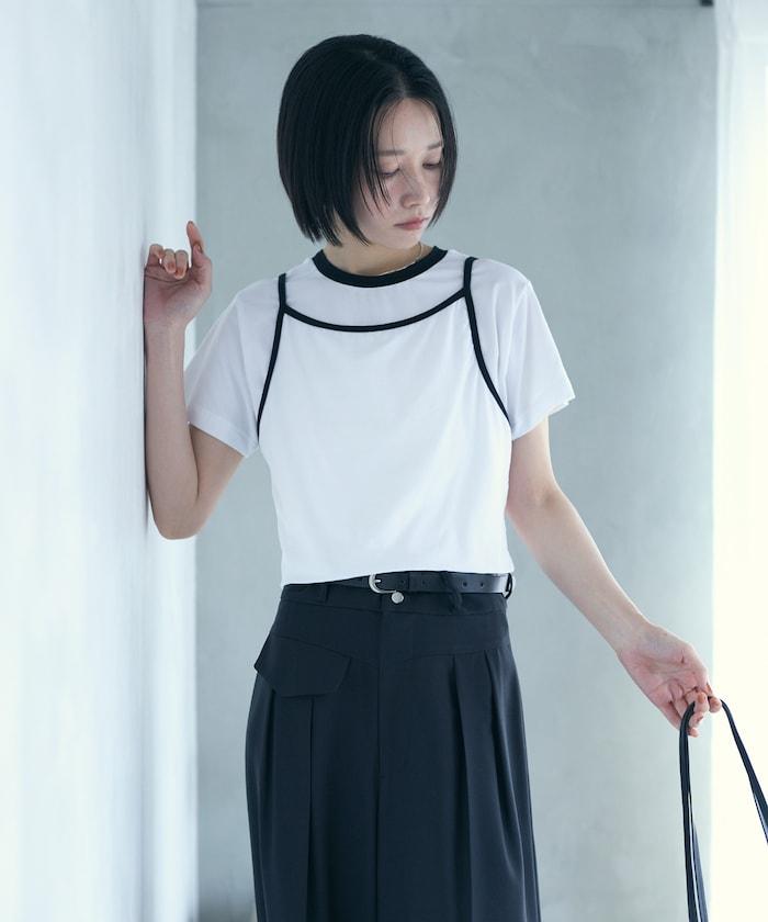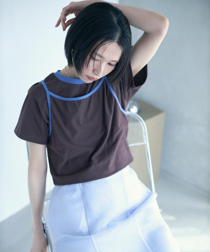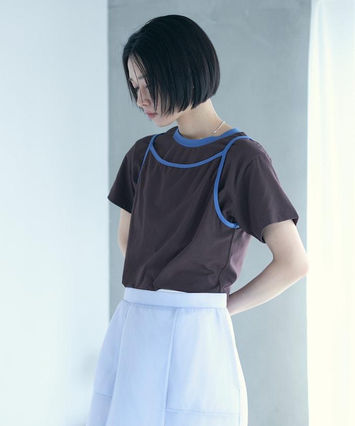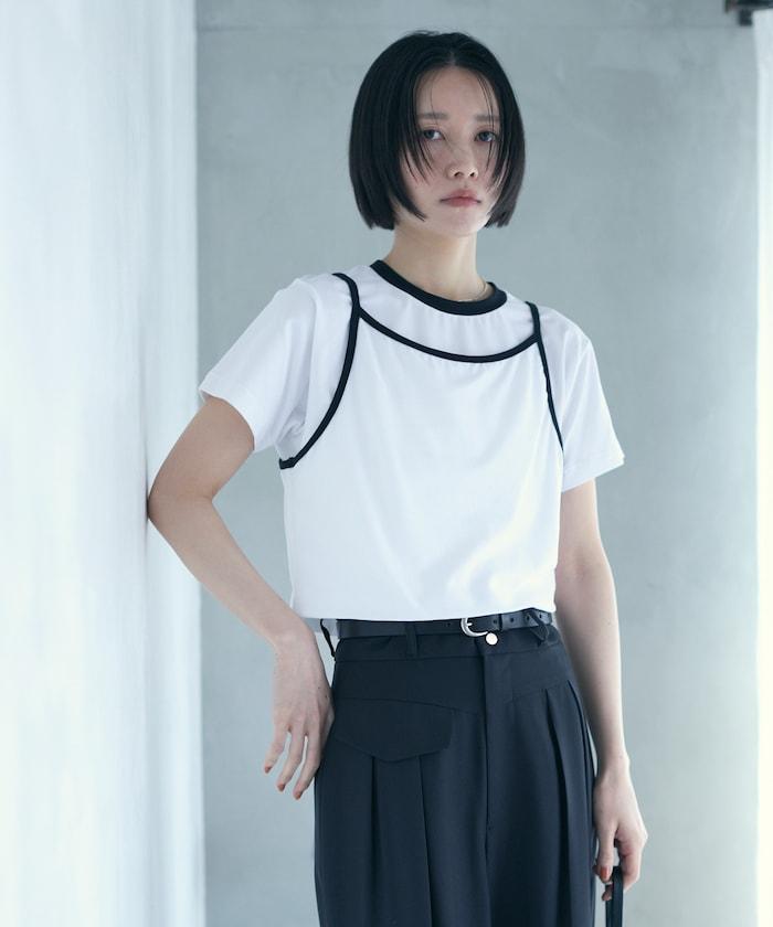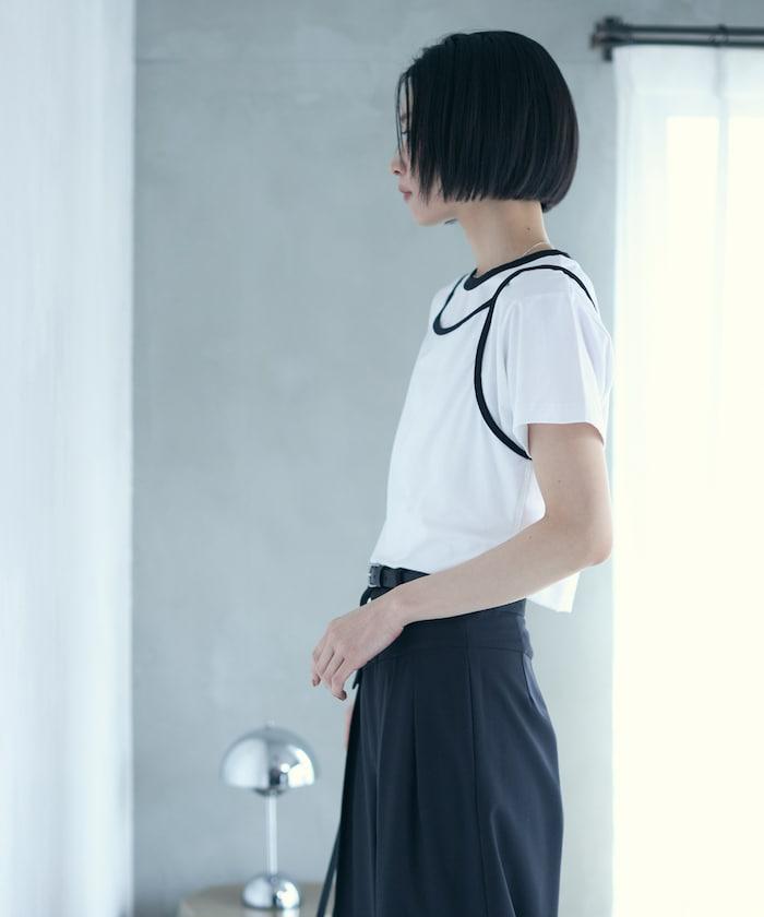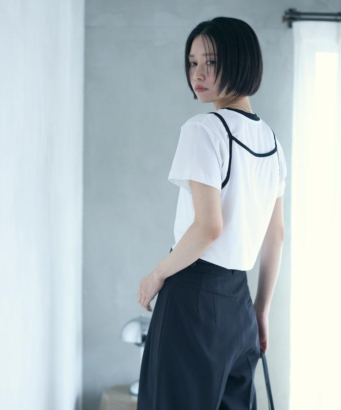 與下襬相連的吊帶肩帶可以搭在肩上,也可以摺疊起來,看起來就像在 T 恤外面疊穿了一件吊帶衫。