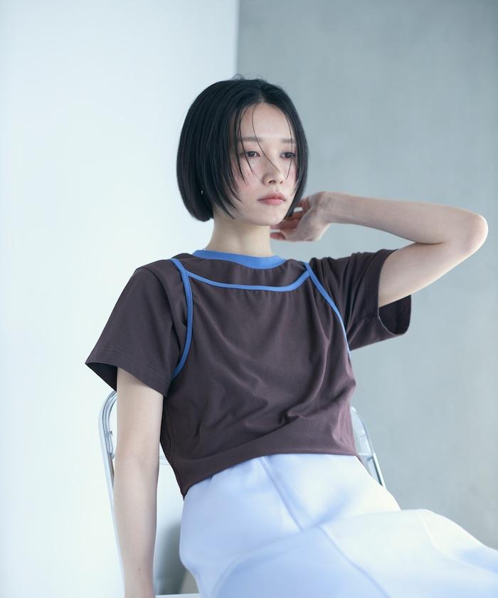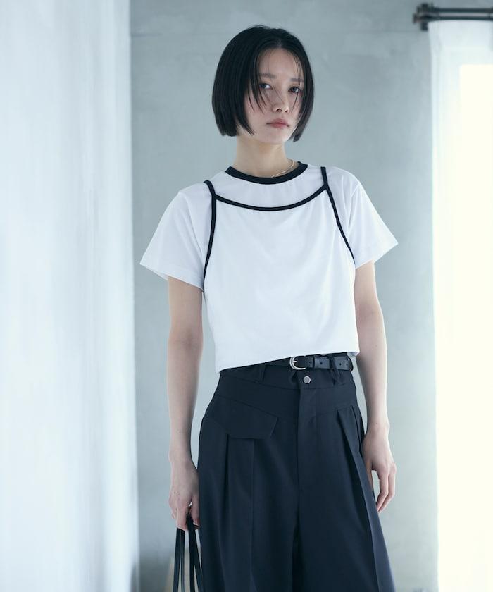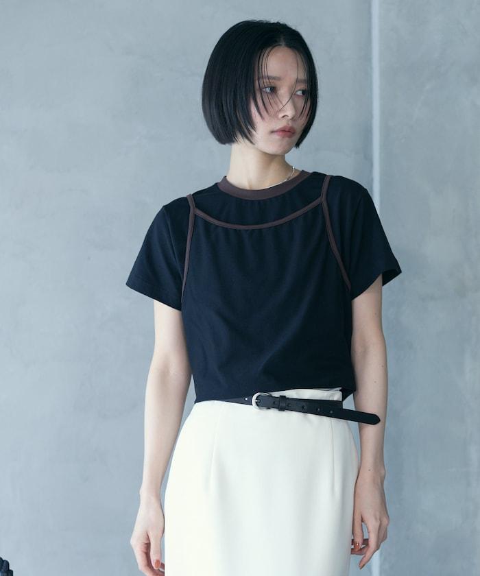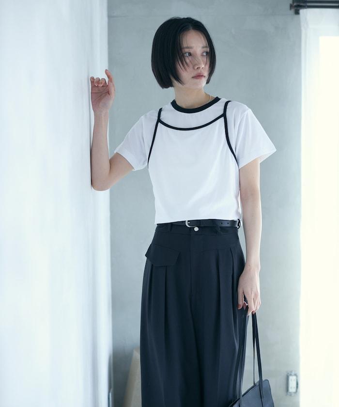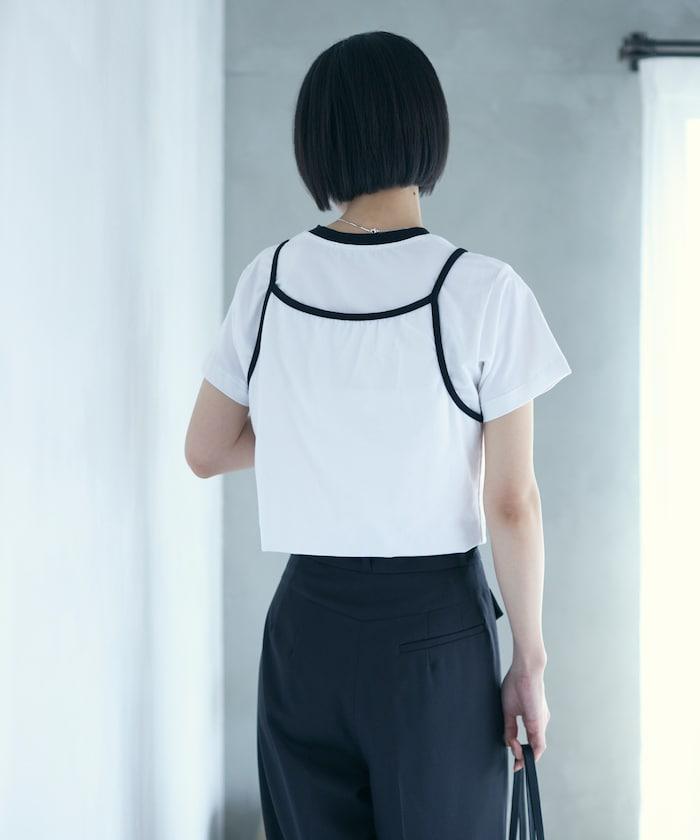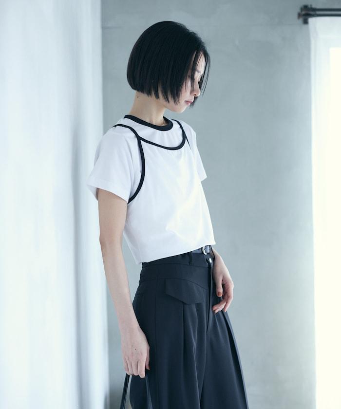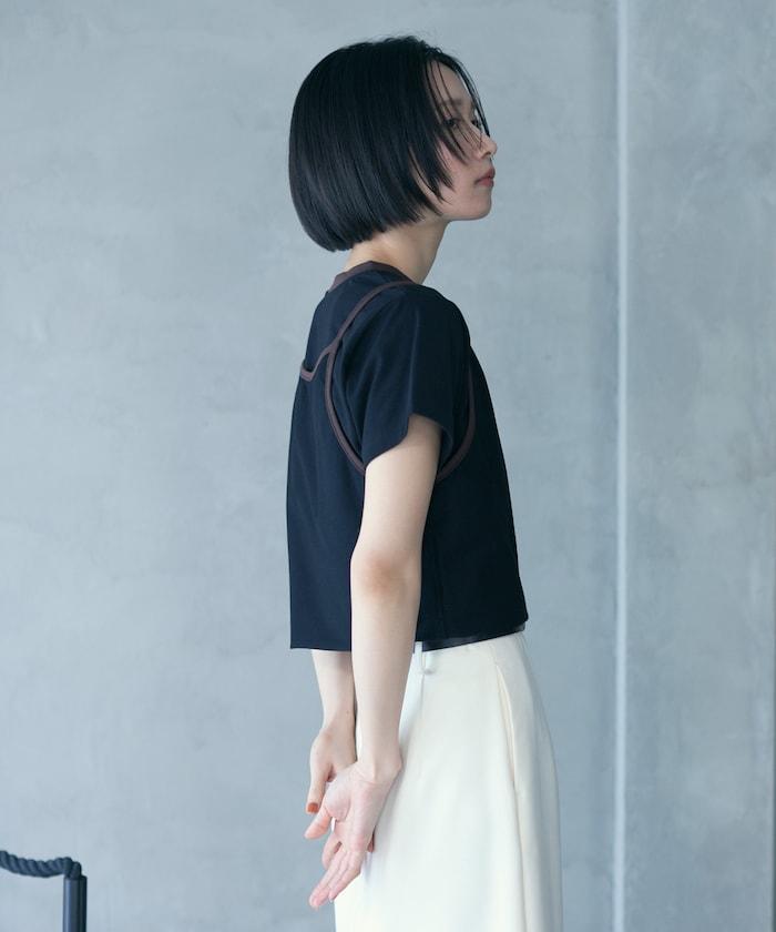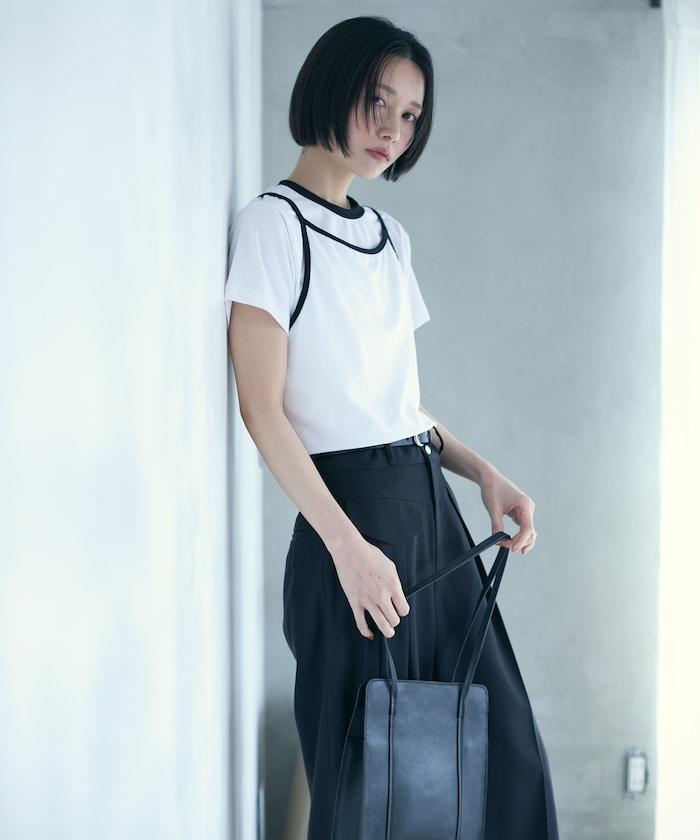 與下襬相連的吊帶肩帶可以搭在肩上,也可以摺疊起來,看起來就像在 T 恤外面疊穿了一件吊帶衫。