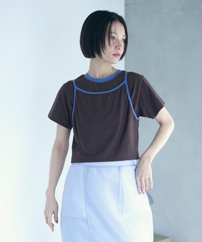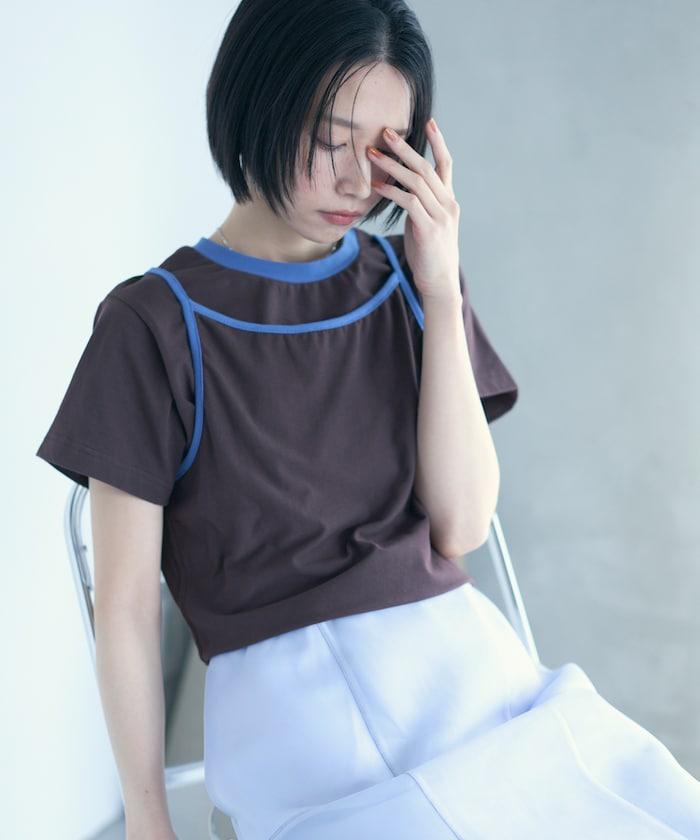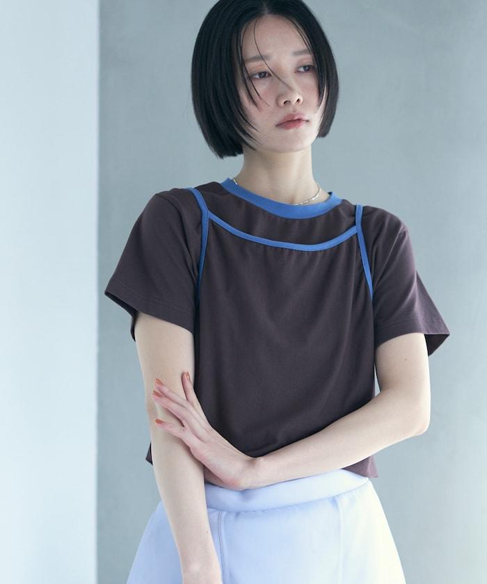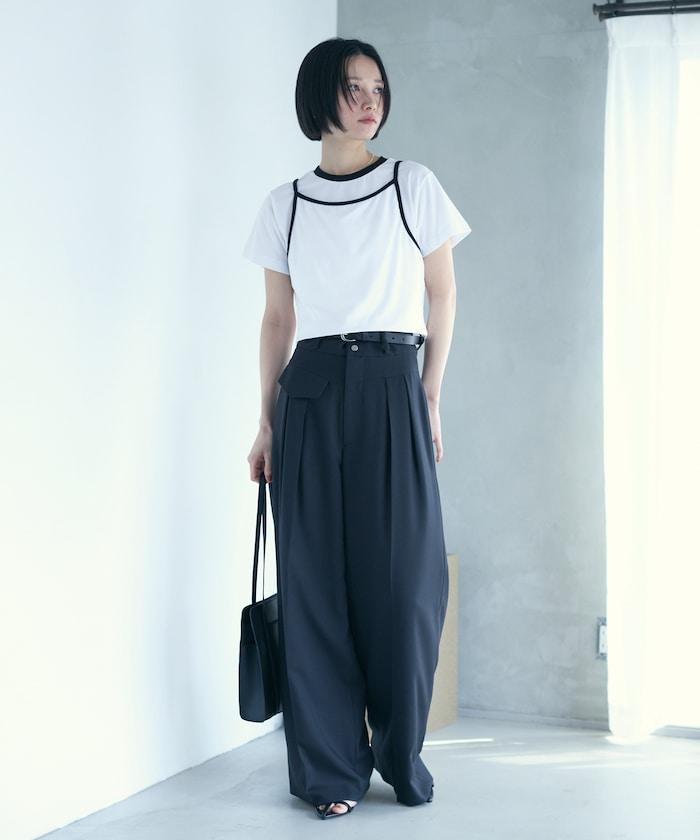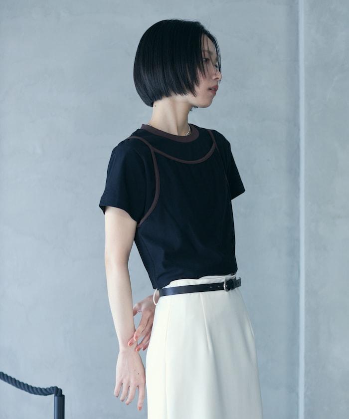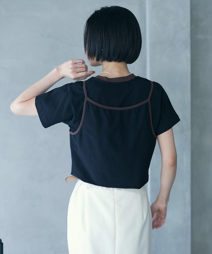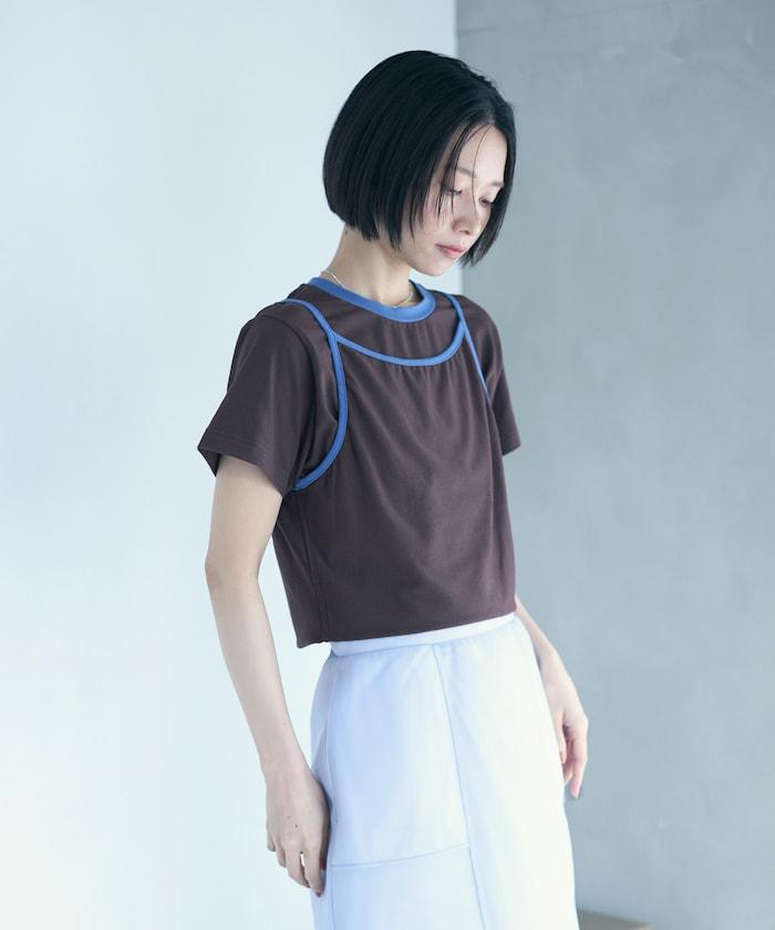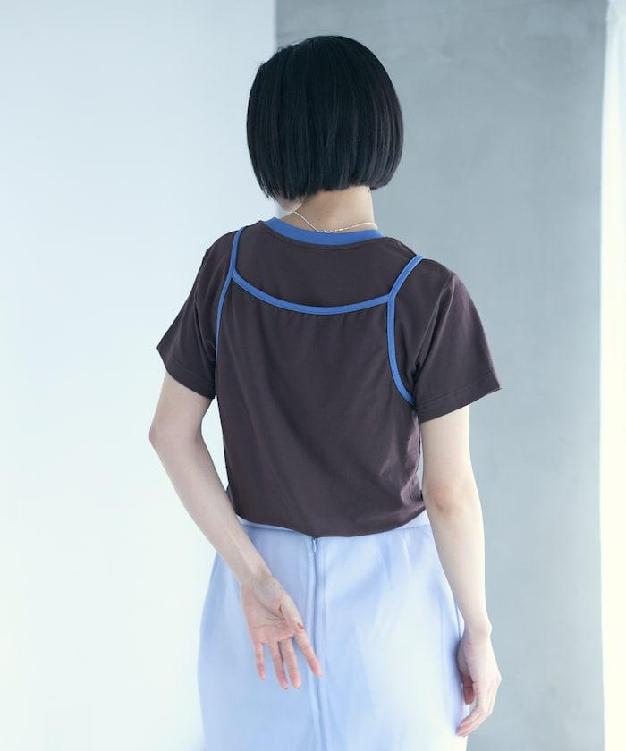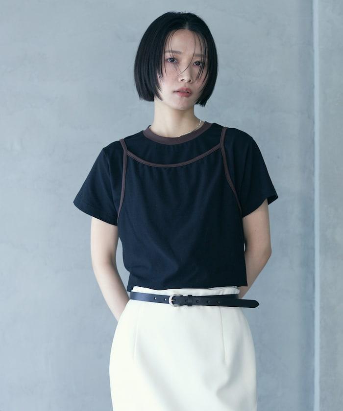 與下襬相連的吊帶肩帶可以搭在肩上,也可以摺疊起來,看起來就像在 T 恤外面疊穿了一件吊帶衫。