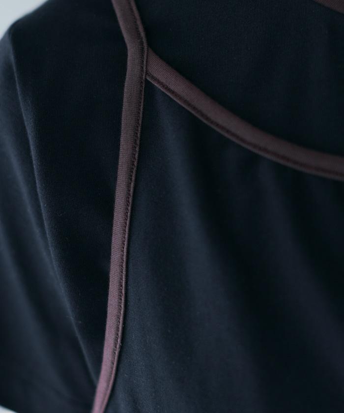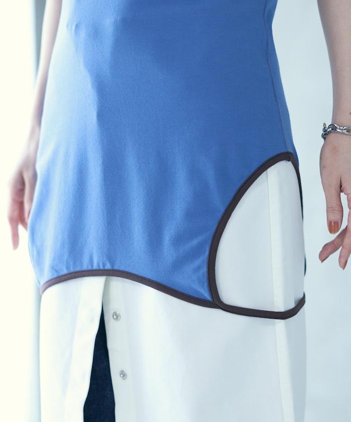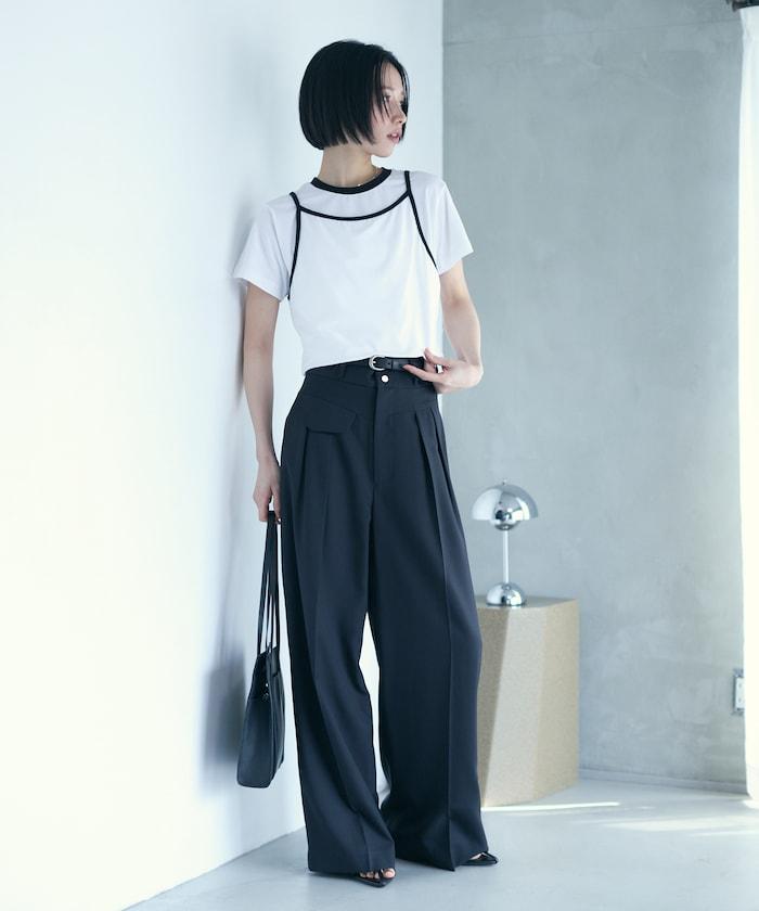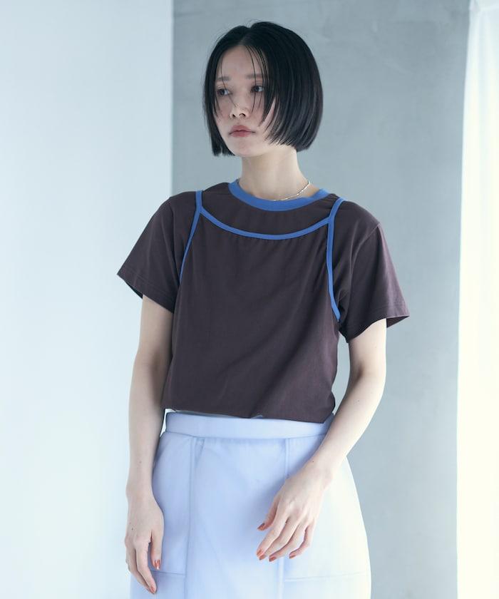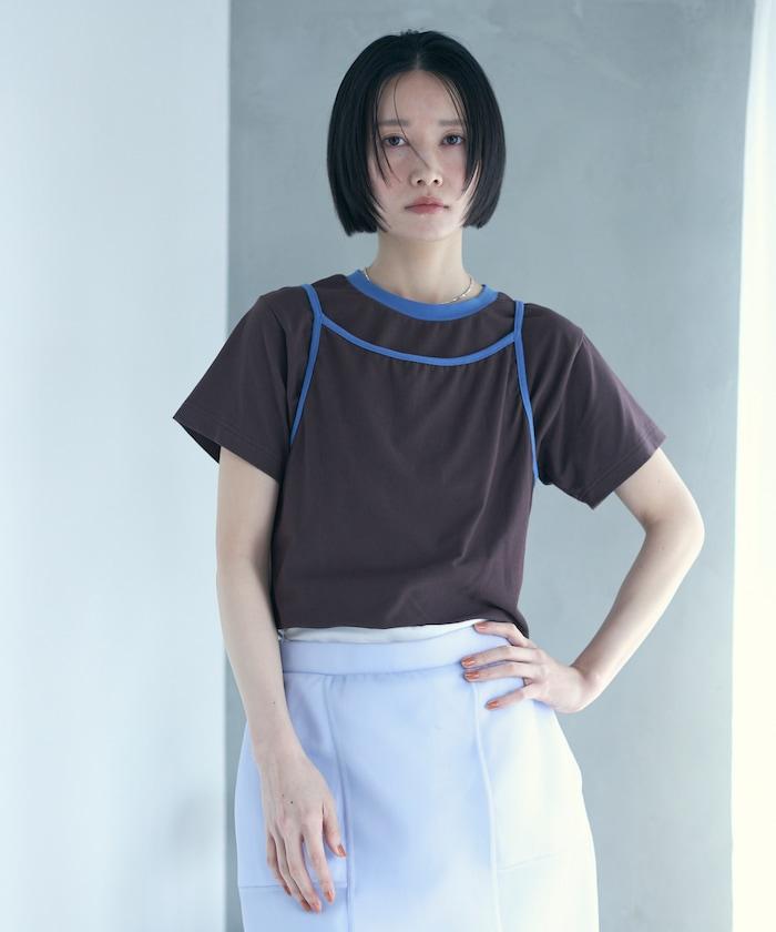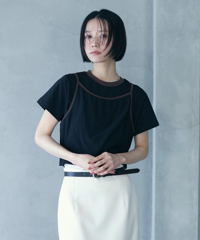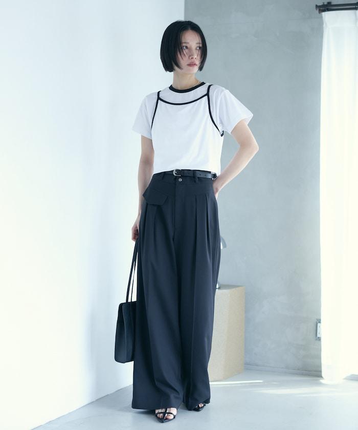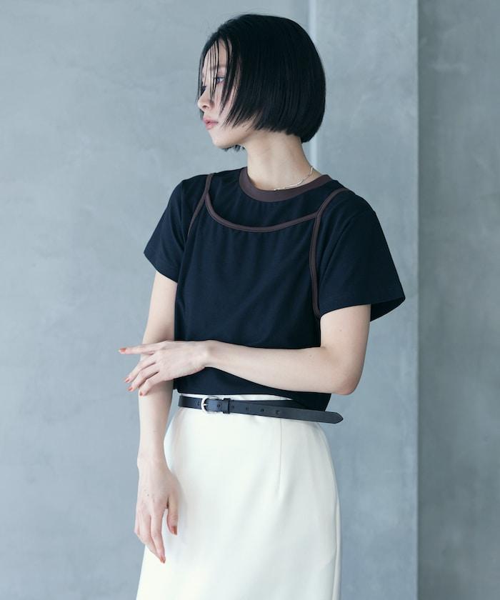 與下襬相連的吊帶肩帶可以搭在肩上,也可以摺疊起來,看起來就像在 T 恤外面疊穿了一件吊帶衫。