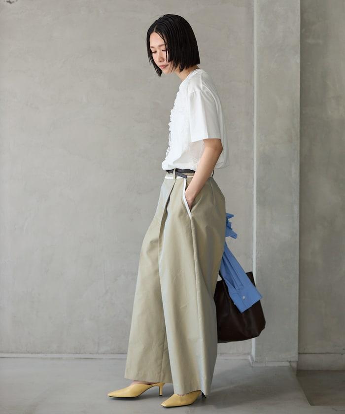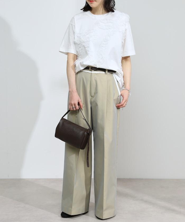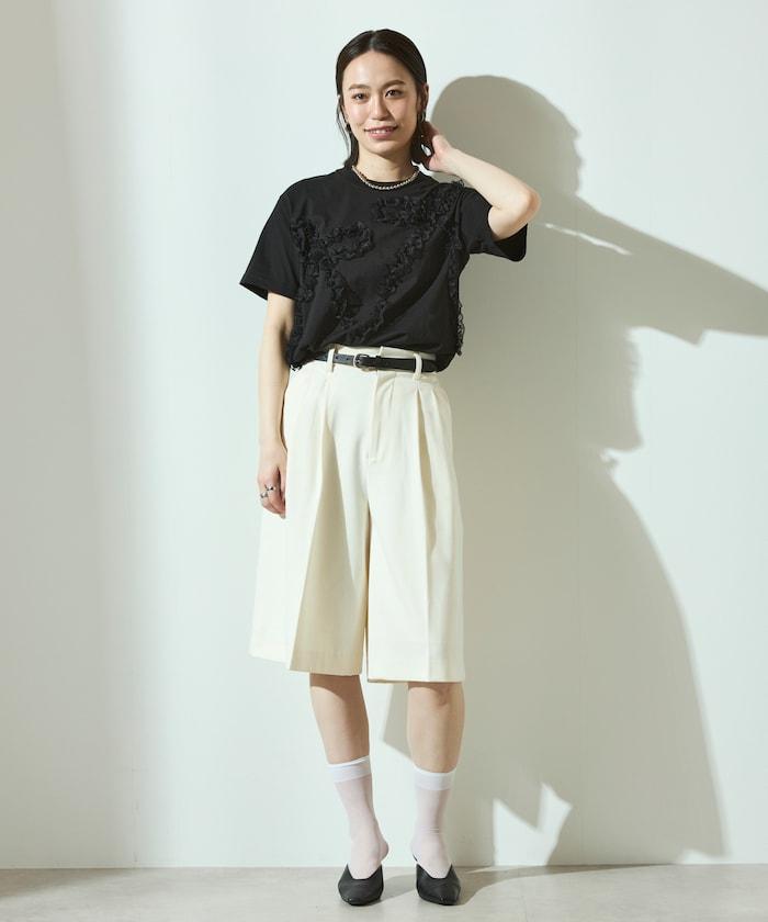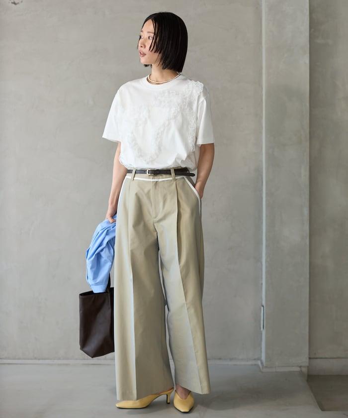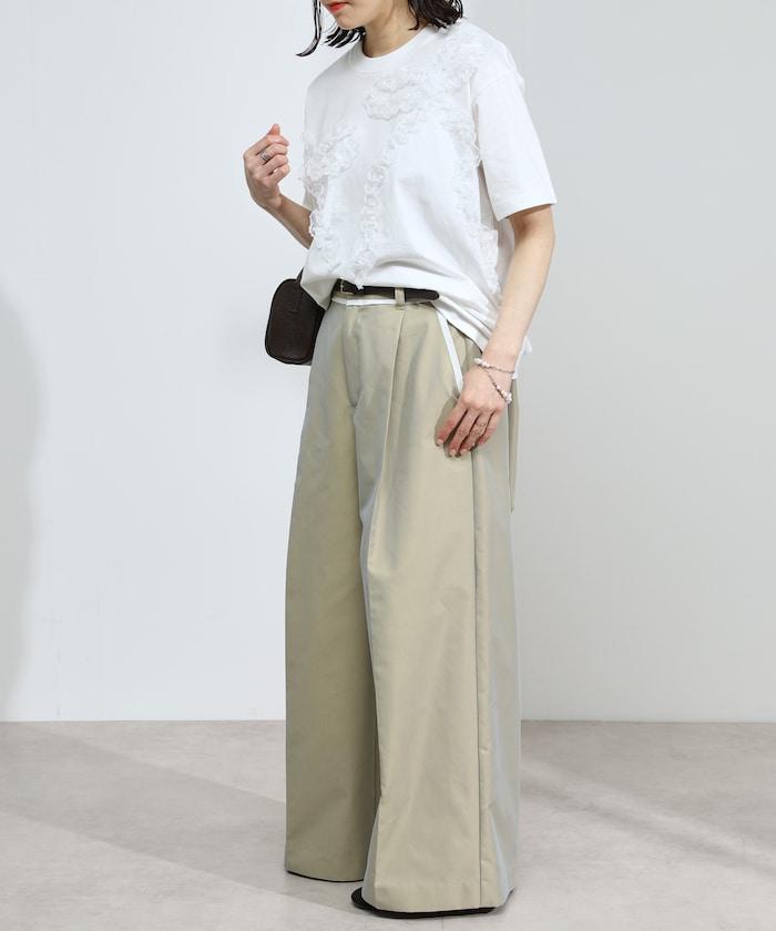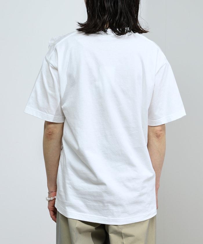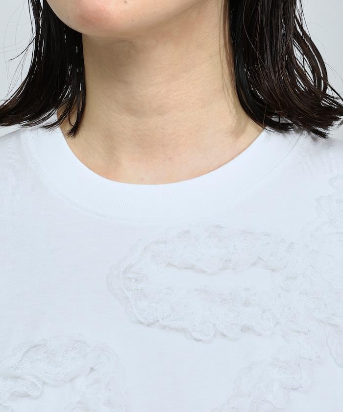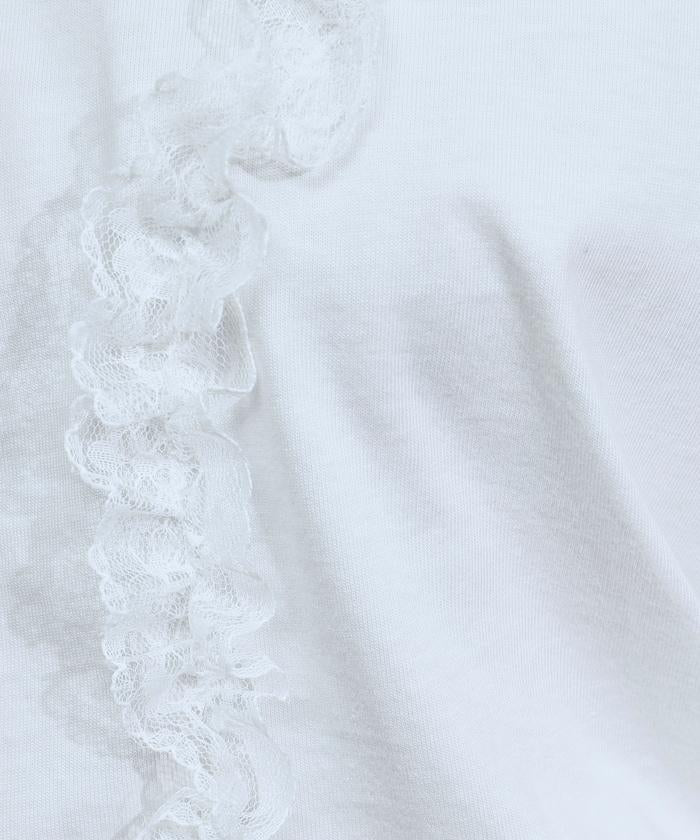 有機棉蕾絲領帶T恤/圓領前設計短袖T恤