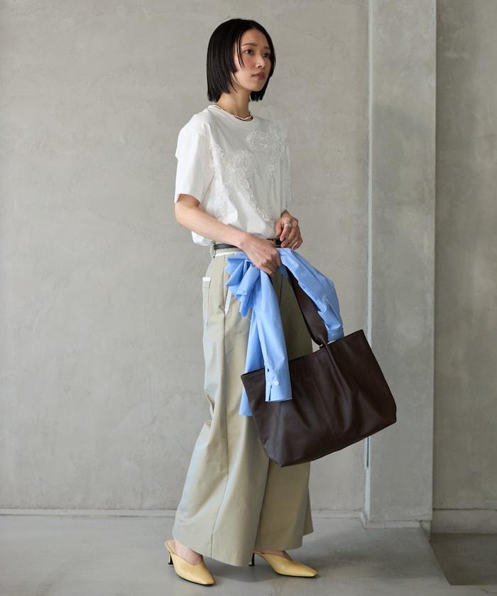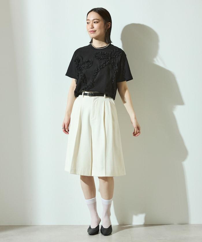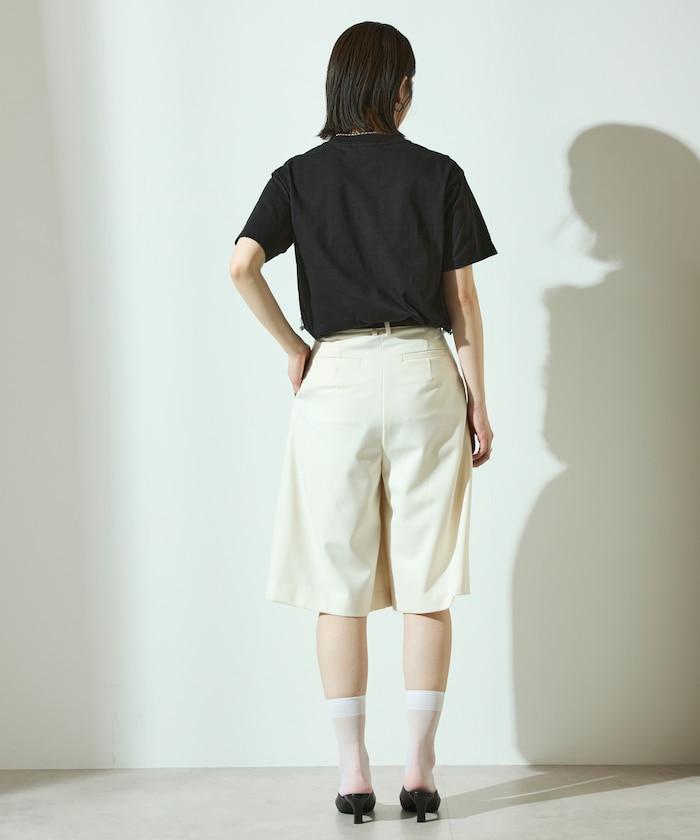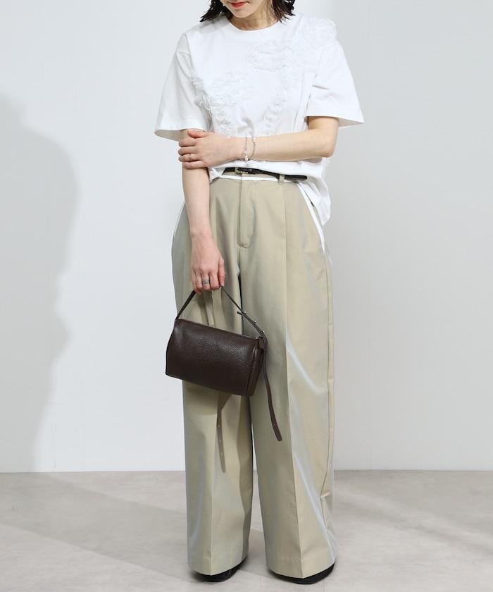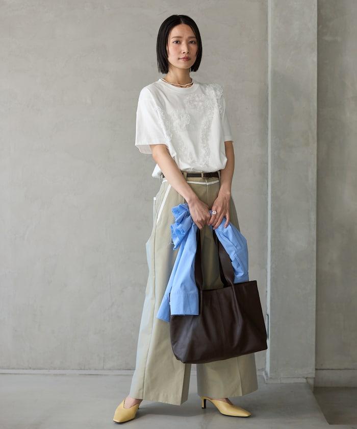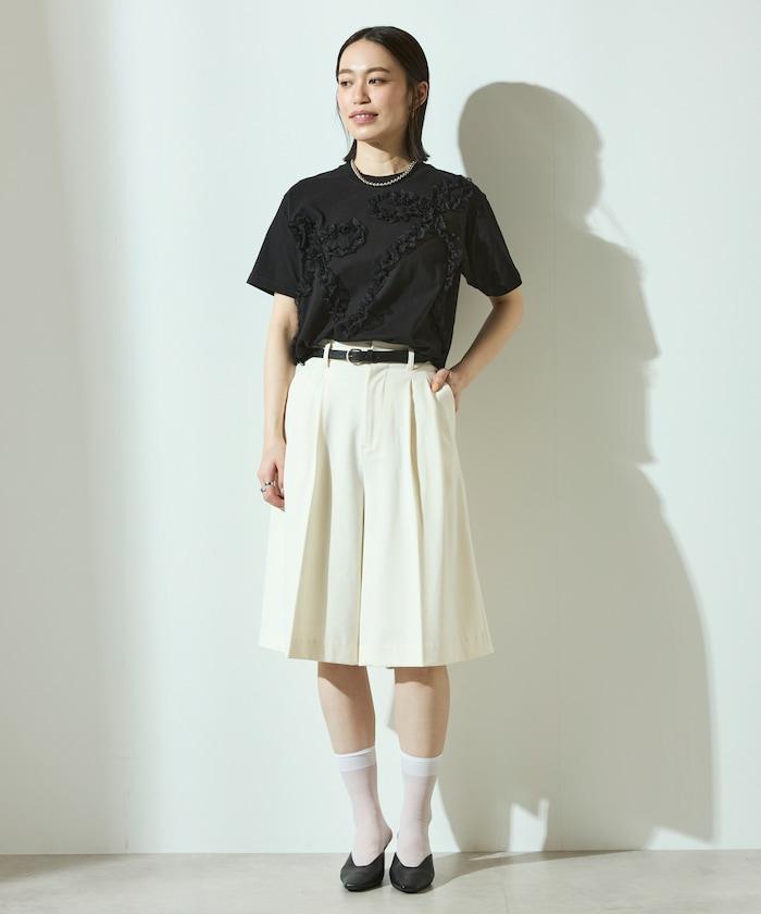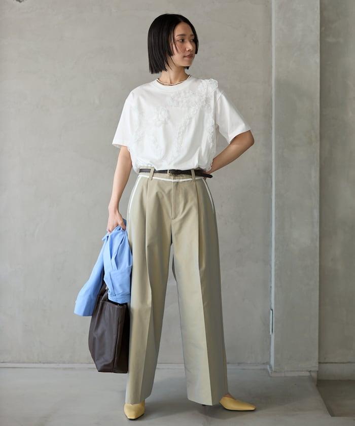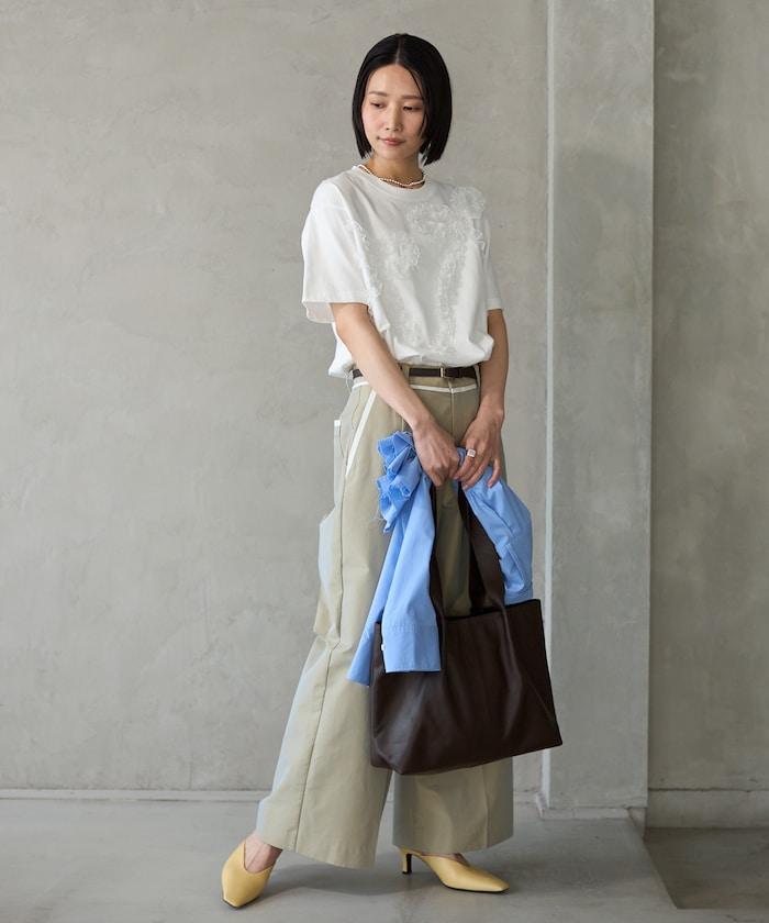 有機棉蕾絲領帶T恤/圓領前設計短袖T恤