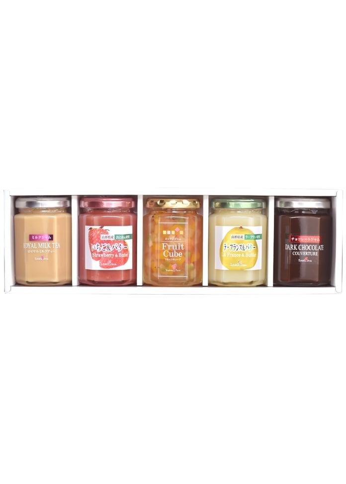 含量或固體含量和總數量 混合果醬 155 克(水果塊)x 1、牛奶果醬 160 克(皇家奶茶)x 1、巧克力果醬 165 克(黑巧克力)x 1、水果和黃油 150 克(草莓和黃油)x 1、水果和黃油 150 克(法國黃油) x 1